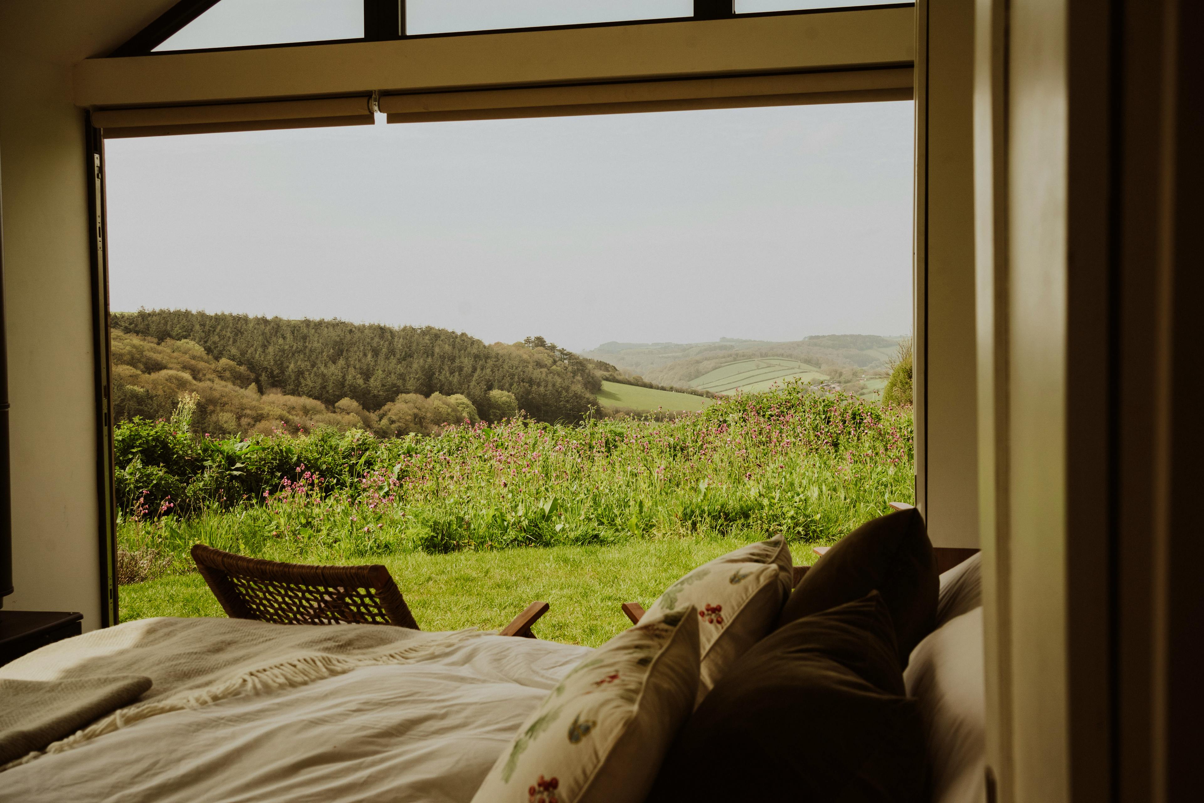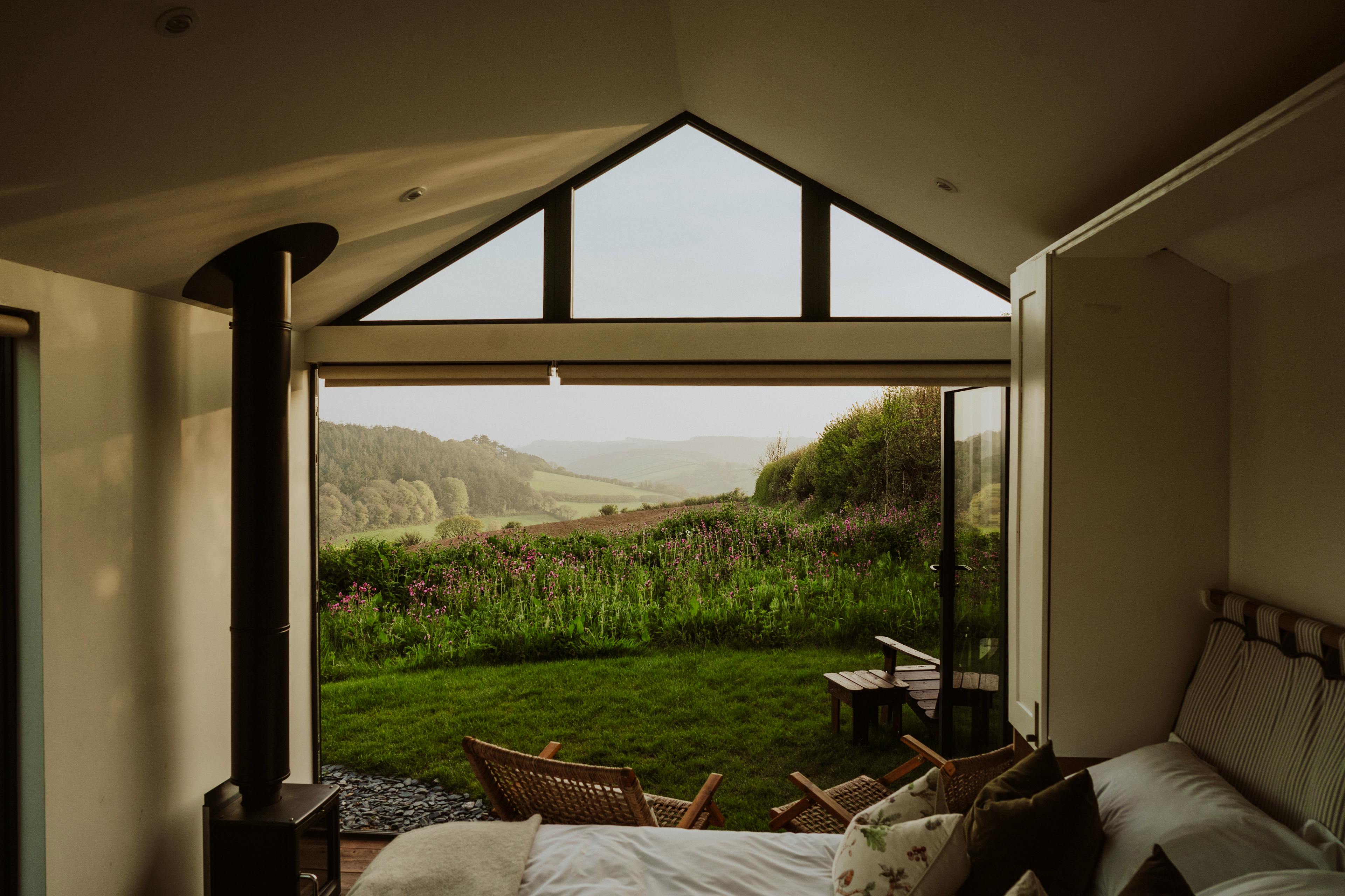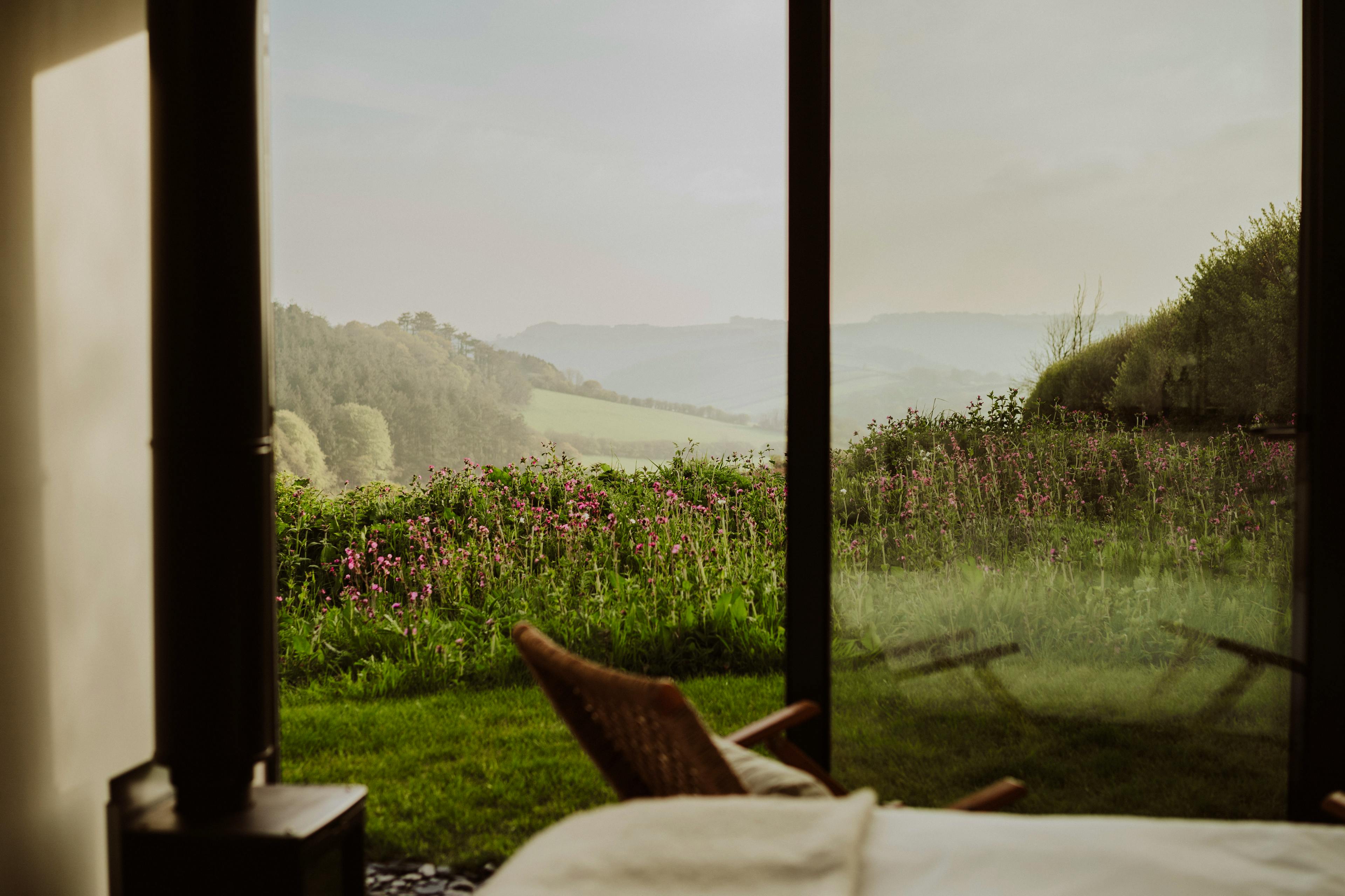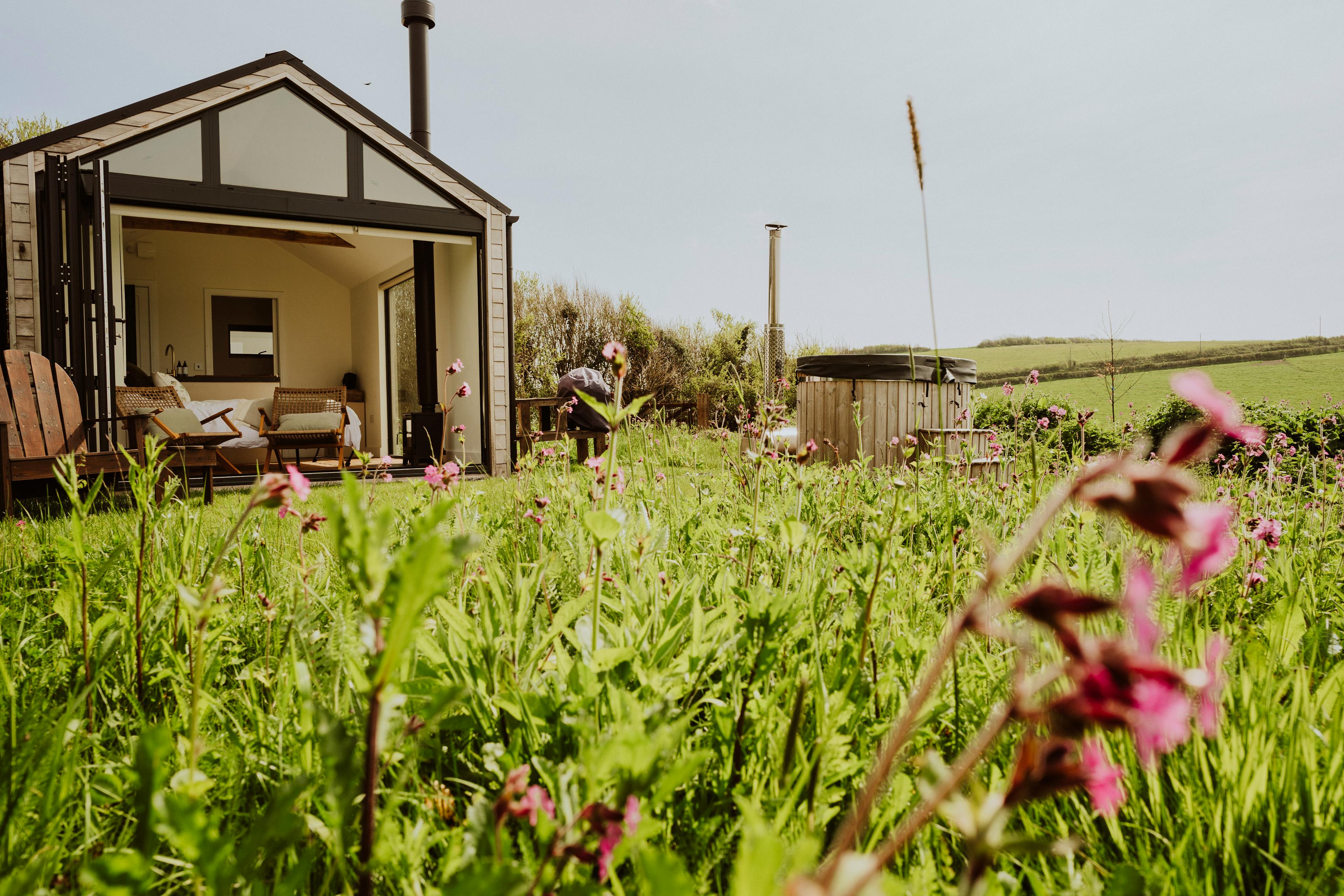Hidden away in a tranquil part of South Devon’s countryside near Modbury, Slate Park is a luxurious cabin surrounded by nature. It has been handcrafted by the local Bourne from Nature team, using materials sourced from the area where possible. Wake up to the sun rising over the stunning surroundings, enjoying the view from your king size bed. Put your feet up in the garden, surrounded by wildflowers and busy insects and birds or head out for a long walk. In the evenings, unwind in the hot tub and watch as the sun sets over the countryside. This is the perfect spot for couples looking to escape the hustle and bustle and reconnect with nature. The front of the cabin has floor-to-ceiling windows letting in plenty of natural light and showcasing the spectacular views of the fields and rolling hills. The king size bed is set just in front of this window, so you can enjoy the view as soon as you wake up in the morning and is equipped with a sustainably made Naturmat mattress topper and responsibly sourced bedding. Move further into the cabin and you’ll find the well-equipped kitchen. There’s everything you’ll need here to rustle up delicious meals after a trip to the beach or an afternoon strolling through Modbury. The ensuite bathroom features a bespoke sink bowl, hand-thrown less than a mile away by a local ceramicist. There’s also underfloor heating to keep you cosy after you’ve stepped out of the rainfall shower. Open up the bi-fold doors at the front of the cabin and extend your living space outside into the pretty garden. There’s a wood-fired hot tub complete with jacuzzi bubbles surrounded by lovely wildflower planting. You can cook outdoors on the ceramic BBQ and there’s also a handy outdoor shower for rinsing wetsuits, boots or muddy paws after a day exploring. The cabin is located in the South Hams, close to the charming town of Modbury. The town has pretty streets with historic architecture, making it a lovely place for a stroll and a cup of coffee. Visit the Modbury Art Gallery to see some contemporary pieces from local and national artists and look out for the beautiful stained glass windows in St George’s Church. Head out into the countryside for long walks or bike rides along the Erme-Plym Trail or the South West Coastal Path or have a go at some watersports at the nearby beaches of Bantham and Bigbury-on-Sea.