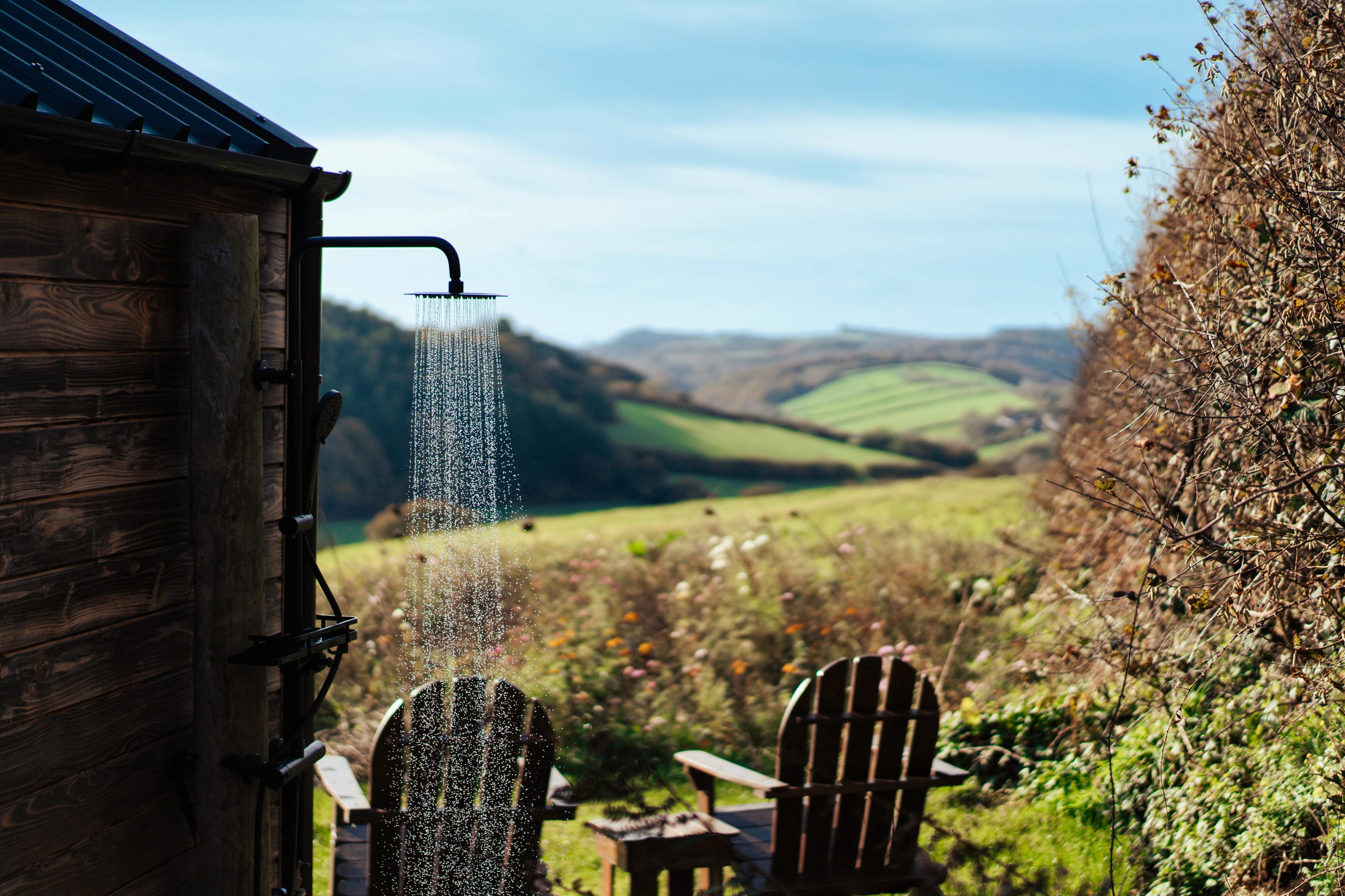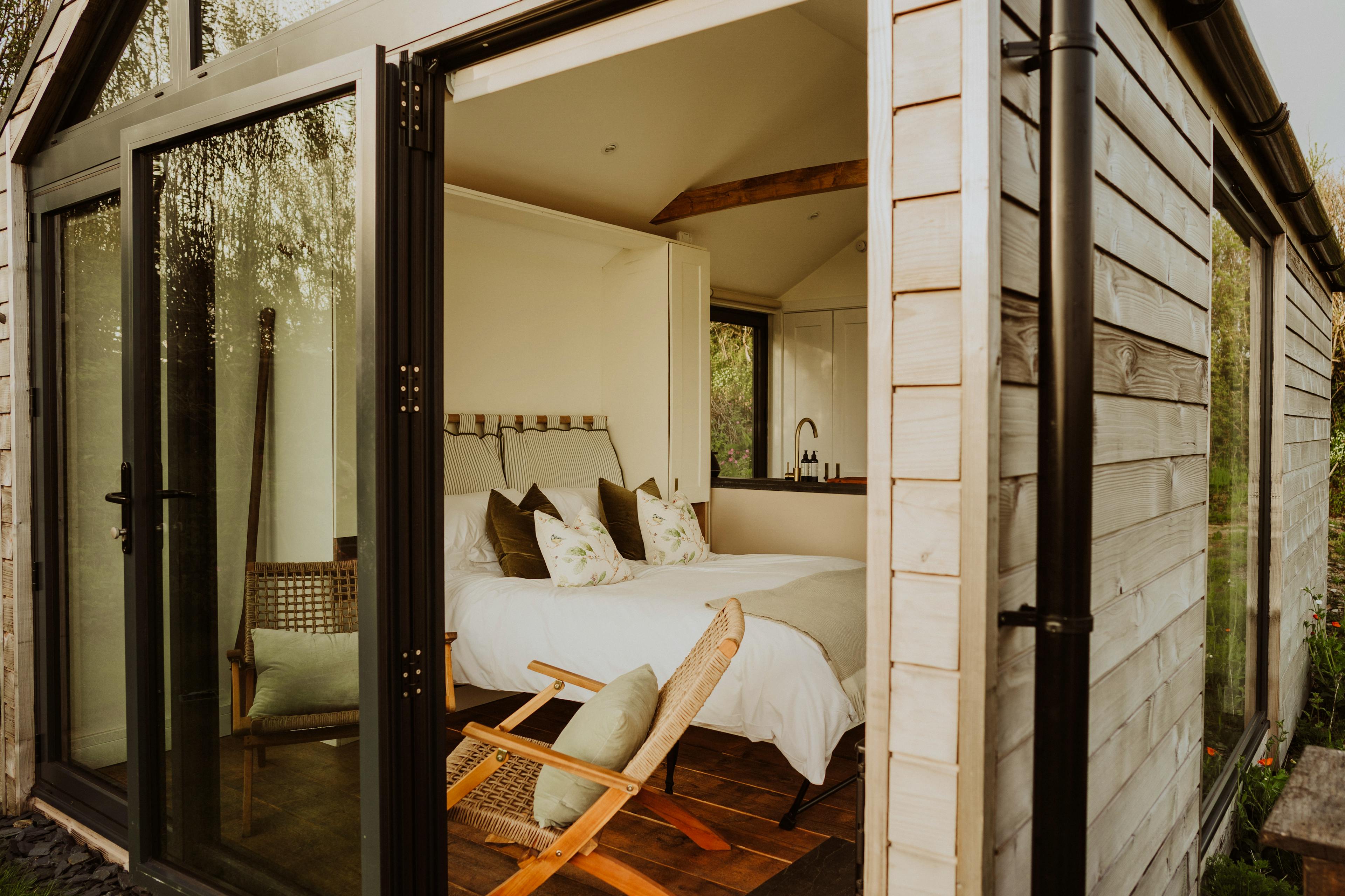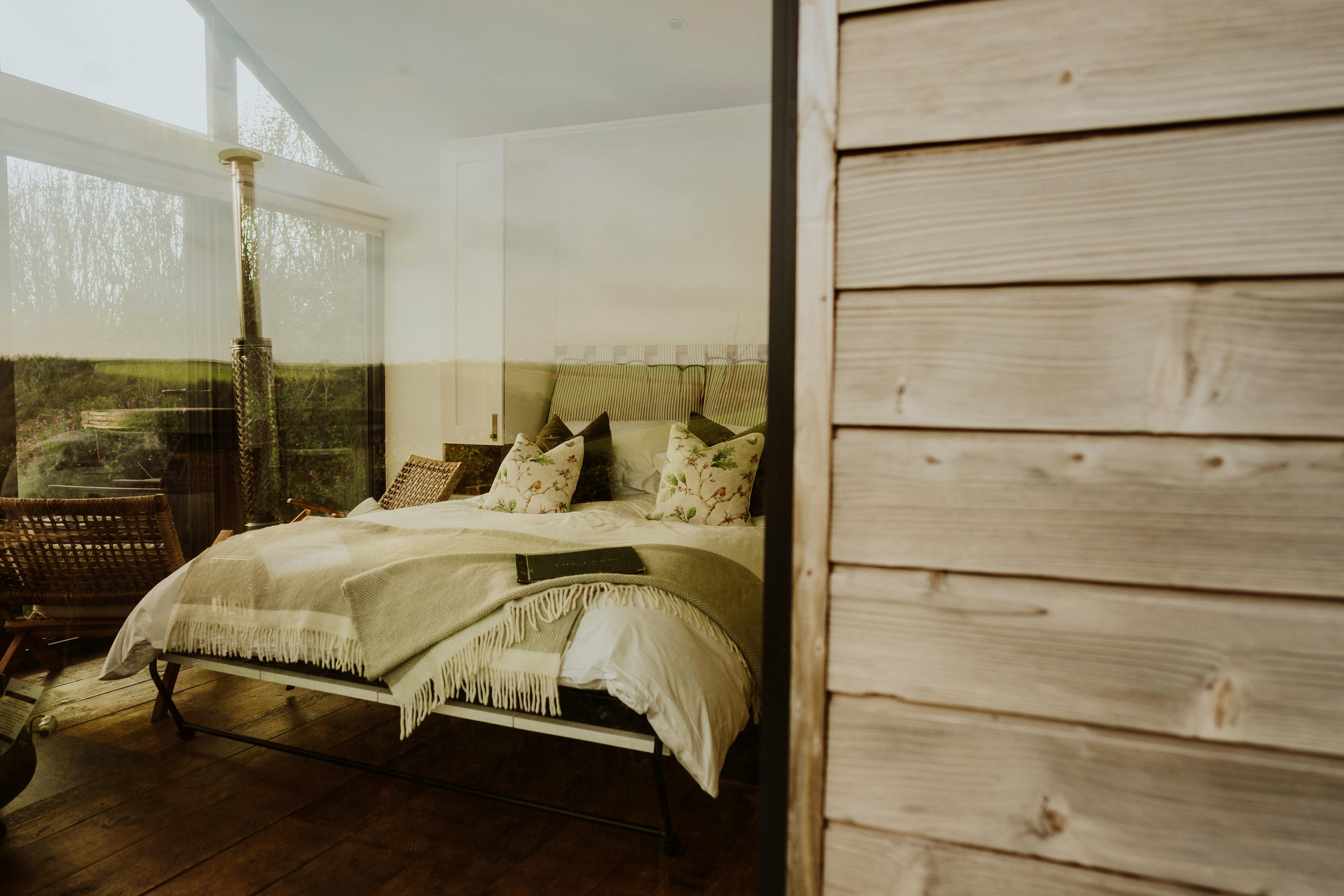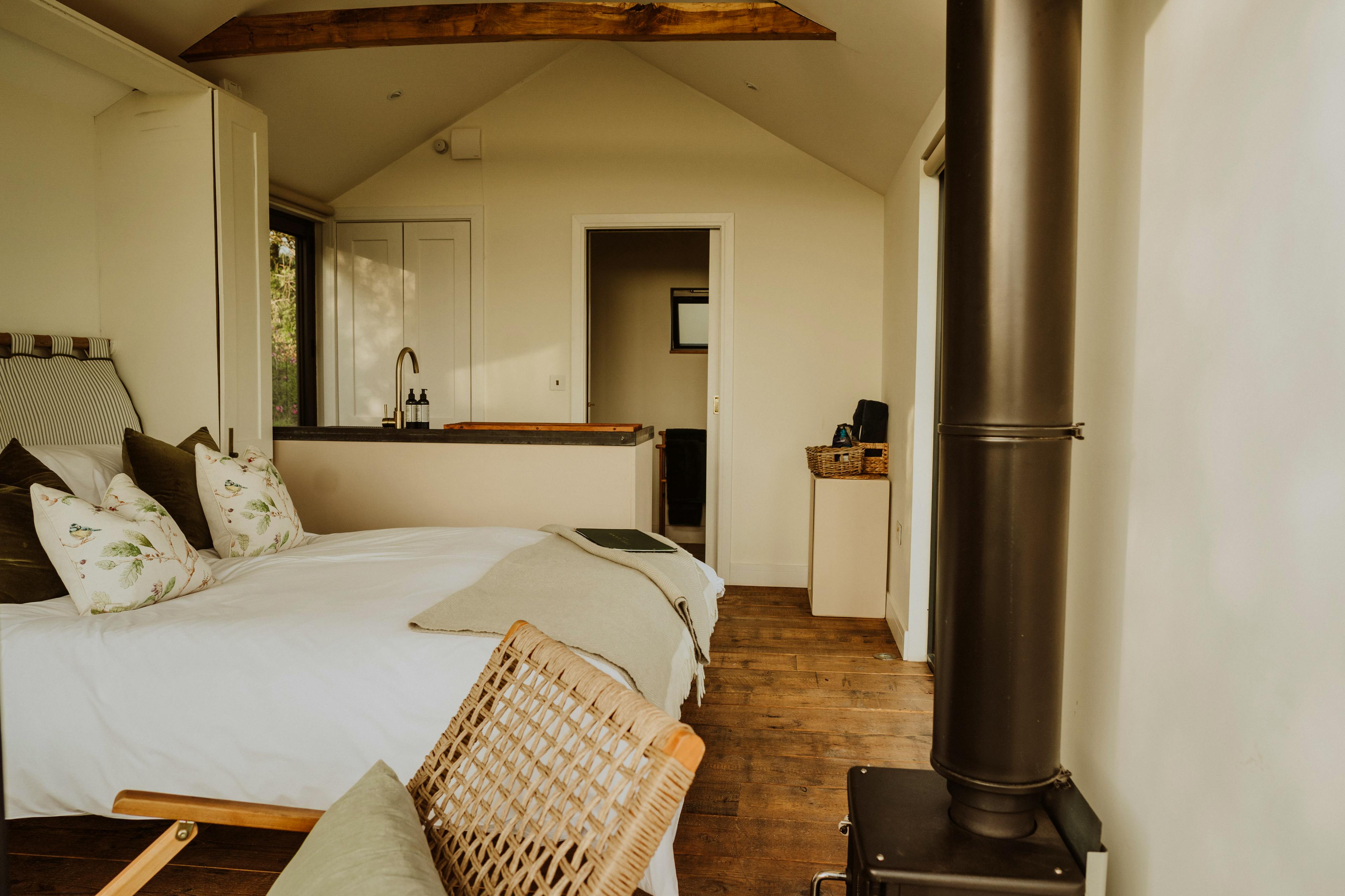 Hidden away in a tranquil part of South Devon’s countryside near Modbury, Slate Park is a luxurious cabin surrounded by nature. It has been handcrafted by the local Bourne from Nature team, using materials sourced from the area where possible. Wake up to the sun rising over the stunning surroundings, enjoying the view from your king size bed. Put your feet up in the garden, surrounded by wildflowers and busy insects and birds or head out for a long walk. In the evenings, unwind in the hot tub and watch as the sun sets over the countryside. This is the perfect spot for couples looking to escape the hustle and bustle and reconnect with nature. The front of the cabin has floor-to-ceiling windows letting in plenty of natural light and showcasing the spectacular views of the fields and rolling hills. The king size bed is set just in front of this window, so you can enjoy the view as soon as you wake up in the morning and is equipped with a sustainably made Naturmat mattress topper and responsibly sourced bedding. Move further into the cabin and you’ll find the well-equipped kitchen. There’s everything you’ll need here to rustle up delicious meals after a trip to the beach or an afternoon strolling through Modbury. The ensuite bathroom features a bespoke sink bowl, hand-thrown less than a mile away by a local ceramicist. There’s also underfloor heating to keep you cosy after you’ve stepped out of the rainfall shower. Open up the bi-fold doors at the front of the cabin and extend your living space outside into the pretty garden. There’s a wood-fired hot tub complete with jacuzzi bubbles surrounded by lovely wildflower planting. You can cook outdoors on the ceramic BBQ and there’s also a handy outdoor shower for rinsing wetsuits, boots or muddy paws after a day exploring. The cabin is located in the South Hams, close to the charming town of Modbury. The town has pretty streets with historic architecture, making it a lovely place for a stroll and a cup of coffee. Visit the Modbury Art Gallery to see some contemporary pieces from local and national artists and look out for the beautiful stained glass windows in St George’s Church. Head out into the countryside for long walks or bike rides along the Erme-Plym Trail or the South West Coastal Path or have a go at some watersports at the nearby beaches of Bantham and Bigbury-on-Sea.