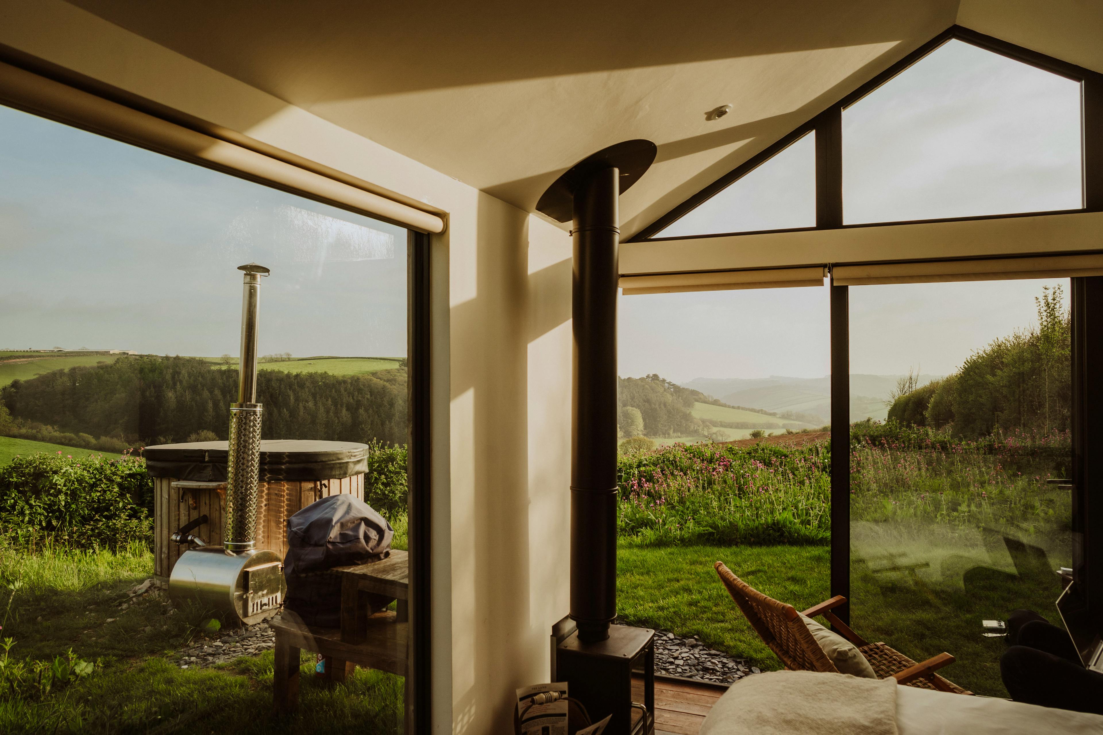 Bespoke cabin with a hot tub and stunning views overlooking South Devon’s beautiful countryside, perfect for a peaceful couple’s escape.