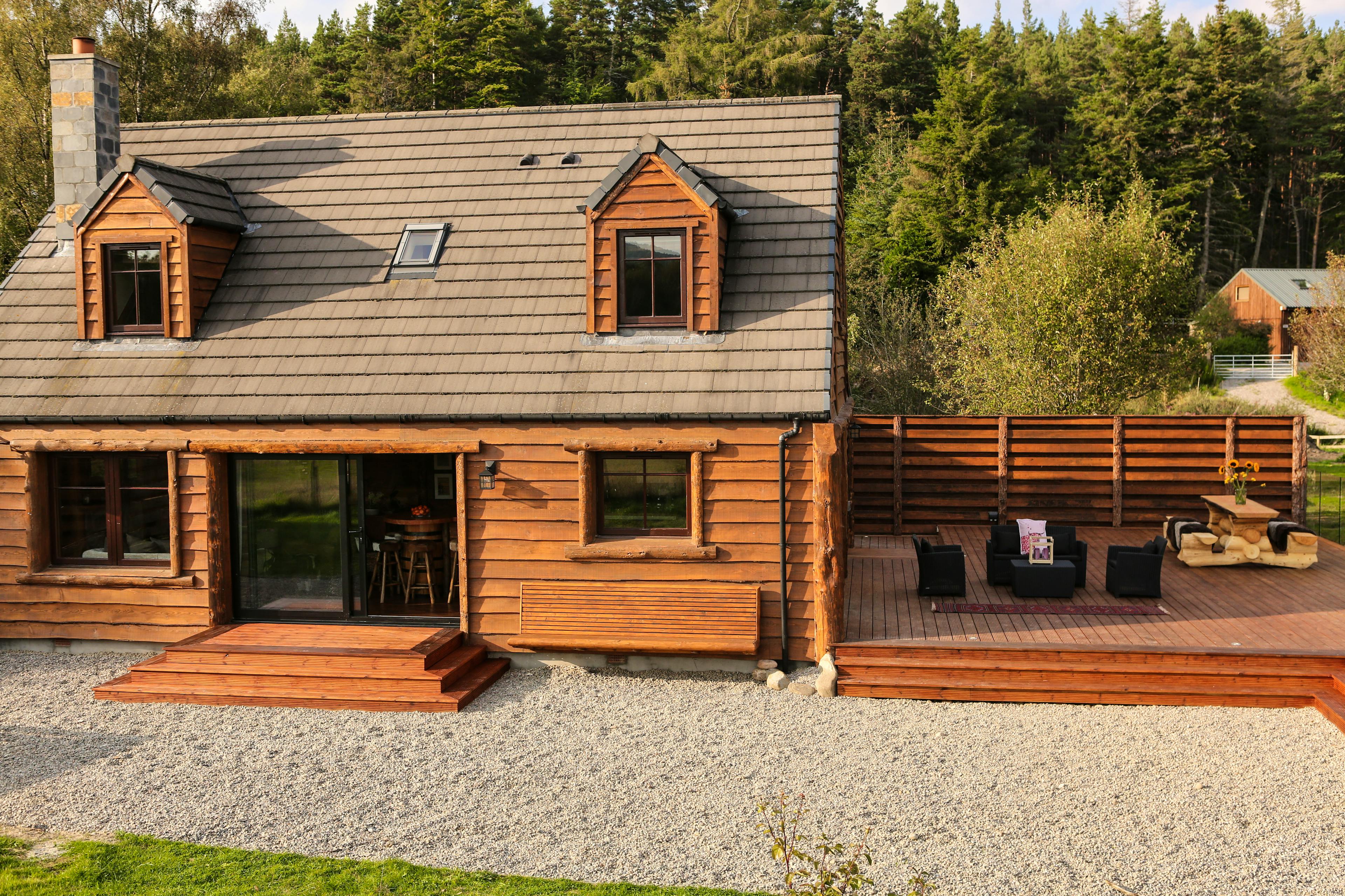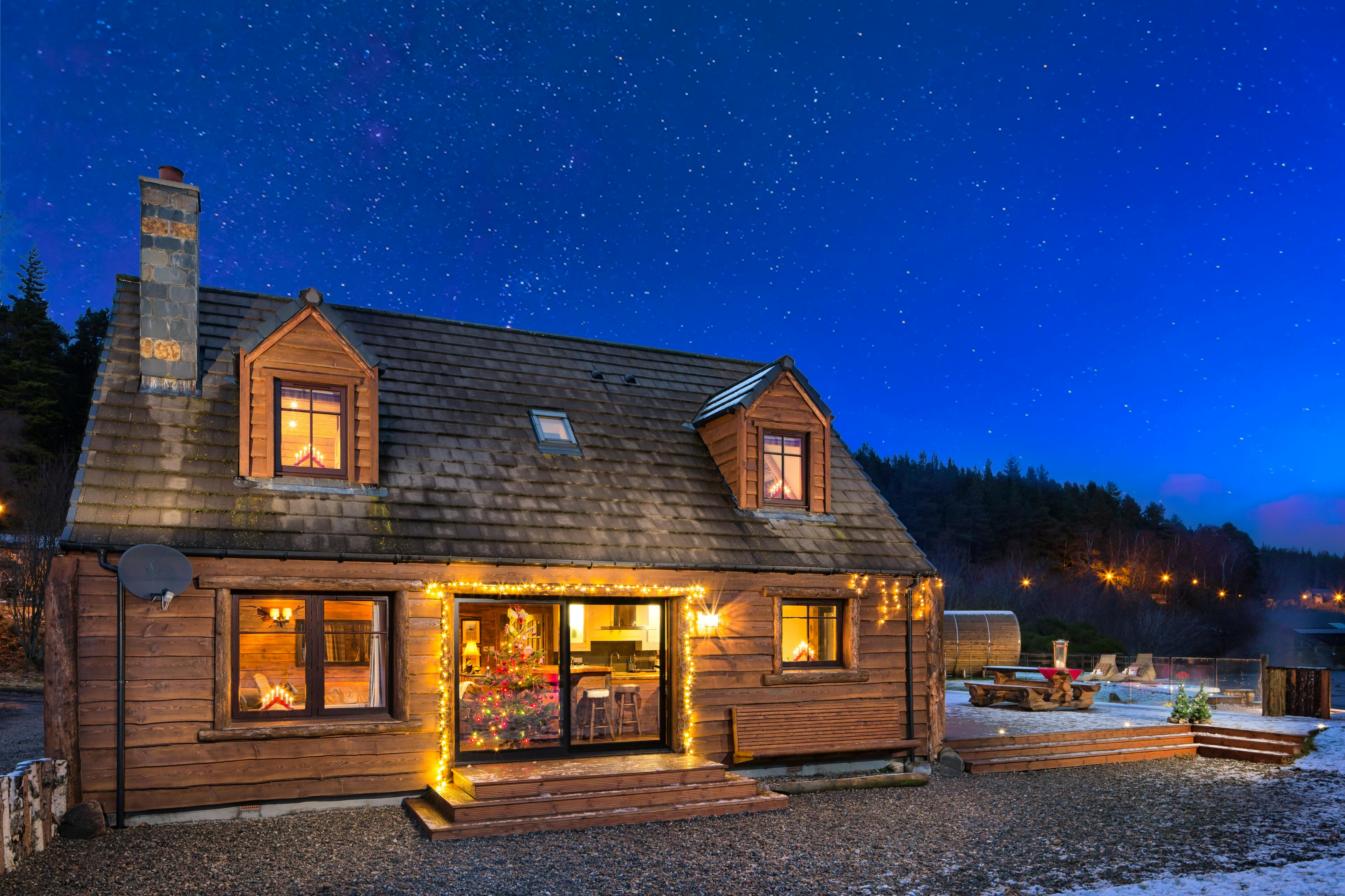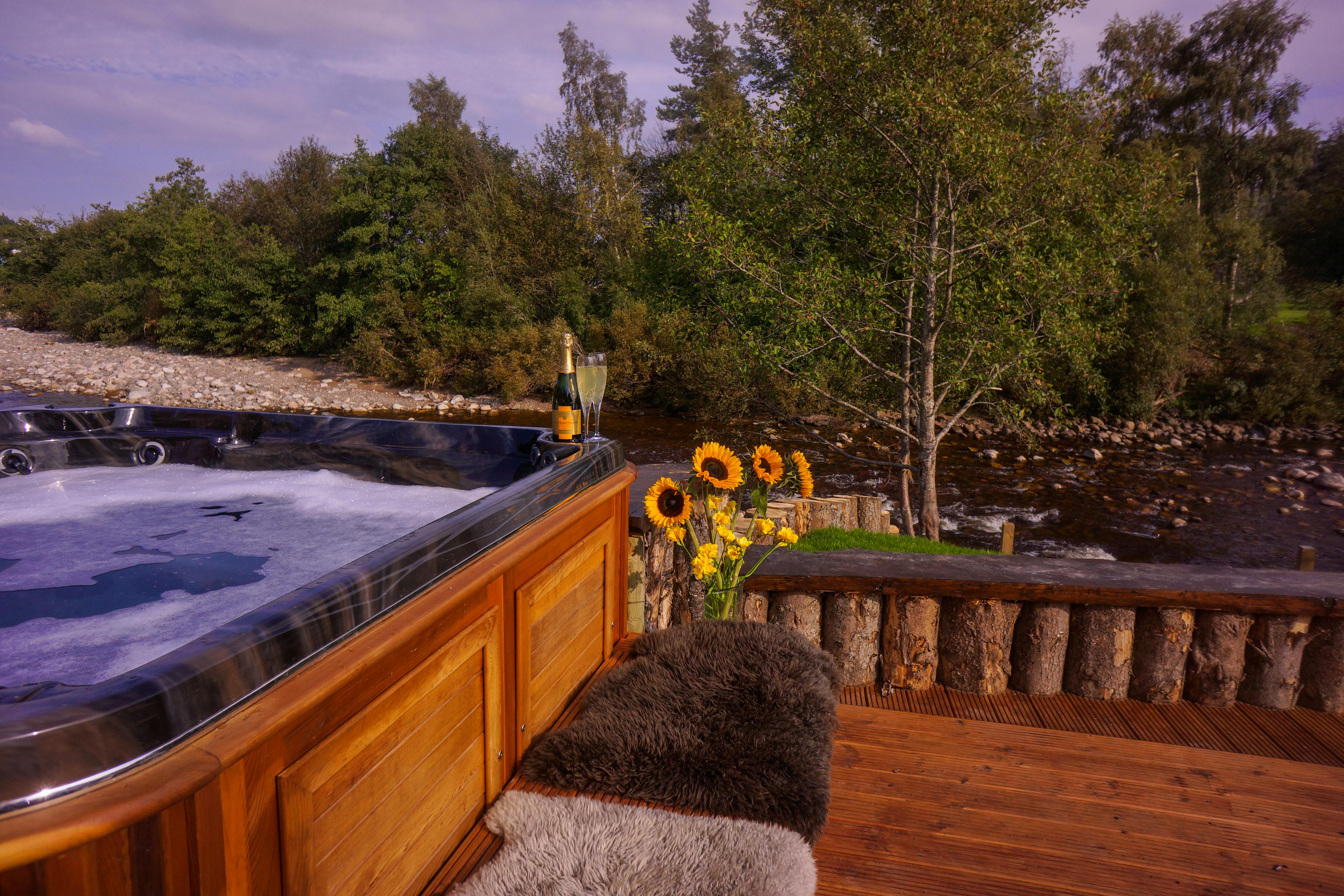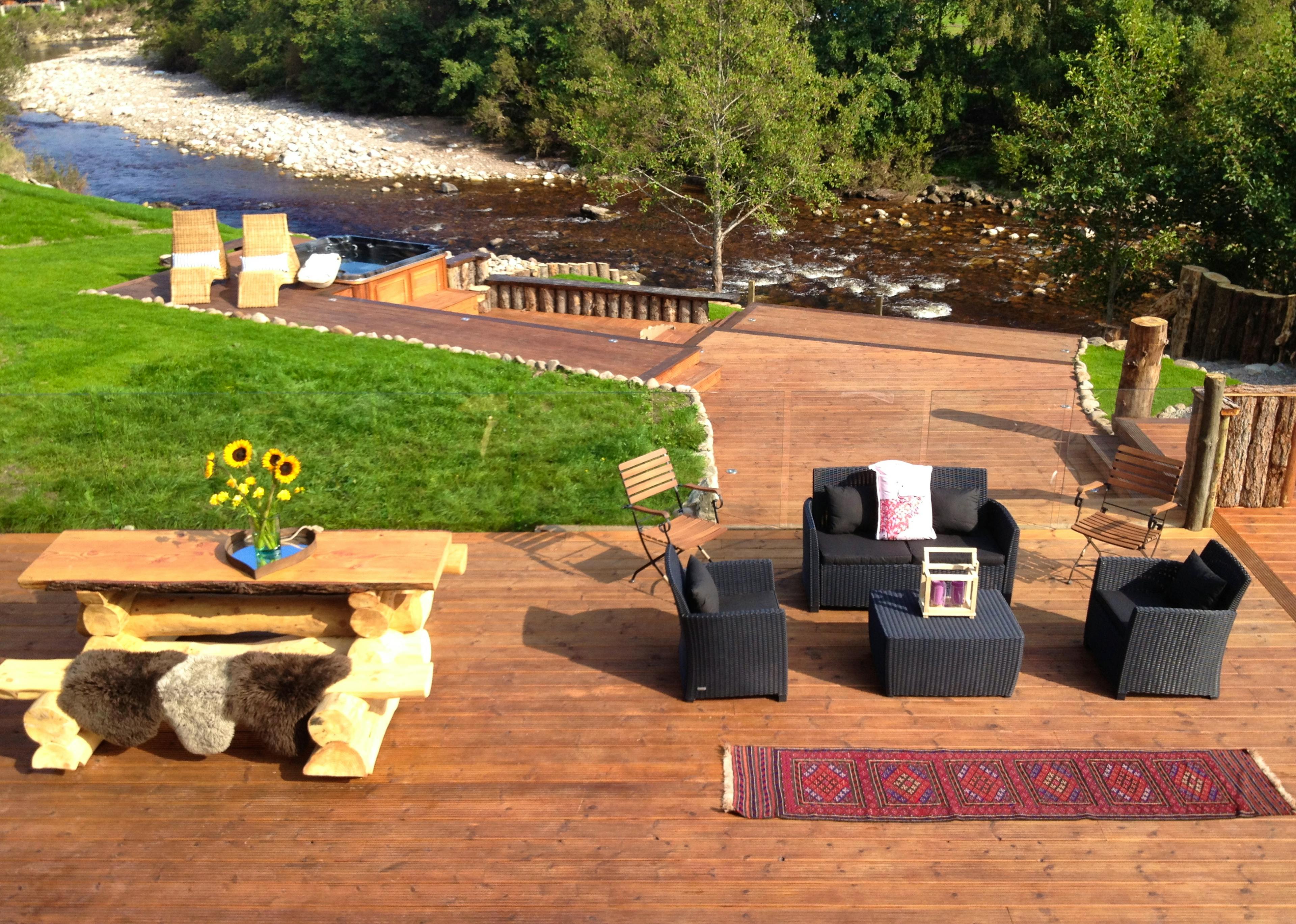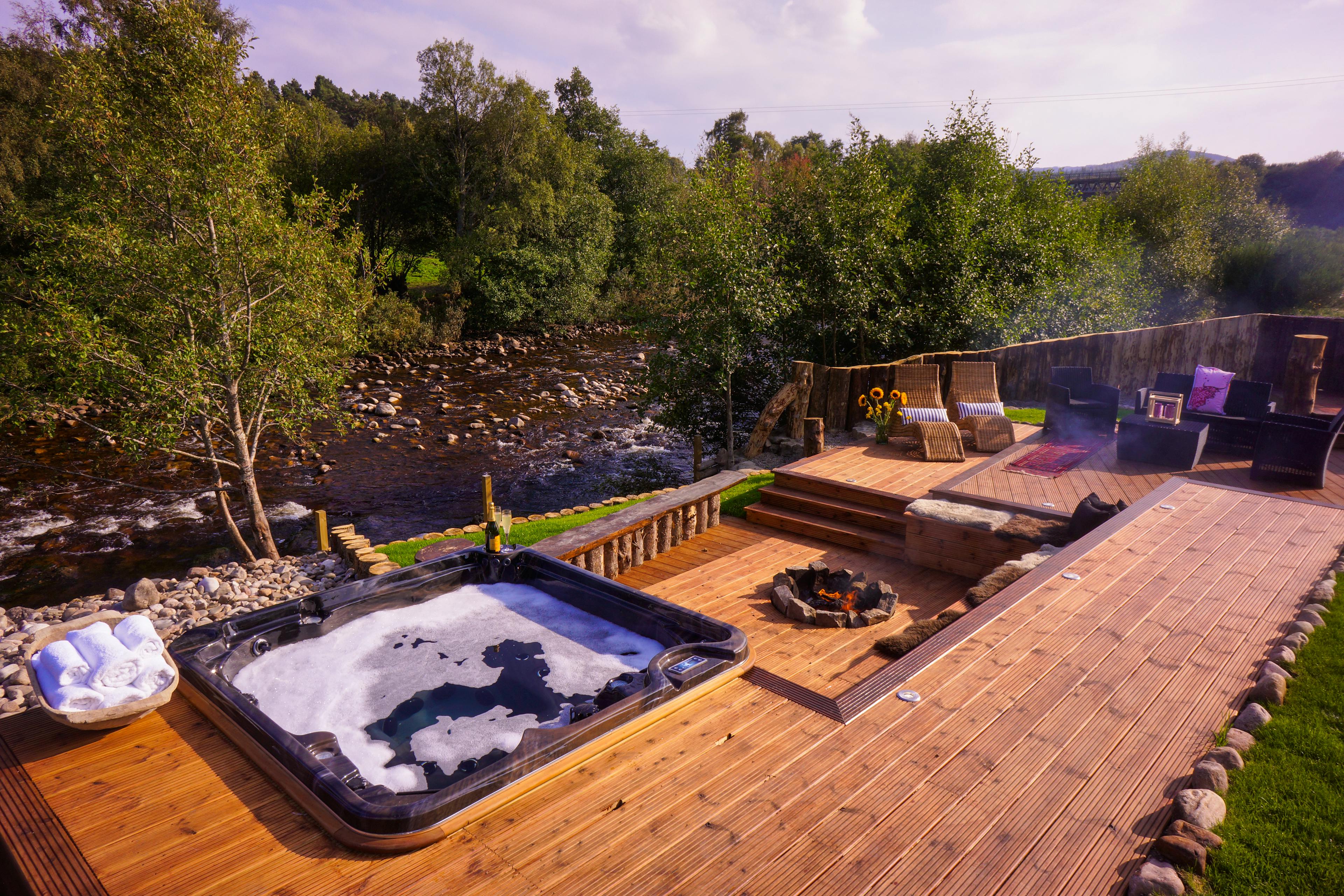 Huge log cabin on the banks of a river in the Cairngorms National Park with a hot tub and barrel sauna, perfect for Highland escapes with friends and family.