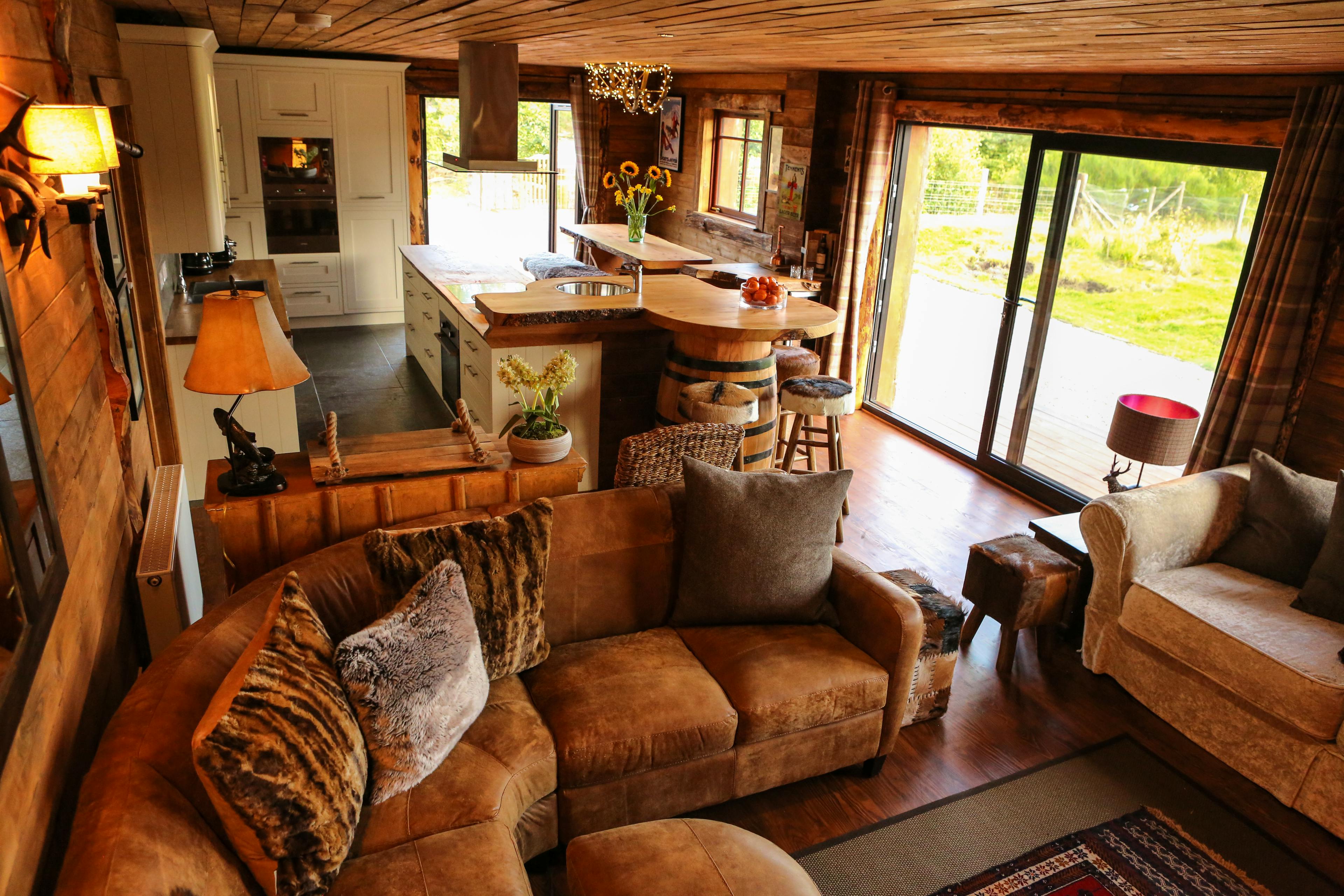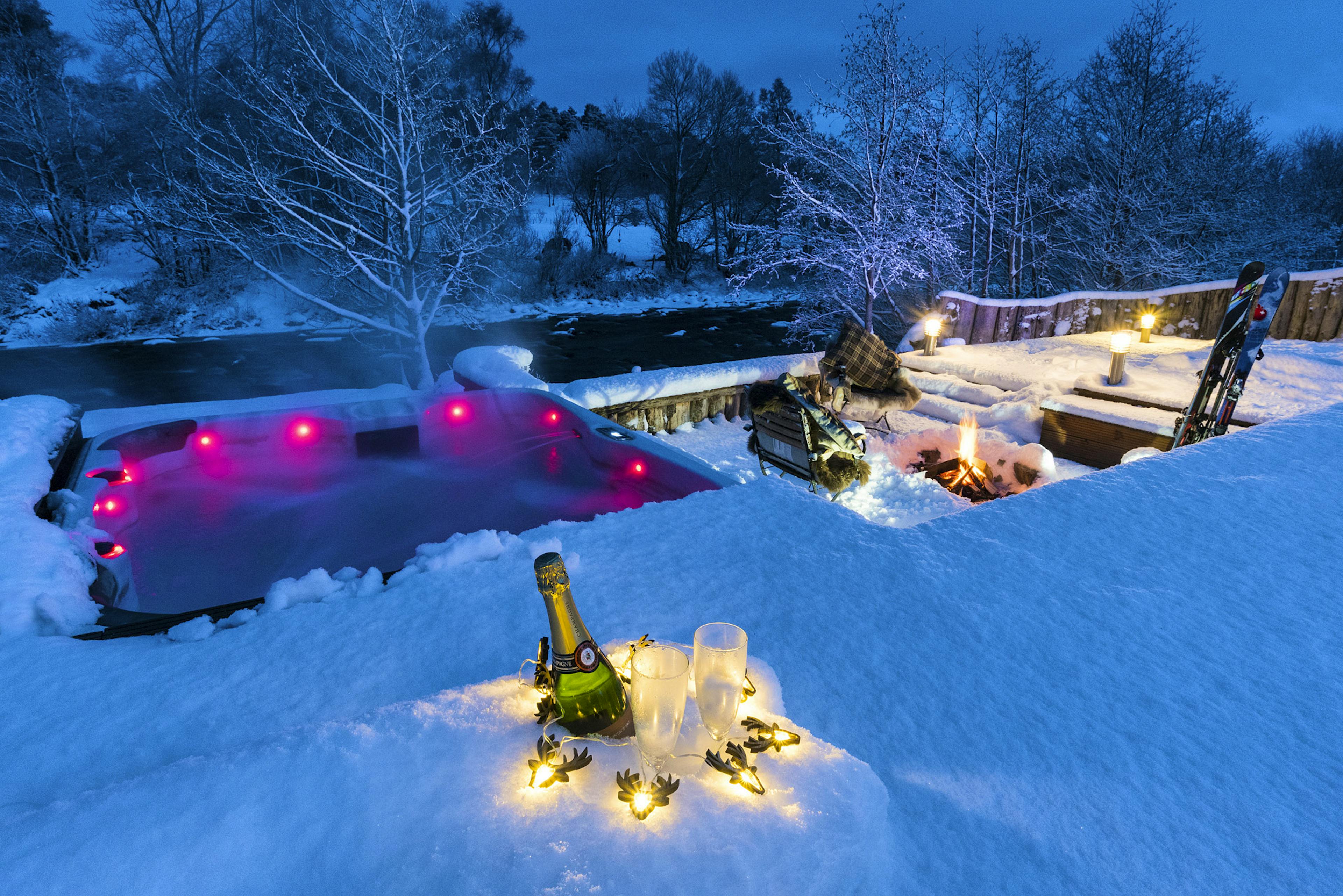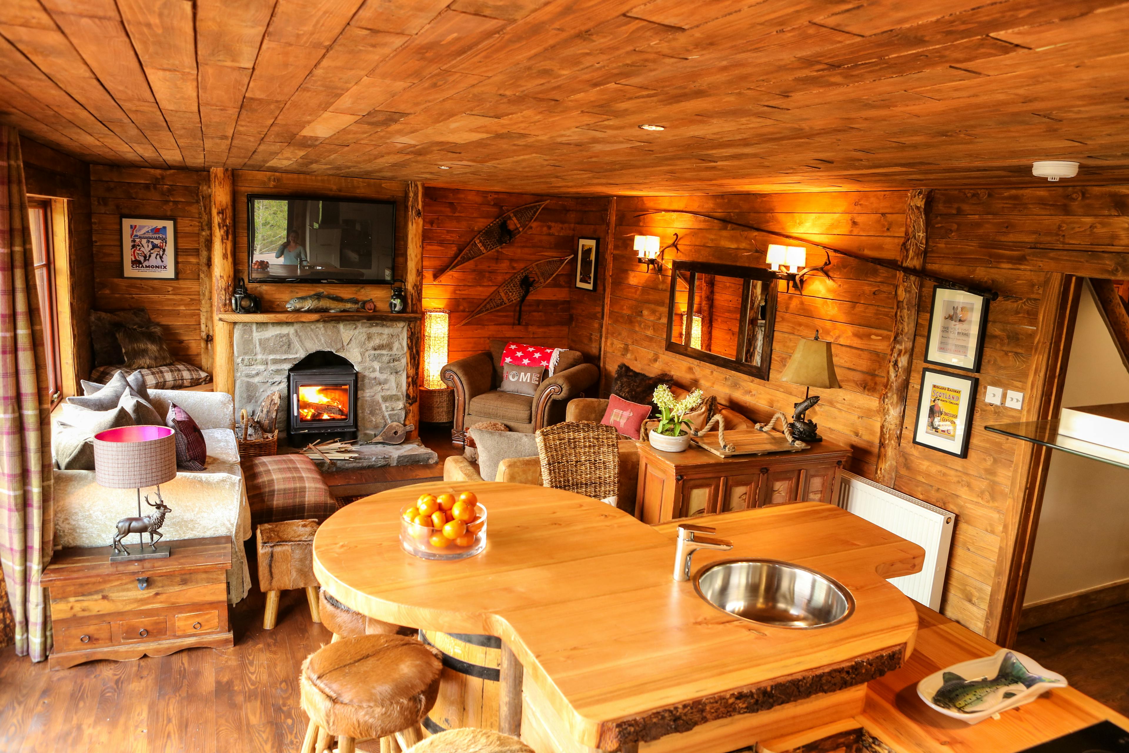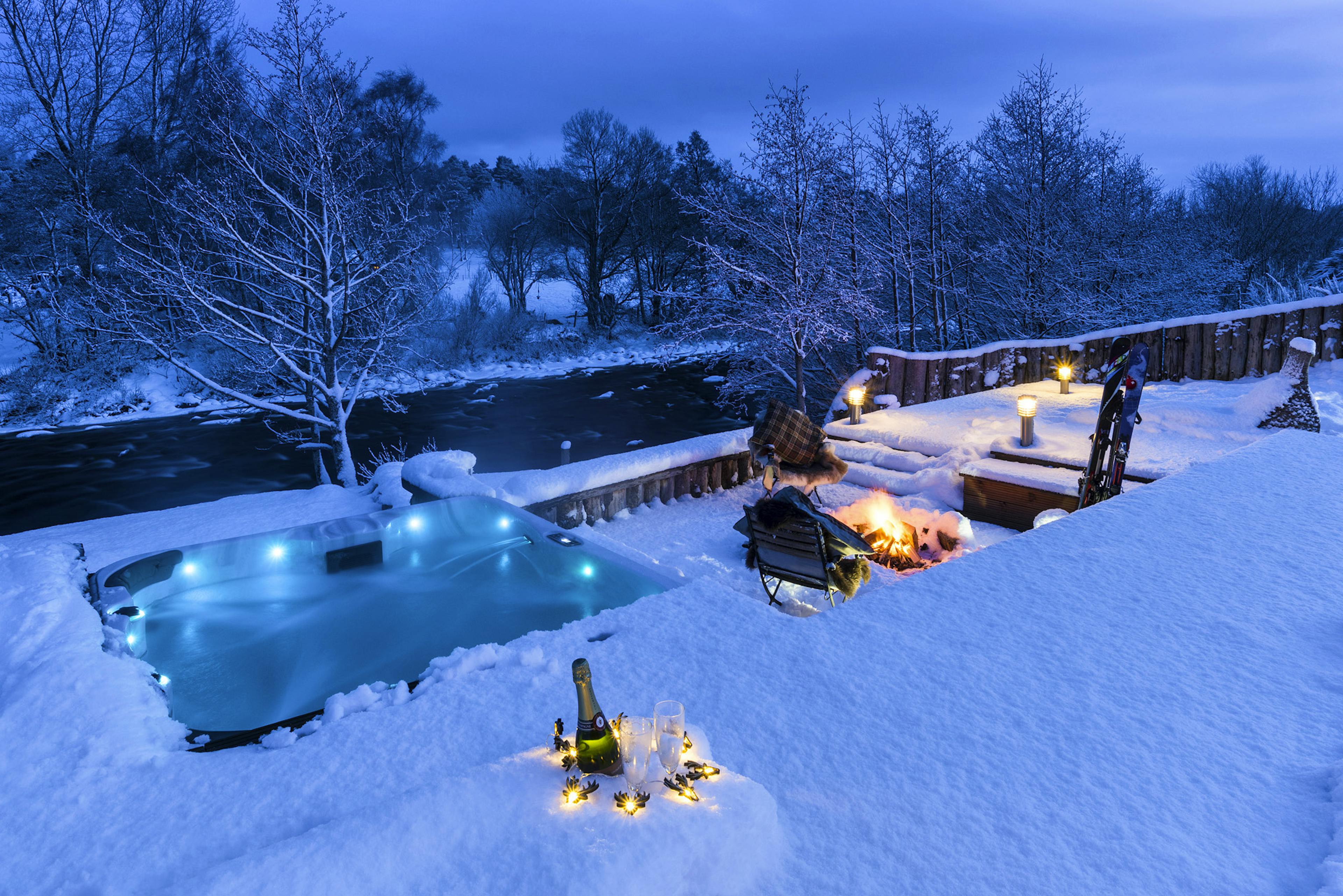 Huge log cabin on the banks of a river in the Cairngorms National Park with a hot tub and barrel sauna, perfect for Highland escapes with friends and family.