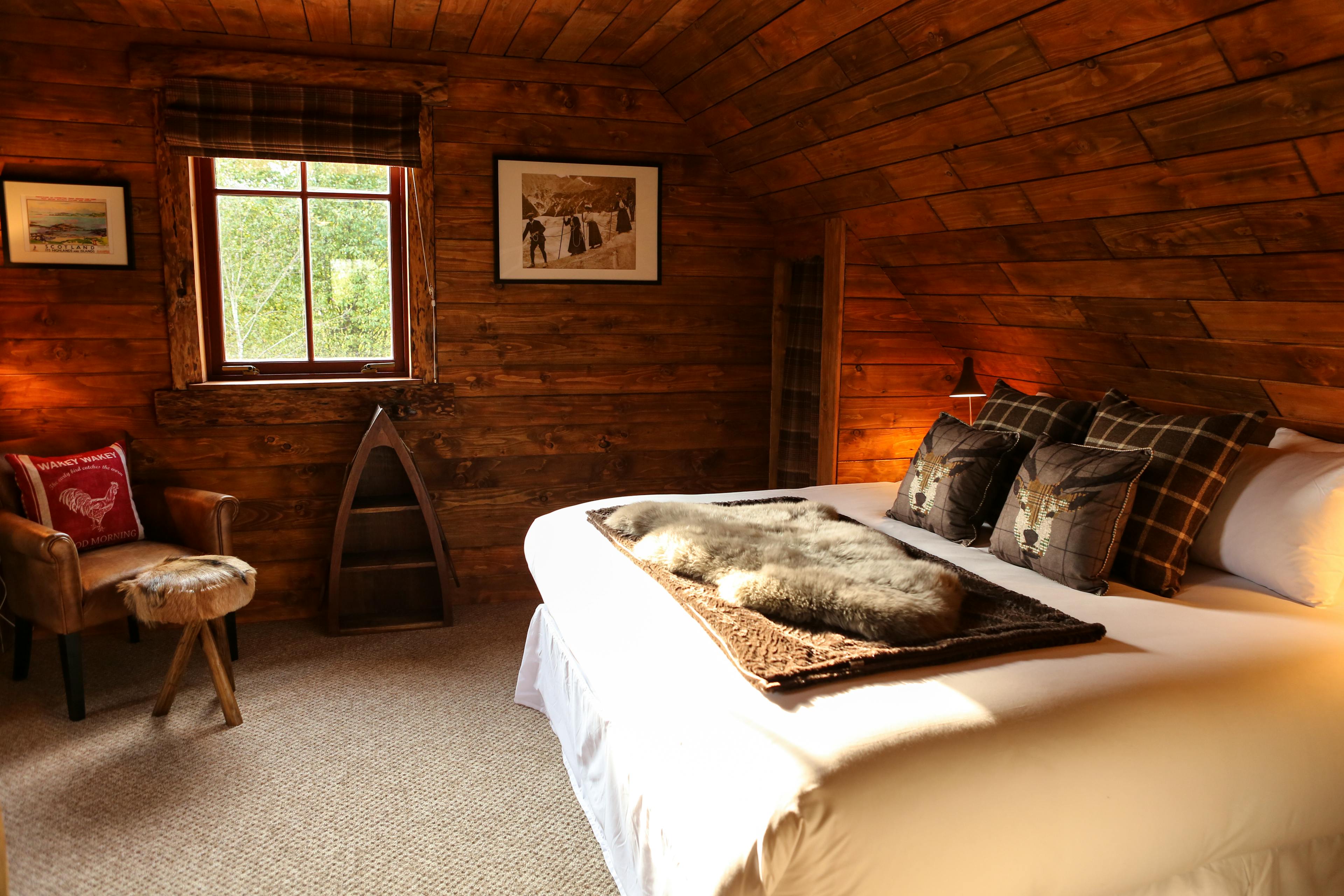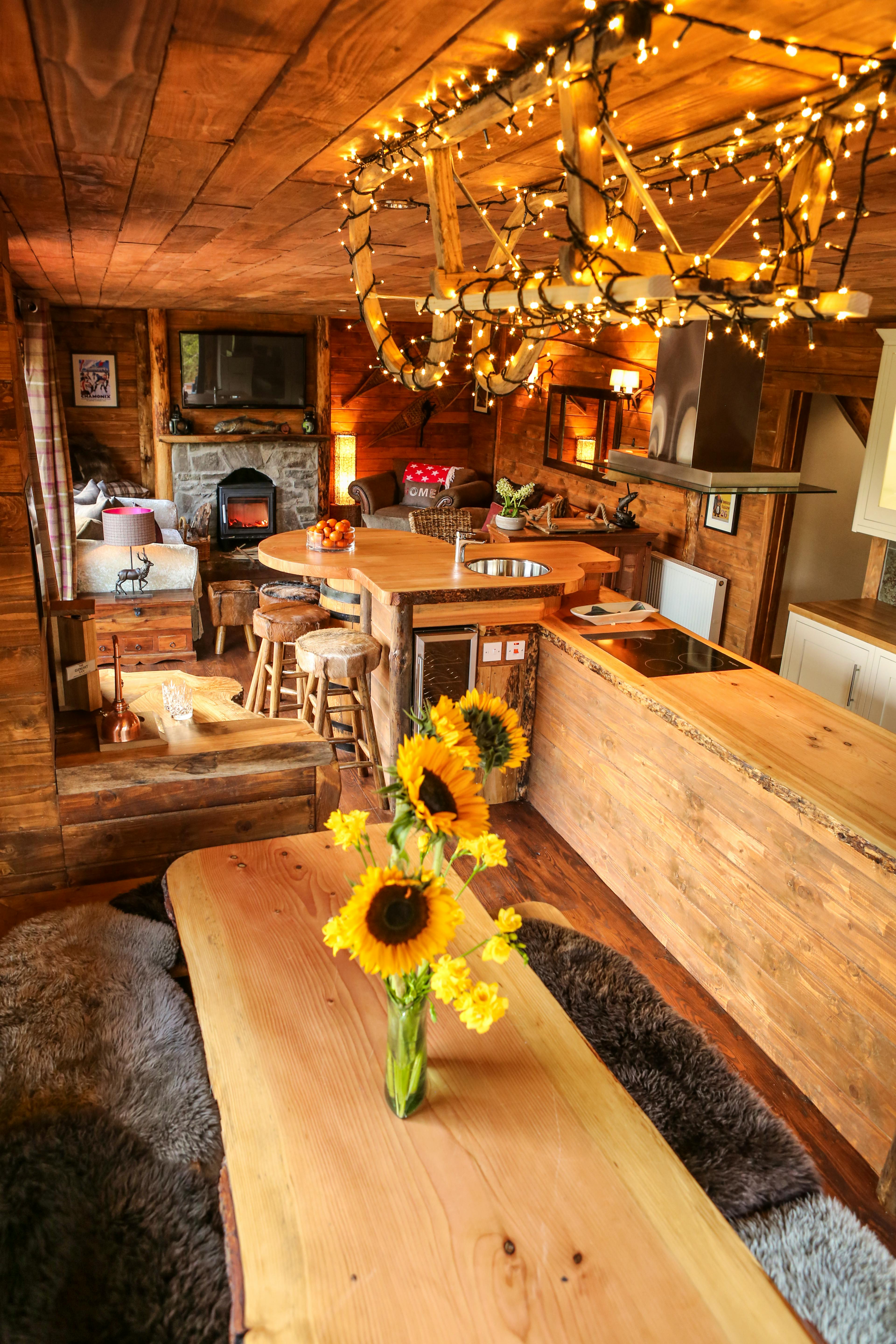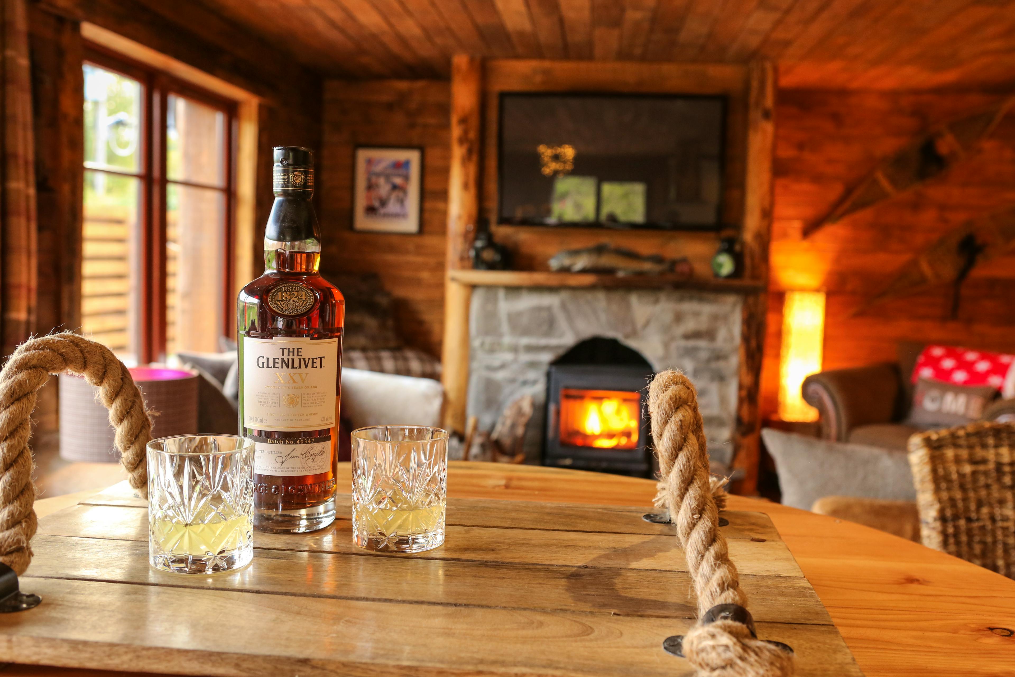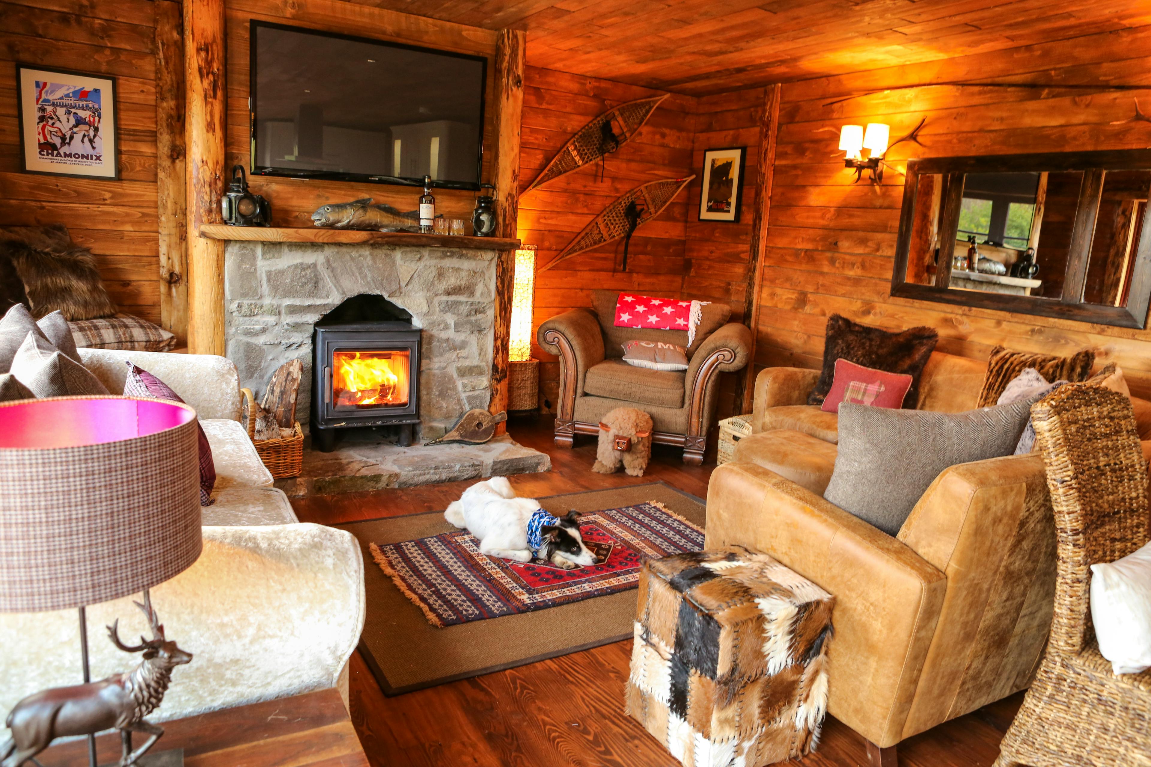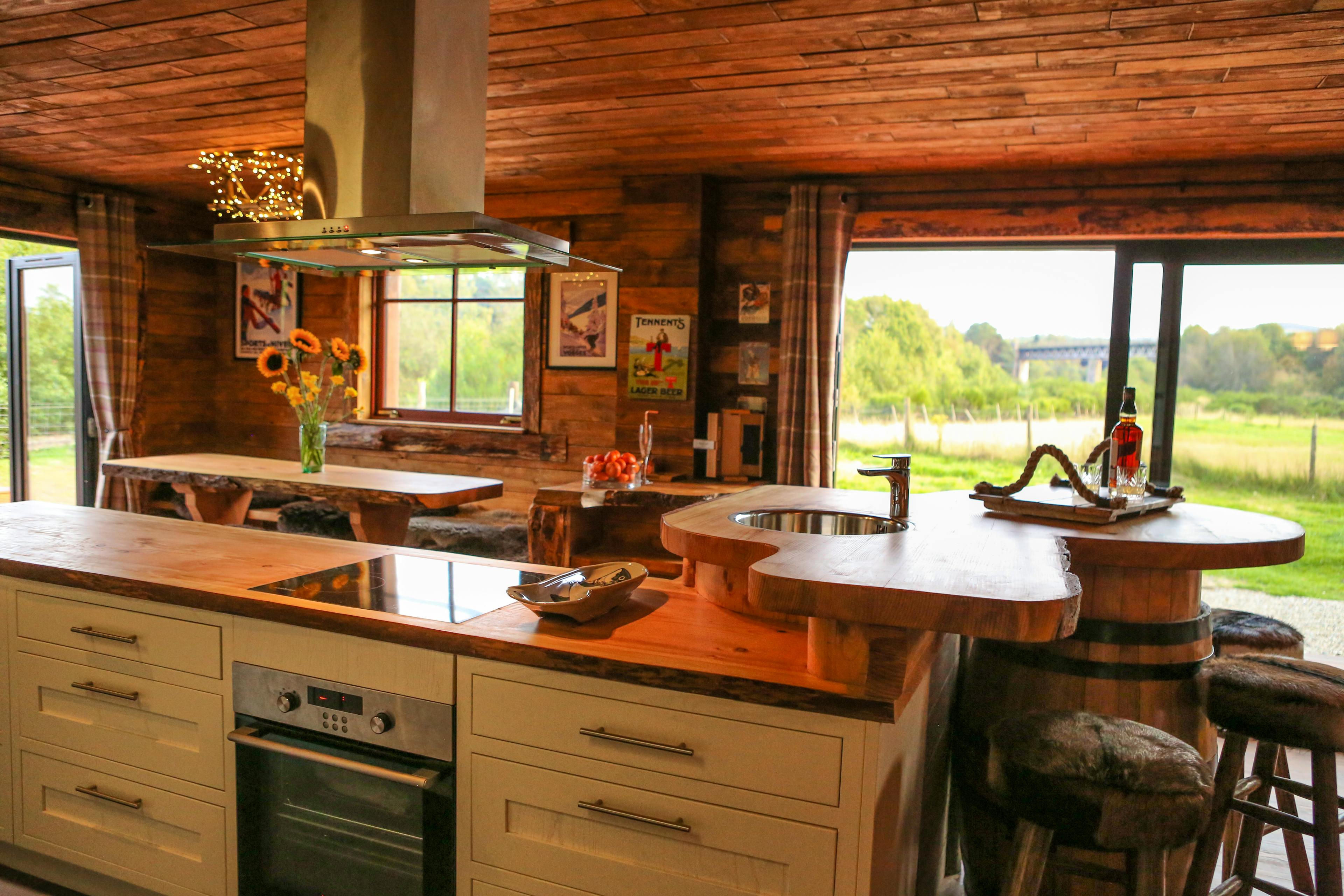 Huge log cabin on the banks of a river in the Cairngorms National Park with a hot tub and barrel sauna, perfect for Highland escapes with friends and family.
