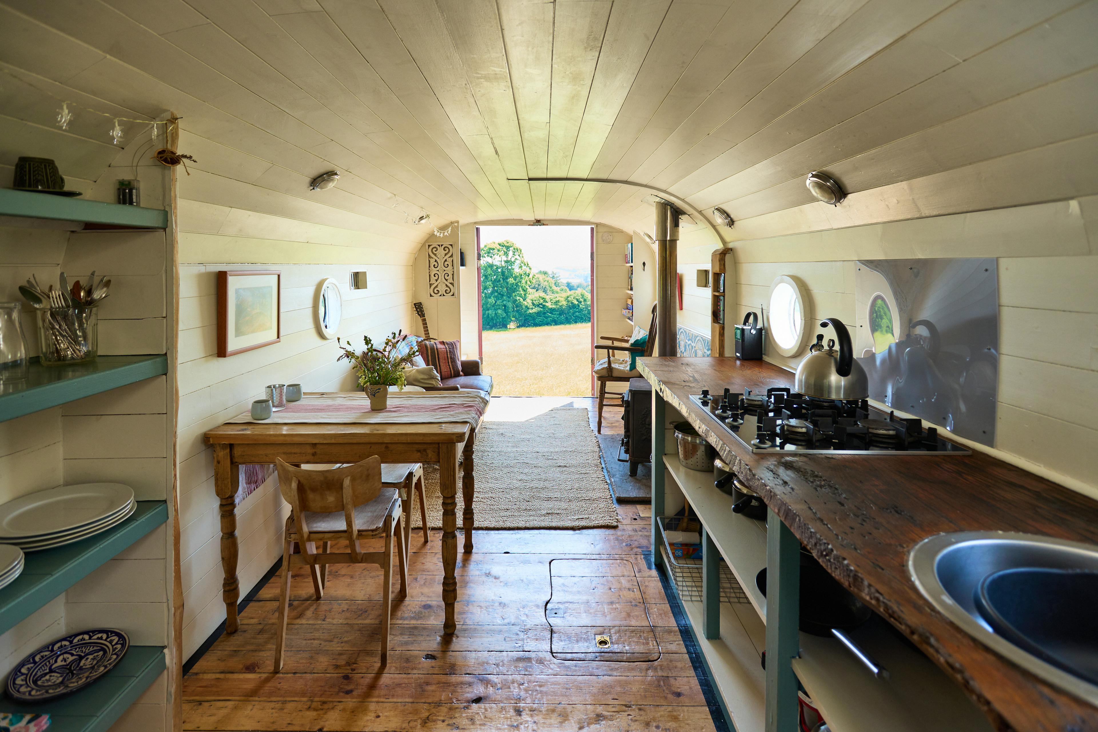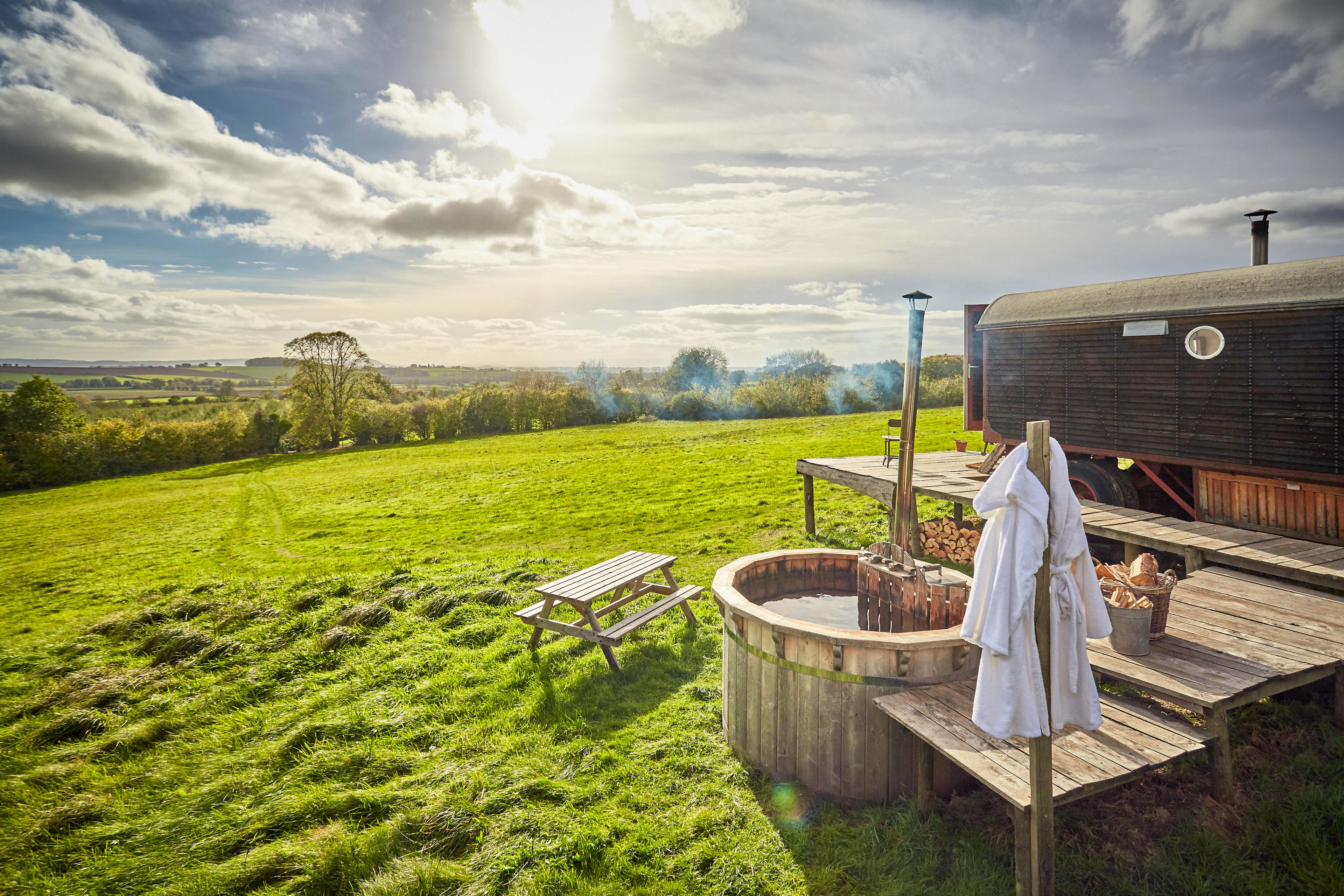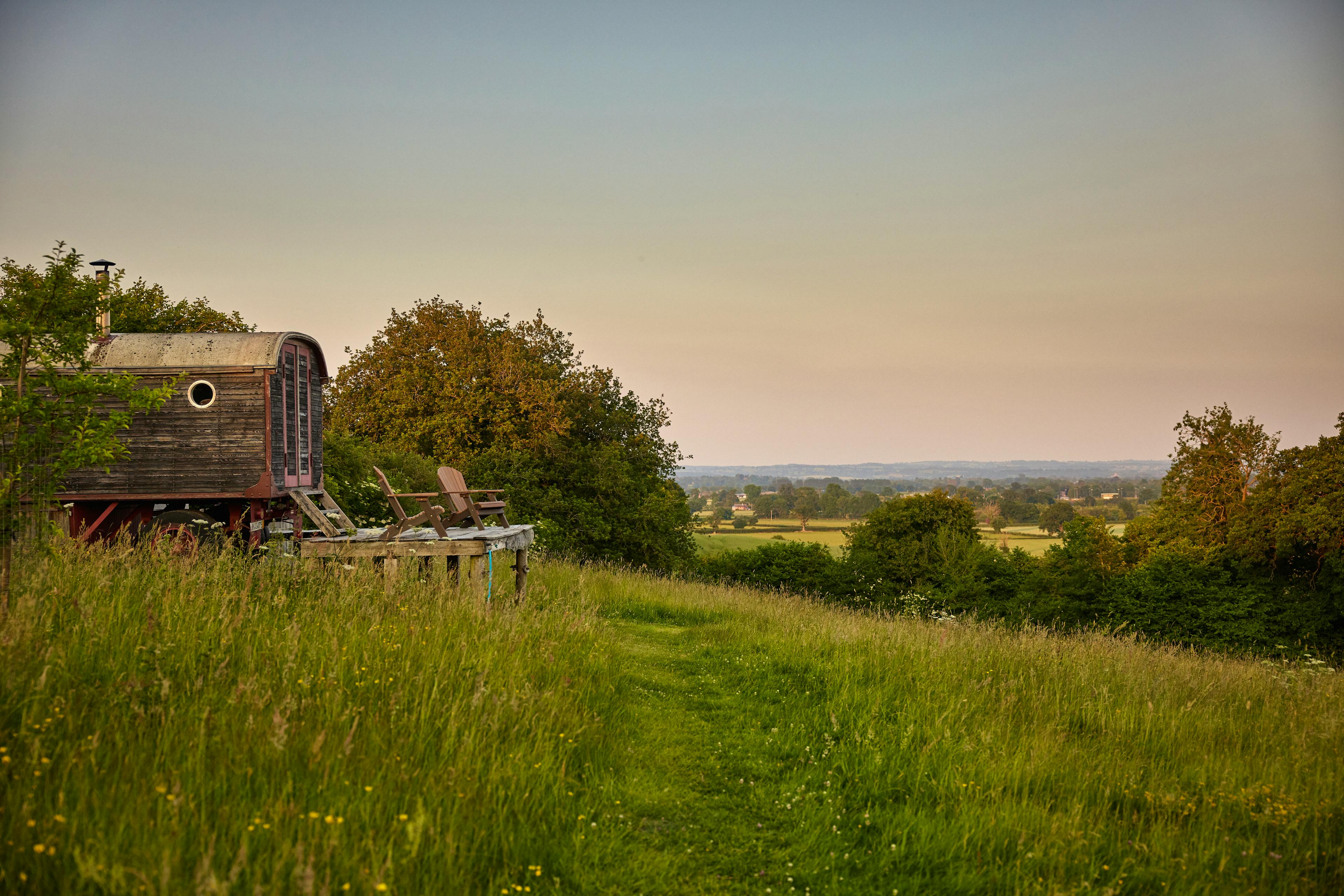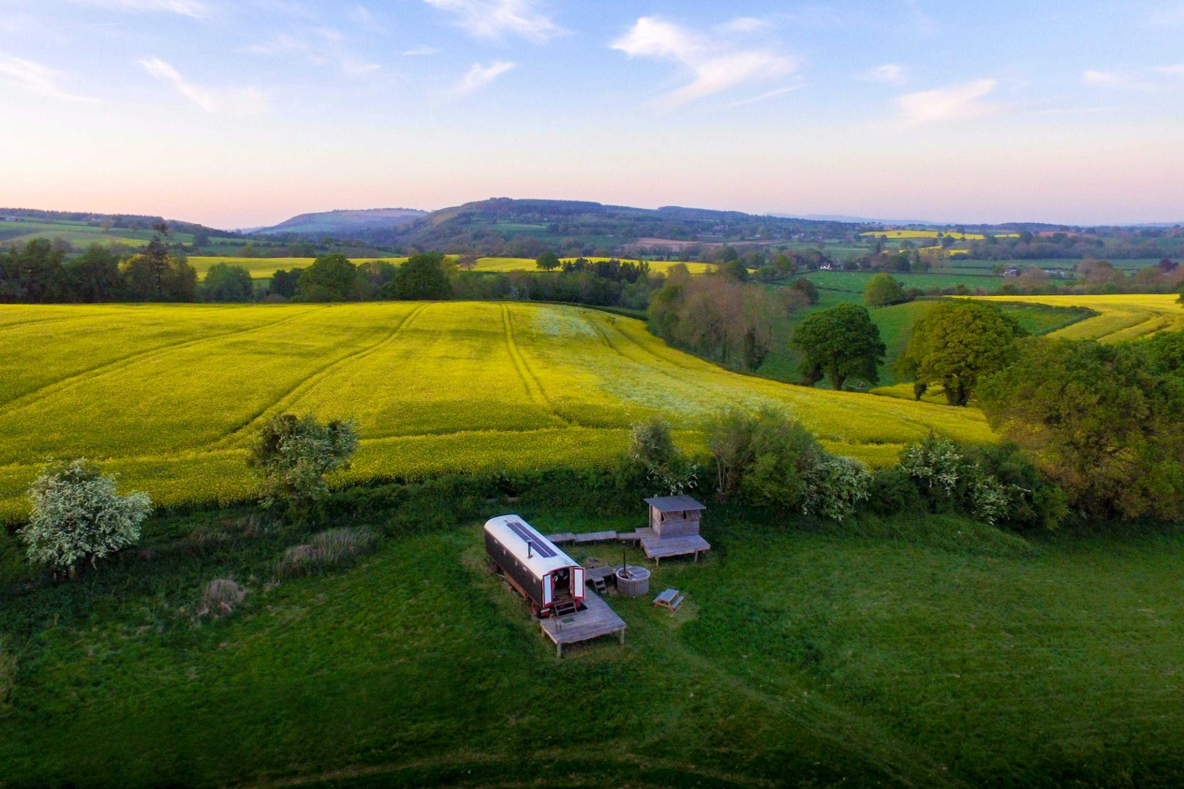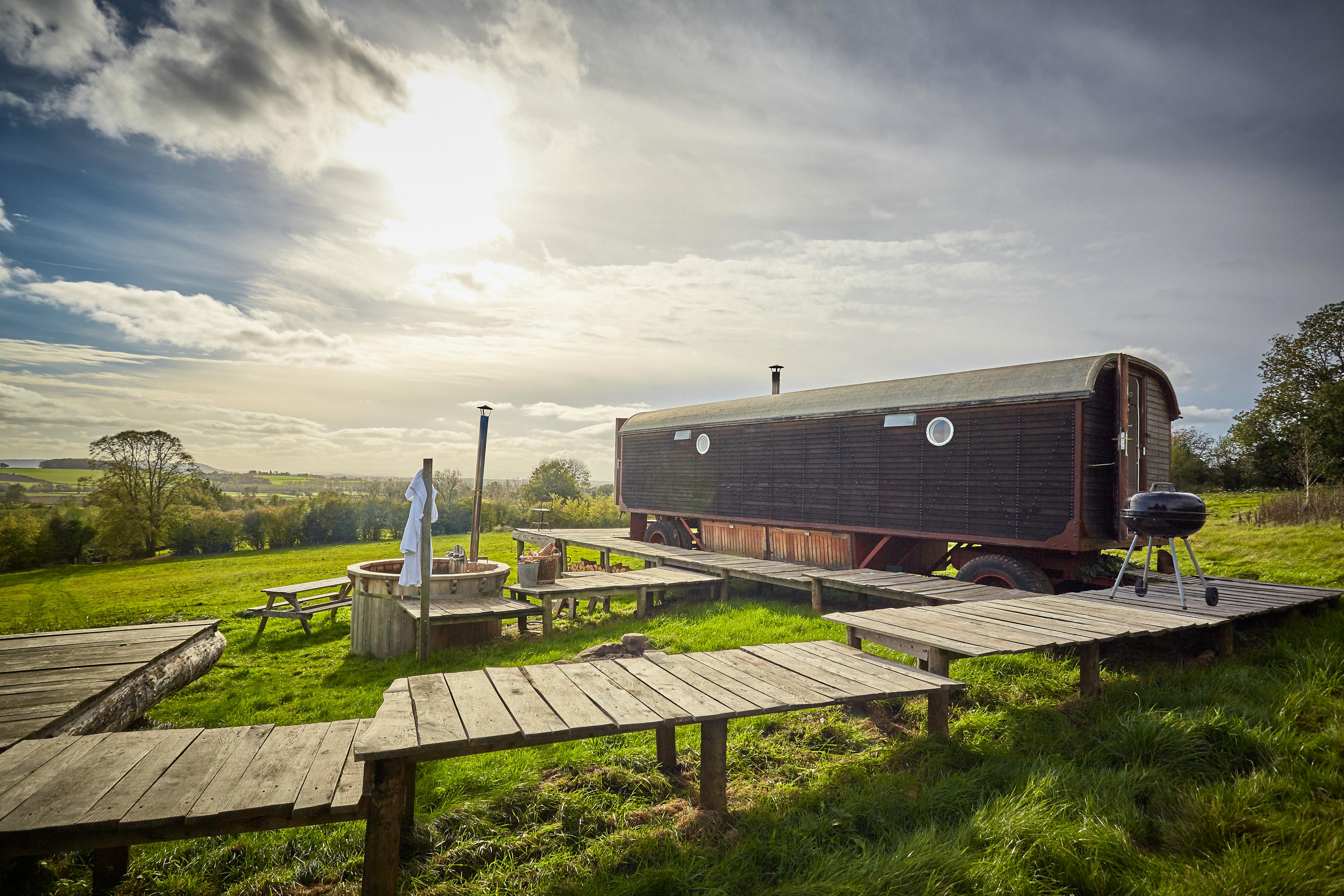 A beautiful, wood-panelled circus wagon looking out across acres of fields in Herefordshire, perfect for stargazing from the outdoor hot tub on clear nights.