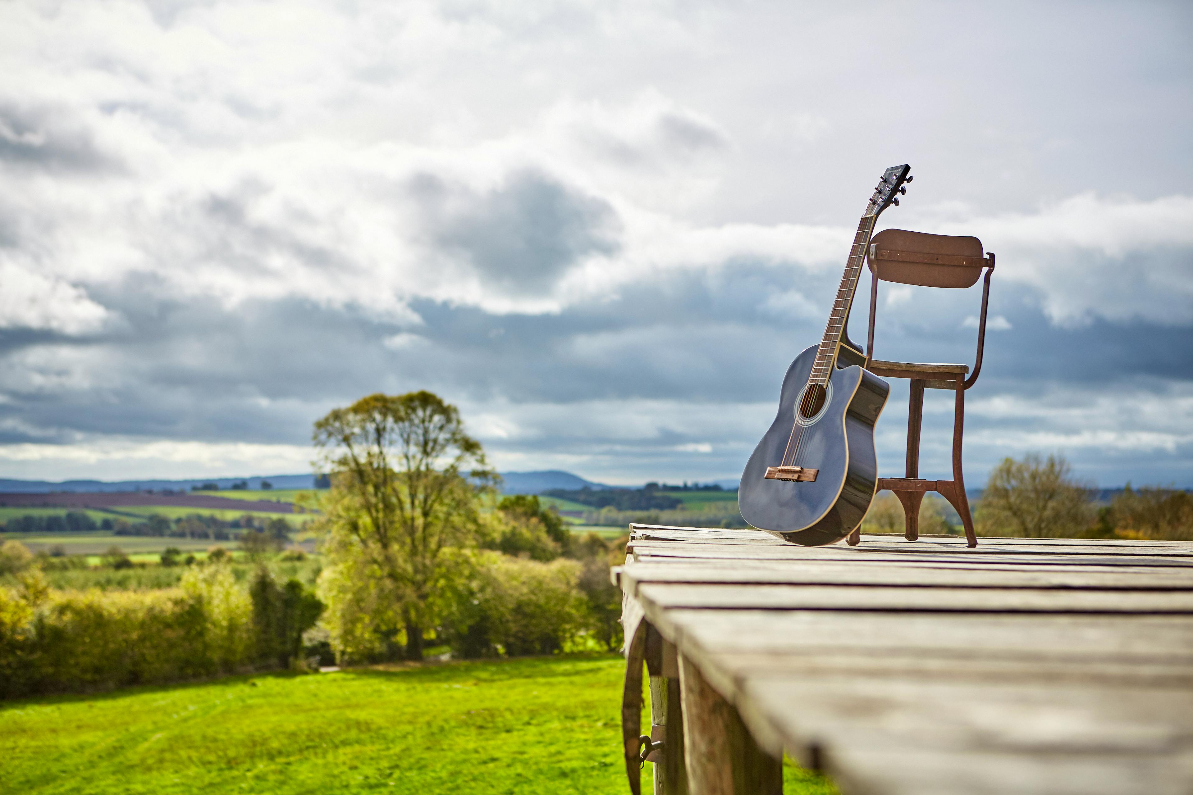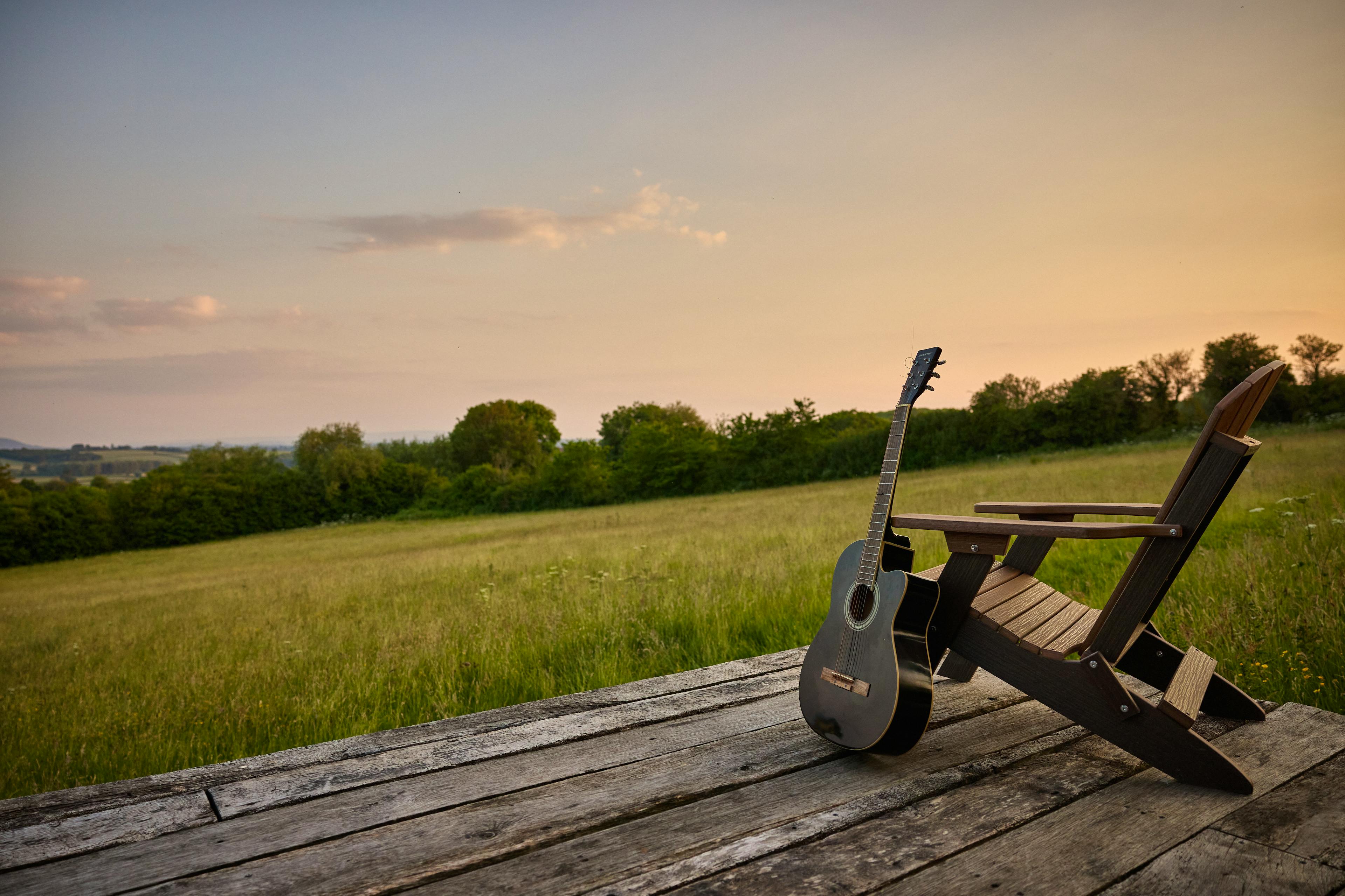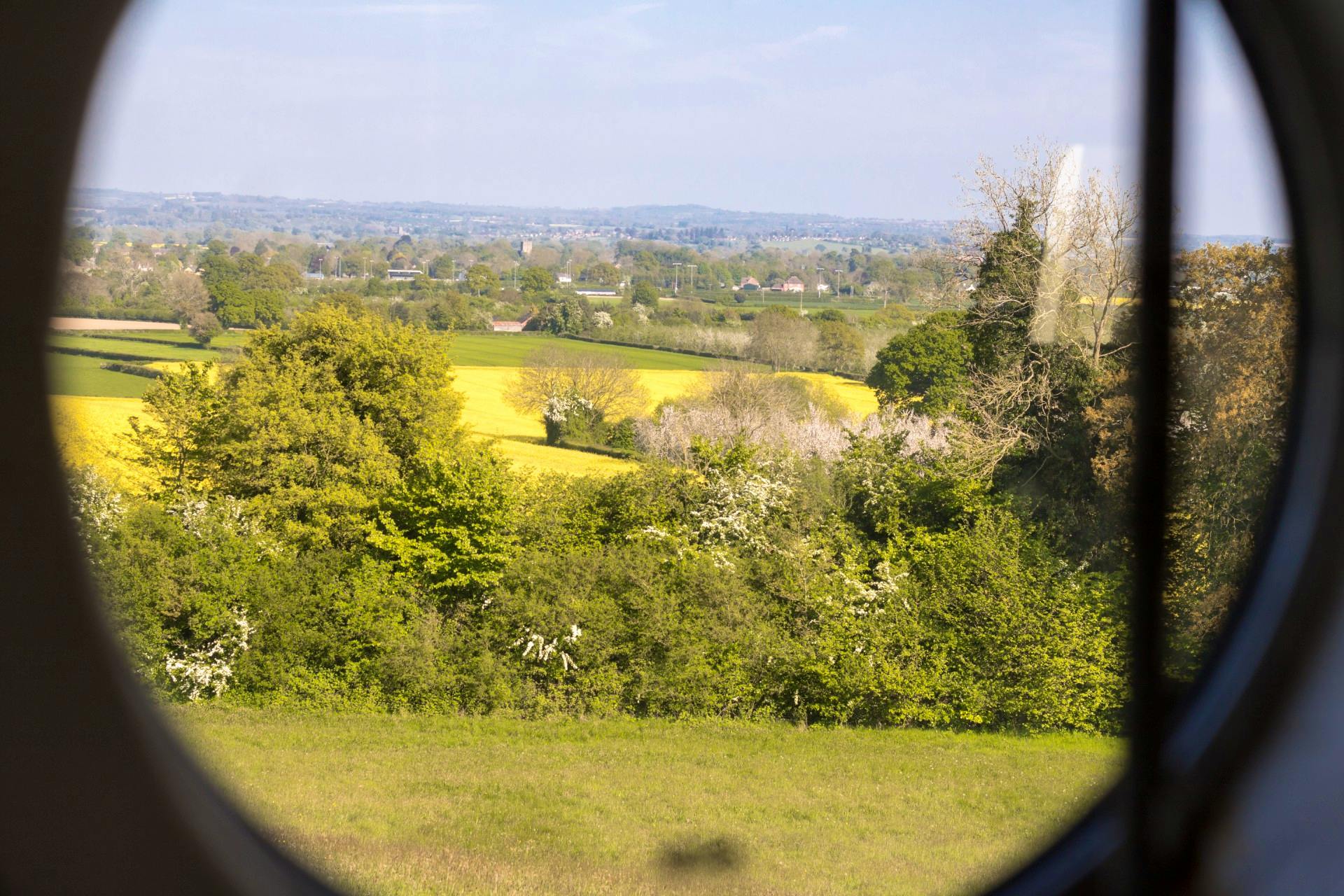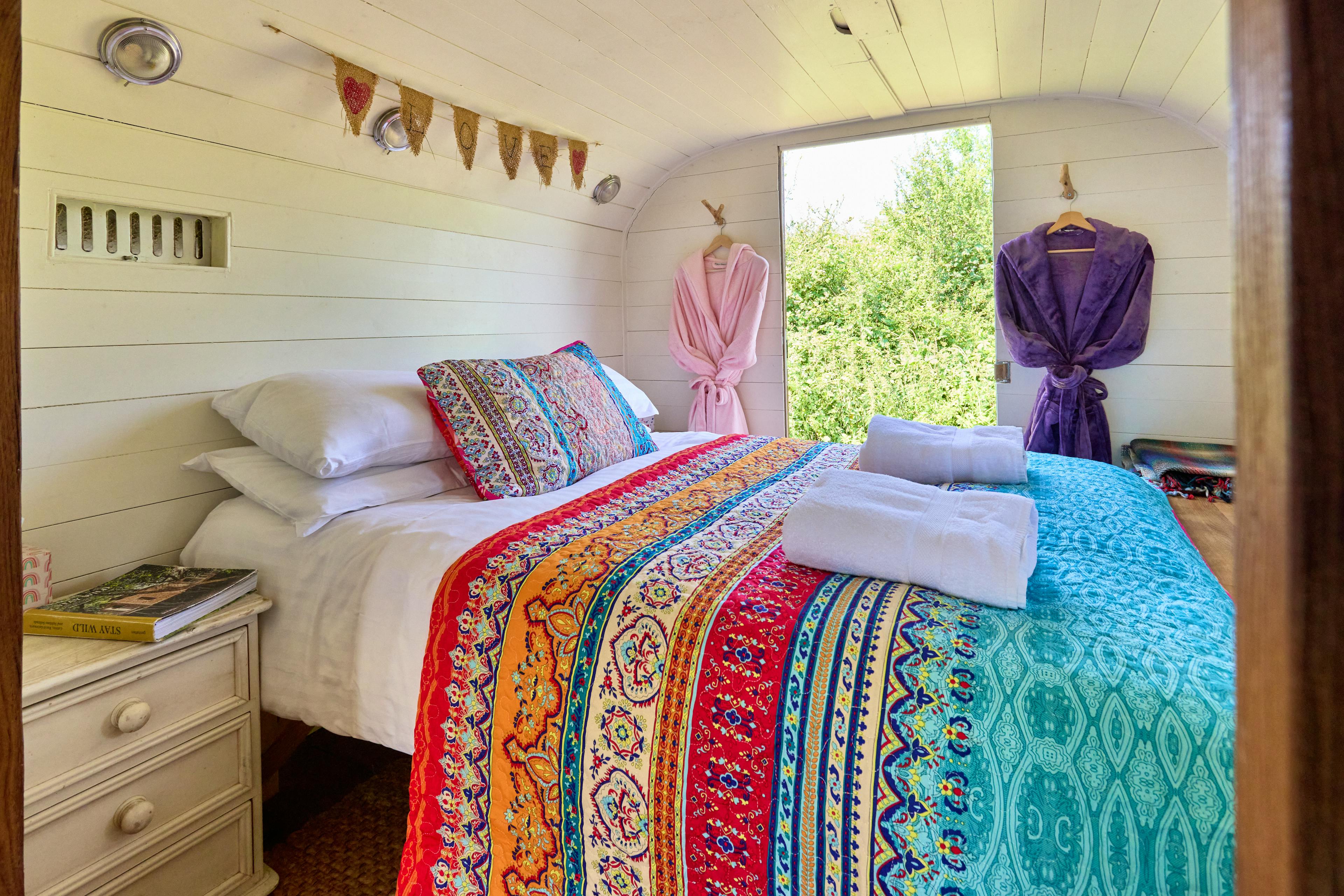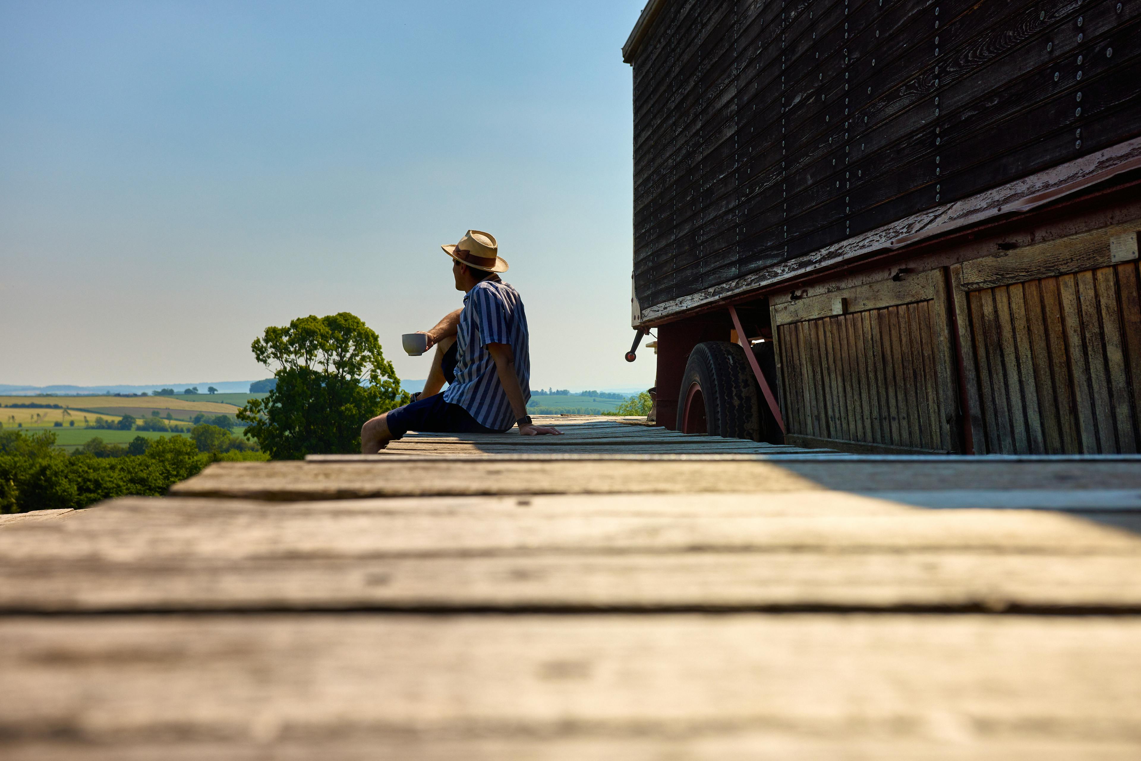 A beautiful, wood-panelled circus wagon looking out across acres of fields in Herefordshire, perfect for stargazing from the outdoor hot tub on clear nights.
