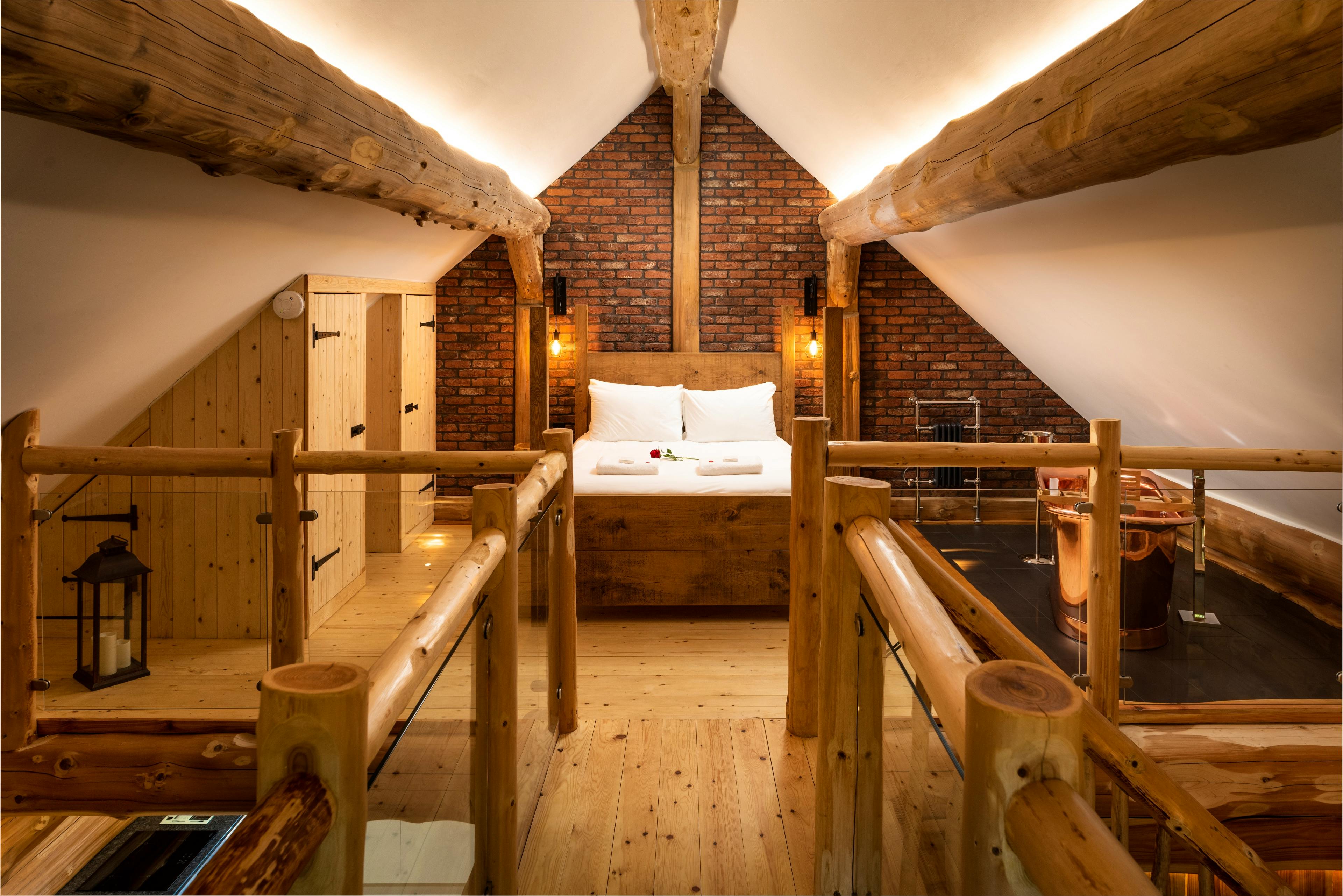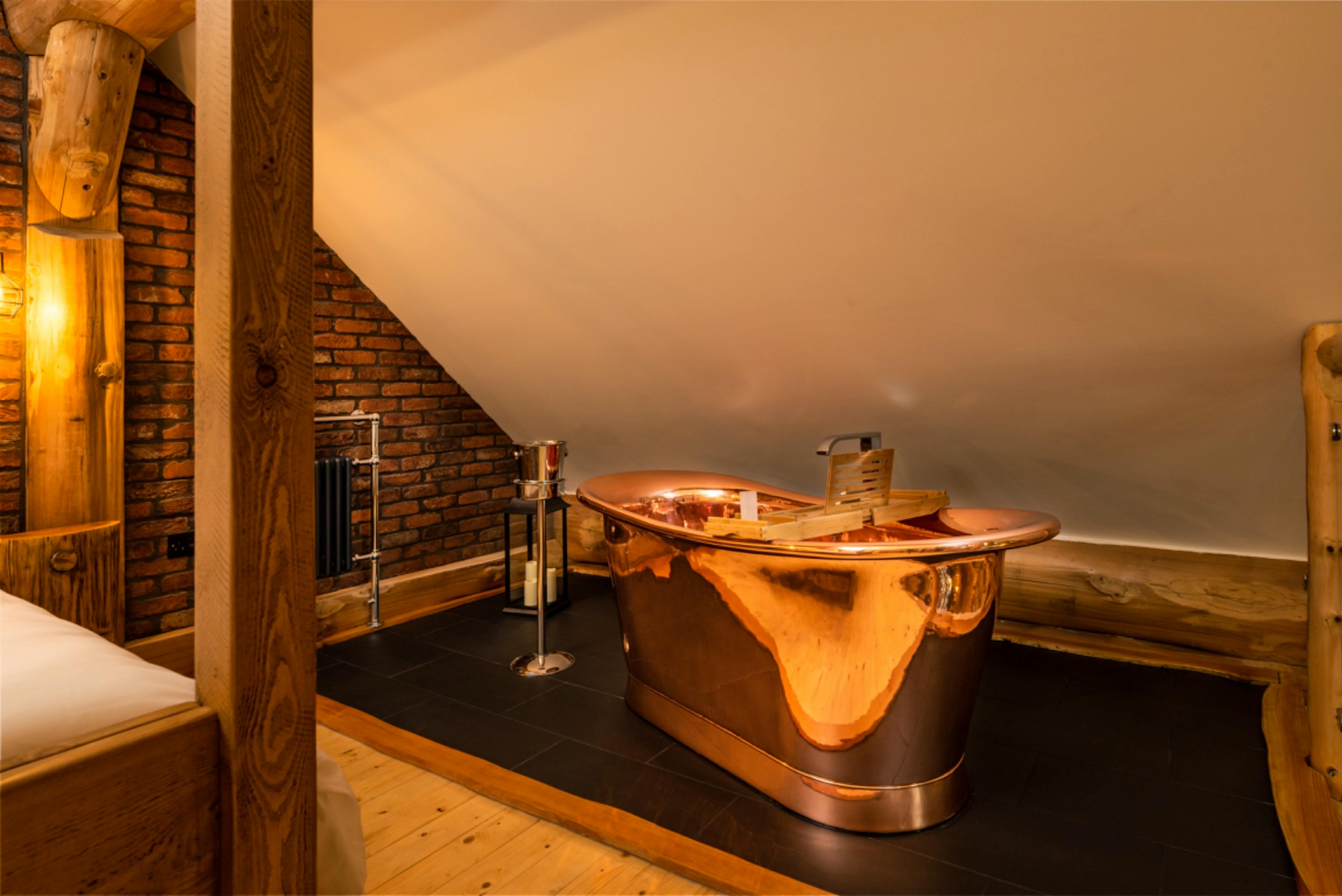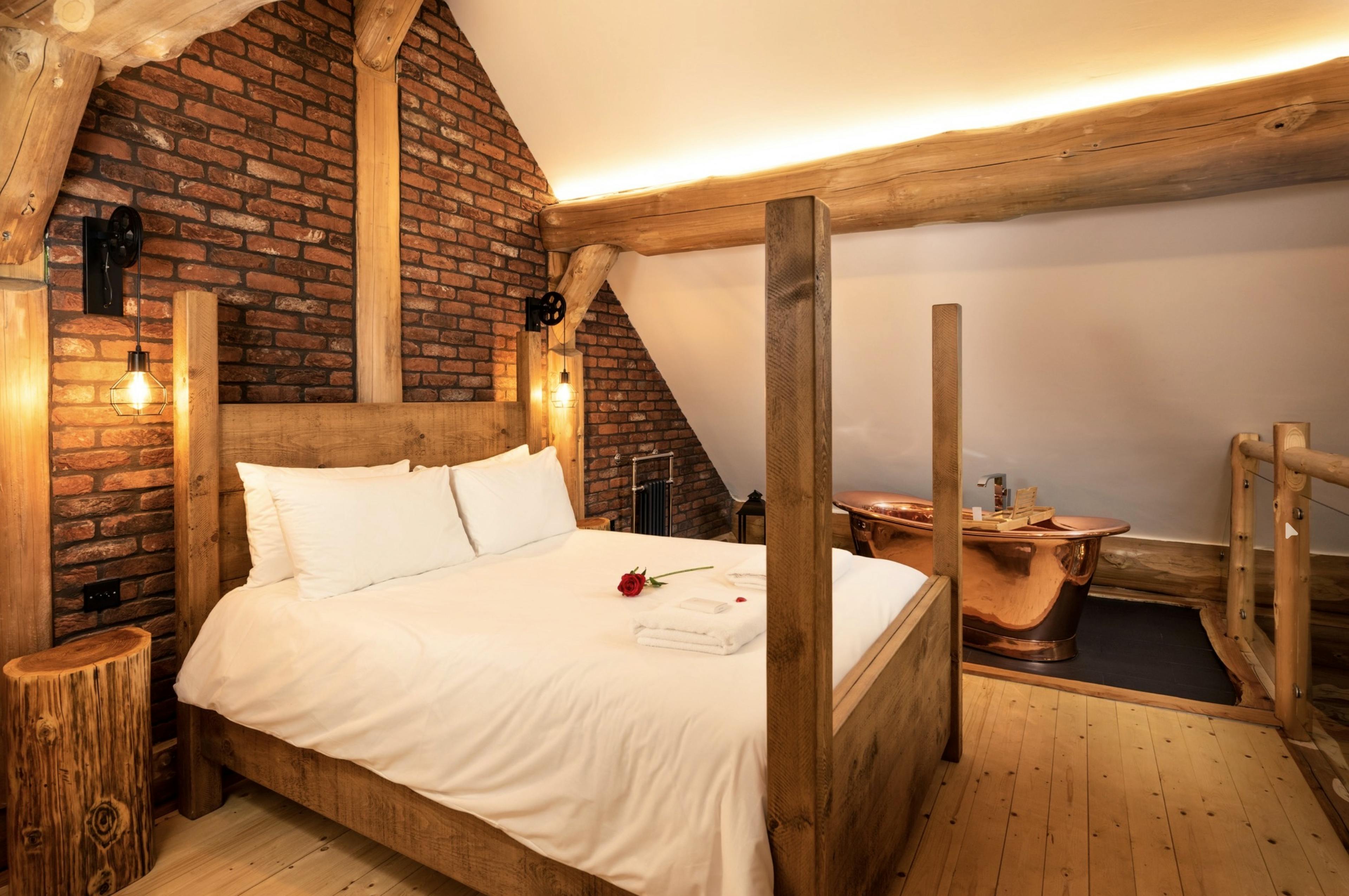 Romantic mezzanine bedrooms with king size four-poster beds and freestanding statement baths.