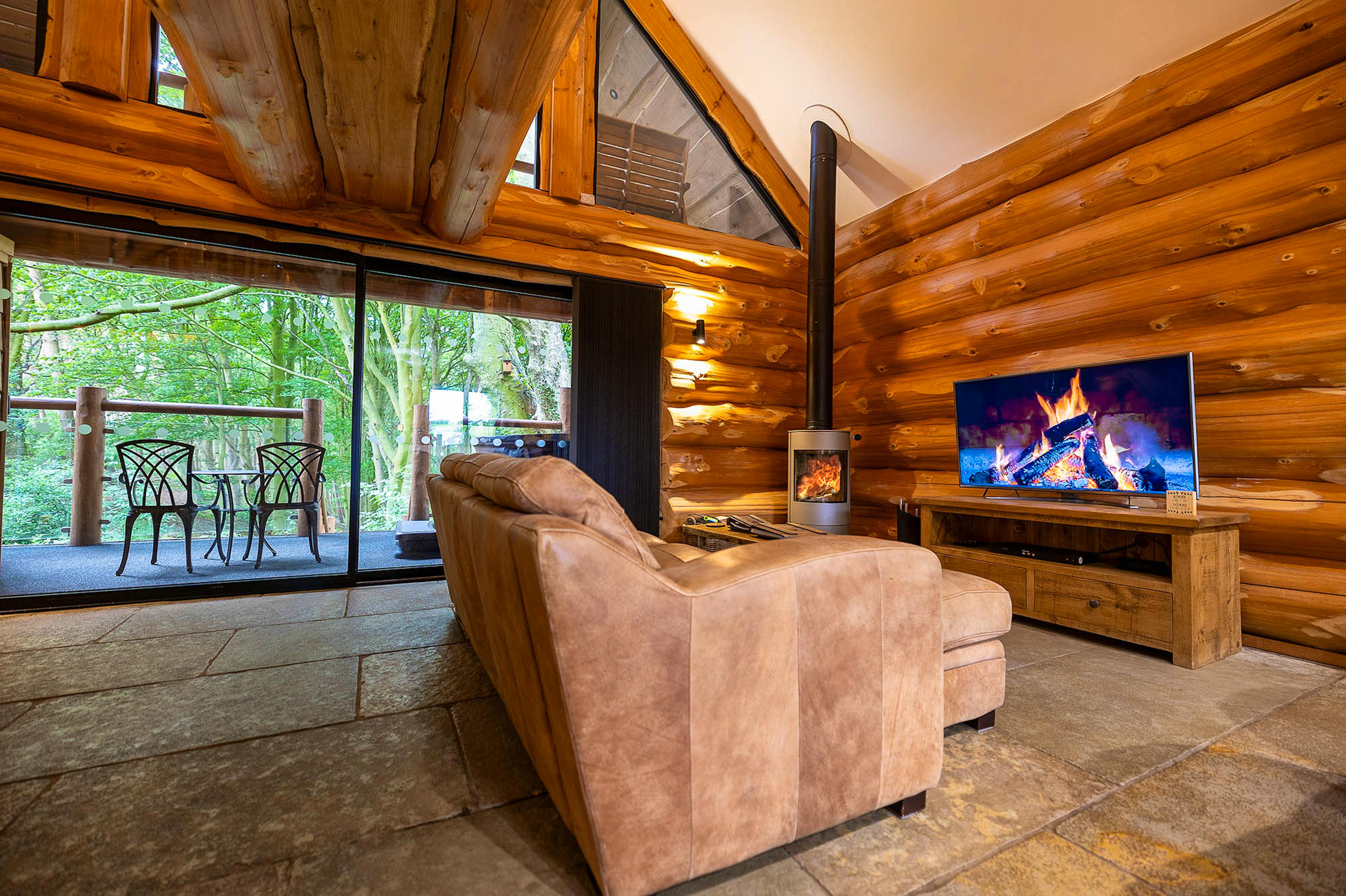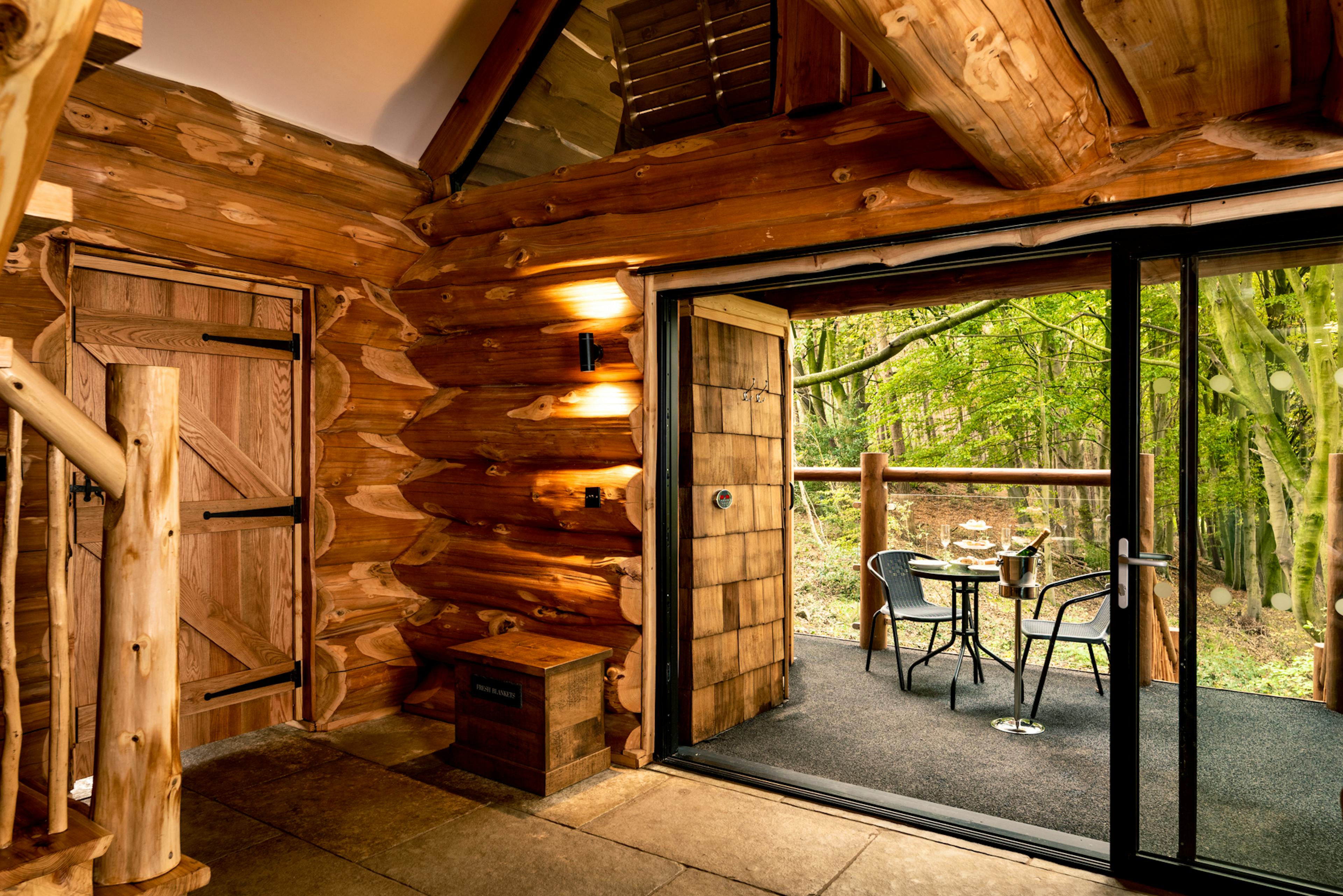 Romantic adults-only cedar log cabins in Derbyshire woodland with hot tubs, saunas and four-poster beds near Belper.
