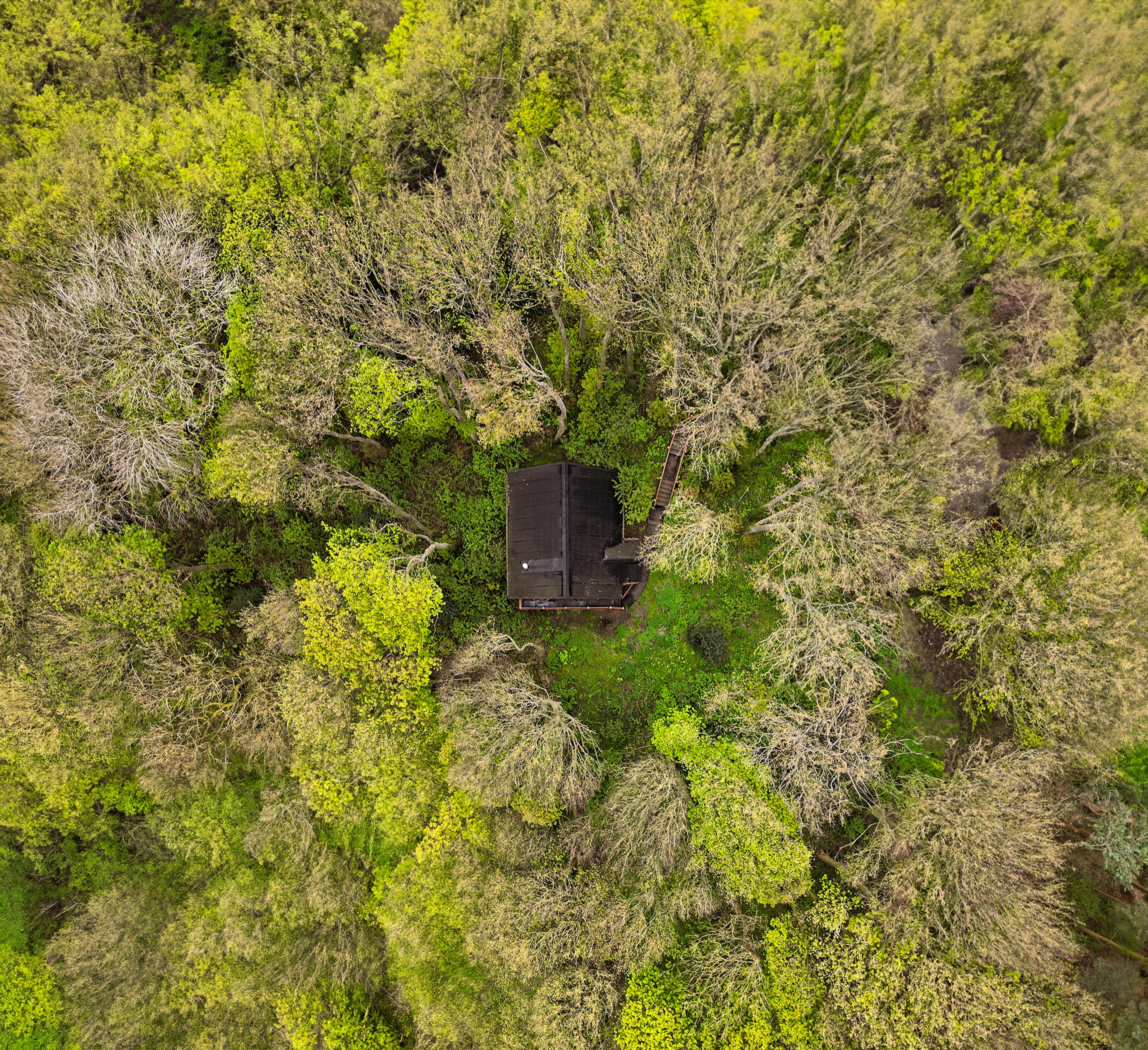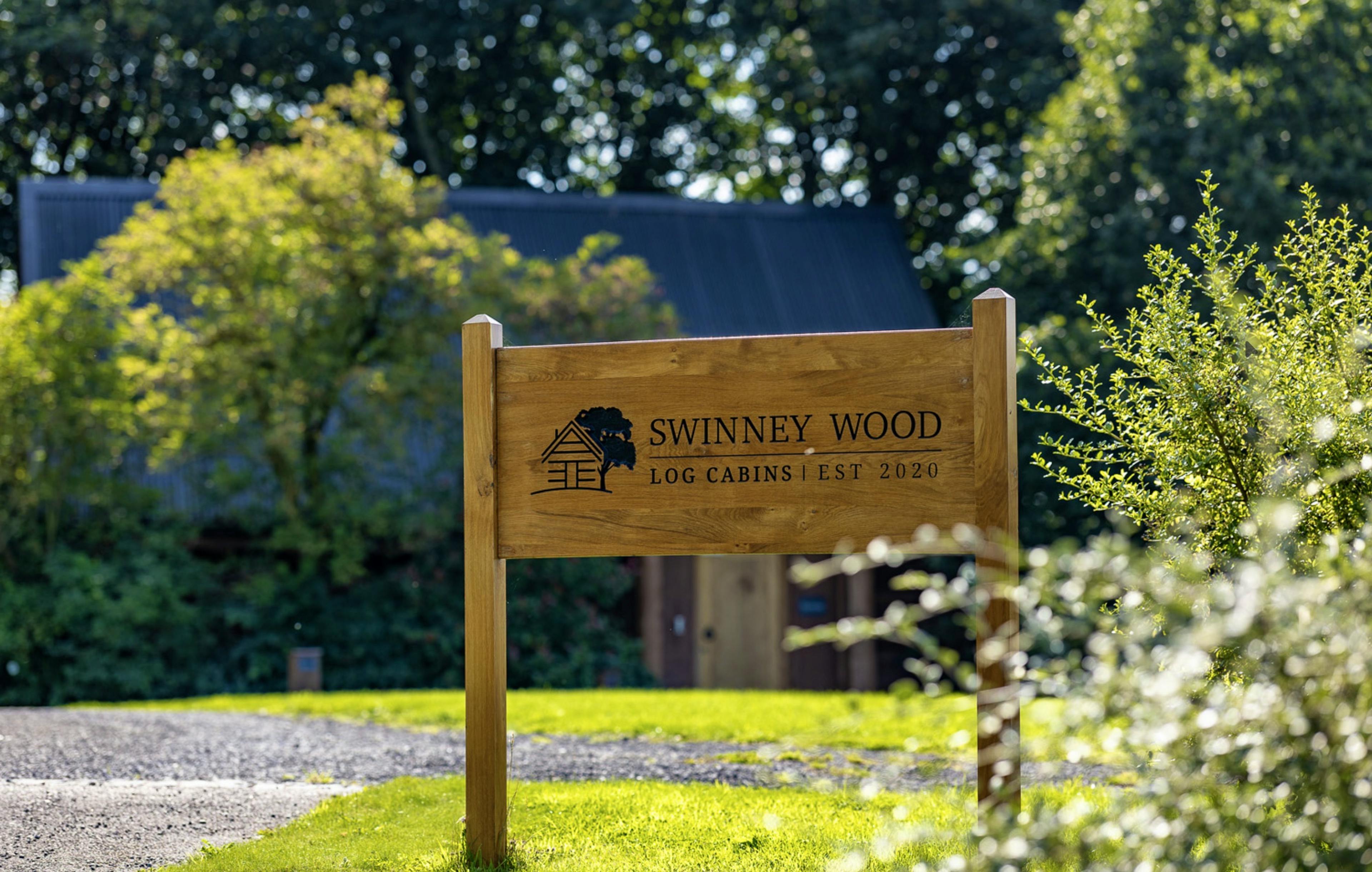Four adults-only cedar log cabins, each individually positioned for privacy within woodland and countryside.