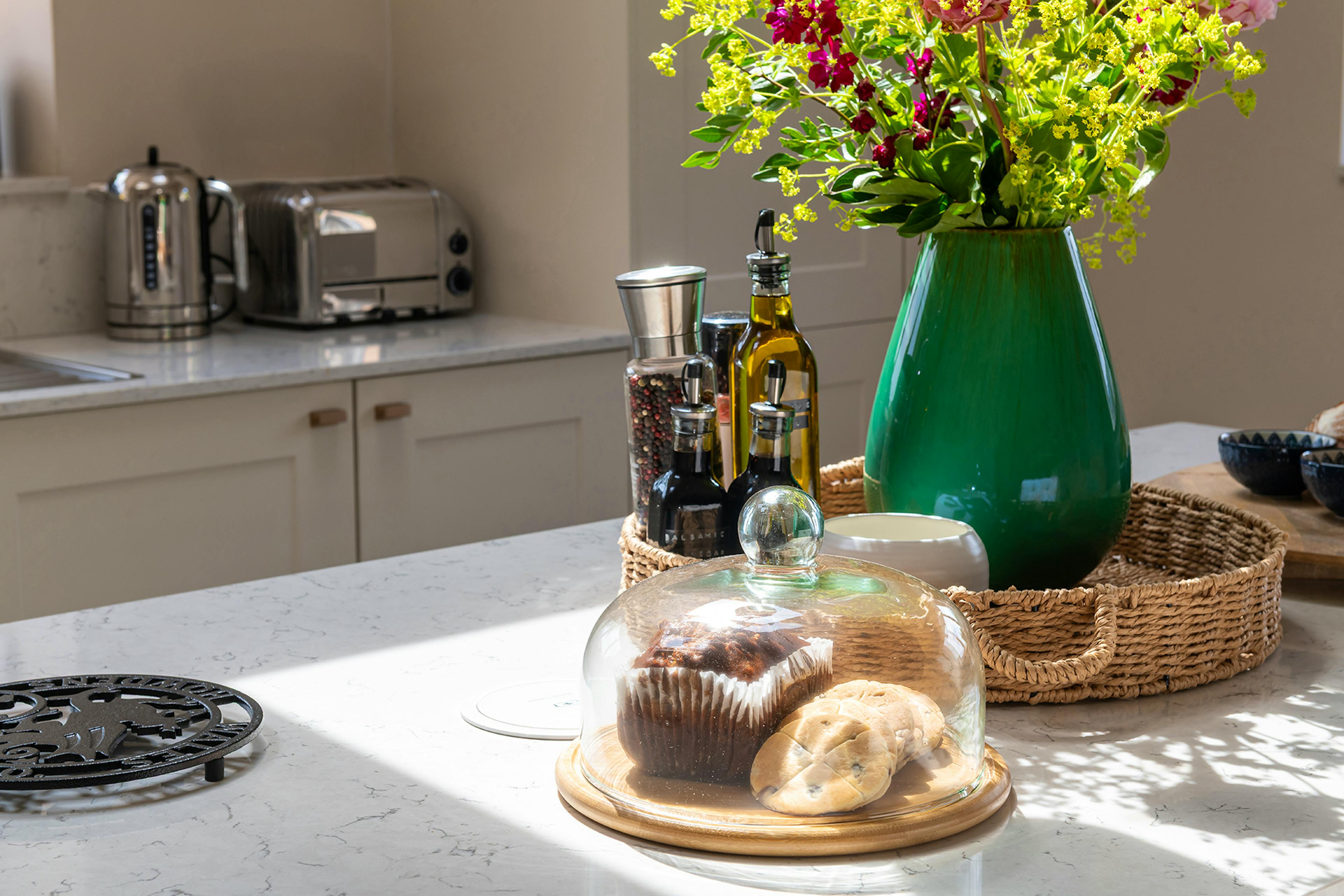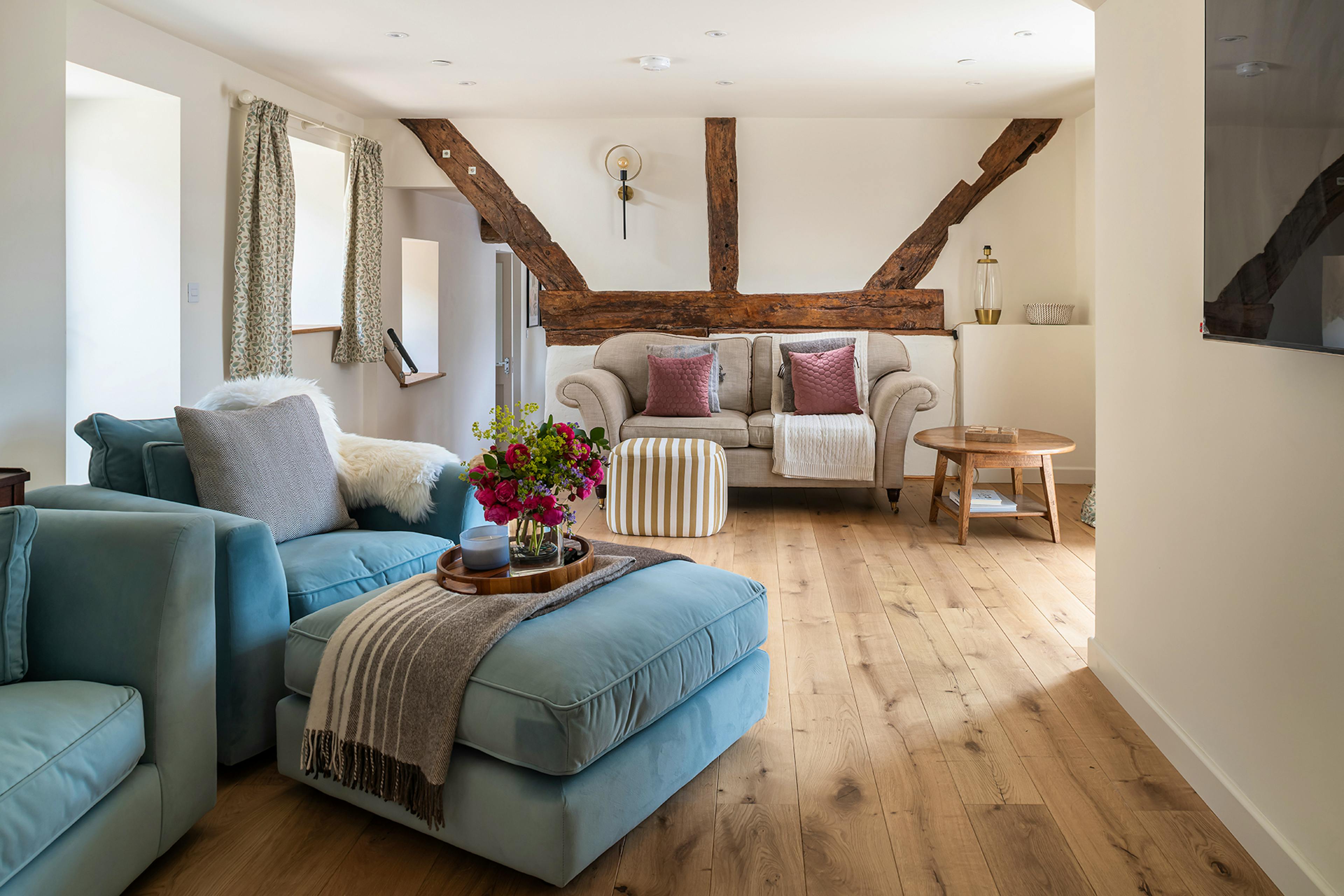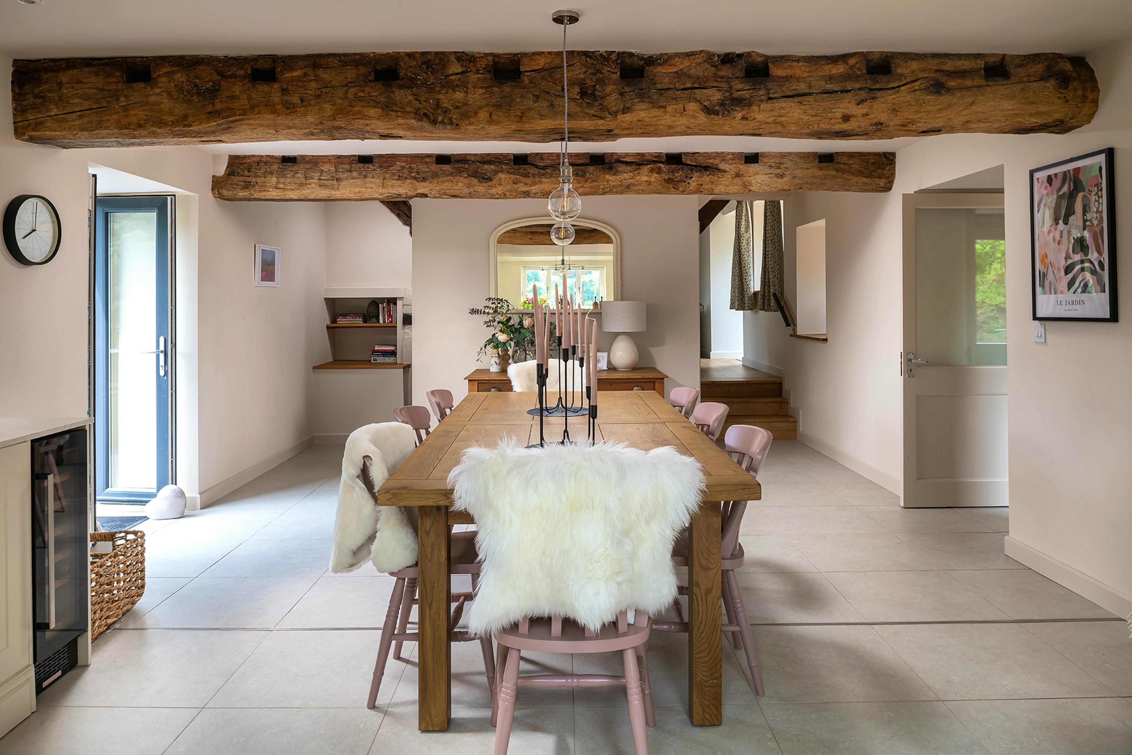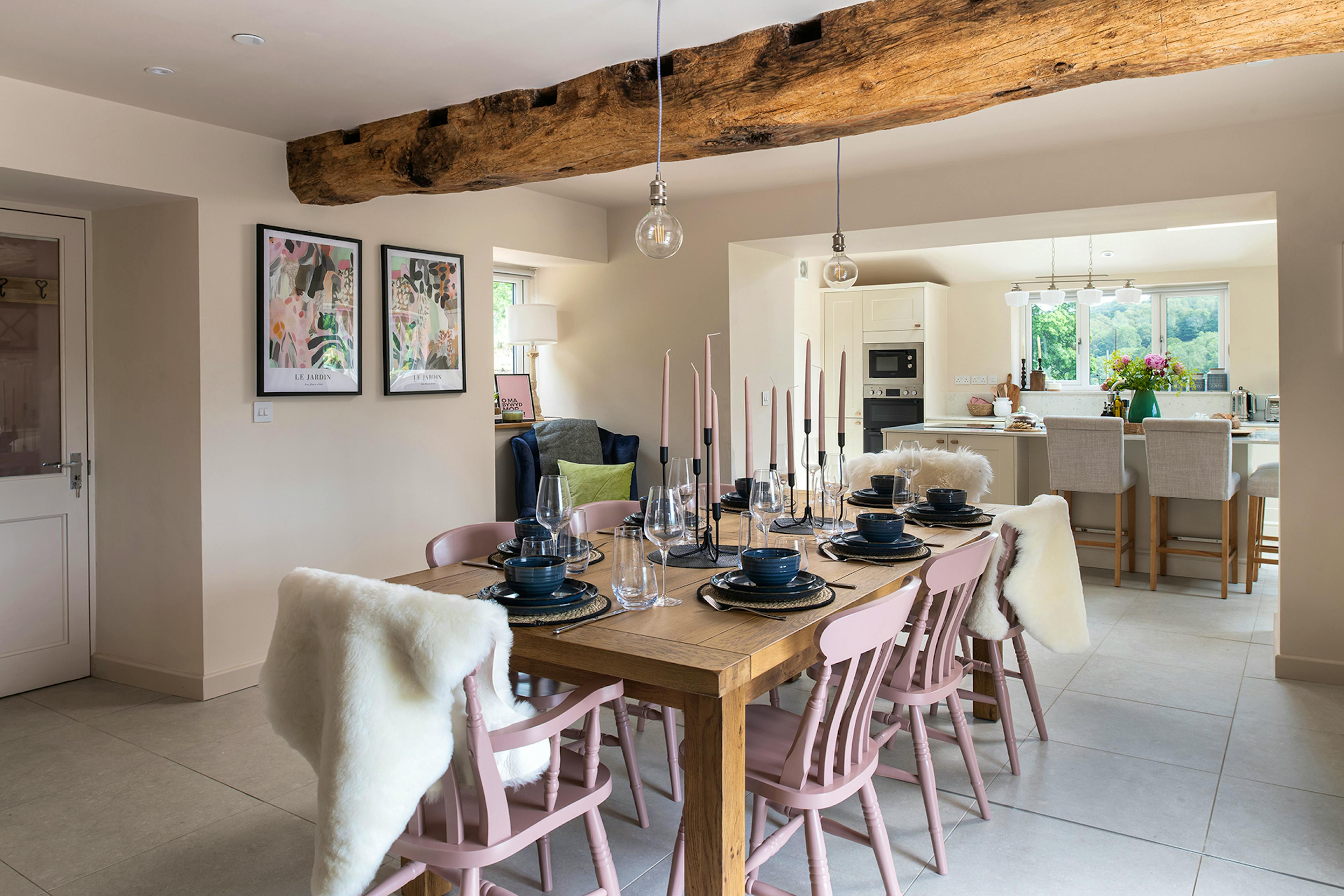 Spacious open-plan living with vaulted ceilings, oak beams and countryside views.