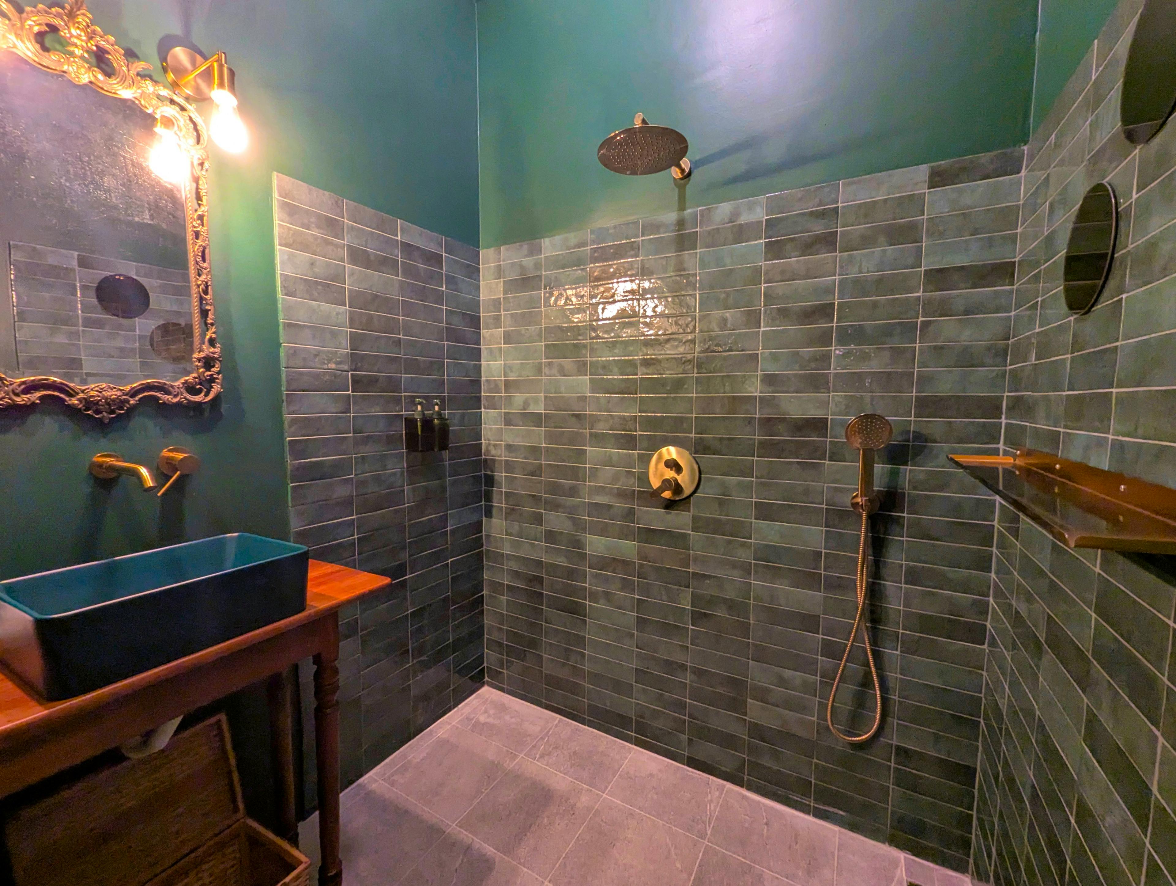 Shared showers offer a spa-like experience with spring water, strong pressure, eco-friendly heating and polished fixtures.