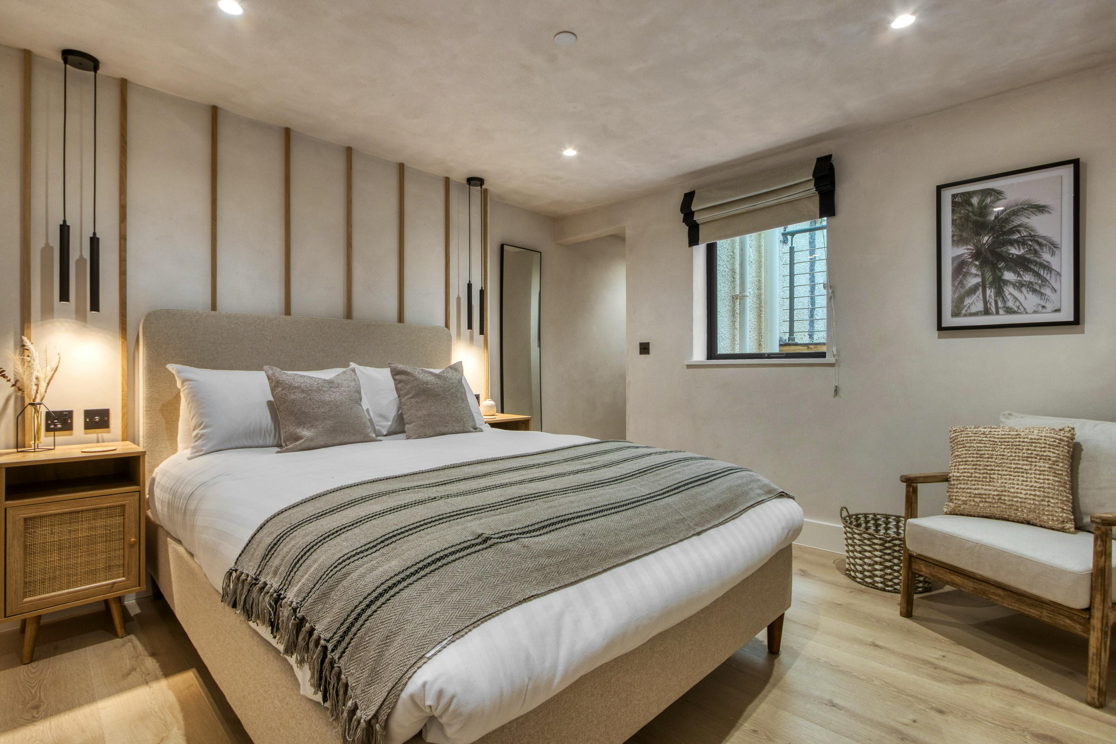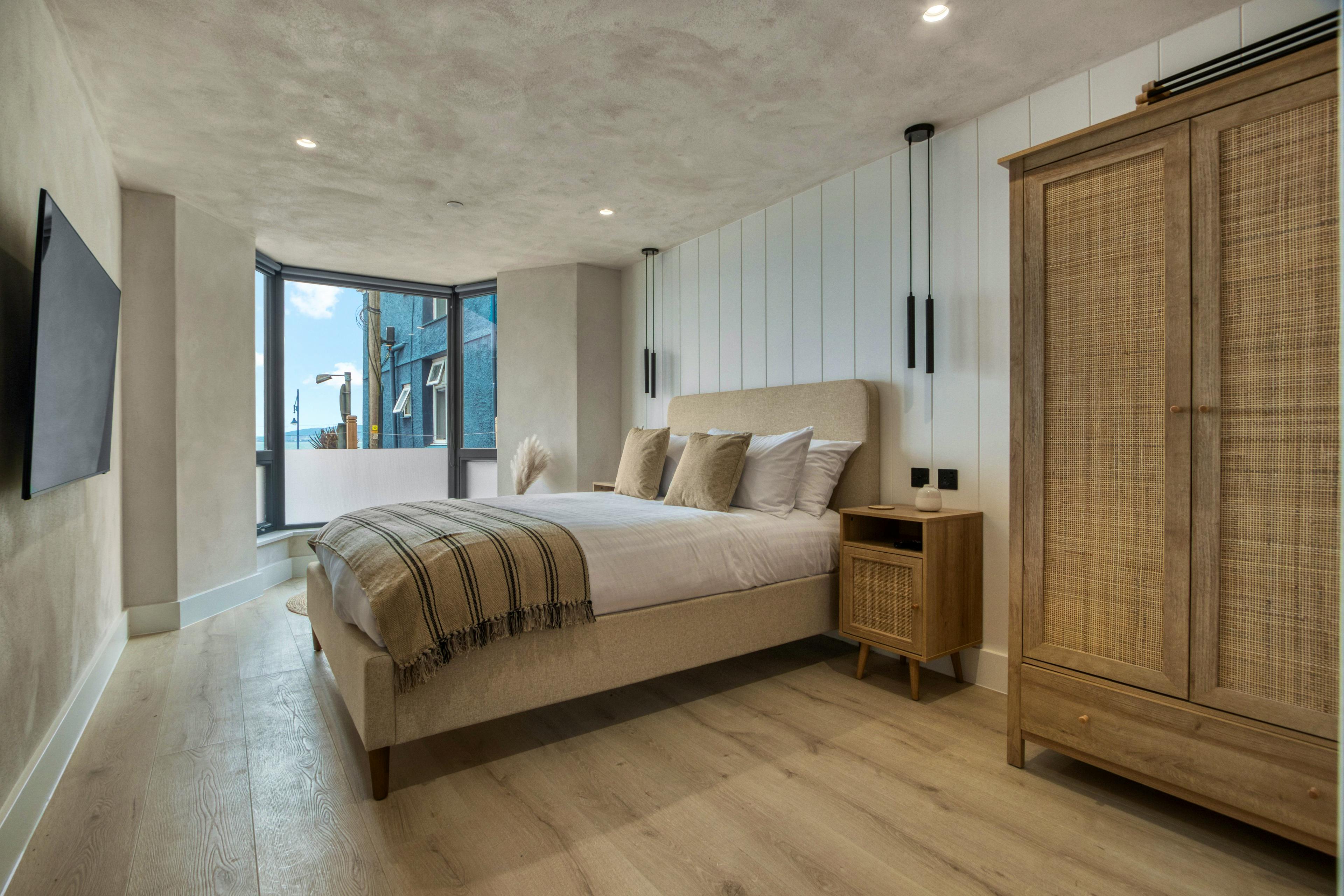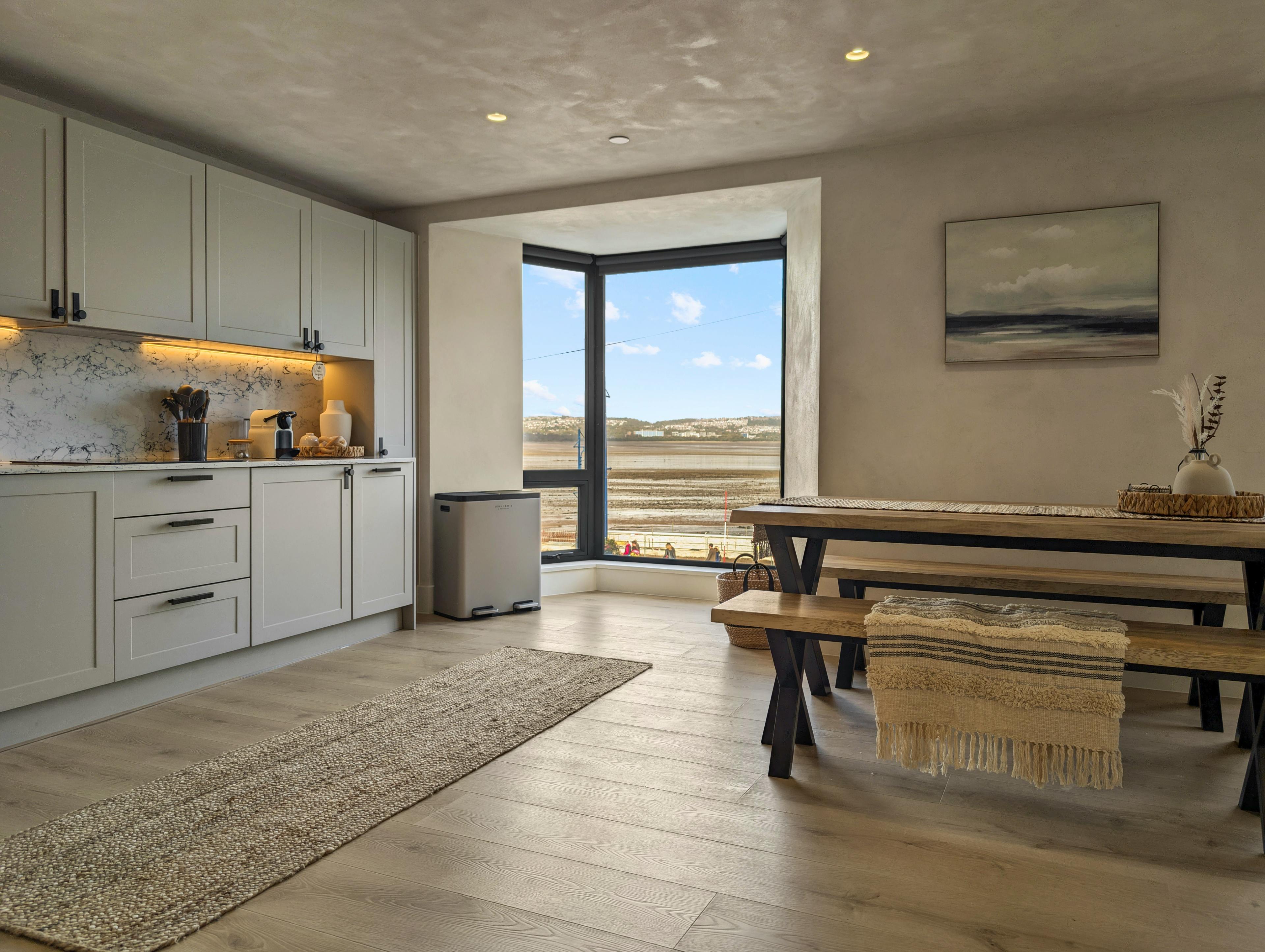 The AROS is a collection of three luxurious apartments offering a fabulous stay by the sea in the village of Mumbles. Tucked away on the edge of the Gower Peninsula, these three amazing retreats are ideal for families or groups of friends looking for a break by the sea. The three apartments offer delightful coastal views, modern amenities and an incredible location on the water’s edge. All of these apartments have been recently renovated and they make use of a combination of Japanese and Scandinavian design. The first apartment is the Coastal Penthouse. This incredible, top-floor apartment sleeps five guests across two bedrooms. This fabulous space offers breathtaking views of the sea and a calming open plan living room with high ceilings and beautiful decor. Get comfy on the L-shaped sofa in the lounge whilst watching a movie on the smart TV, whilst staying connected to your loved one as they prepare dinner in the superb kitchen. Then, when food’s served, dine together on the modern dining table that sits next to a window offering mealtimes with a view. The penthouse offers up two lovely bedrooms, one of which has a king size bed and the other a double with a single bunk above. There are also two spa-like bathrooms, one of which offers a walk-in shower and the other a bath and a shower. Guests in this apartment also have sole use of the terrace at the rear of the property where you can make the most of sea views over the roof top of the property. This is a delightful spot to spend the evening with a drink in hand after a day on the beach. Up next is The Cove. This apartment is equally stylish, yet slightly smaller than the penthouse. Here a cosy lounge offers comfy seating and a wall-mounted TV next to a big bay window where you can enjoy uninterrupted views out to sea. Just off the lounge is the stylish and modern kitchen, where there’s a dining table with room for your entire group. When bedtime beckons, The Cove has two bedrooms on offer, one of which has a king size bed and the other has two singles. There’s also a fab family bathroom, which has a walk-in shower and a luxurious free-standing bathtub where you can enjoy an indulgent soak in peace. The final of the three apartments is Ocean Retreat. This is another grand and spacious apartment, with a delightful open-plan living space that is similar to the penthouse. Again, you’re afforded fantastic views across the bay and the nature of the space ensures you can all socialise together whether you’re relaxing in the lounge, sitting up the dining table or cooking away in the kitchen. Ocean Retreat has two bedrooms on offer, one of which is a king bed and the other a double. Then there are two modern and stylish bathrooms, one of which features a grand walk-in shower and the other with a shower over the bath. When it comes to filling your days, you’re nicely placed on the enchanting coastline of South Wales. Mumbles is a charming seaside town where you can wander the promenade and soak yourself in the vibrant local culture. You’re also close to the Gower Peninsula, which is Britain's first designated Area of Outstanding Natural Beauty. Explore the rugged landscape where you’ll find golden sandy beaches, dramatic cliffs and serene countryside.