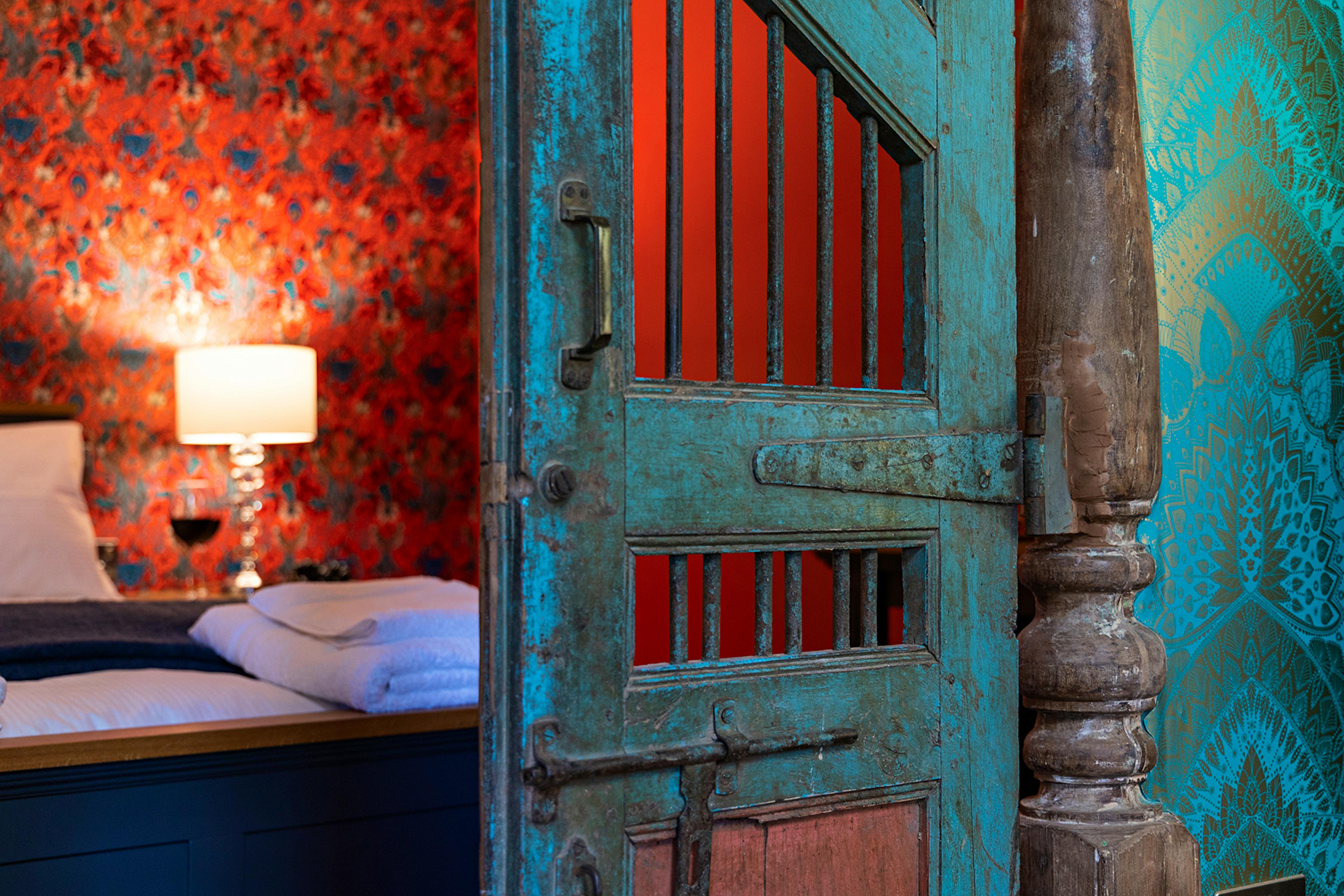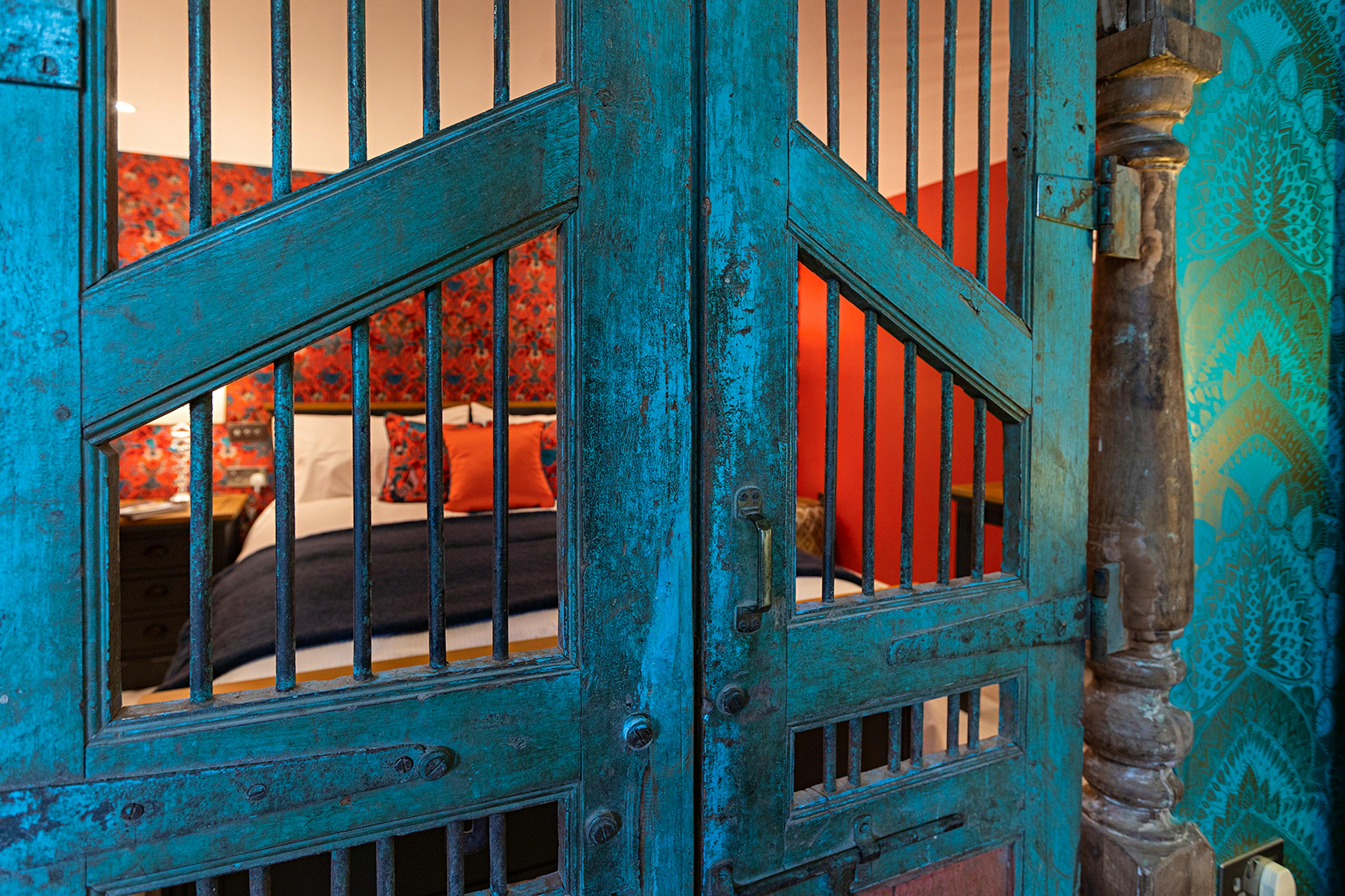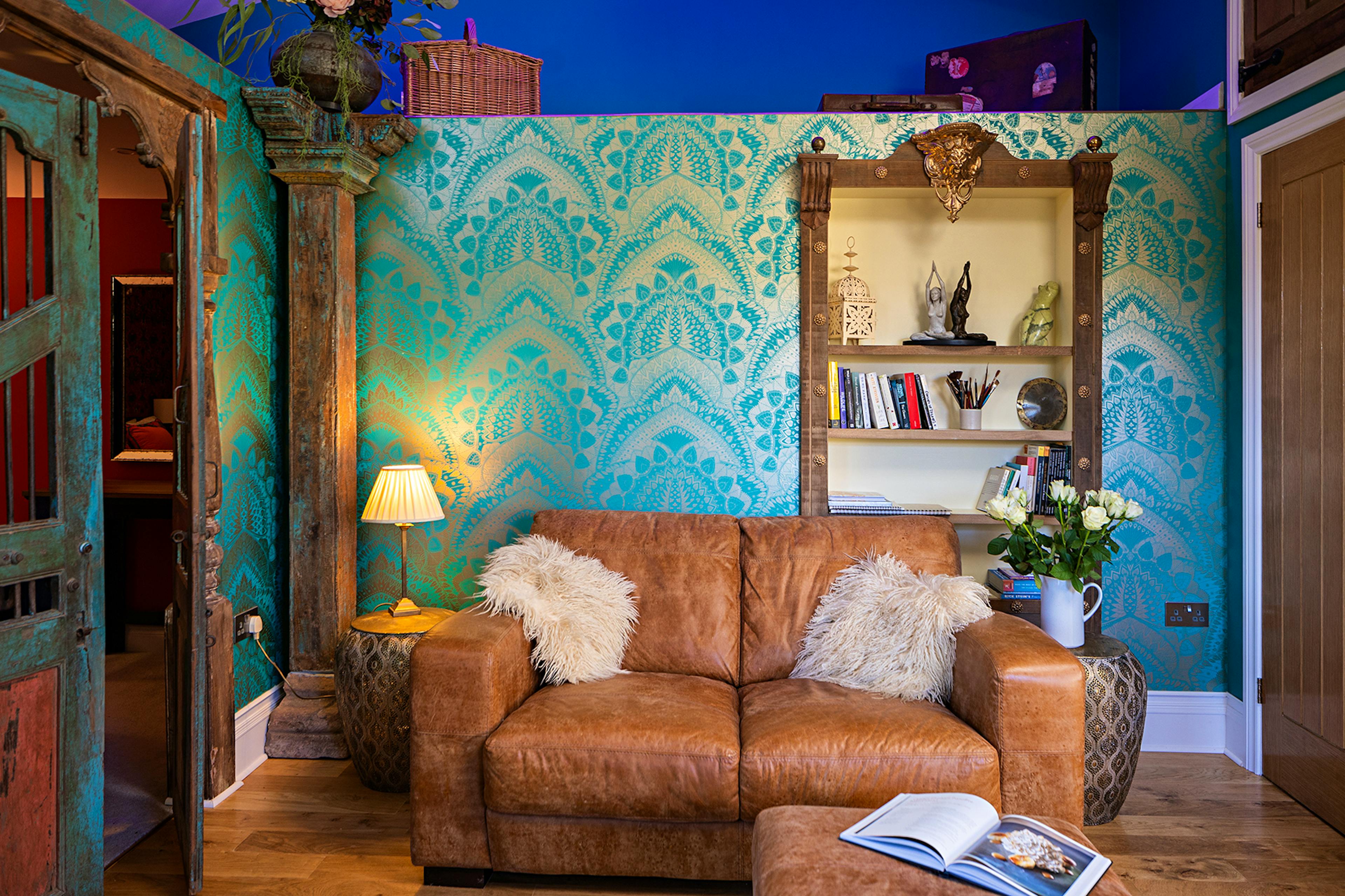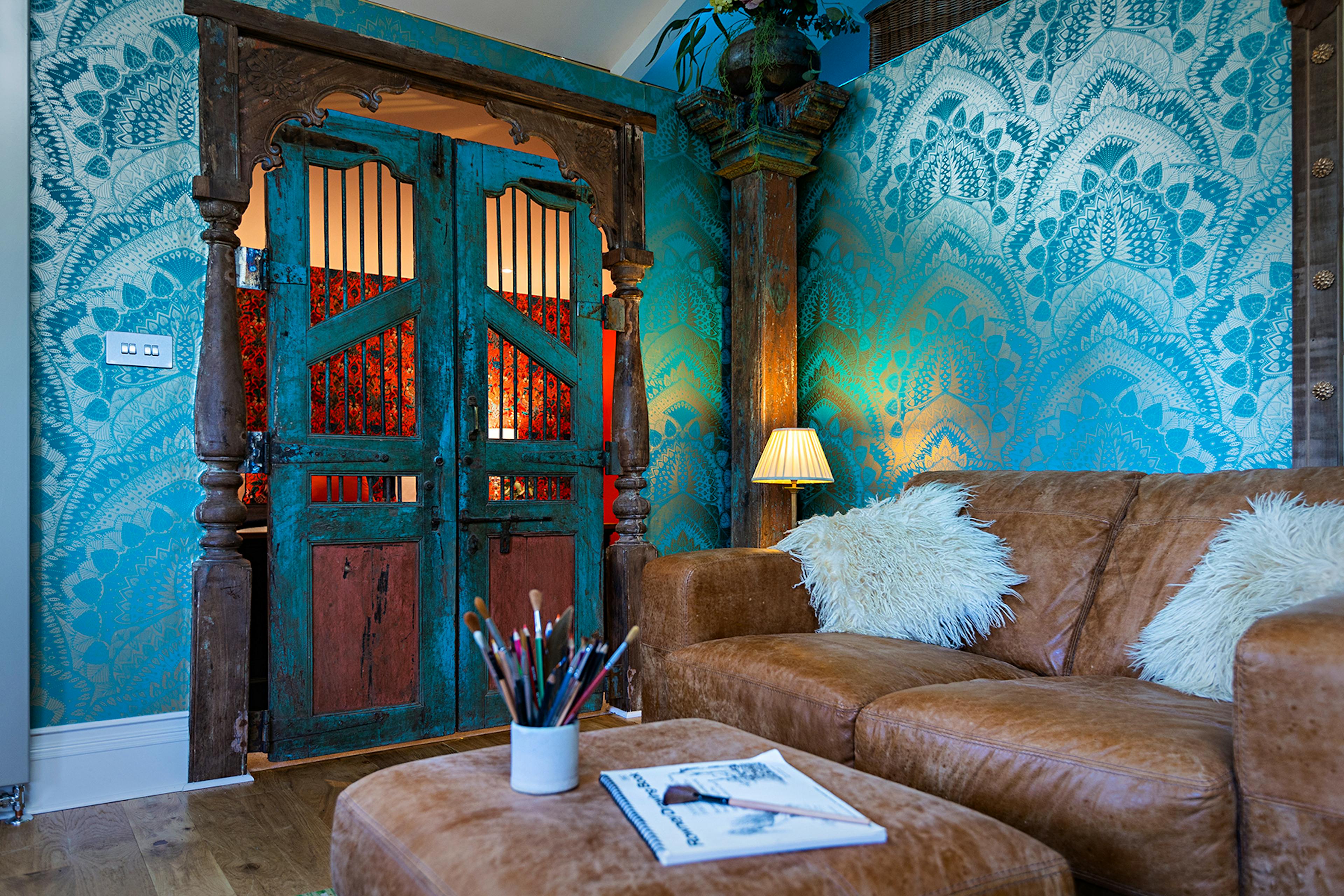 Step inside to find vibrant designer wallpaper, hand-carved Indian teak columns and a unique balustrade, all adding character to the chic living area.