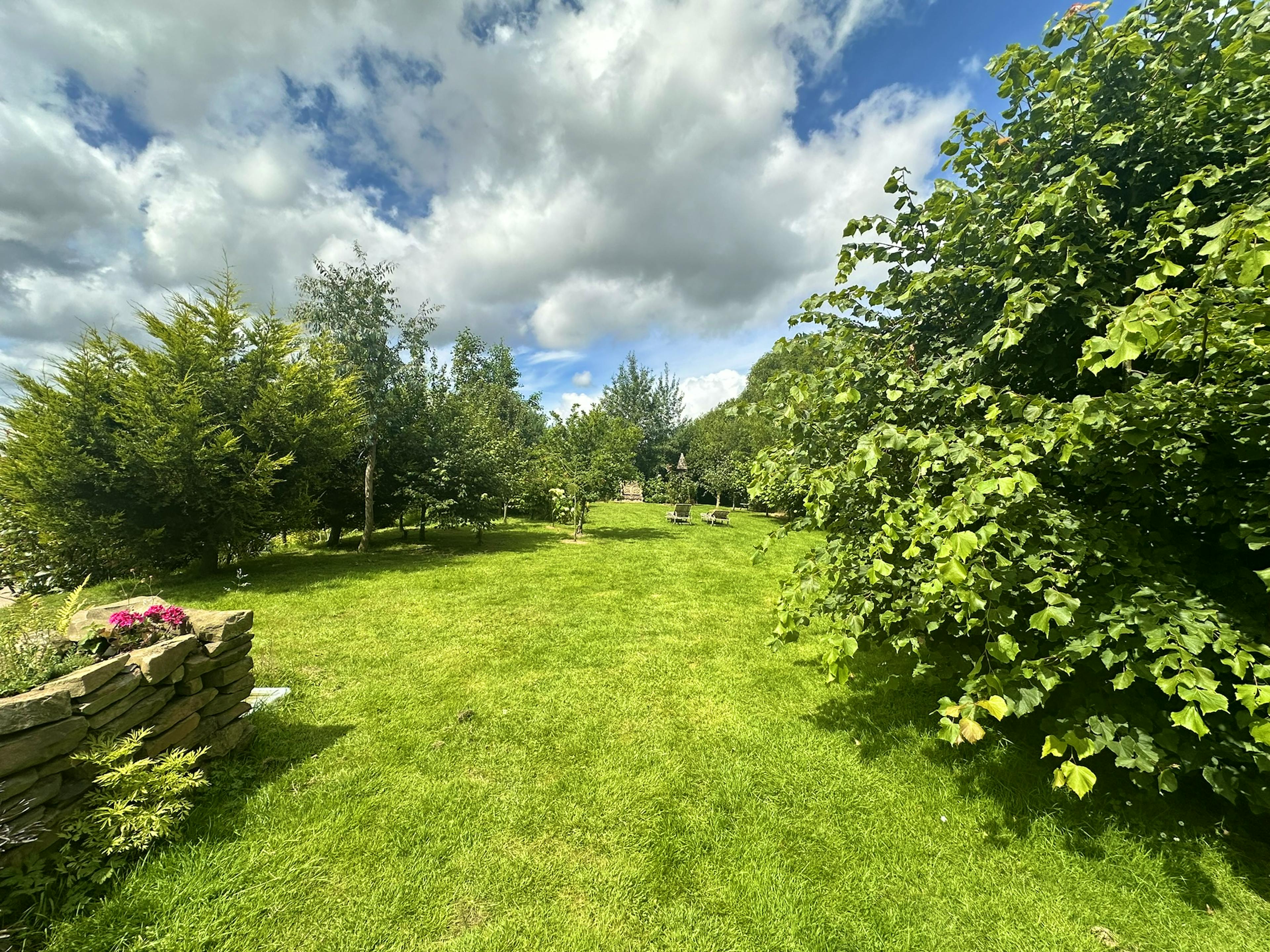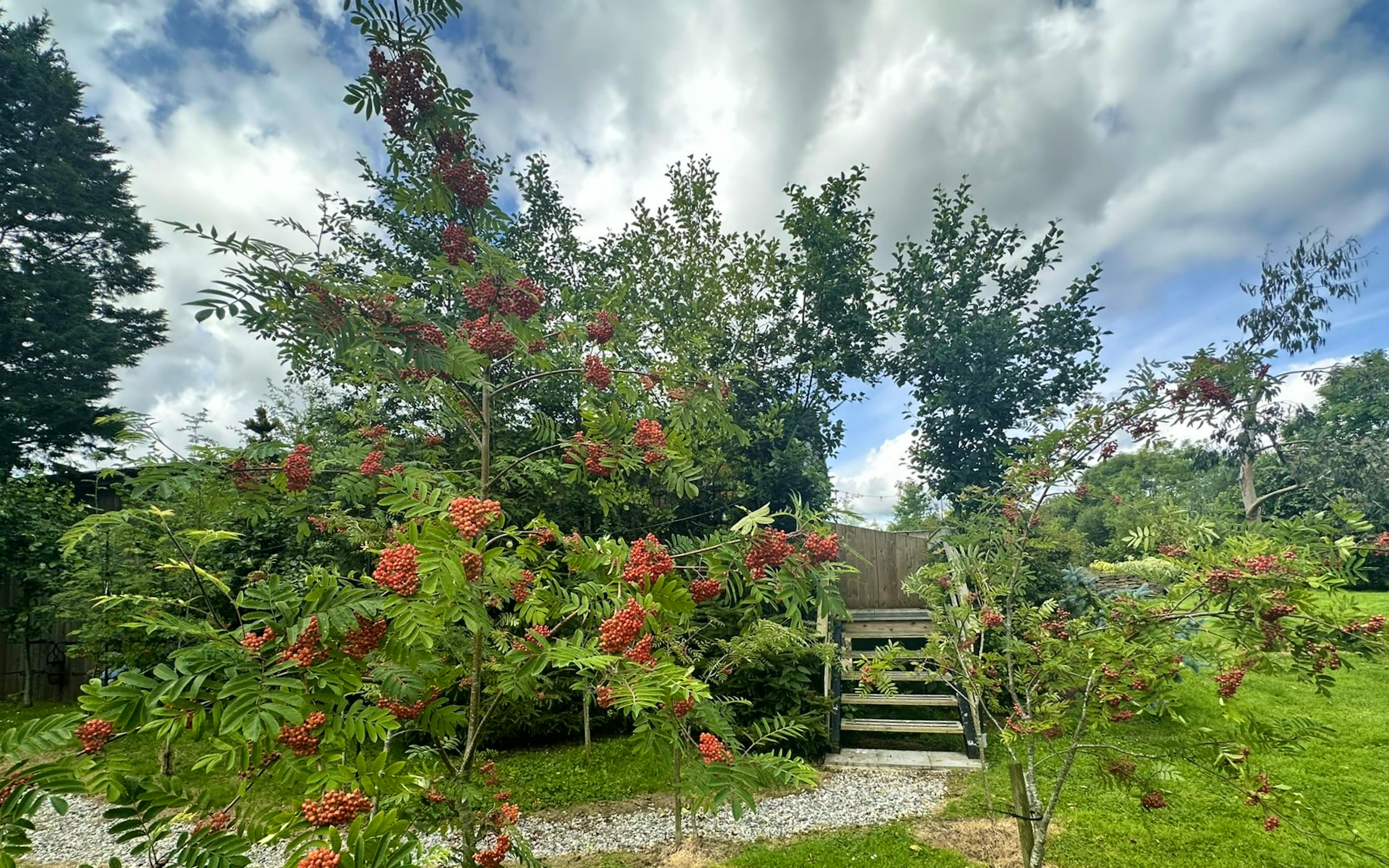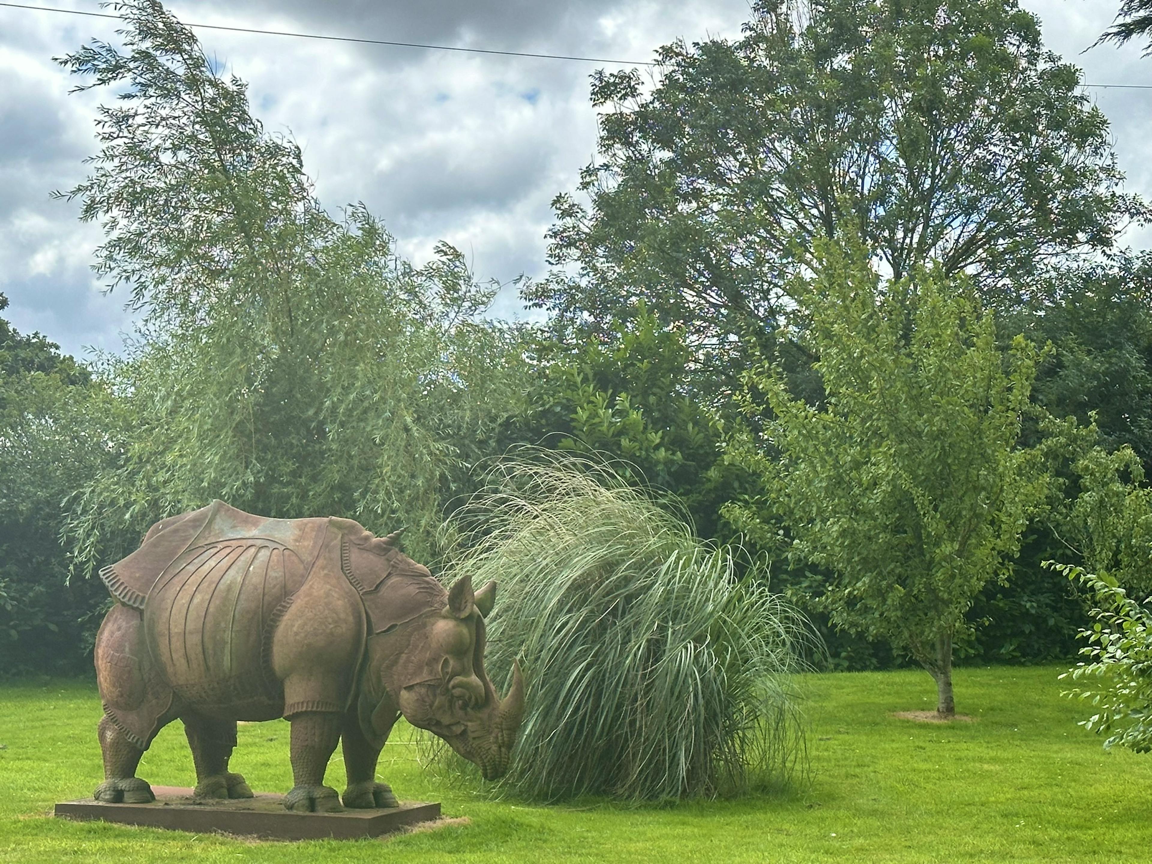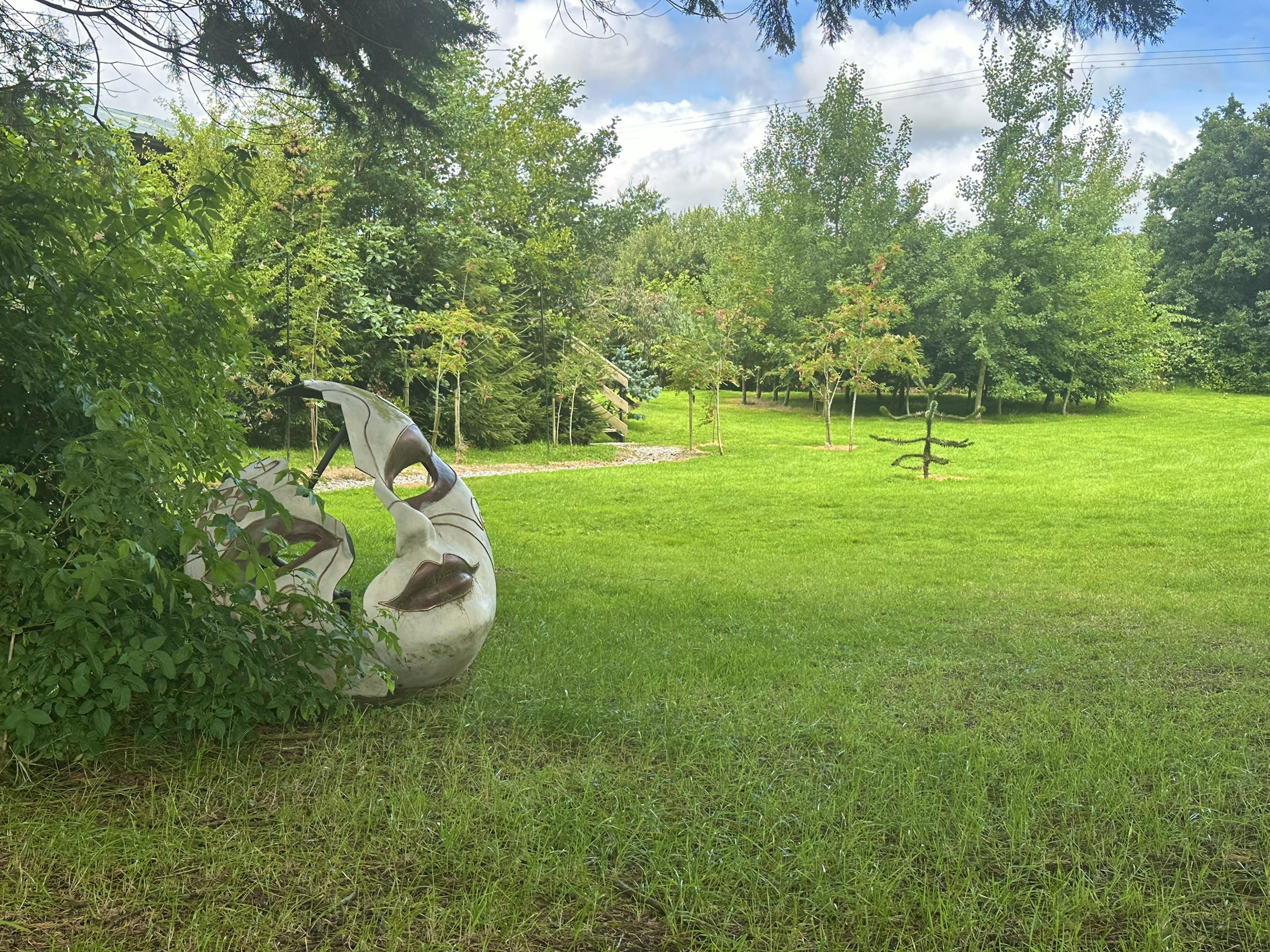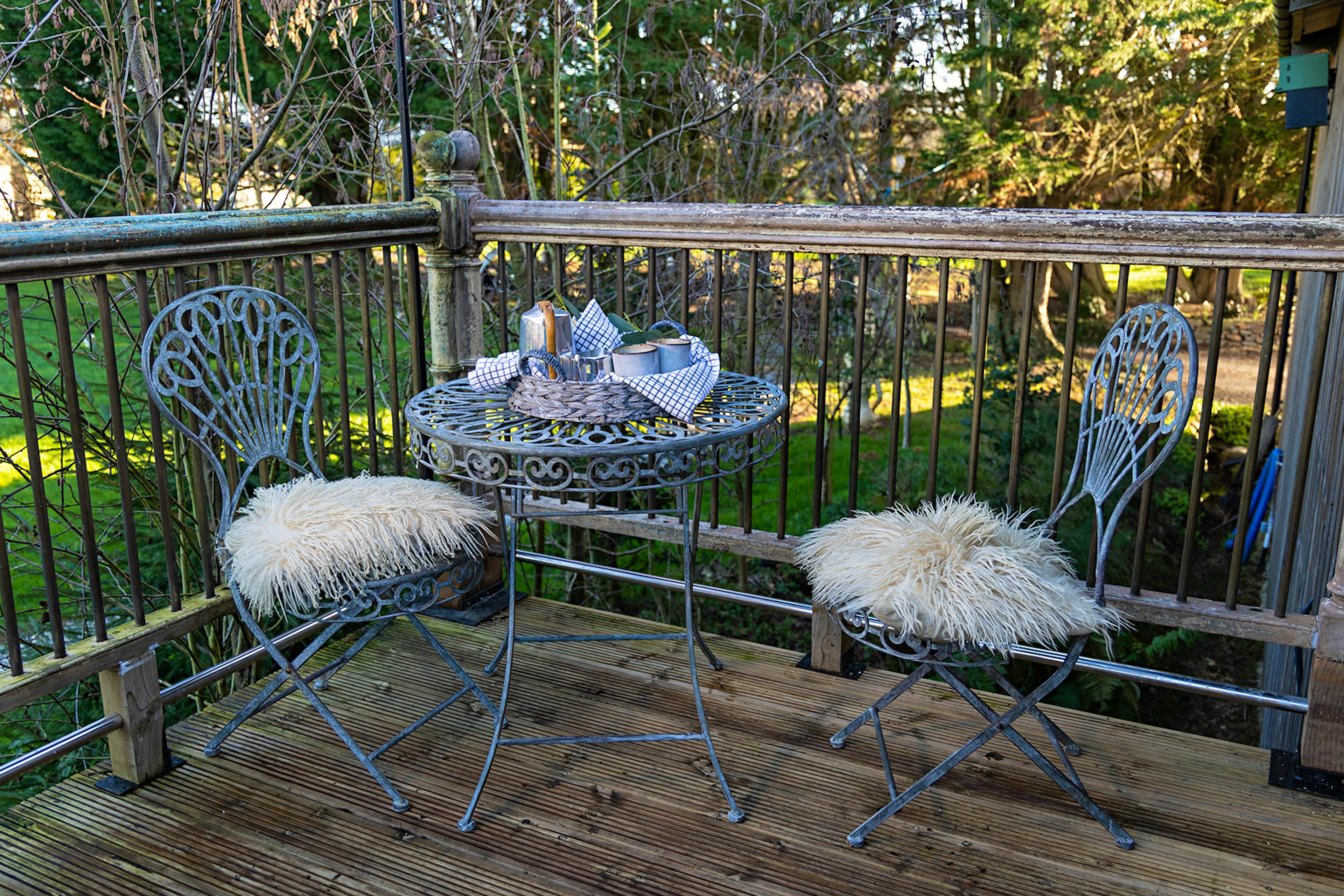 The cosy lounge area, with large sash windows, overlooks a sculpture garden, creating an enchanting view while you relax with a good book.