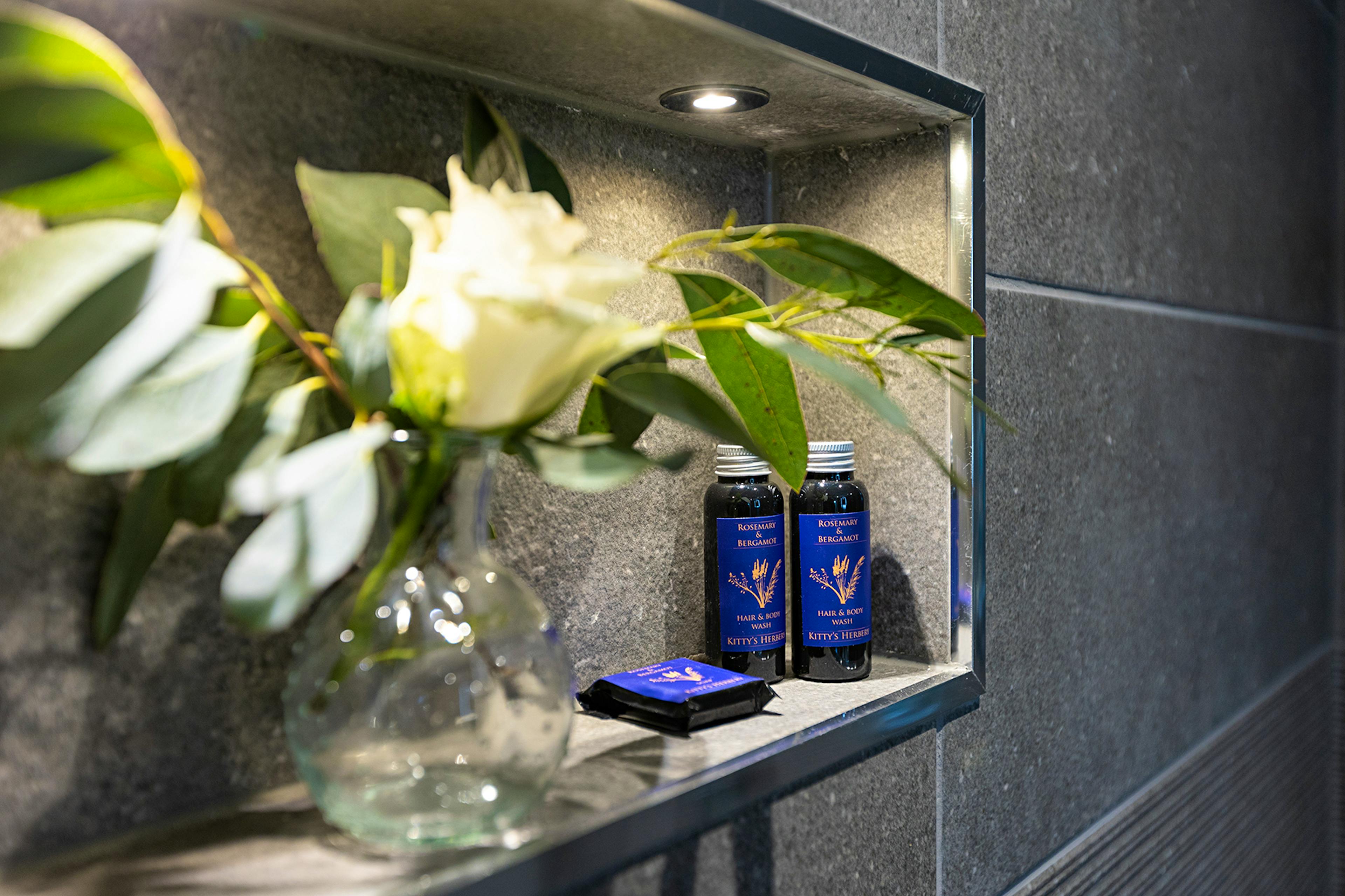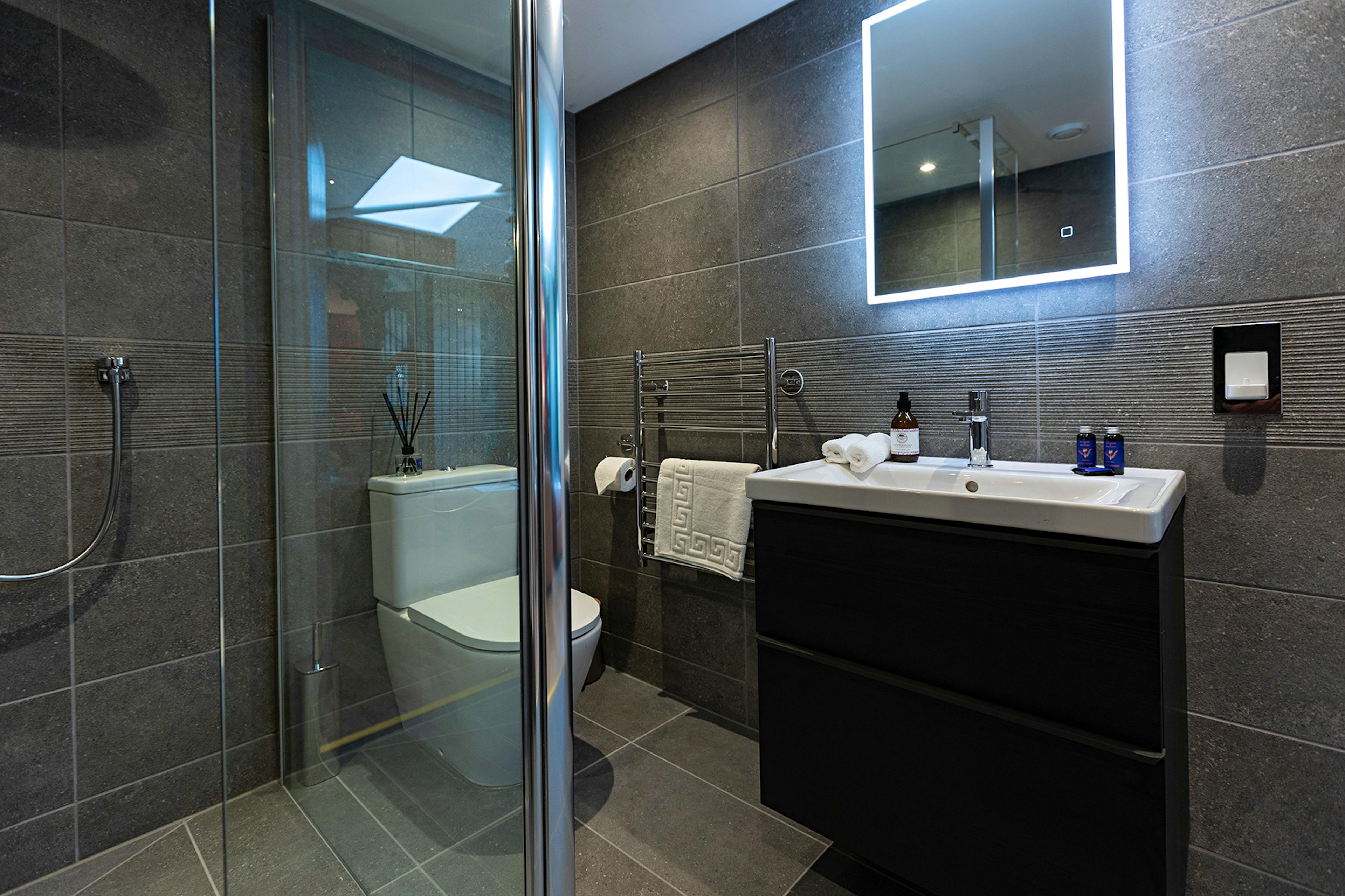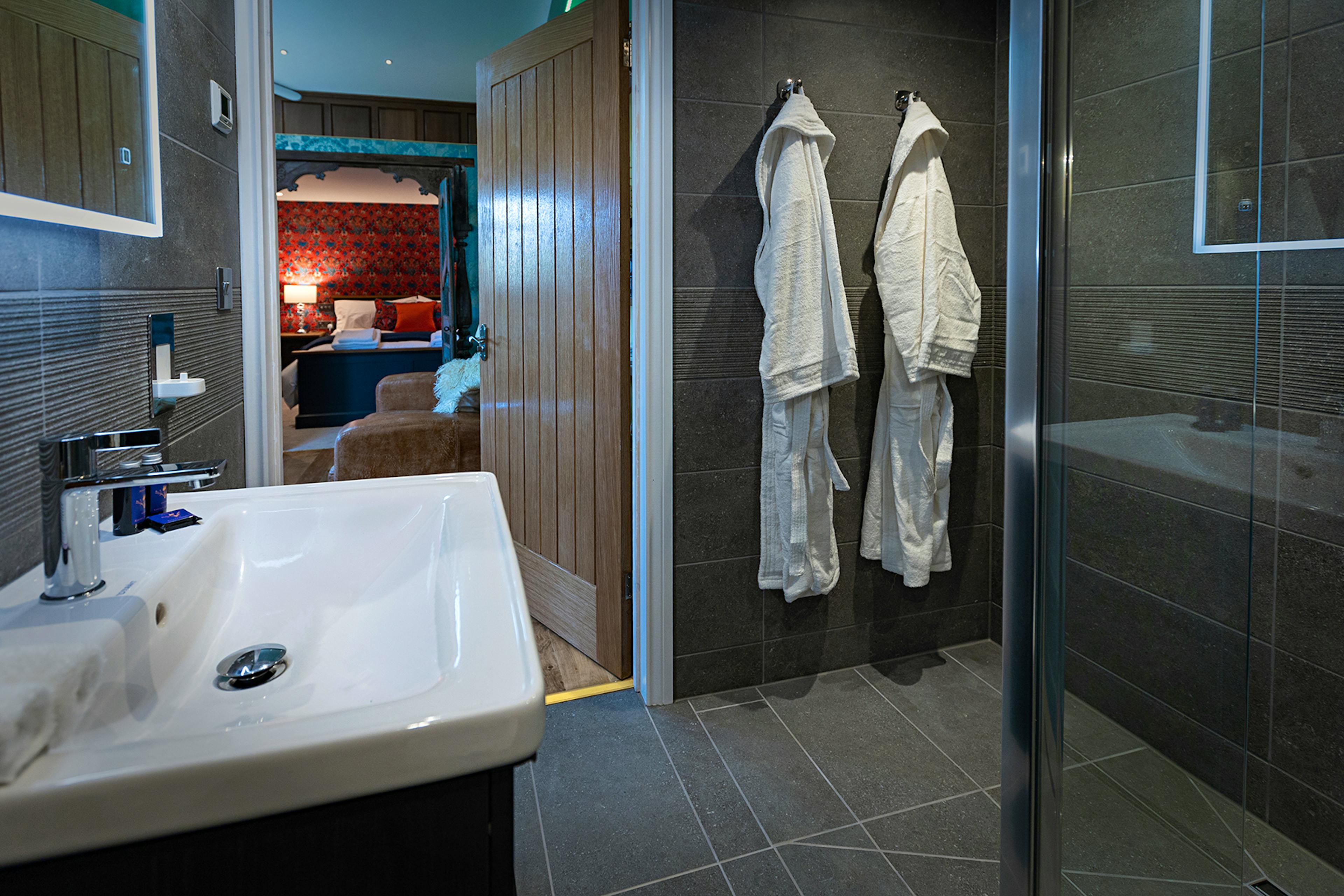 A spacious wet room offers sleek grey tiles, a walk-in shower and luxe amenities like Terry towelling robes and slippers for a spa-like experience.