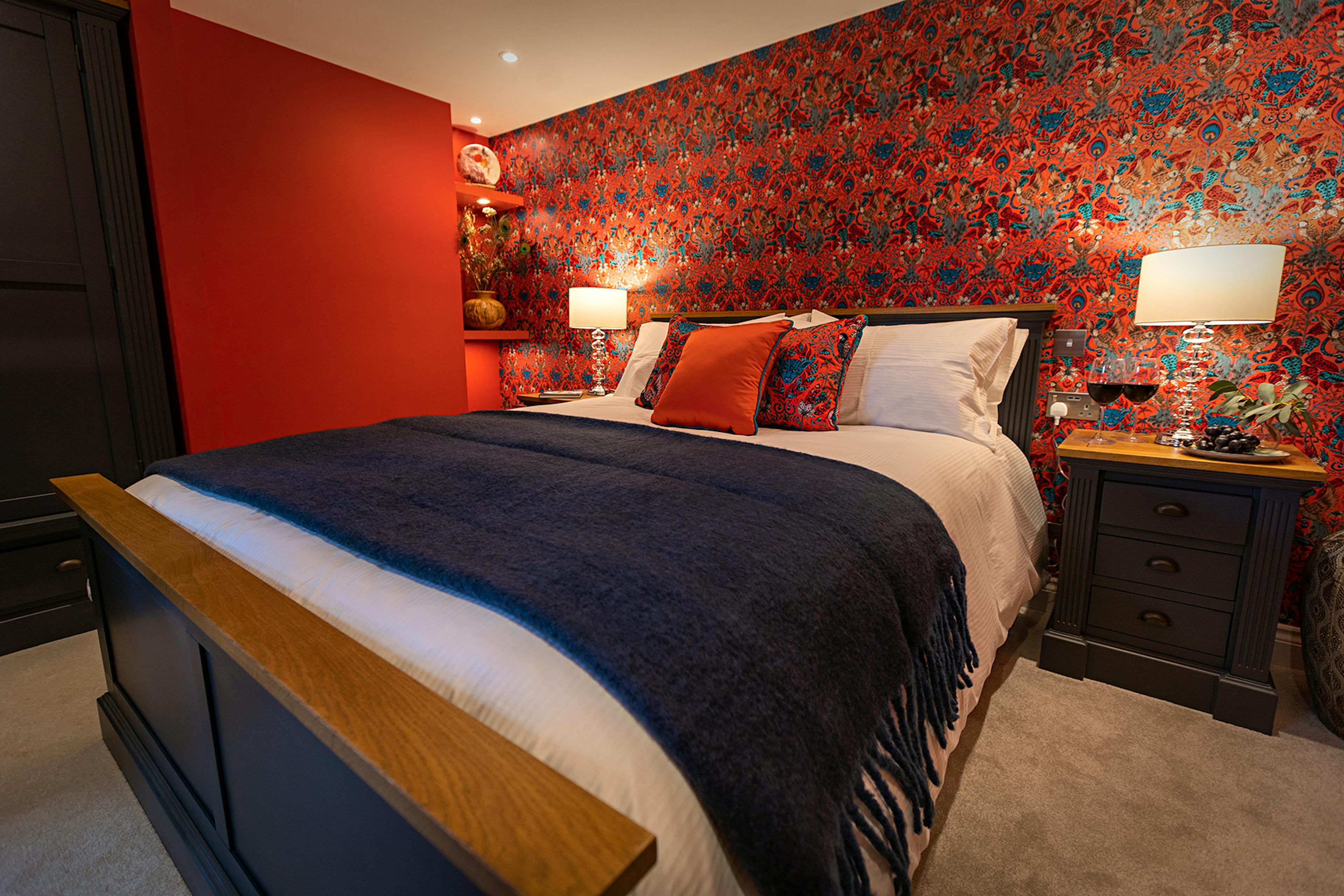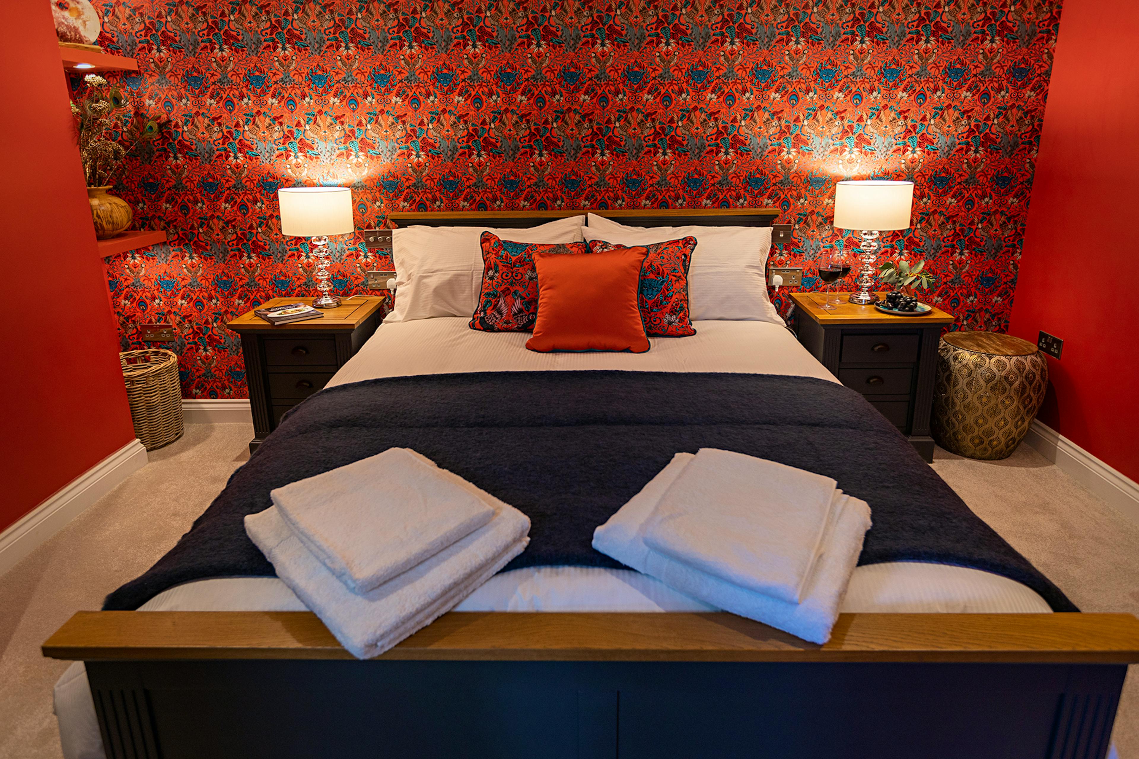 The bedroom is a romantic sanctuary with a plush king size bed dressed in 180-thread Egyptian cotton linens, ensuring a peaceful night’s sleep.