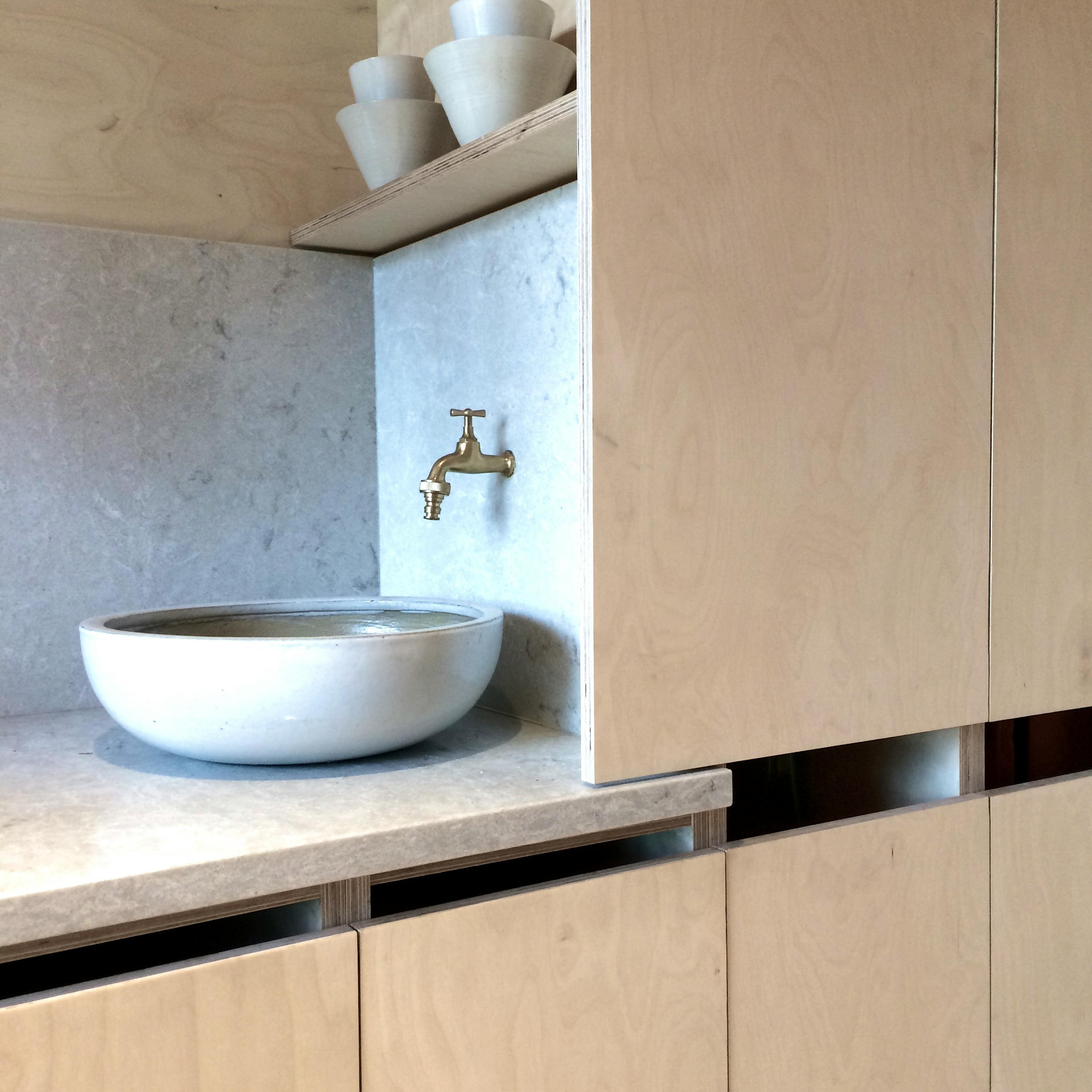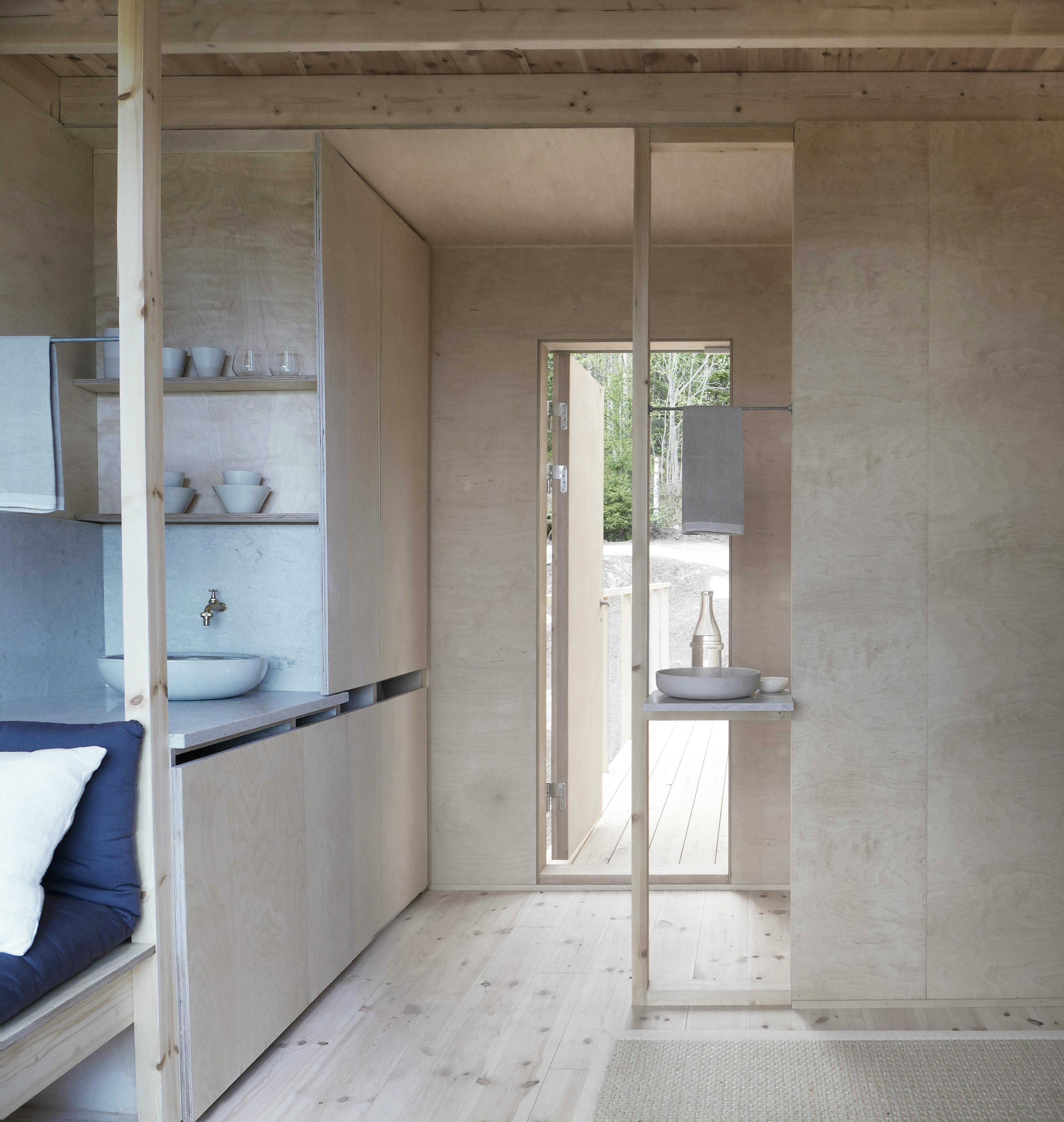 Minimalist living quarters with pale wood interior.