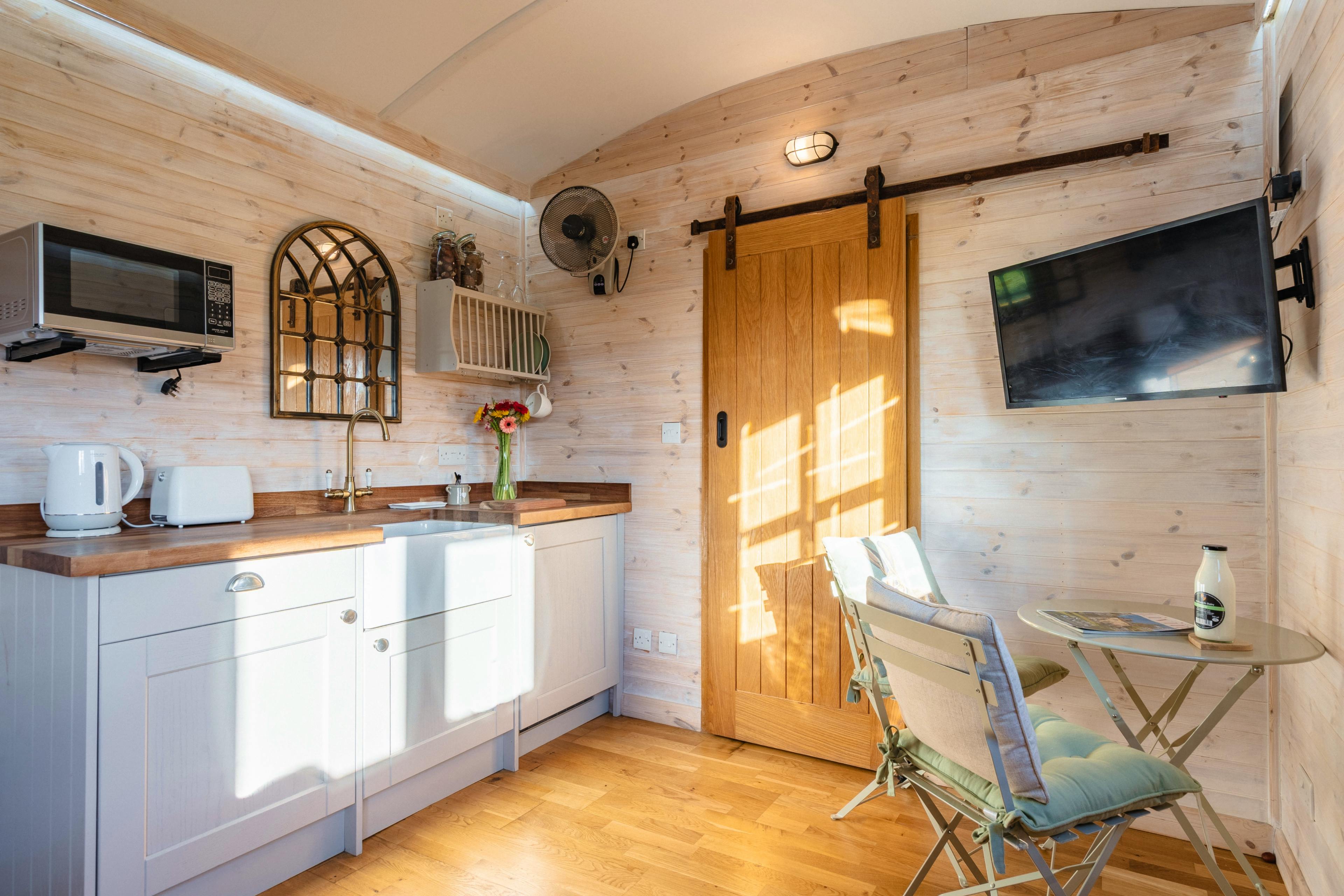 Well-equipped kitchenette and dining area for two, perfect for easy breakfasts and cosy suppers indoors.