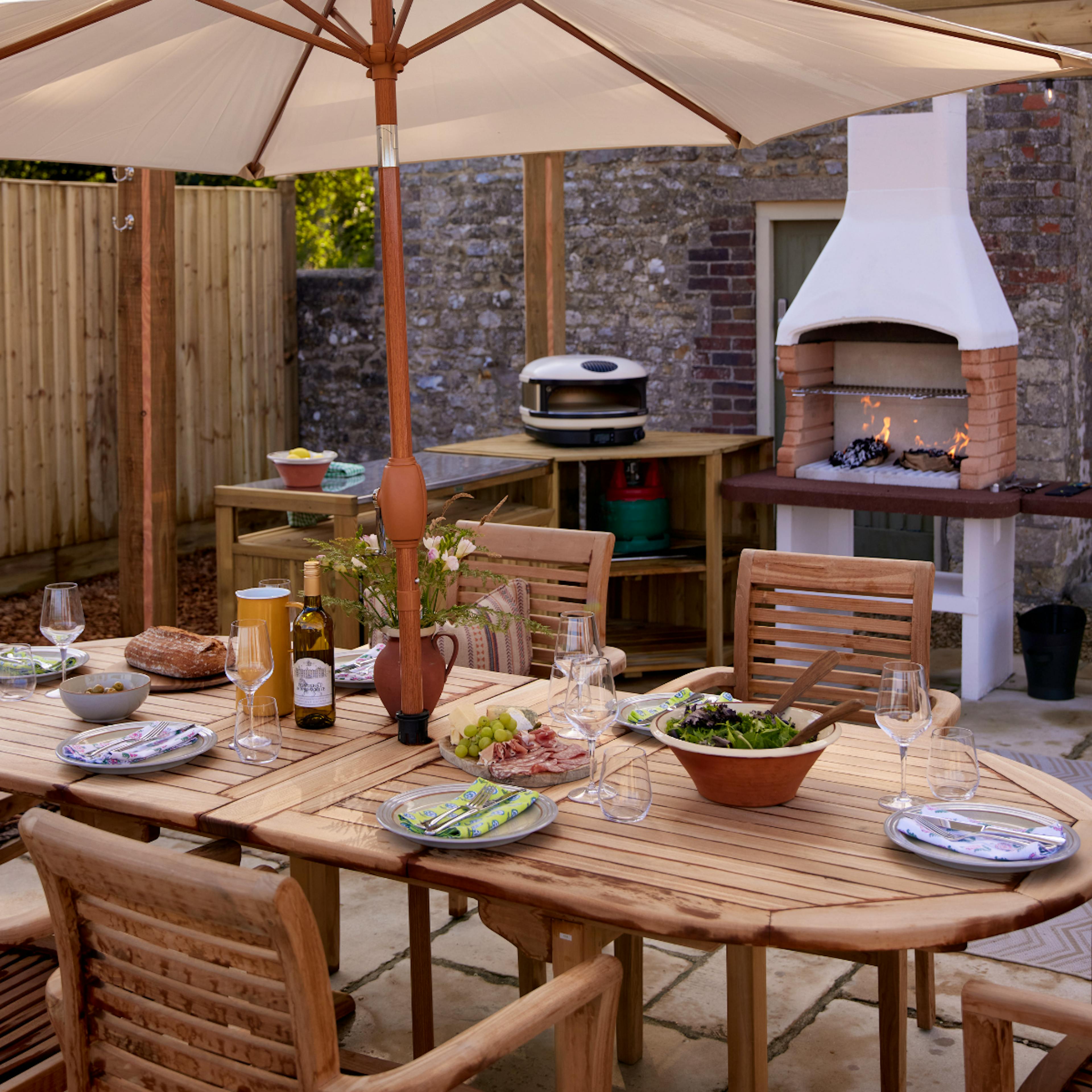 Outdoor kitchen with a barbeque and pizza oven, plus a fire pit with seating for cosy evenings.