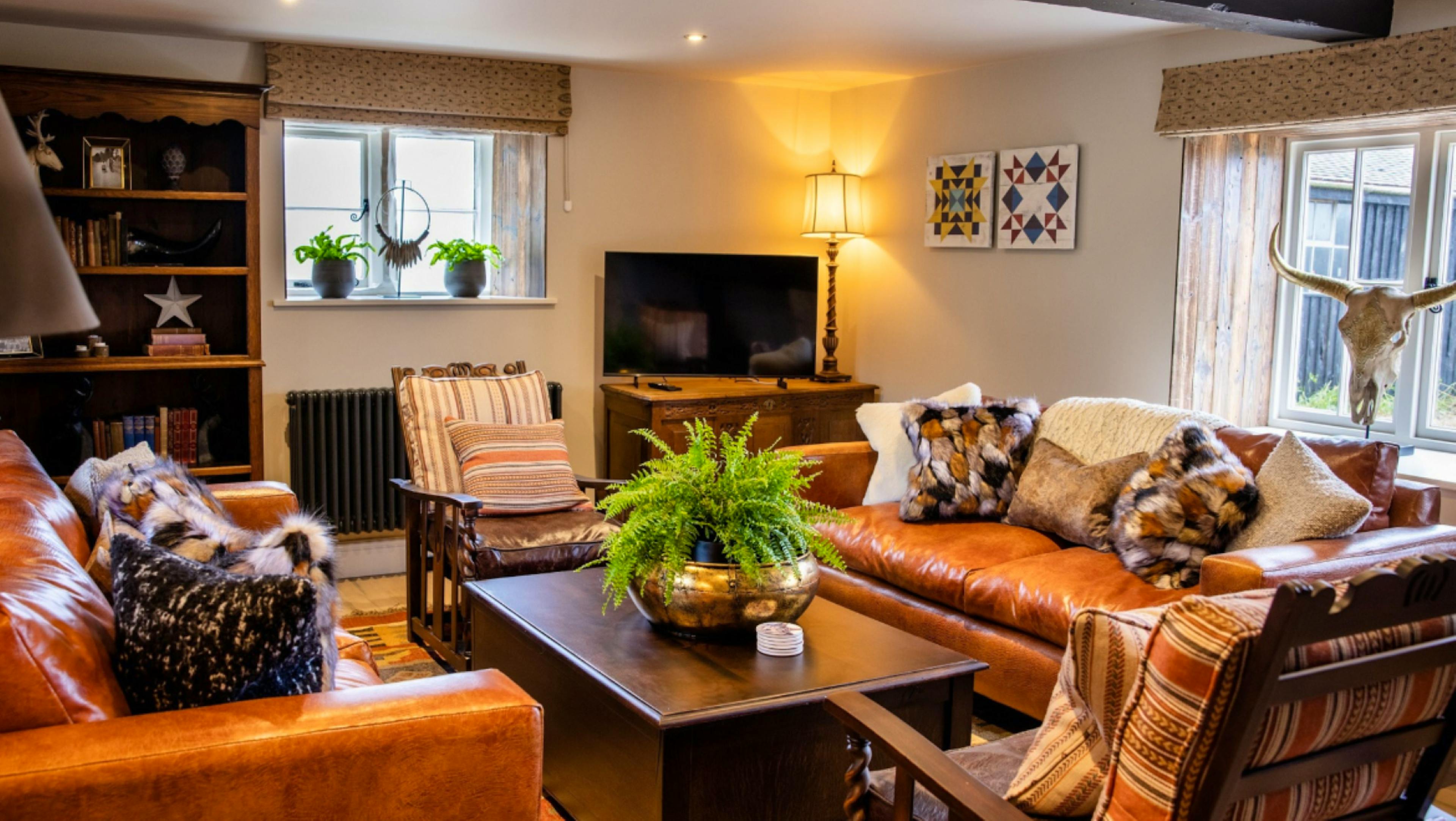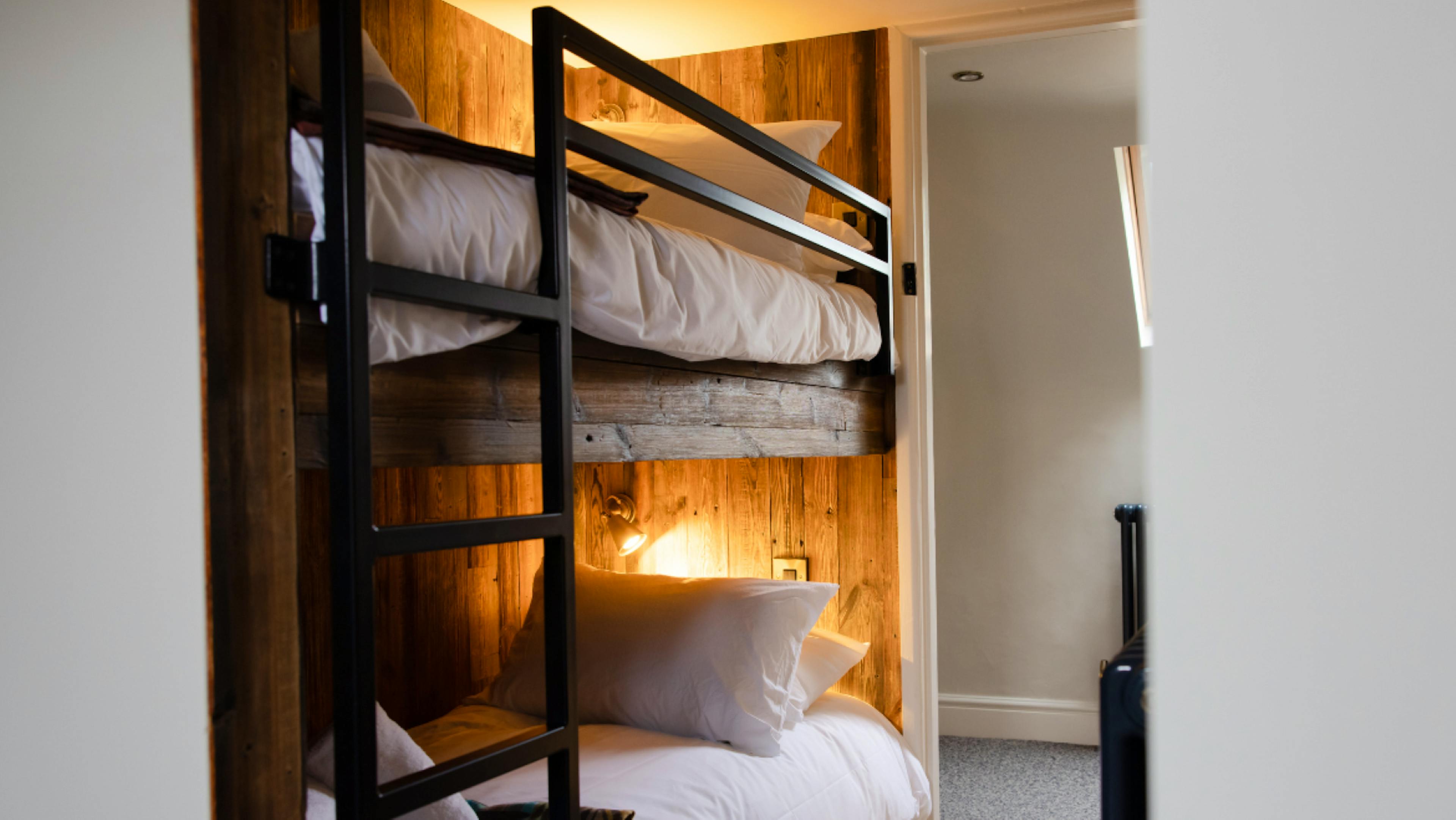 Sleeps six in three bedrooms, including two super king rooms (flexible as twins) and a children’s twin cabin room.