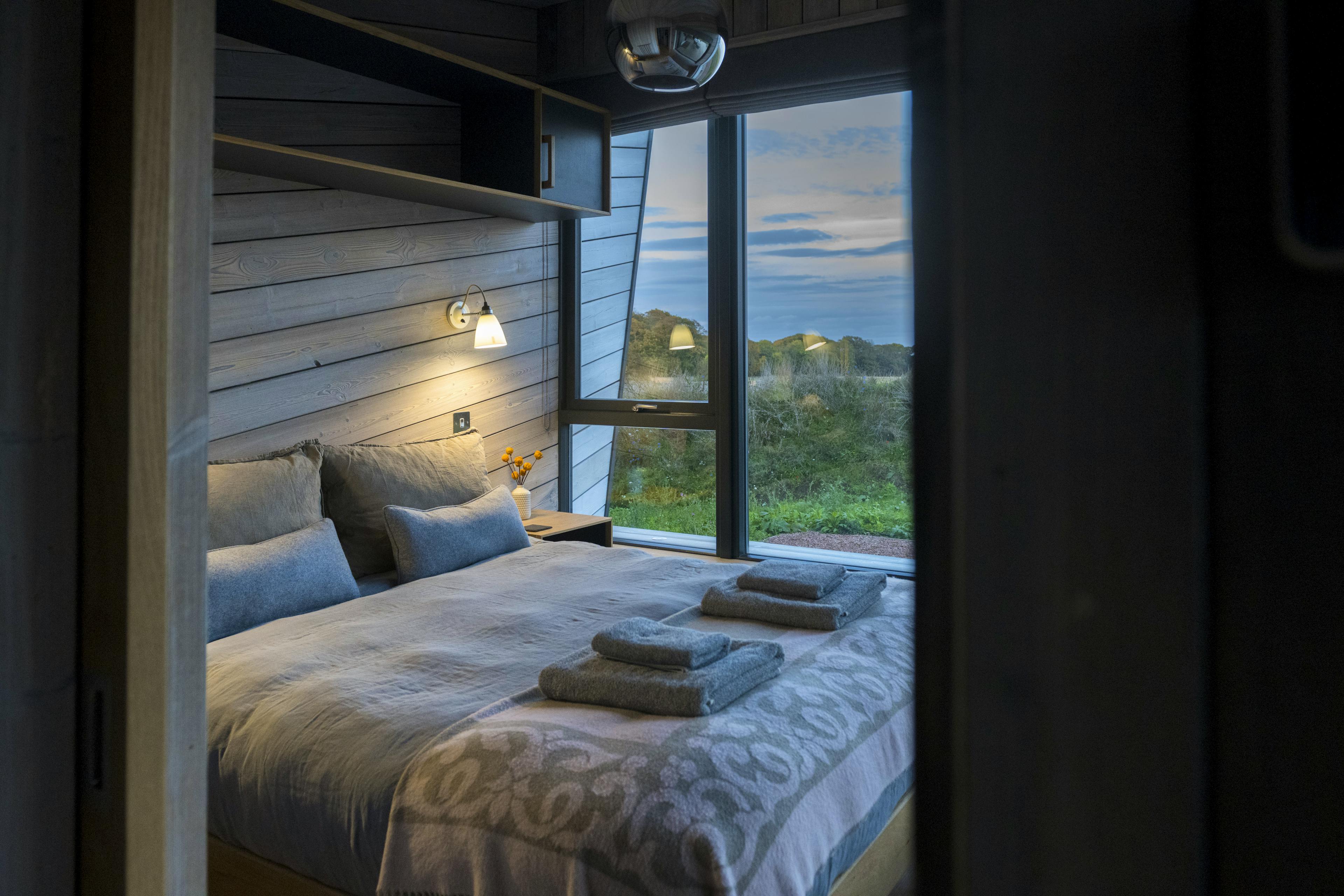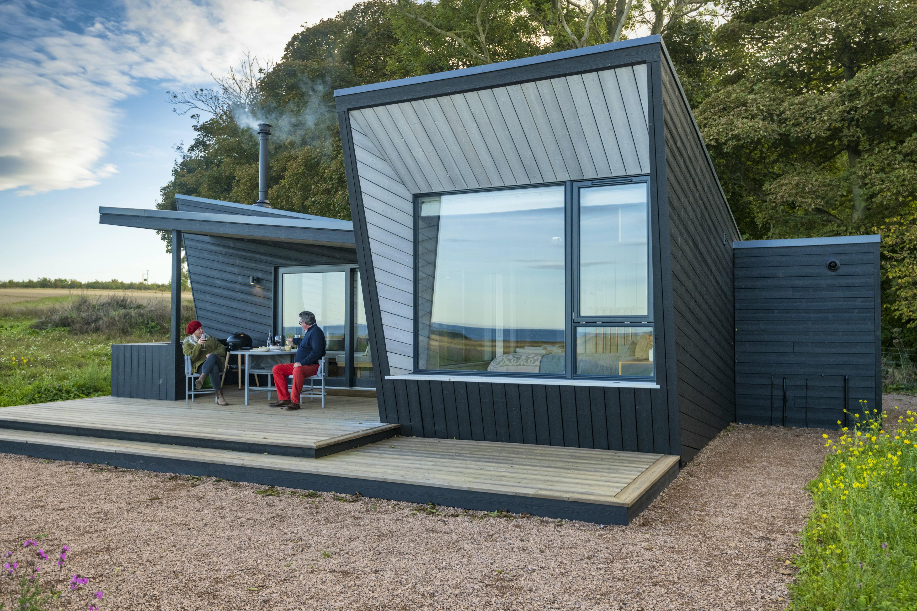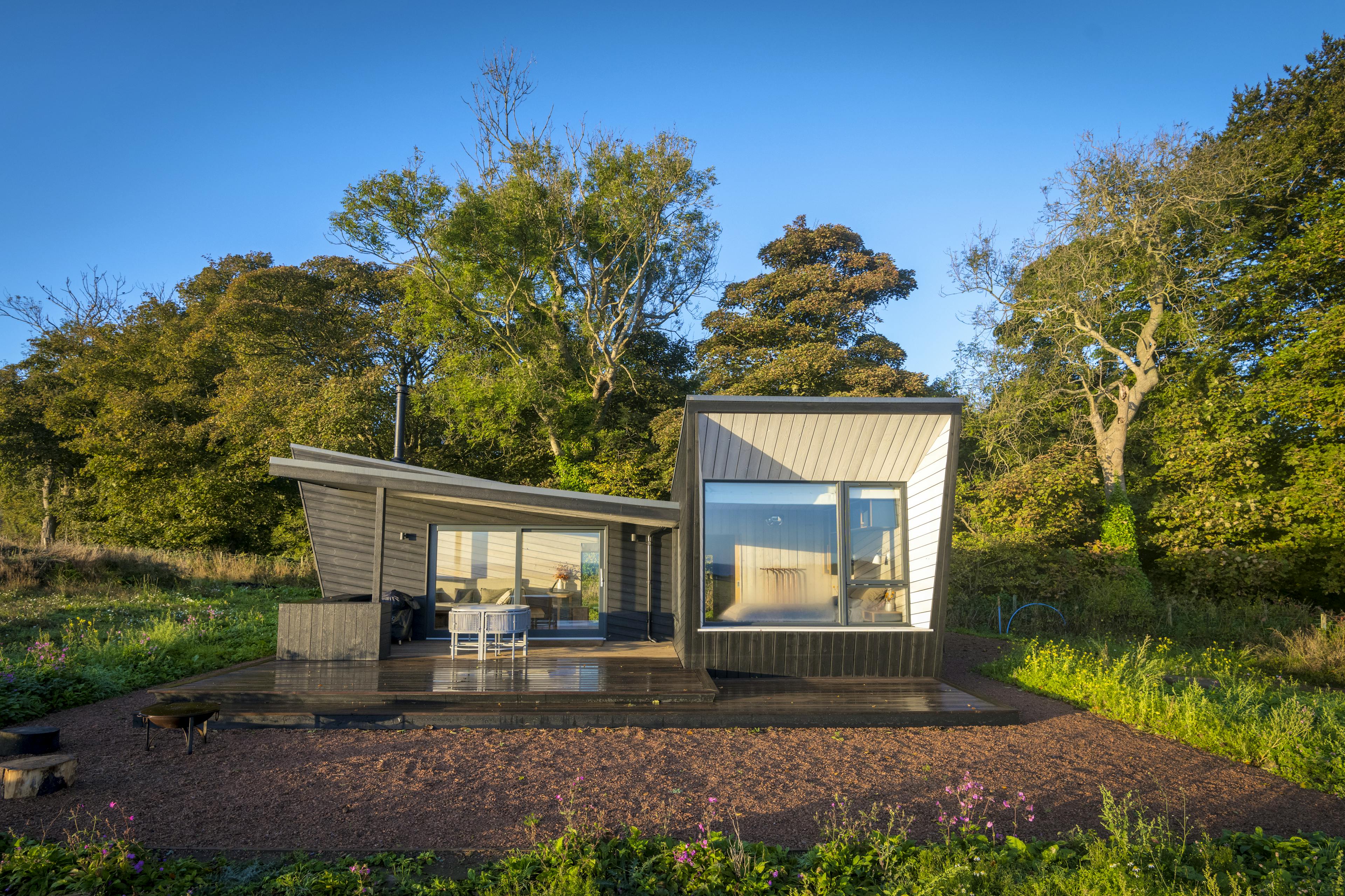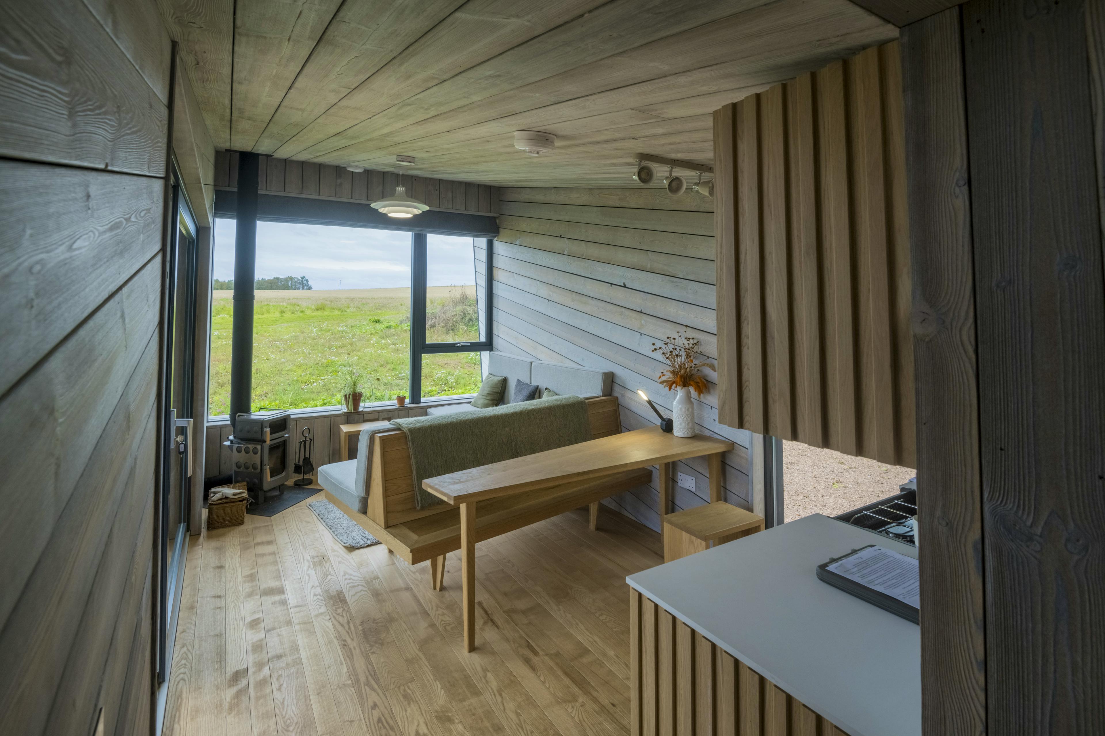 Striking off-grid cabin for two with far-reaching views towards the Fife coastline, expertly designed with you and the planet in mind.