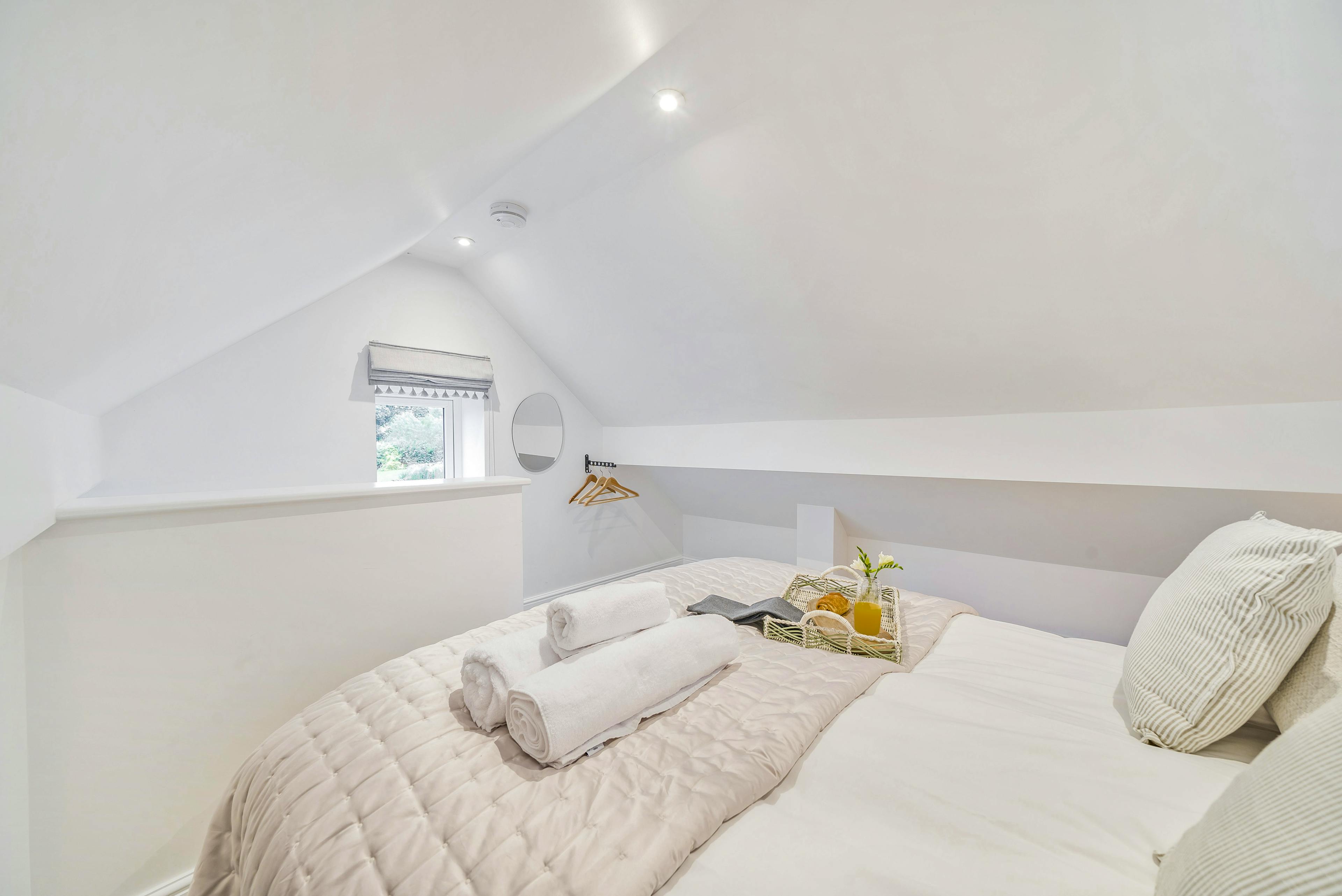 The airy mezzanine offers a super king-size bed or twin beds, with lovely views of a wildlife-rich pond.