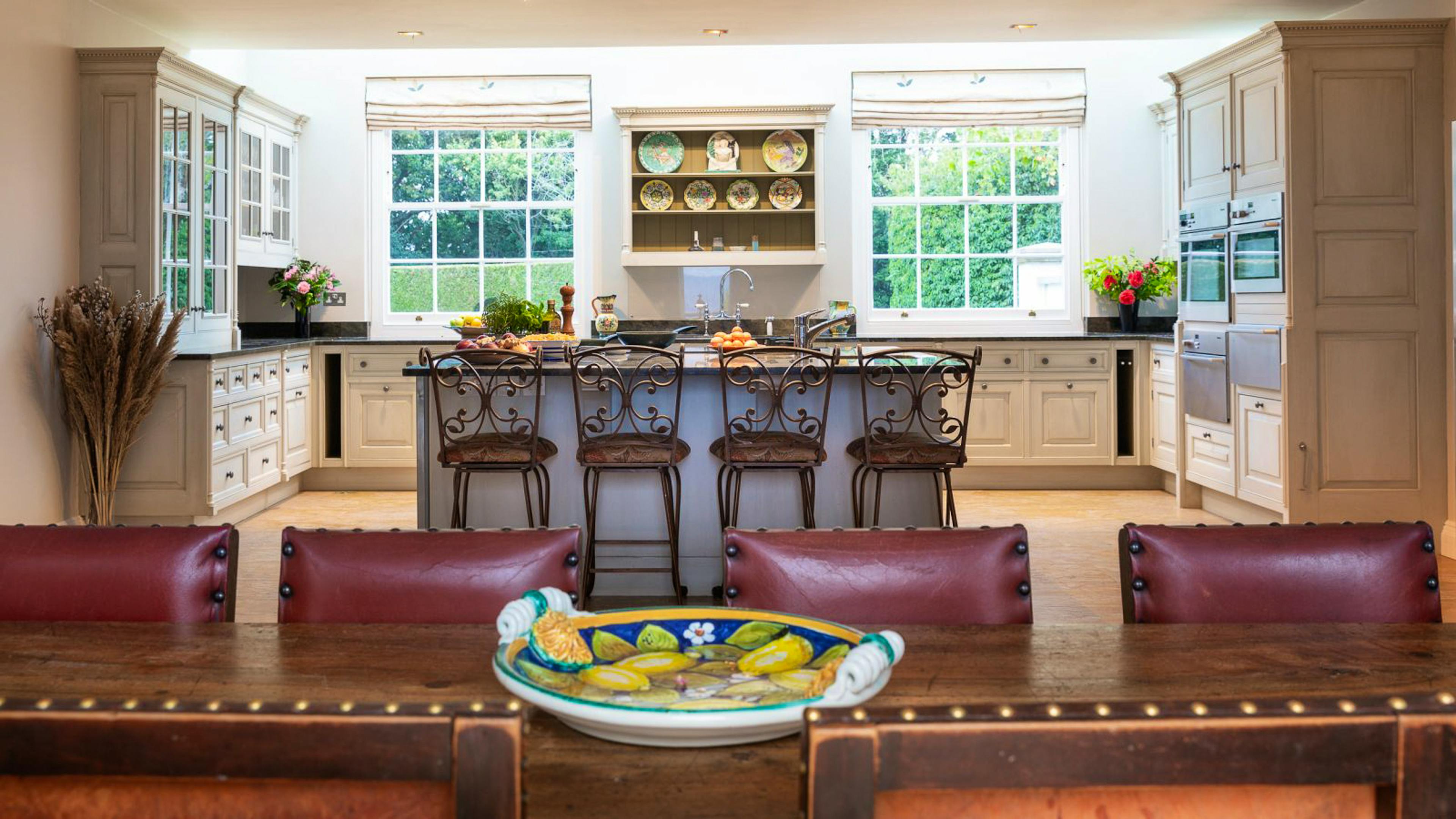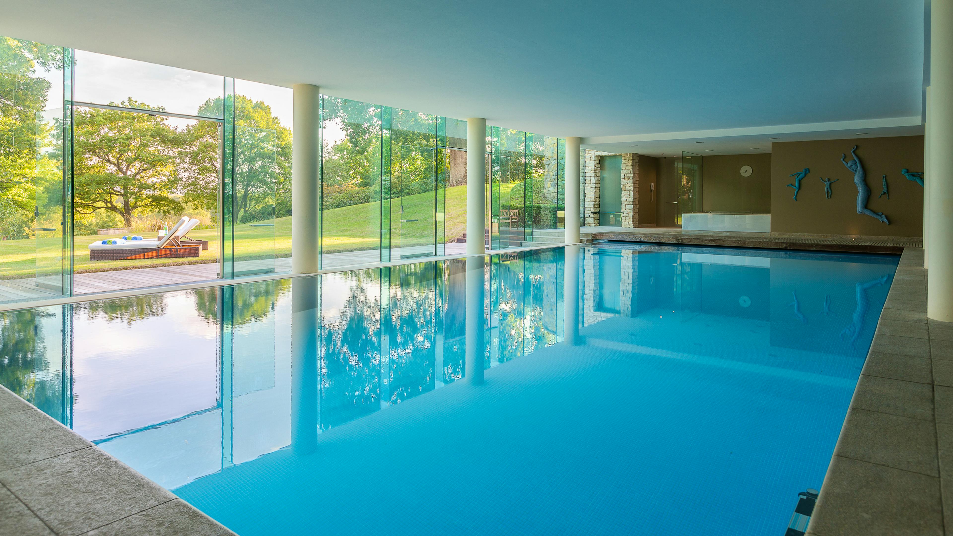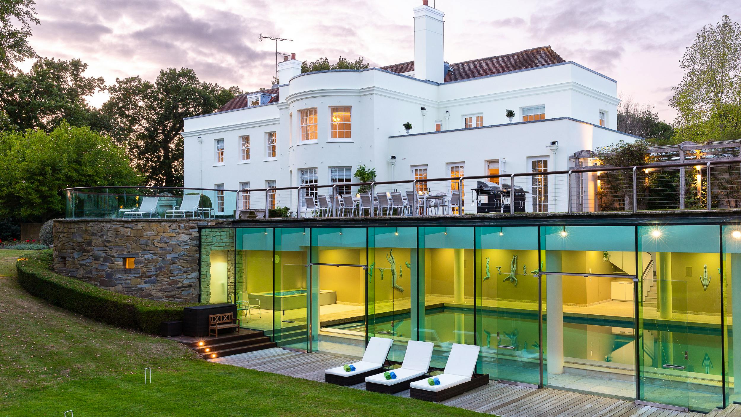 This luxurious property is located in picturesque Ashurst, West Sussex and boasts an infinity swimming pool, hot tub, and an all-weather tennis court set in 17 acres of private gardens.
