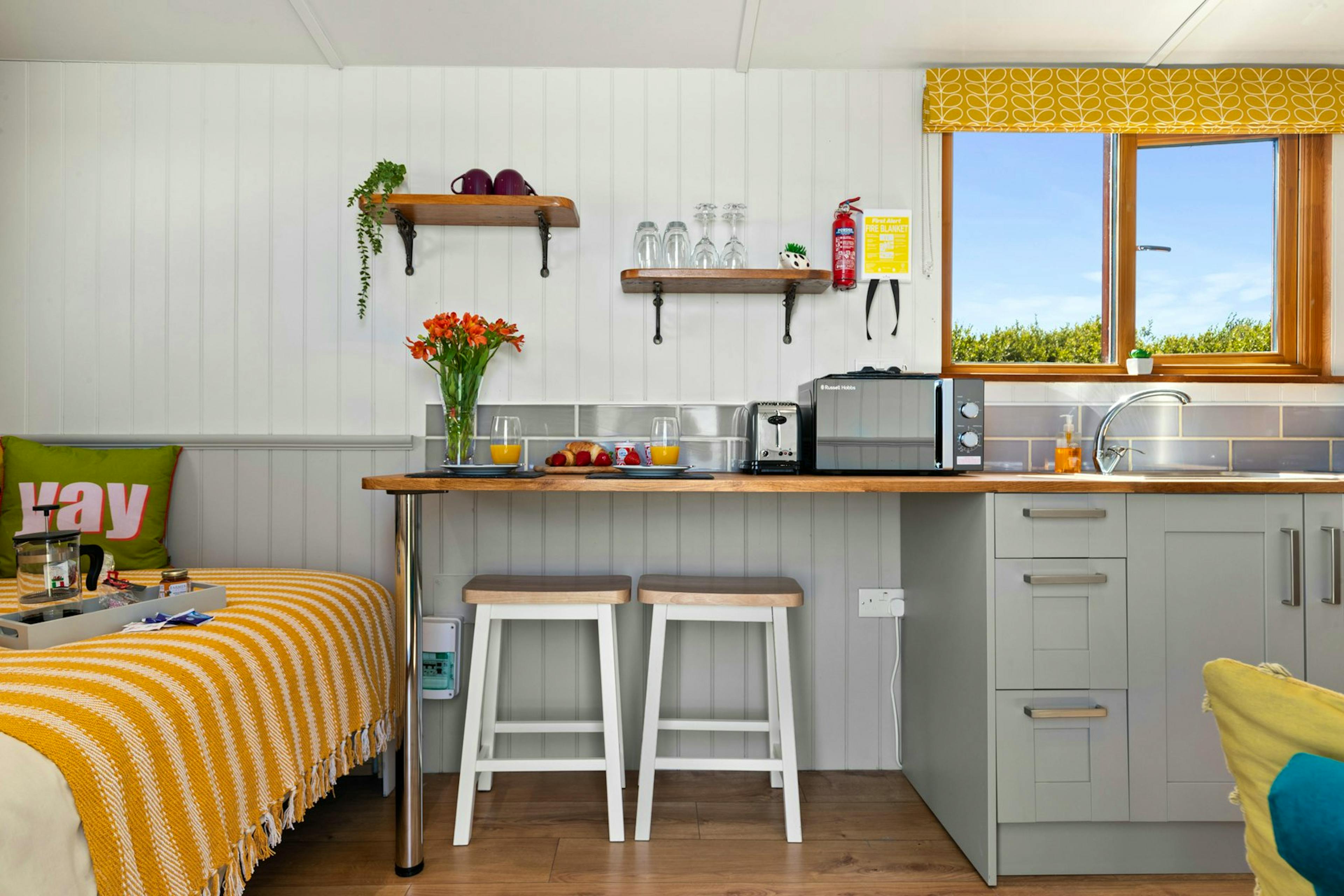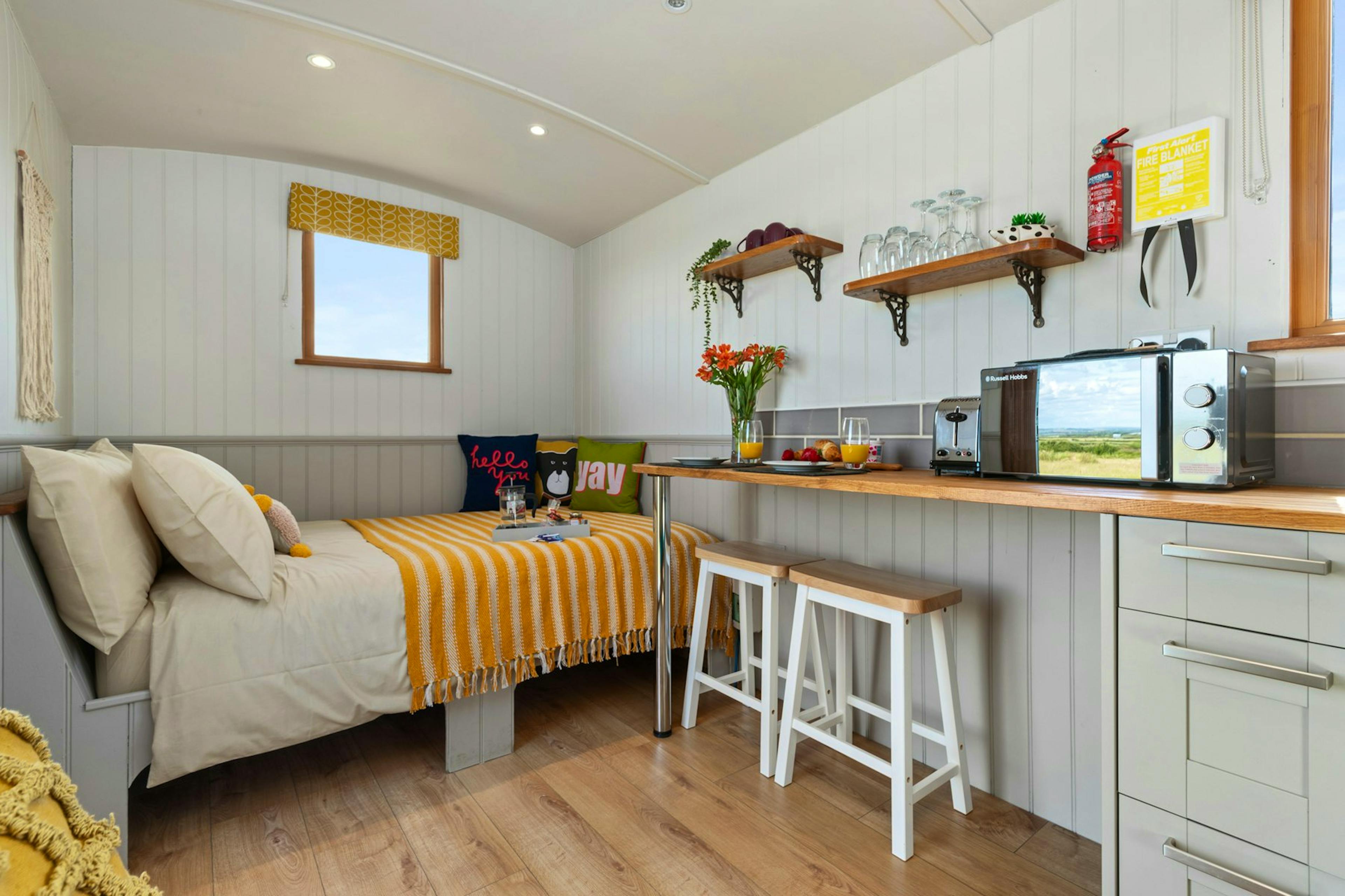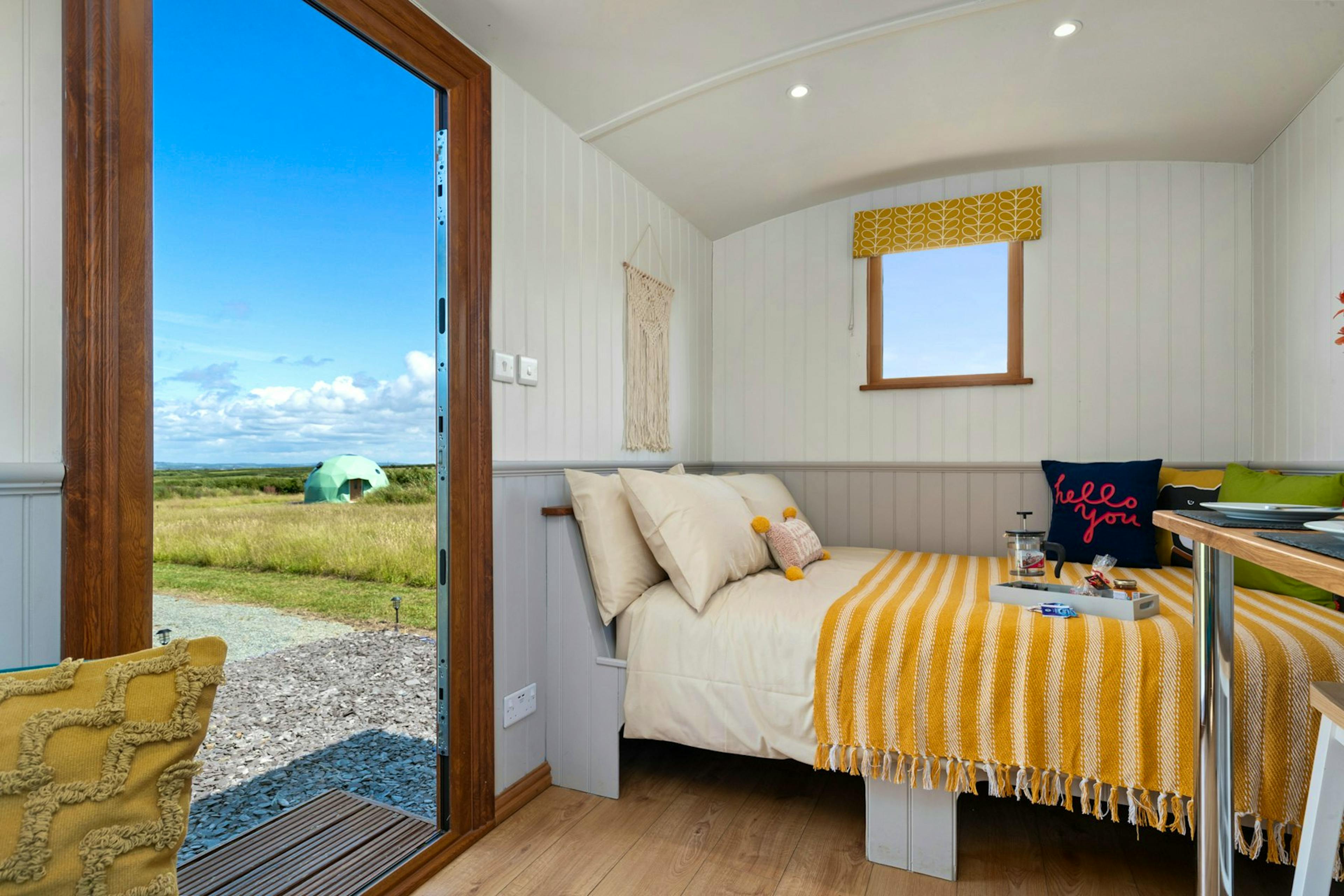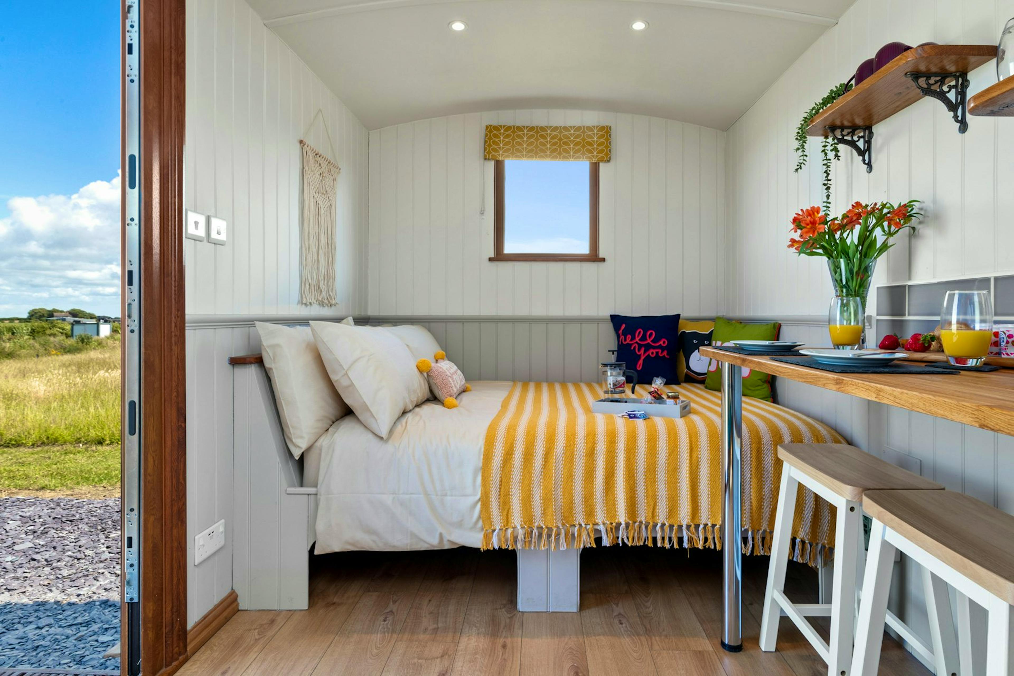 Press the eject button, leave the grind behind and relax surrounded by beautiful Welsh countryside in one of Stargaze Glamping's pretty shepherd's huts. Forget about sleeping mats and tent poles, this is camping for those who prefer a little luxury when they get back to nature. Thrift and Heather are the names of the two adorable huts which share a high spec finish and stunning views of the surrounding countryside. Romantic Thrift was built for the owner's wedding night, so it was created with love in mind. It is bright, welcoming, and perfectly cosy. This open plan space has all couples need for a relaxing stay. The kitchen area has a solid wood countertop, sink and even a small oven for guests looking to prepare romantic meals for two. A couple of armchairs create a cosy area where visitors can pour over maps and plan the day or share candlelit cocoa before bed. When it's time to hit the hay, the double bed is dressed with quality linens and the tranquil environment and fresh air ensure guests enjoy a great night's sleep. Heather is the slightly larger of the two huts. The wooden interior is beautifully complimented by bright pops of yellow in the blinds and soft furnishings. It has a well-equipped kitchen, a small lounge area and great views through the windows and doorway. Both huts have indoor toilets and showers with plenty of hot water, so, unlike traditional camping holidays, there are no late-night toilet runs or queues for cold, dribbling showers. Guests will be charmed by these two lovely huts and their pretty, private outdoor areas. Guests can take meals at the outdoor dining area, sink into the wood-fired hot tub and watch the stars twinkle in the unpolluted skies by the warmth of the roaring fire pit. The local area has plenty for nature-lovers to discover. The Pembrokeshire beaches are glorious and guests will love exploring the famous coastal path. Alternatively, check out the colourful Puffins of Ramsey Island, boat trips regularly leave from St Justinians and if it's a quiet night in a cosy pub required, try The Swan Inn at Little Haven.