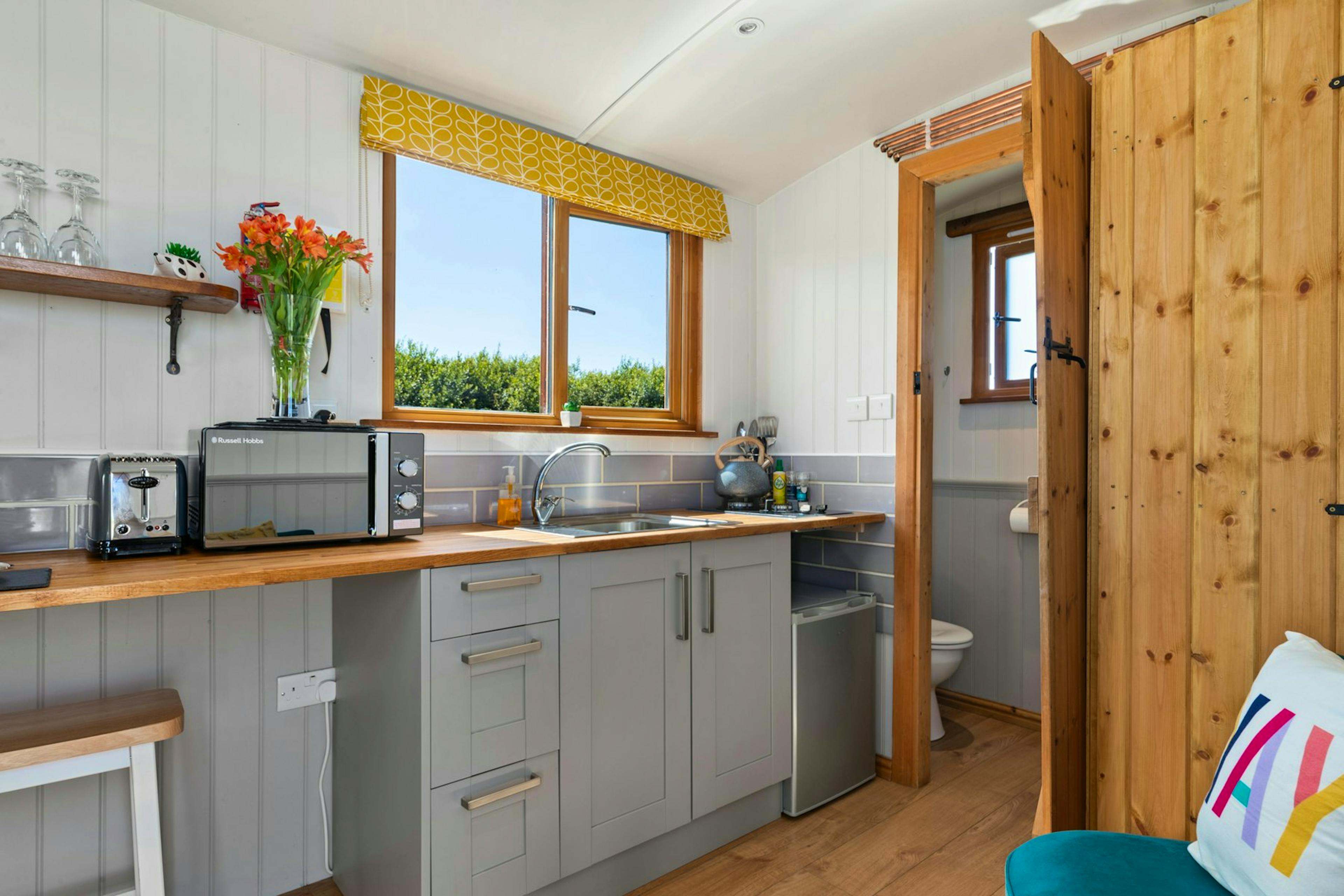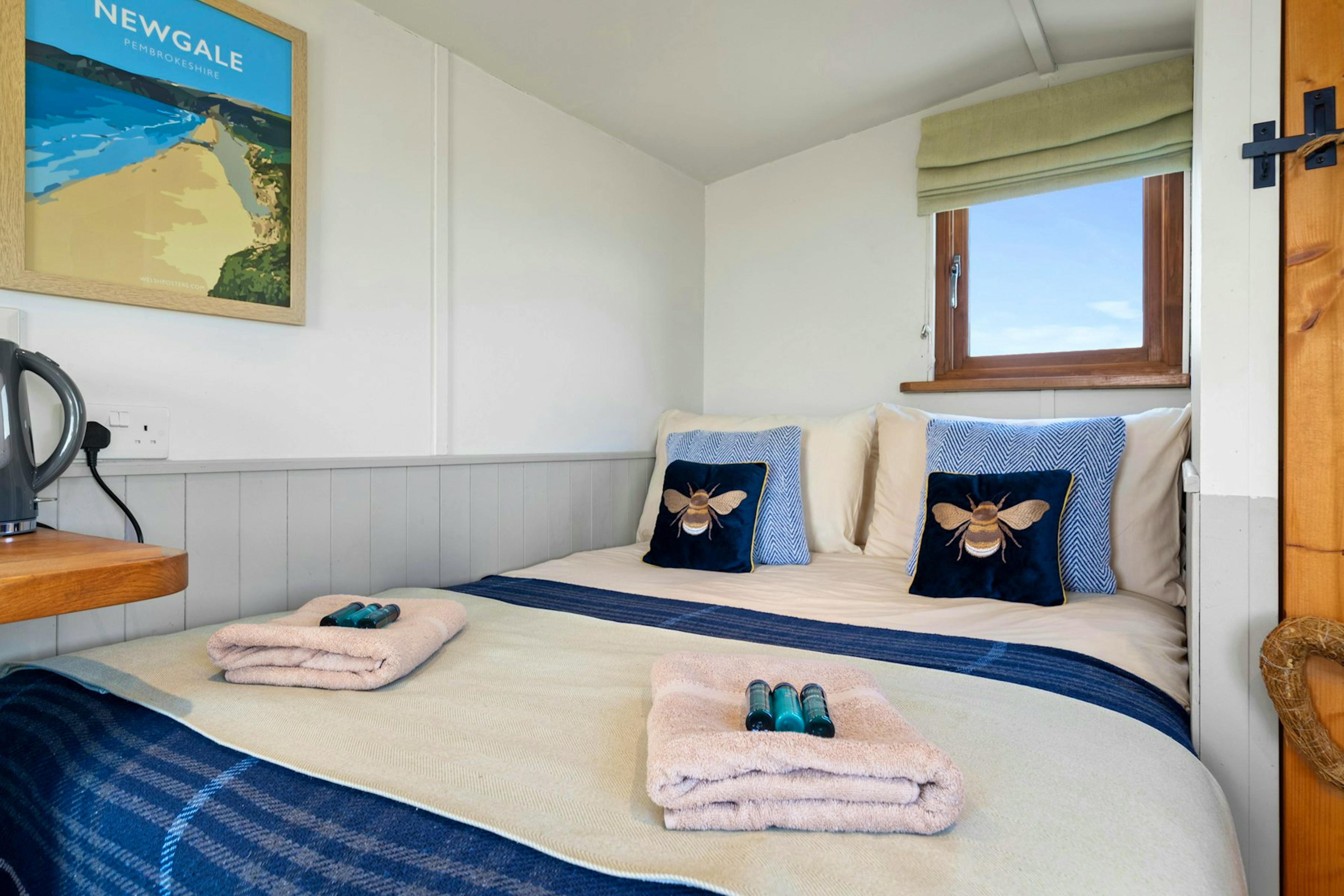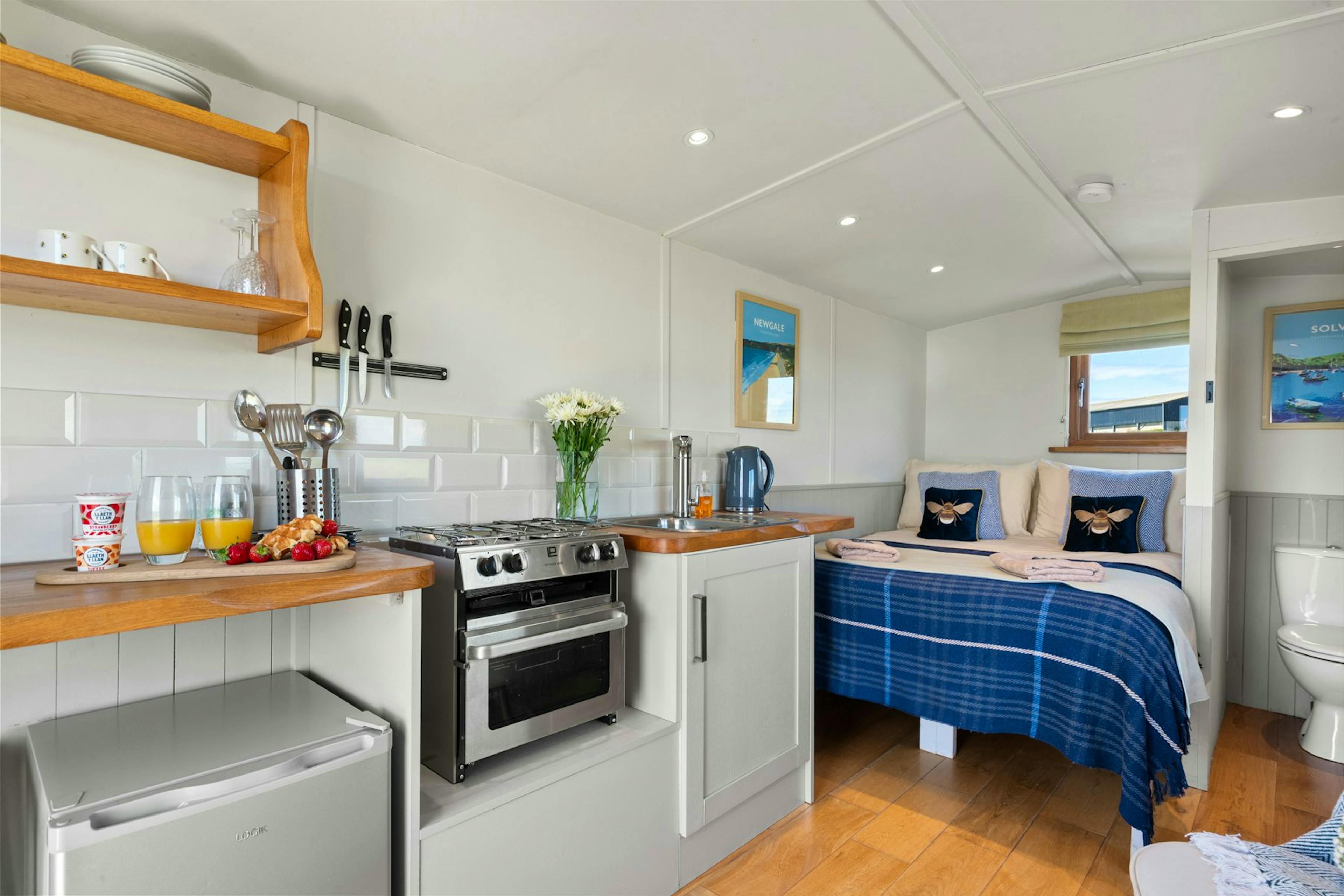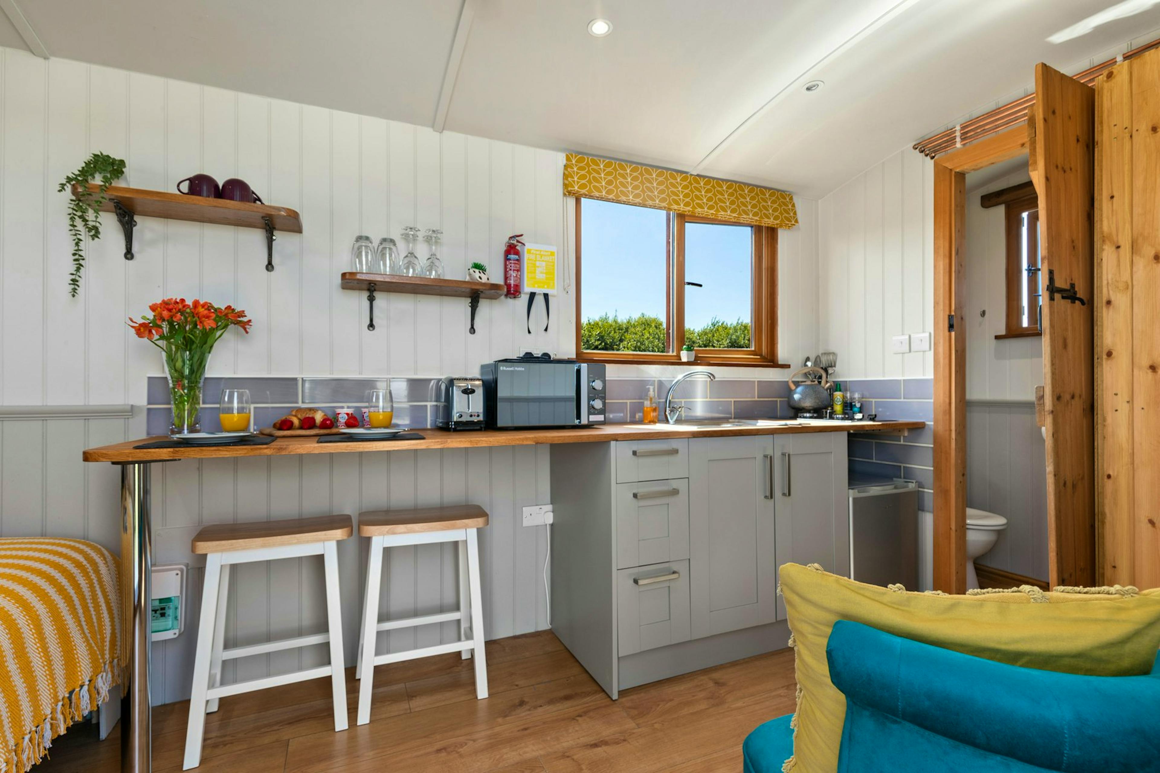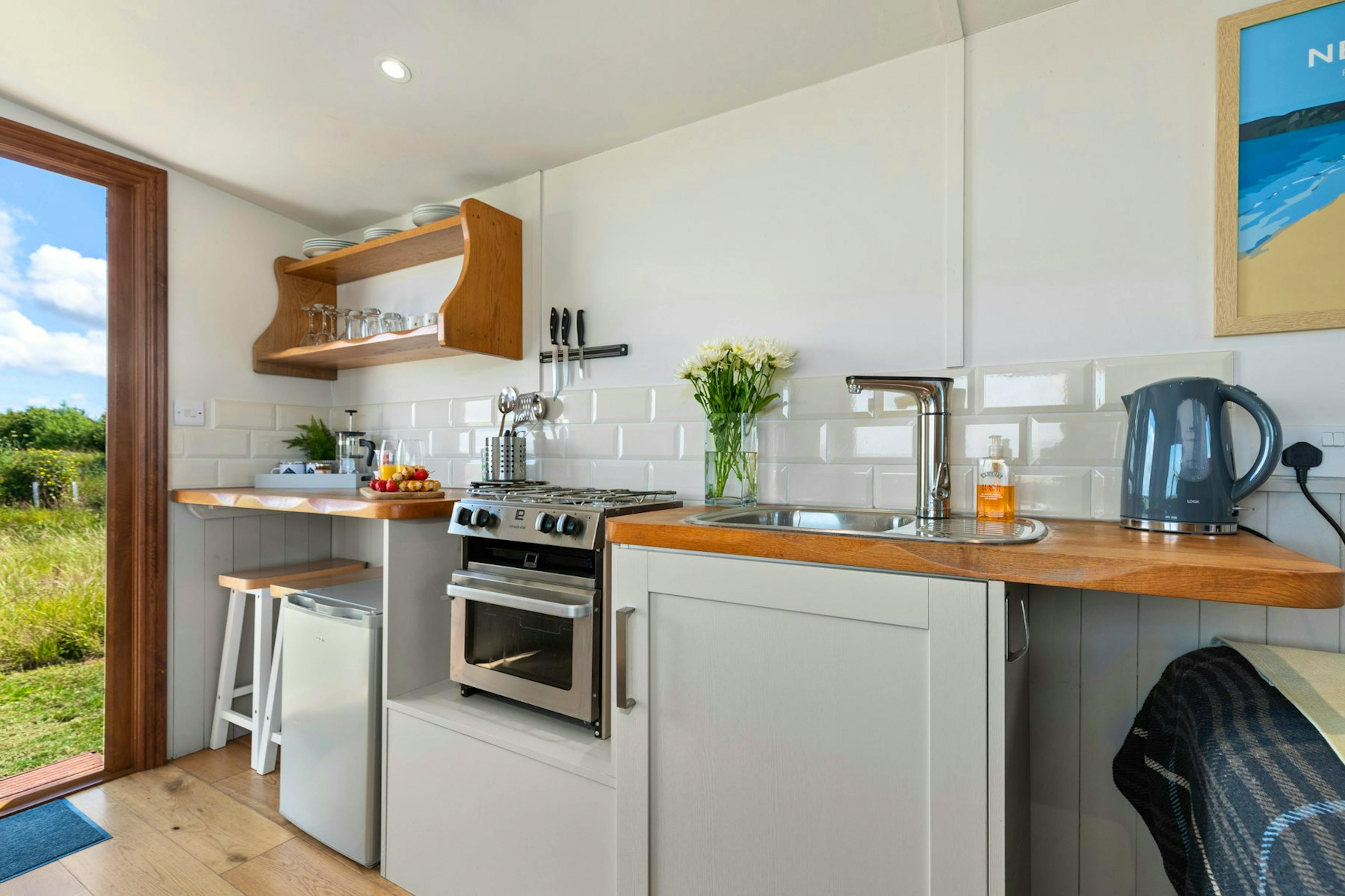 Press the eject button, leave the grind behind and relax surrounded by beautiful Welsh countryside in one of Stargaze Glamping's pretty shepherd's huts. Forget about sleeping mats and tent poles, this is camping for those who prefer a little luxury when they get back to nature. Thrift and Heather are the names of the two adorable huts which share a high spec finish and stunning views of the surrounding countryside. Romantic Thrift was built for the owner's wedding night, so it was created with love in mind. It is bright, welcoming, and perfectly cosy. This open plan space has all couples need for a relaxing stay. The kitchen area has a solid wood countertop, sink and even a small oven for guests looking to prepare romantic meals for two. A couple of armchairs create a cosy area where visitors can pour over maps and plan the day or share candlelit cocoa before bed. When it's time to hit the hay, the double bed is dressed with quality linens and the tranquil environment and fresh air ensure guests enjoy a great night's sleep. Heather is the slightly larger of the two huts. The wooden interior is beautifully complimented by bright pops of yellow in the blinds and soft furnishings. It has a well-equipped kitchen, a small lounge area and great views through the windows and doorway. Both huts have indoor toilets and showers with plenty of hot water, so, unlike traditional camping holidays, there are no late-night toilet runs or queues for cold, dribbling showers. Guests will be charmed by these two lovely huts and their pretty, private outdoor areas. Guests can take meals at the outdoor dining area, sink into the wood-fired hot tub and watch the stars twinkle in the unpolluted skies by the warmth of the roaring fire pit. The local area has plenty for nature-lovers to discover. The Pembrokeshire beaches are glorious and guests will love exploring the famous coastal path. Alternatively, check out the colourful Puffins of Ramsey Island, boat trips regularly leave from St Justinians and if it's a quiet night in a cosy pub required, try The Swan Inn at Little Haven.