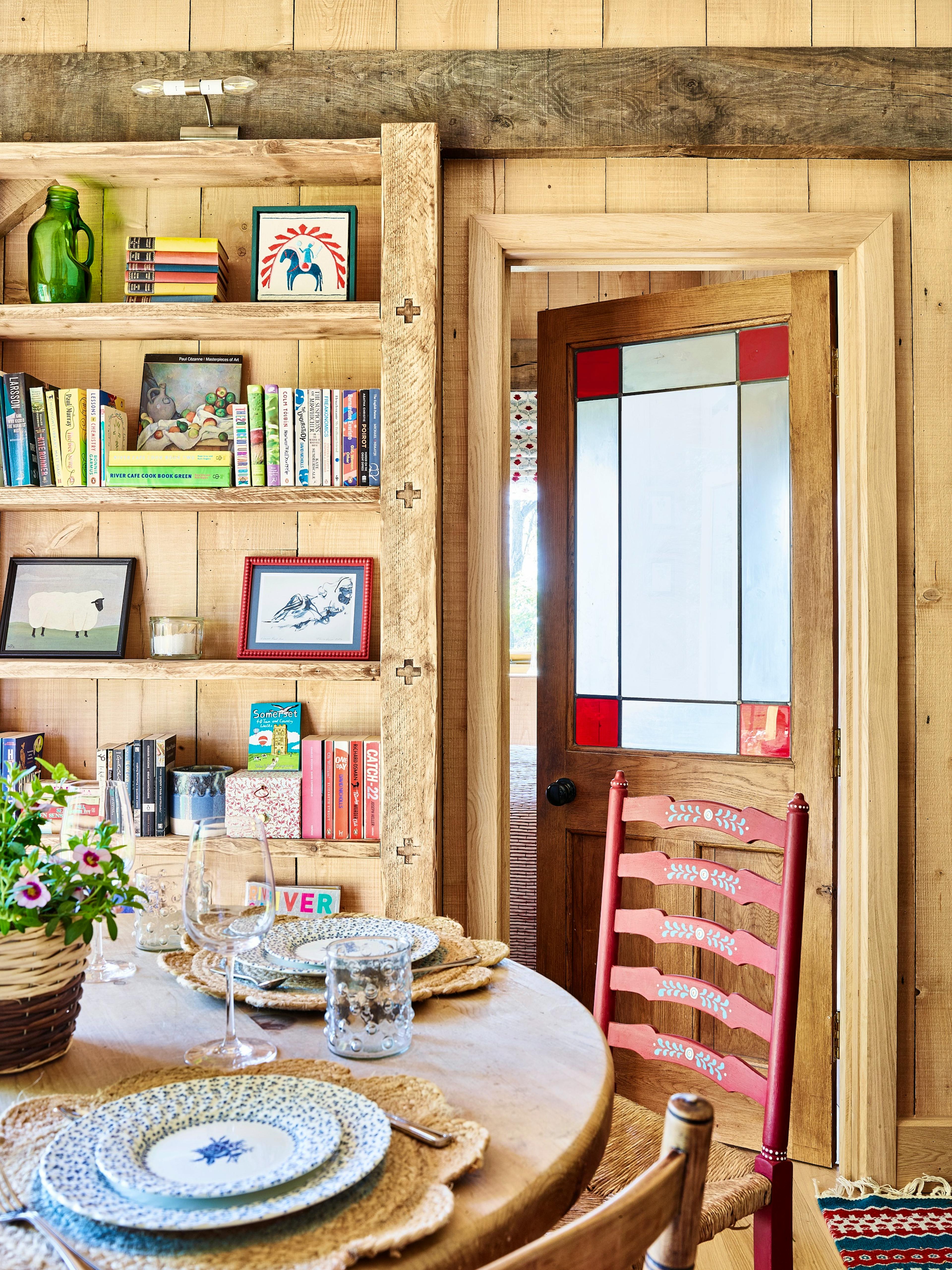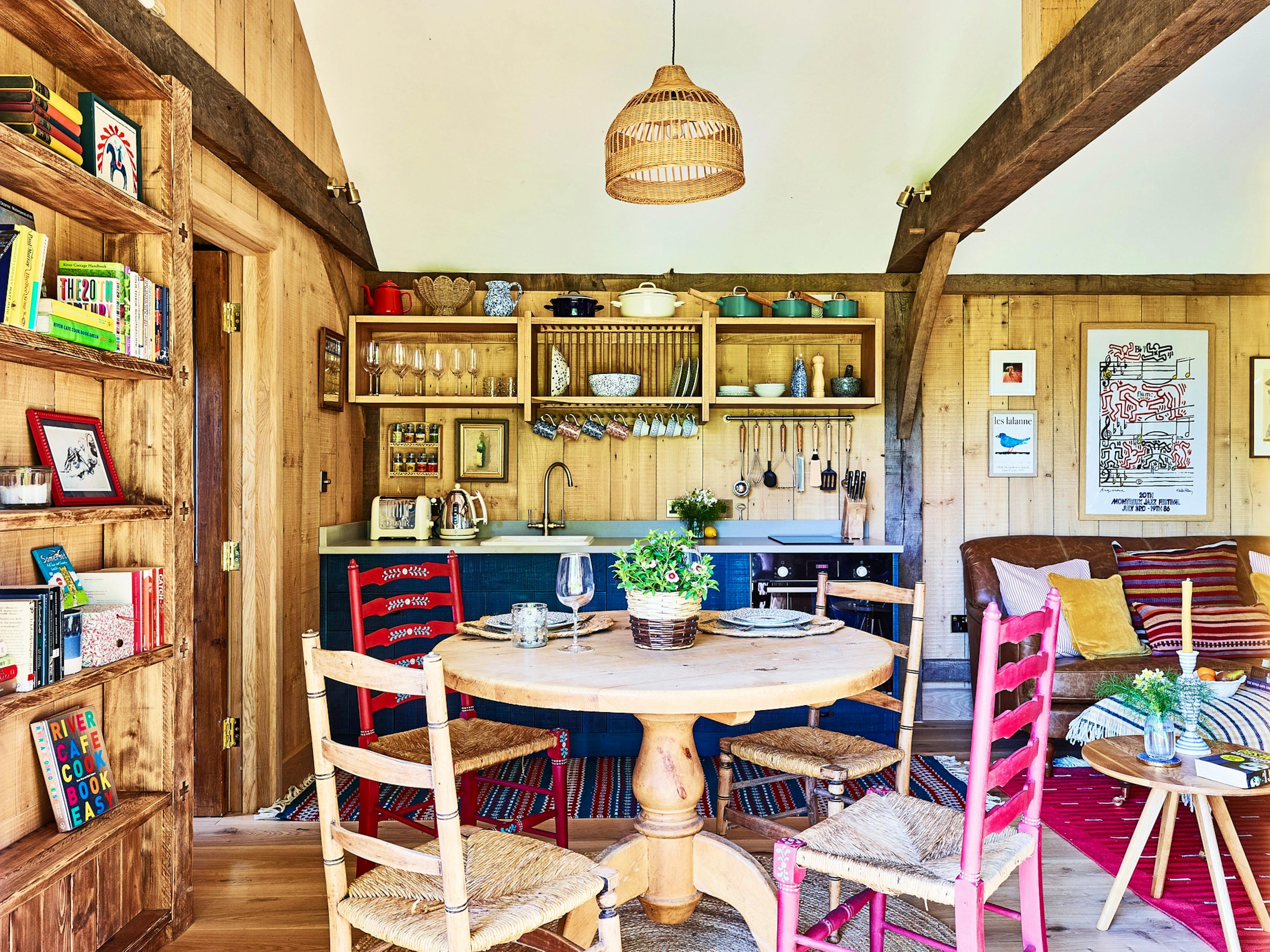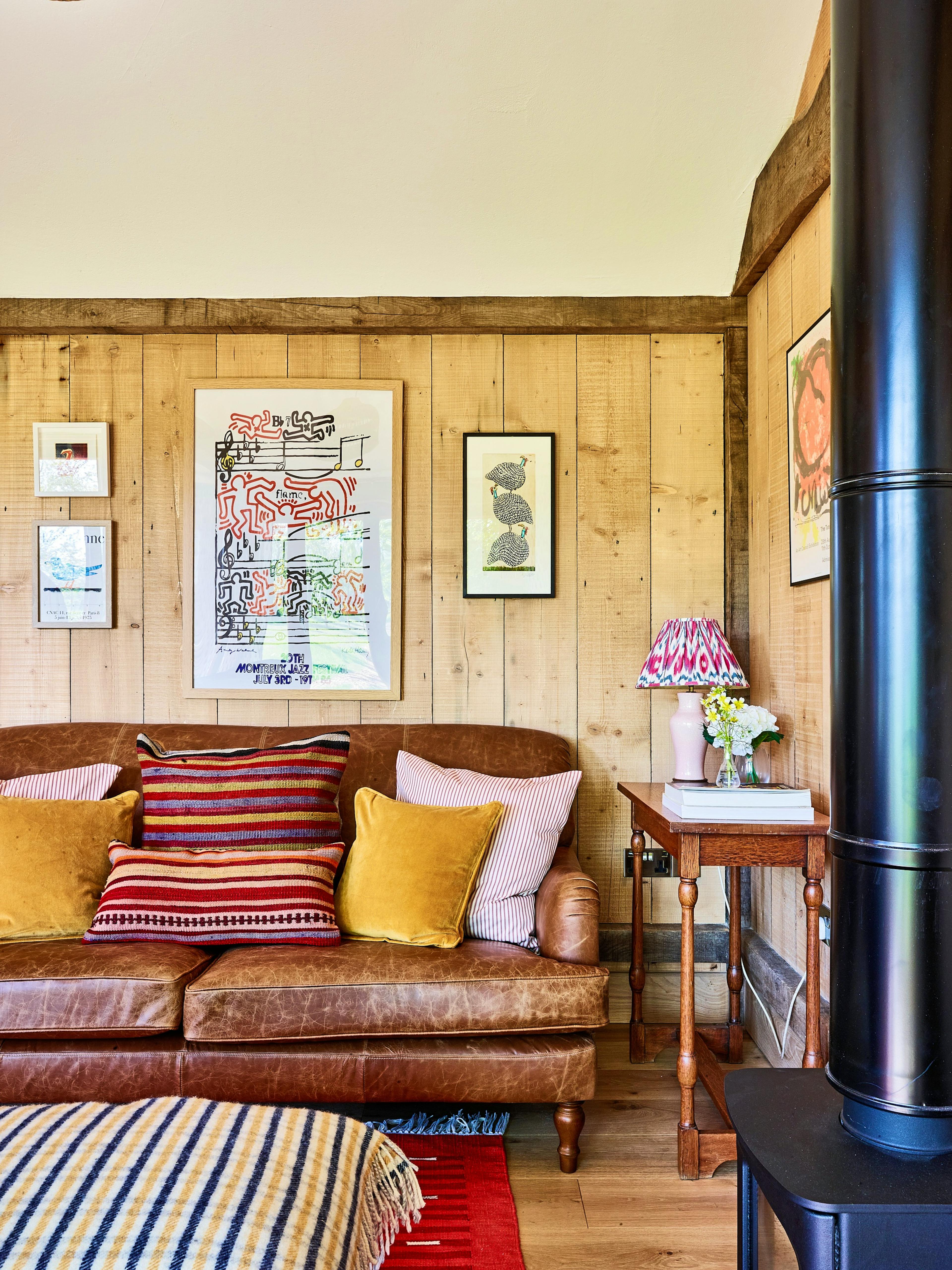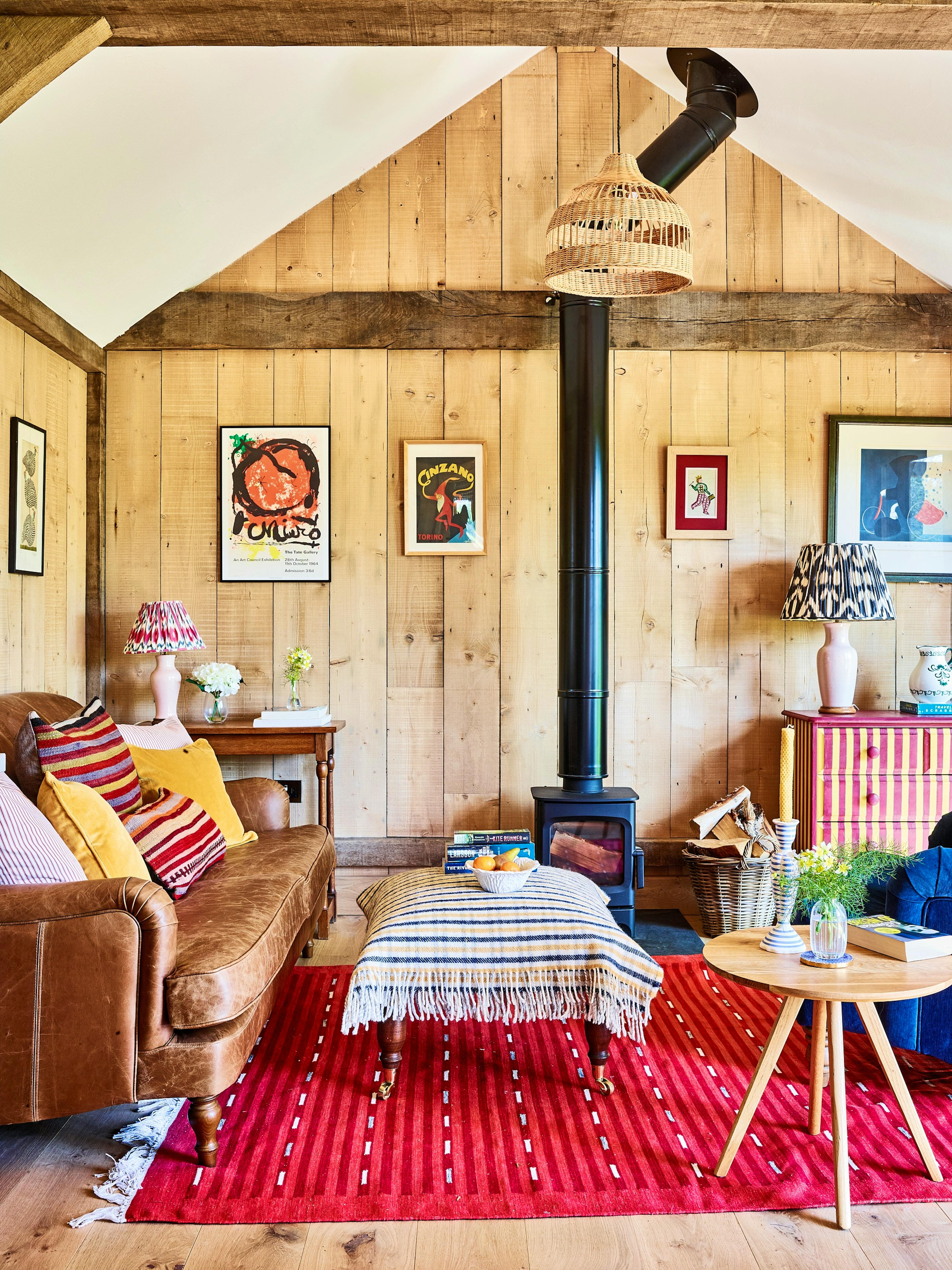 Open-plan living space with woodburning stove, antiques, layered textiles and a thoughtful collection of books and games.