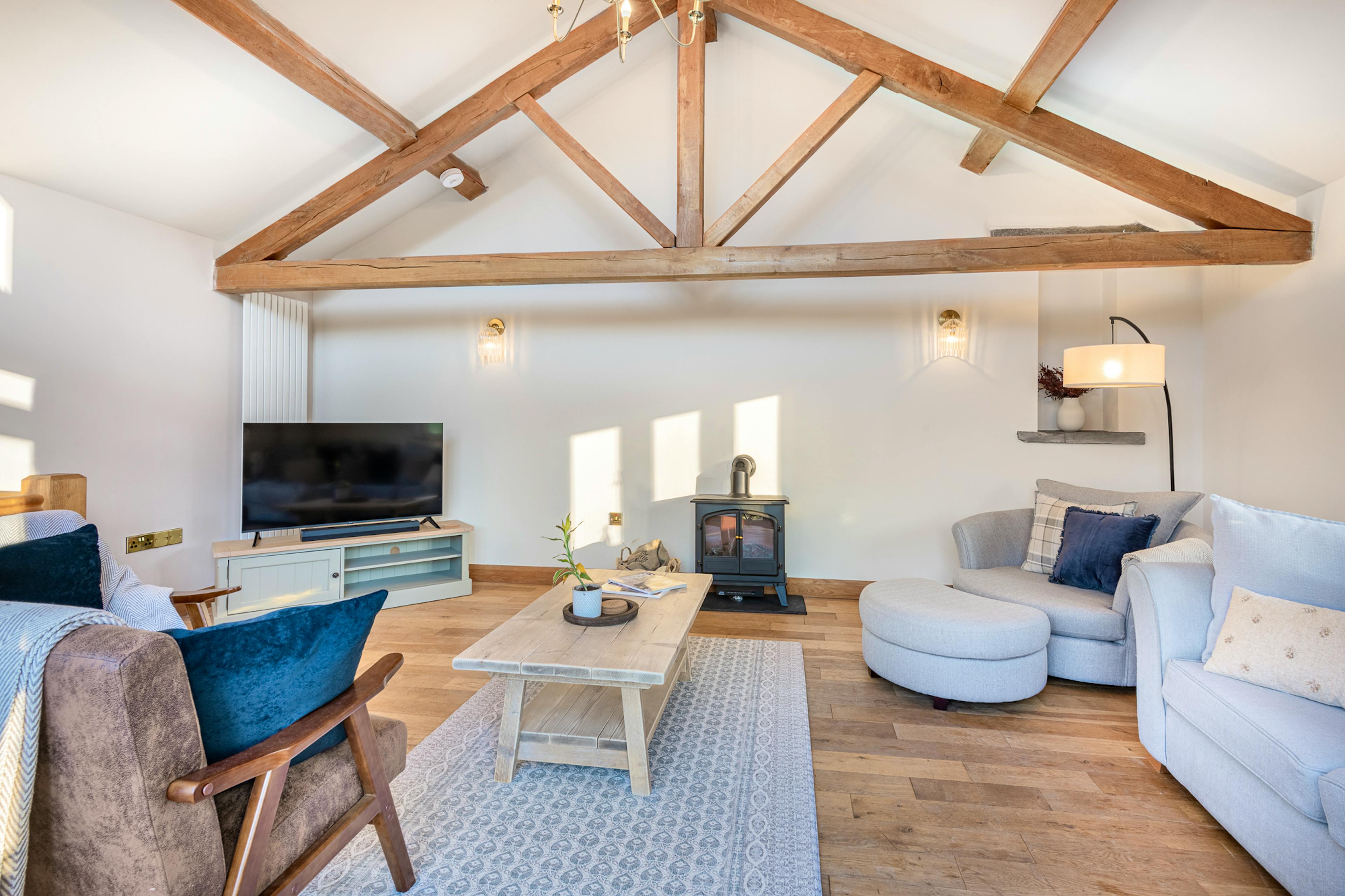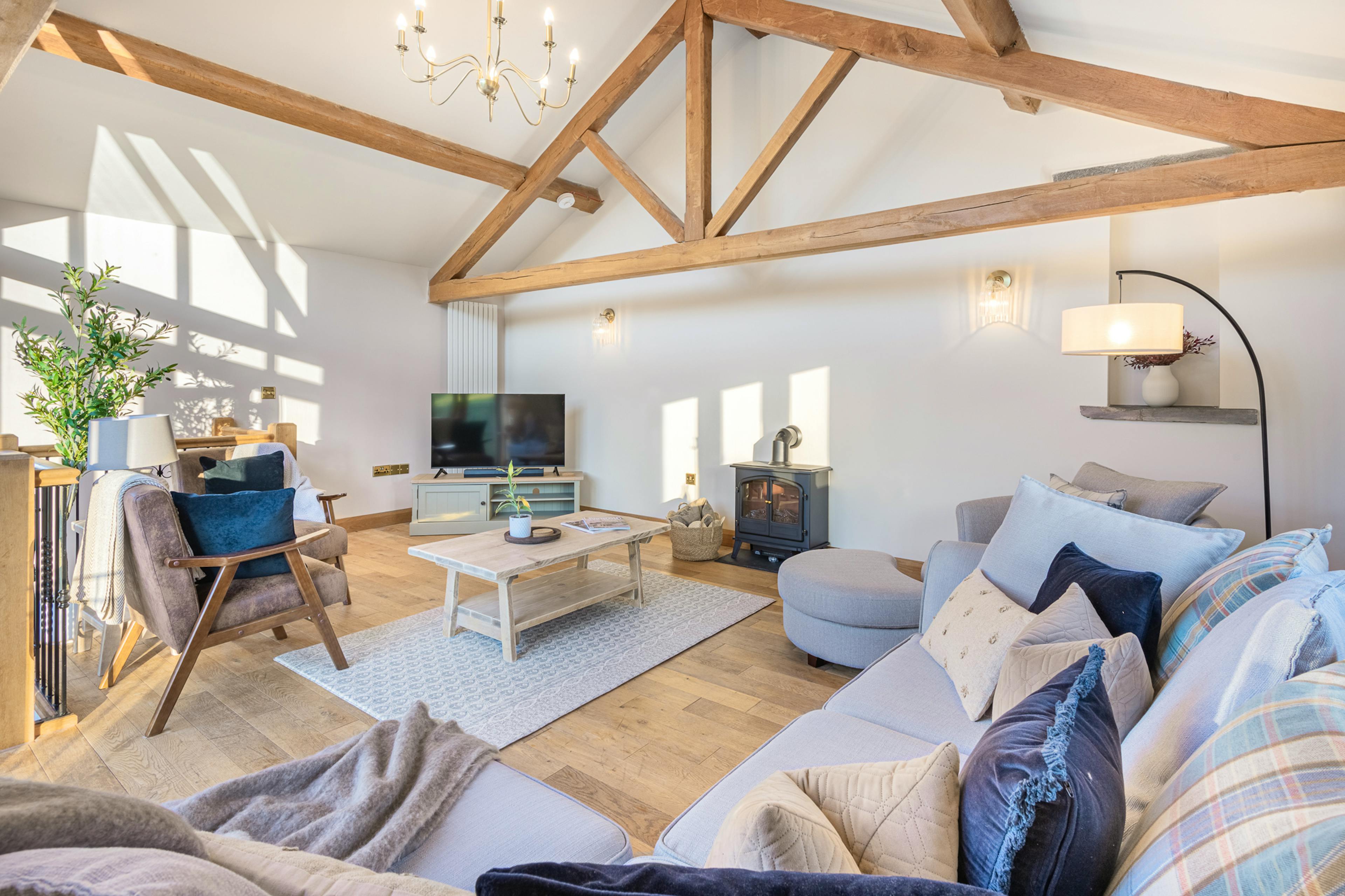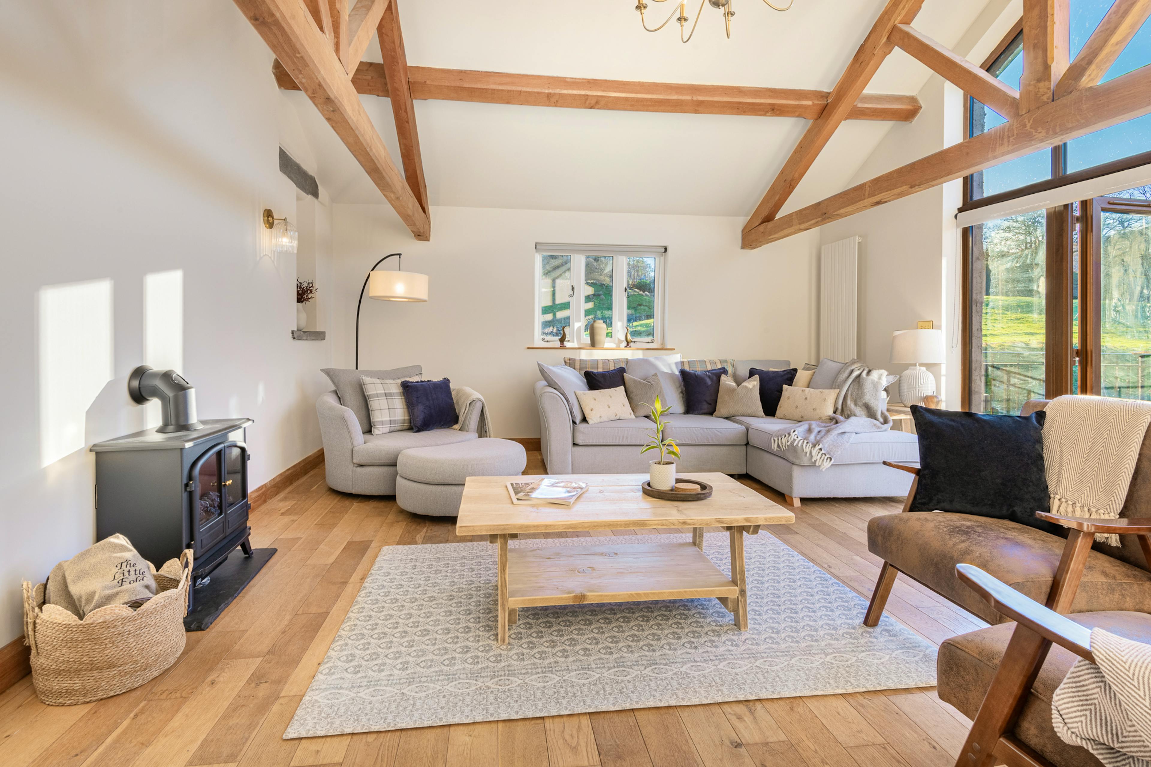 Warm, design-led interiors with open fires, wood-burning stove, natural textures and countryside views from almost every window.