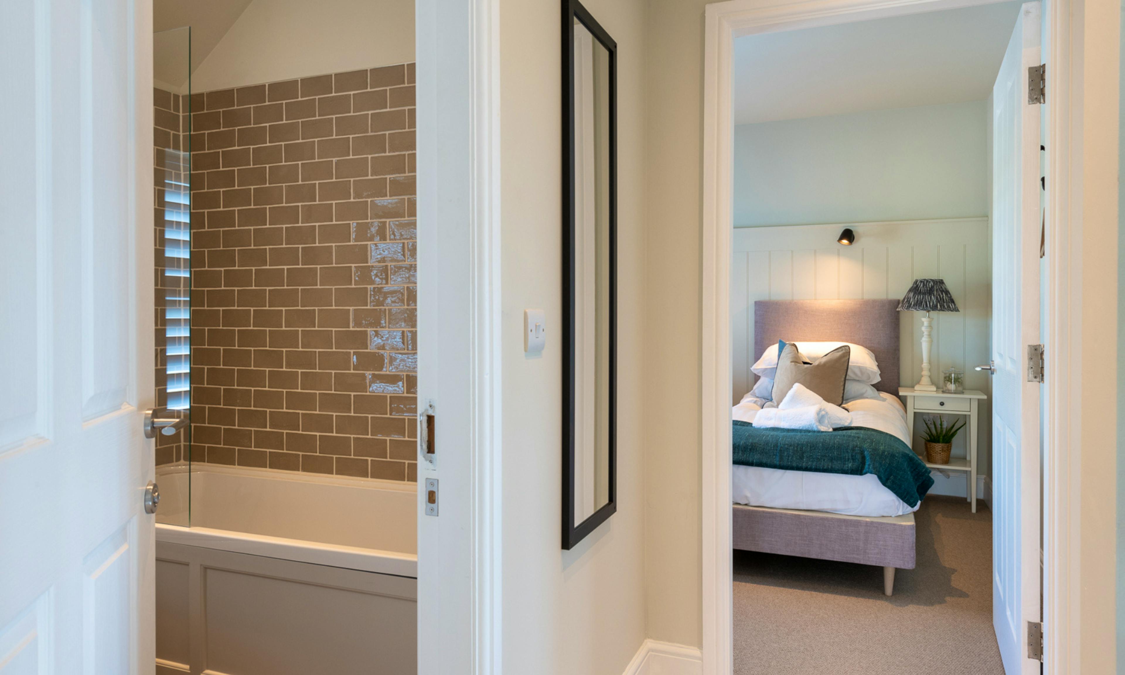 Two family bathrooms - one with a freestanding bath and walk-in shower, the other with a bath and overhead shower - ensure plenty of comfort and convenience for guests.