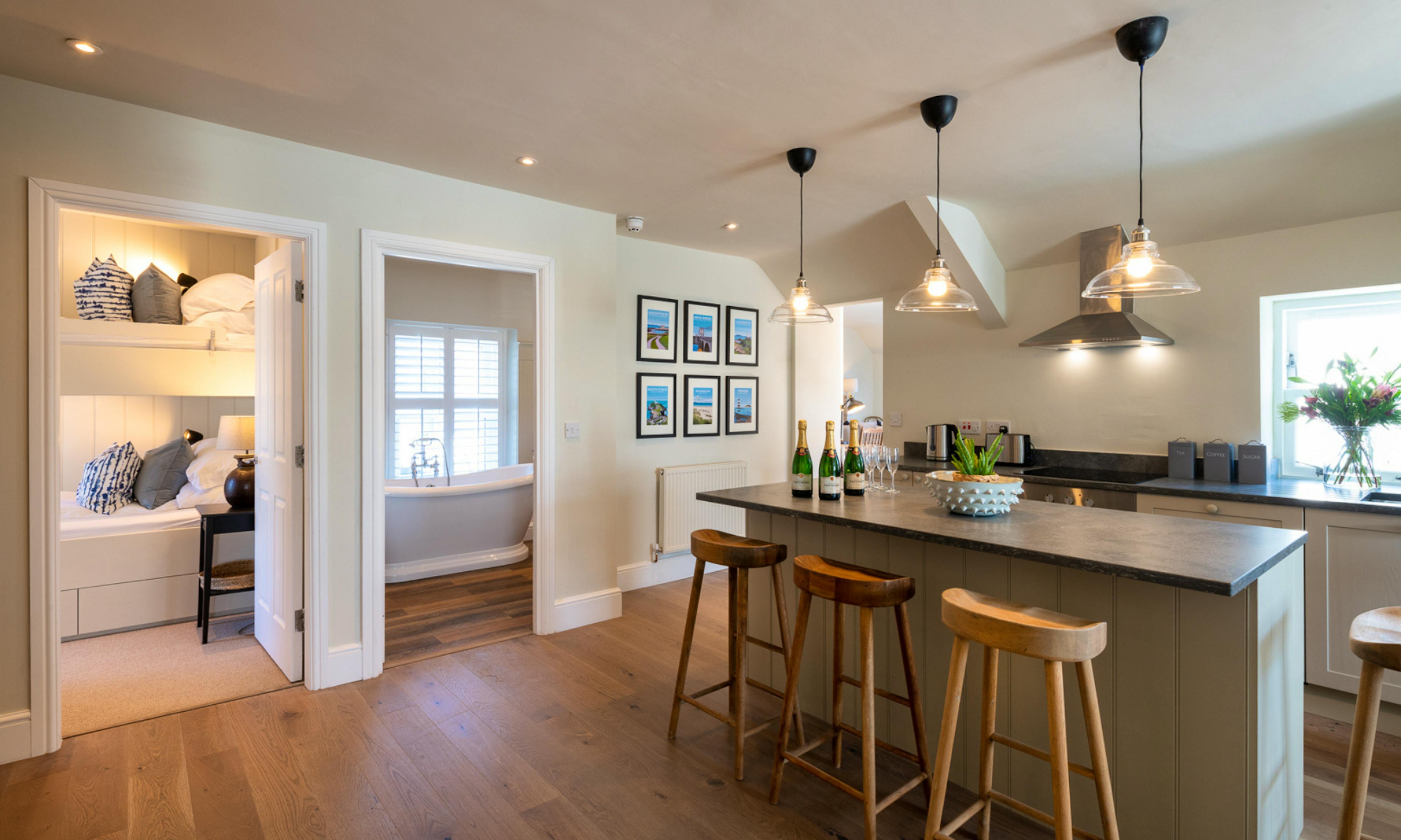 This beautiful, four-bedroom apartment sleeps eight guests and sits above the renowned White Eagle pub in Anglesey. With sweeping sea views, stylish interiors and the coastal path just moments away, this pet-friendly hideaway is ideal for families or groups seeking a laid-back coastal getaway with a touch of luxury. When you step inside, you’ll find a warm and sociable open-plan layout, designed for relaxed coastal living. The well-equipped kitchen is perfect for rustling up hearty breakfasts or delicious evening feasts, with a central island where you can sit with a glass of wine and keep your designated chef company. The dining nook, set in a sunny alcove, comfortably seats eight and is ideal for long, leisurely meals after a day by the sea. After dinner, retire to the cosy living room where you can kick back in style, with two large sofas and a pair of armchairs arranged around a wood burner. Light the fire and curl up on cool evenings, chatting the night away with your nearest and dearest. On warmer days, French doors open to two Juliette balconies that flood the space with light and fresh sea air, while a private roof terrace offers a sheltered spot for morning coffee or sundowners with a view. When eyes grow weary, there are four thoughtfully designed bedrooms to choose from. Off the kitchen-diner, you’ll find a tranquil super-king room and a playful bunk room for kids or extra guests, along with a large family bathroom featuring a freestanding bath and walk-in shower. Two more bedrooms – a flexible twin (which can be made into a super-king on request) and another elegant super-king with sea views – are tucked off the living area, served by a second family bathroom with a shower-over-bath. You’ll also be pleased to know that the apartment sits above one of the island’s favourite pubs. Be sure to head downstairs during your stay and enjoy high-quality pub food and a lovely selection of real ales. You’re welcome to dine in the pub, or bring meals upstairs to enjoy in the comfort of your apartment. Perched on the southern tip of Holy Island, Rhoscolyn is a peaceful village with dramatic sea views and moorland scenery. Its golden Borth Wen Beach is perfect for paddling, rock pooling and relaxing, while nearby coves invite kayaking, snorkeling and fishing. The Anglesey Coastal Path offers stunning walks past natural arches like Bwa Du and Bwa Gwyn, with chances to spot seabirds and seals along the way. With views across the Irish Sea to the Lleyn Peninsula and a name linked to ancient standing stones, Rhoscolyn blends coastal adventure with rich history and tranquil charm.