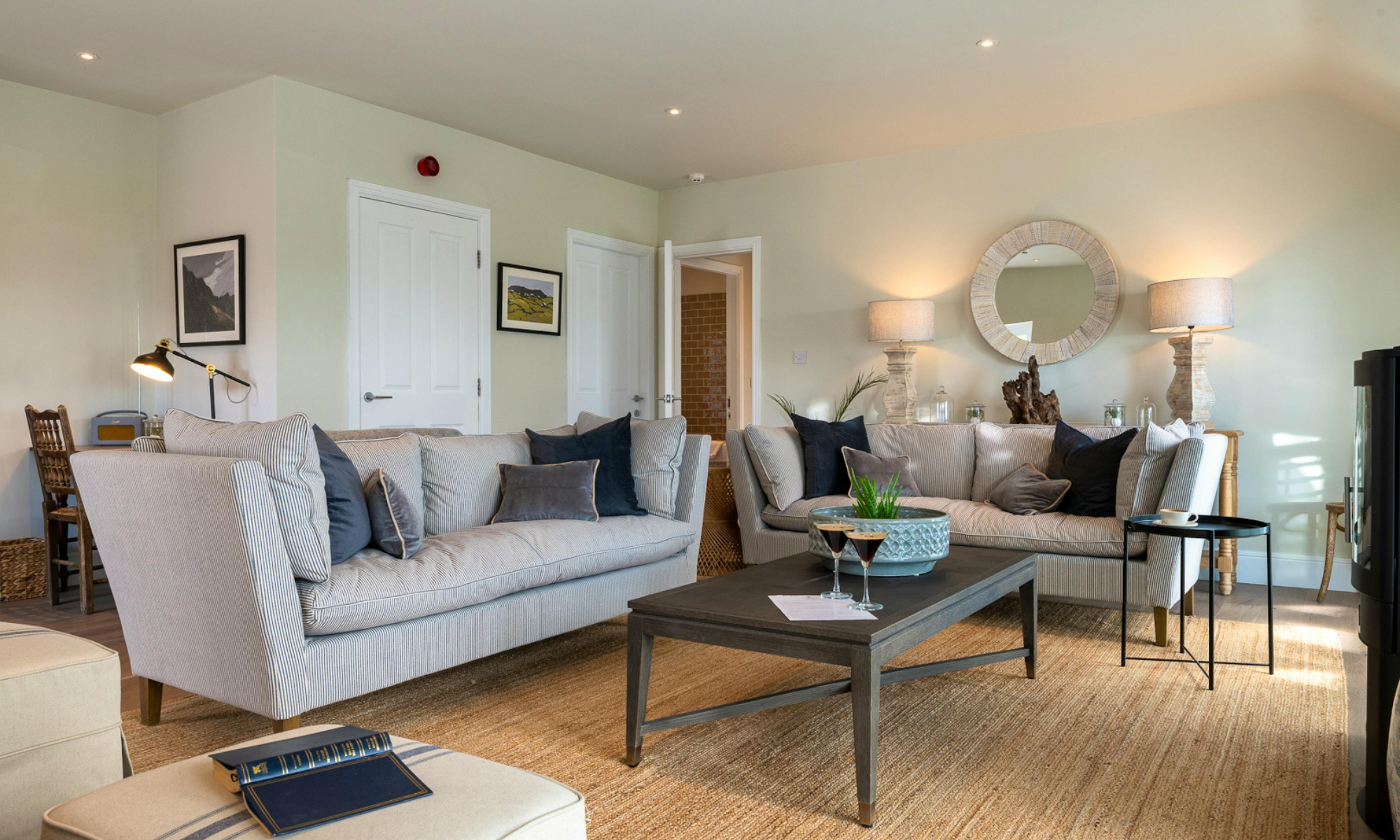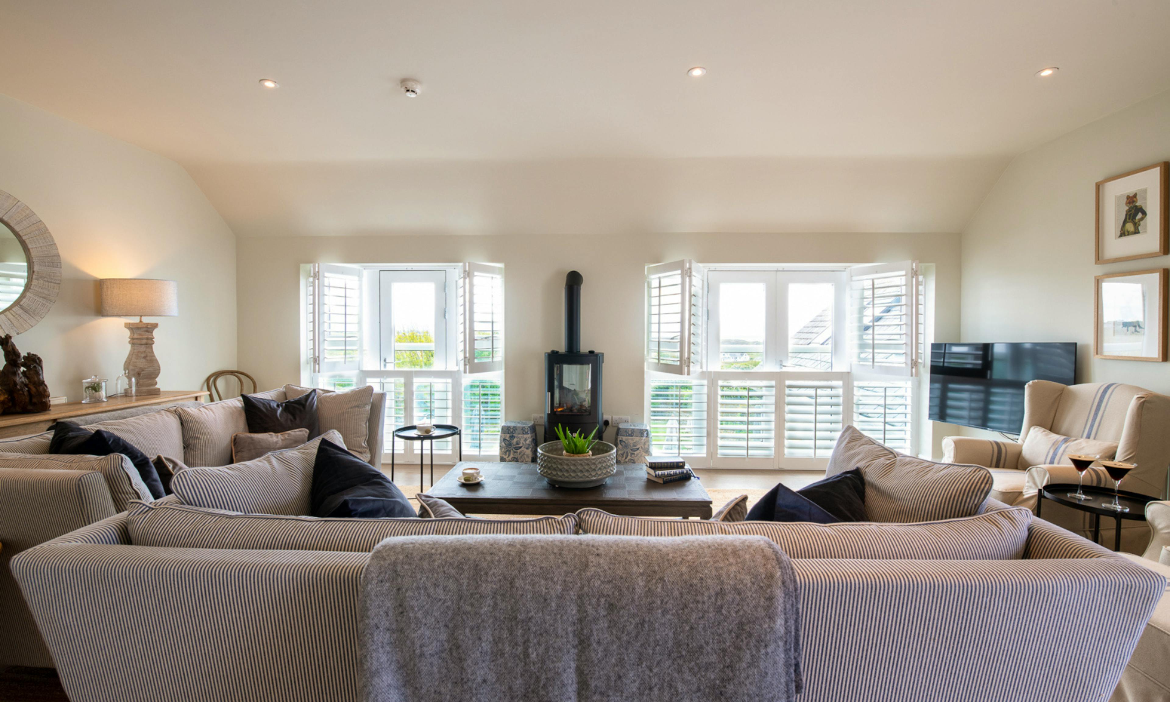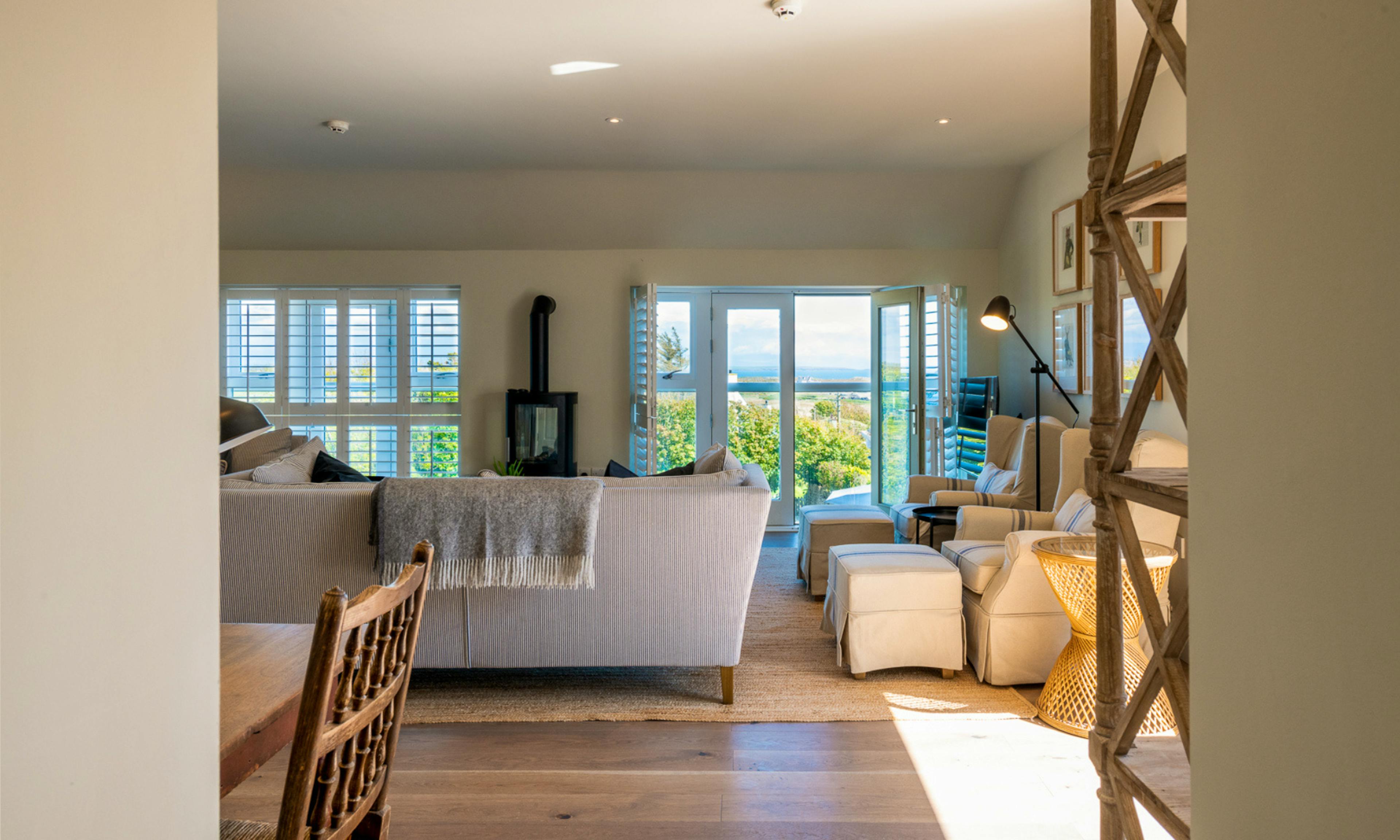 The cosy living room includes two large sofas, armchairs and a wood burner - perfect for chilled evenings - while Juliette balconies and a private roof terrace invite in sea breezes and spectacular views.