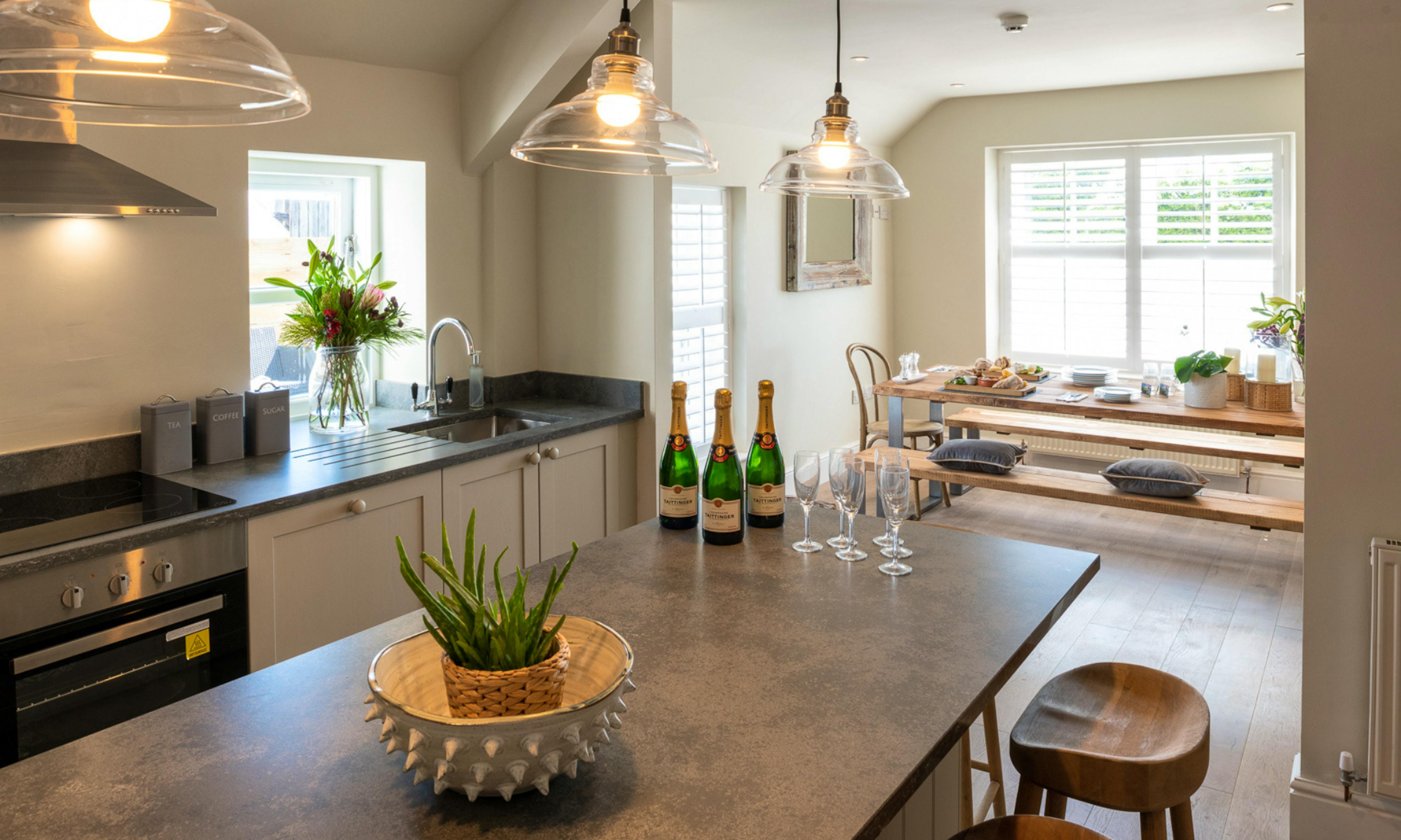 The open-plan layout features a well-equipped kitchen with a central island, a sunny dining nook that seats eight and plenty of space for relaxed, sociable cooking and dining.