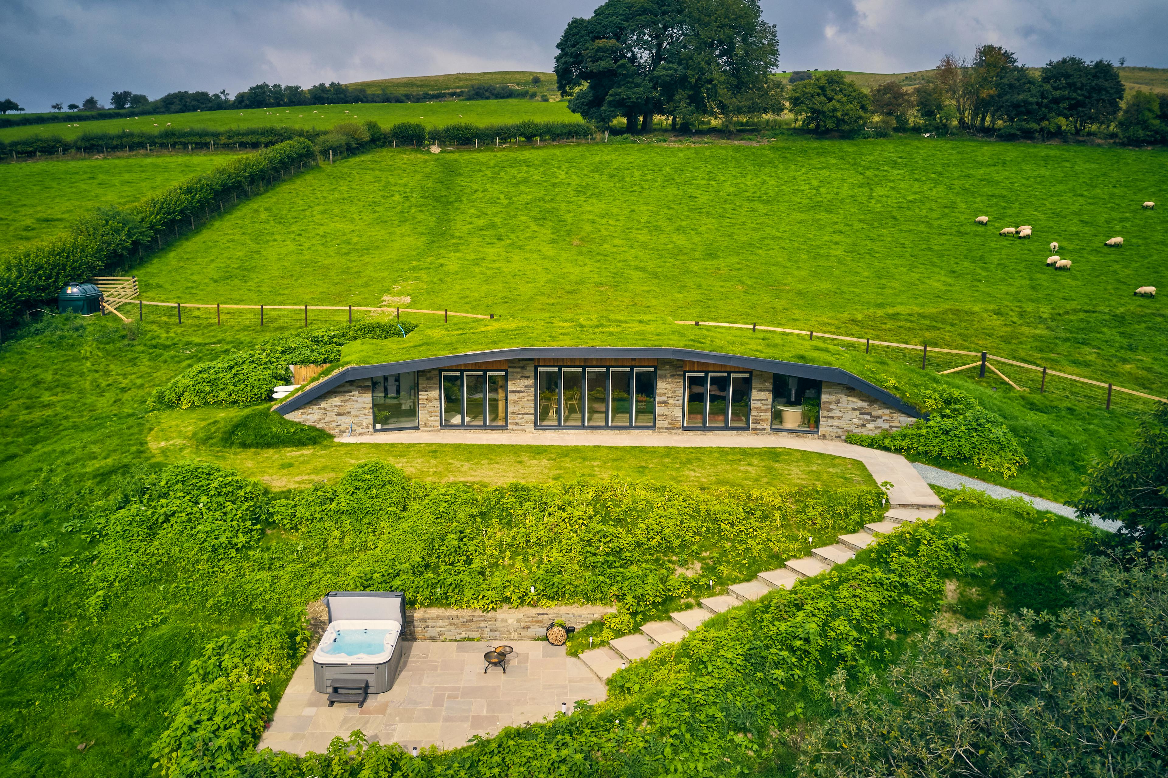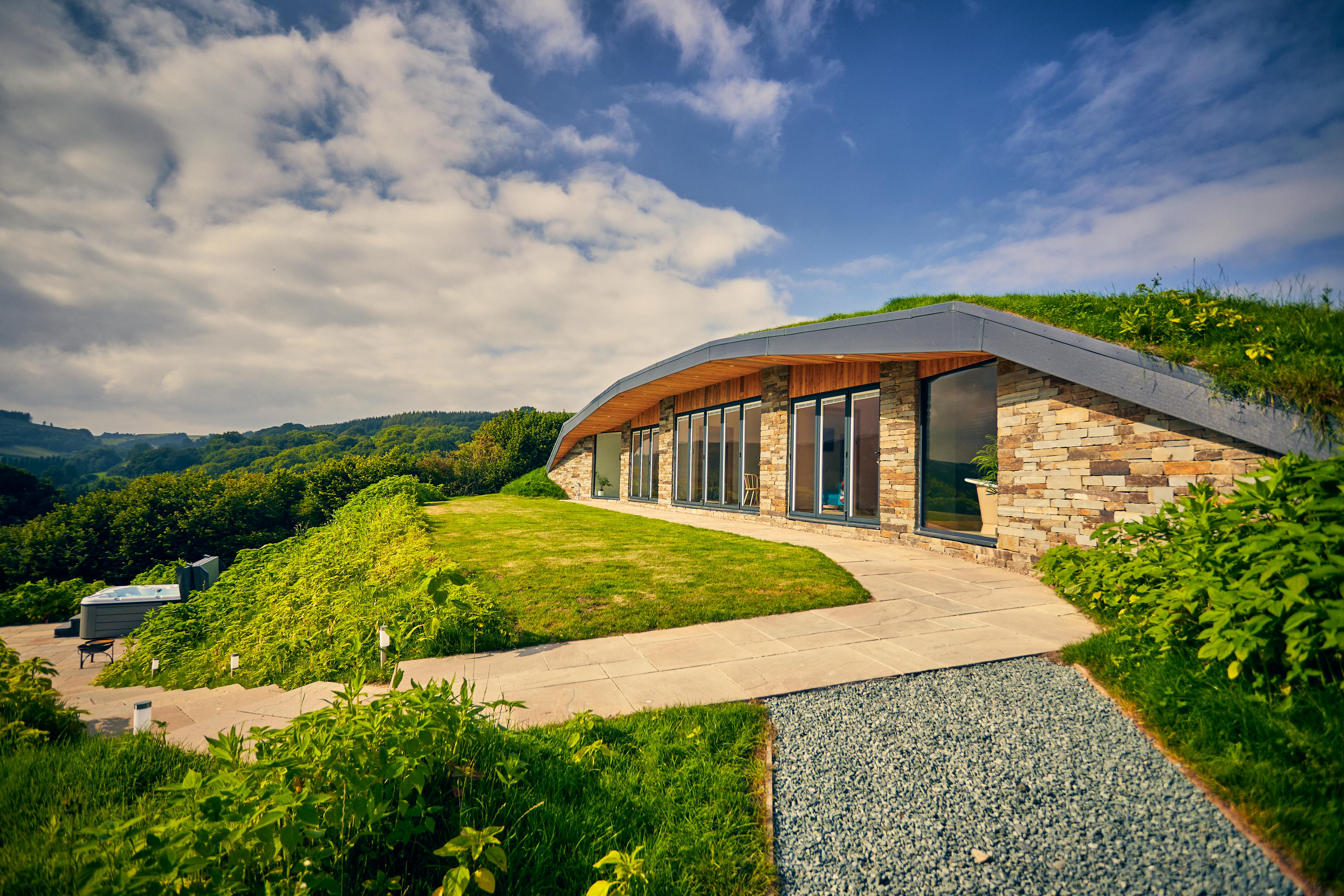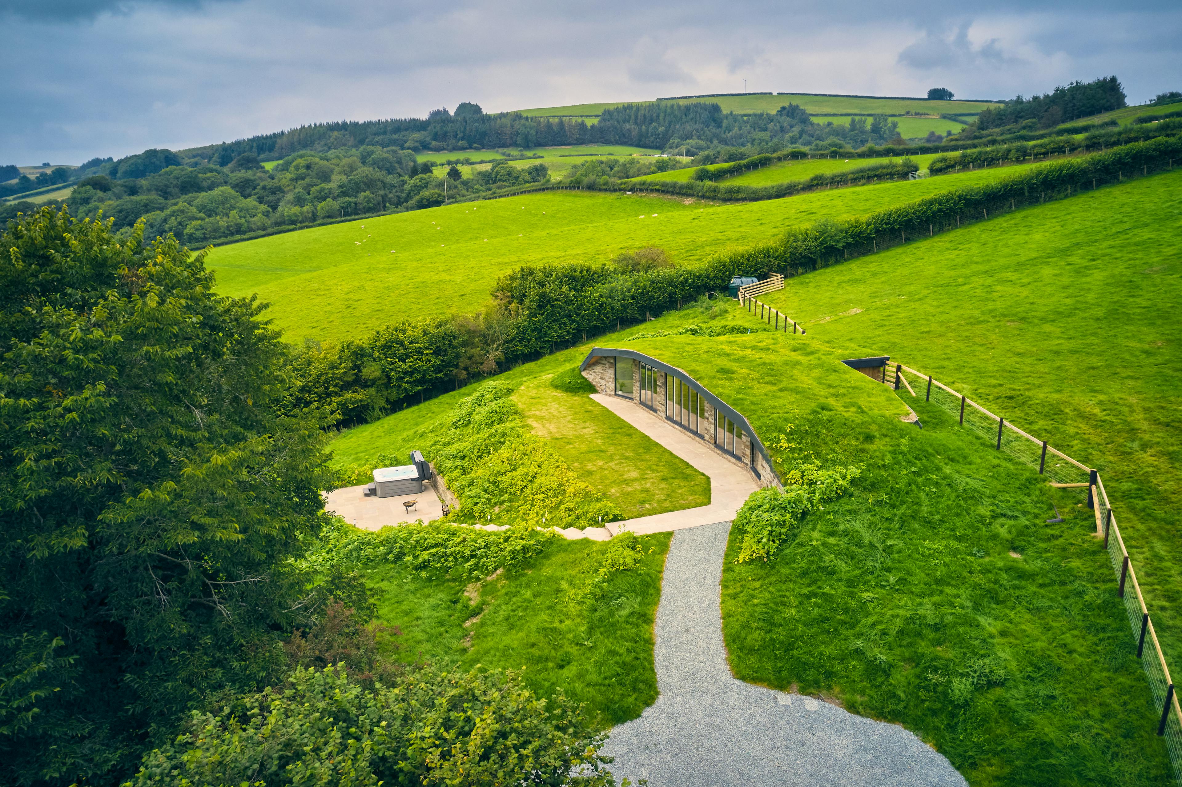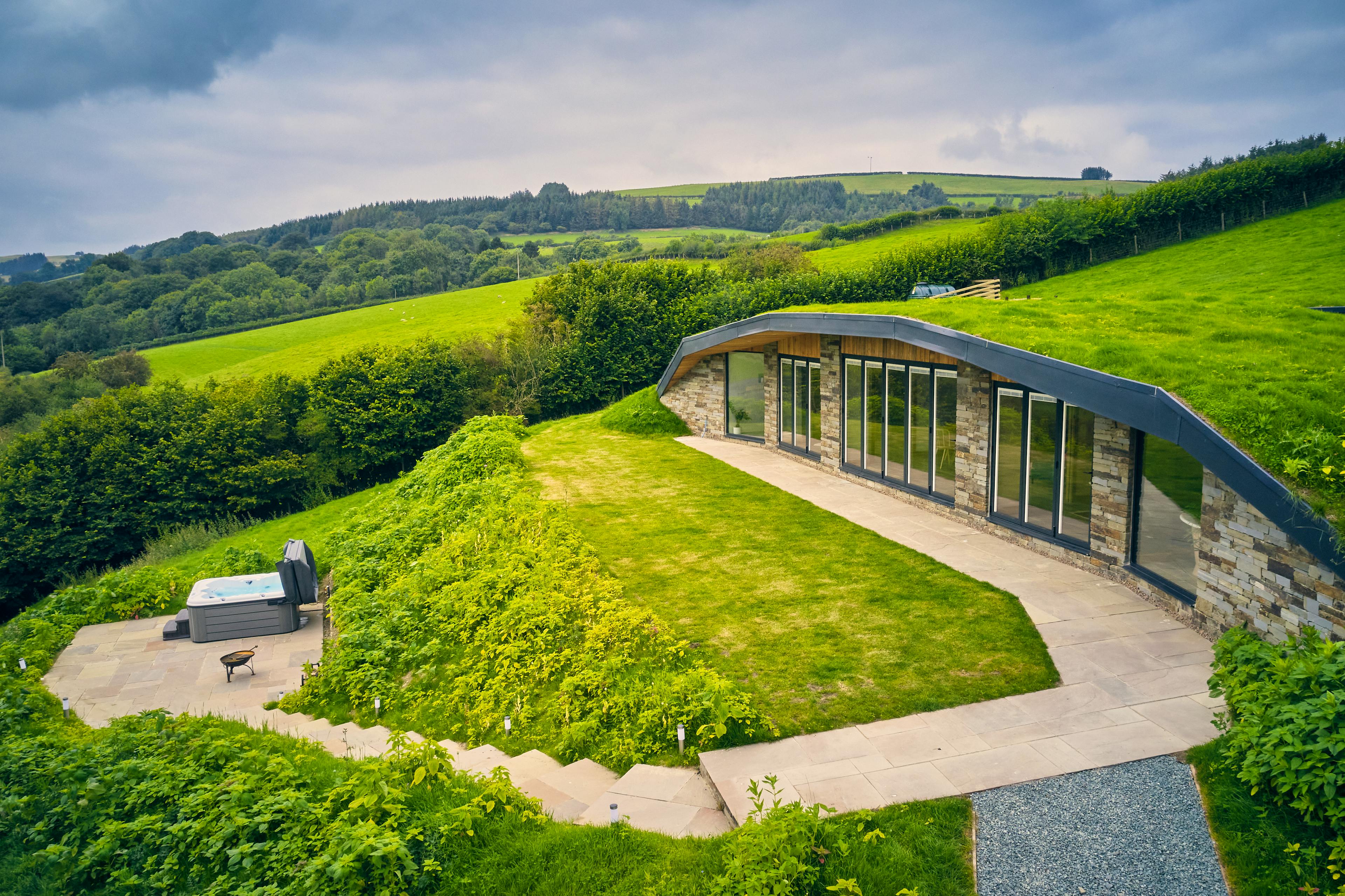 Unique house with turfed roof nestled into a hillside in Powys featuring a hot tub and spectacular views, perfect for a quiet countryside escape.
