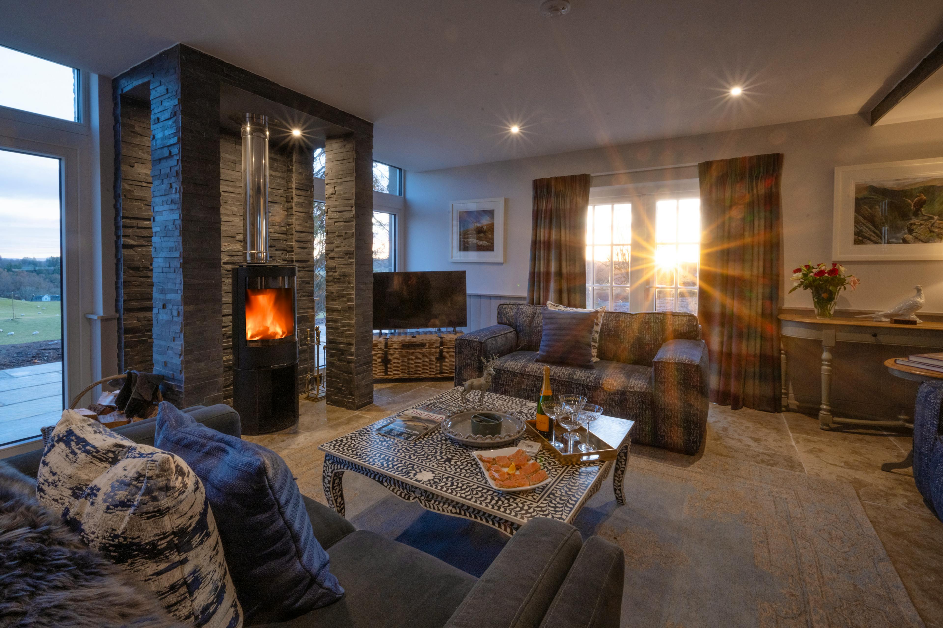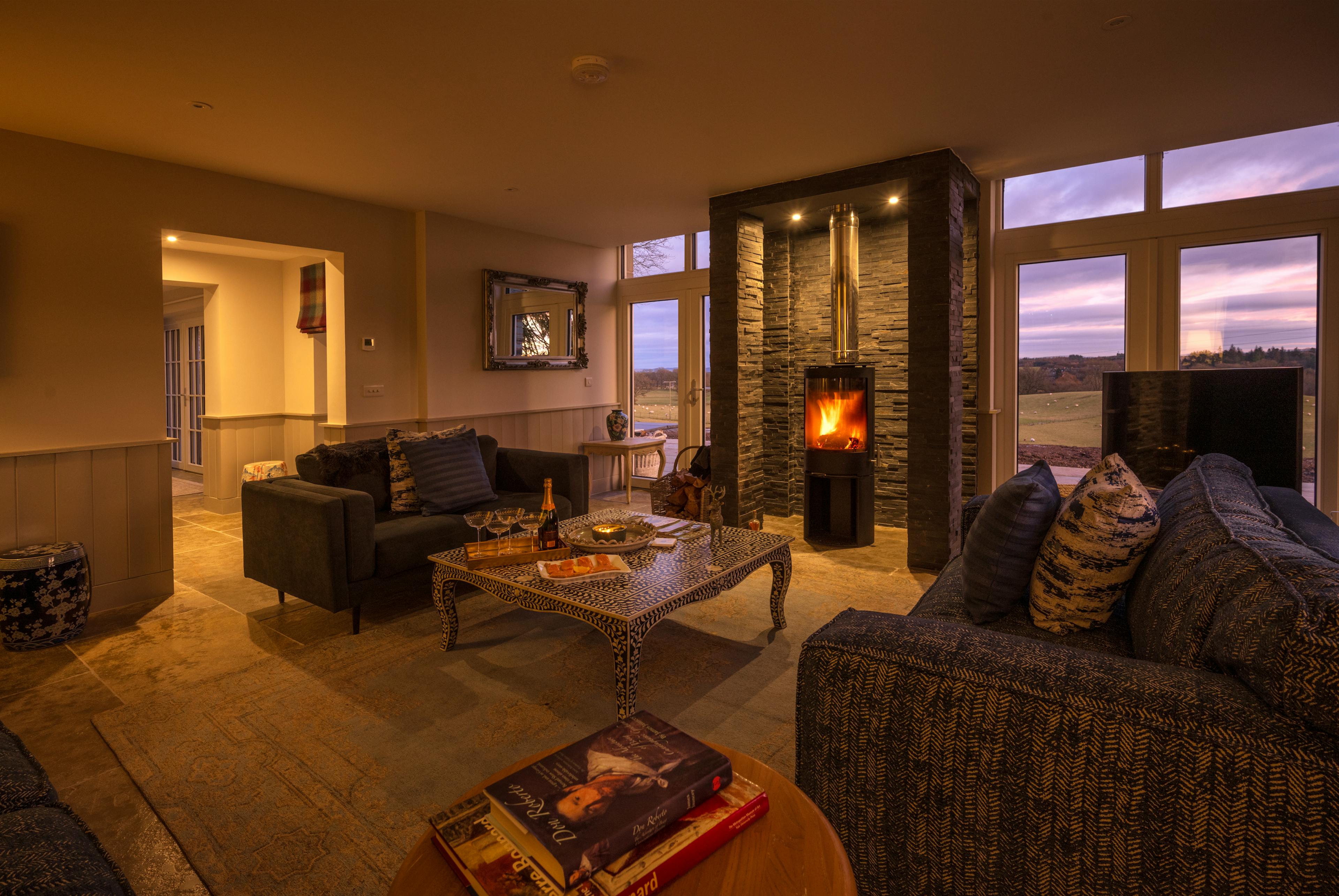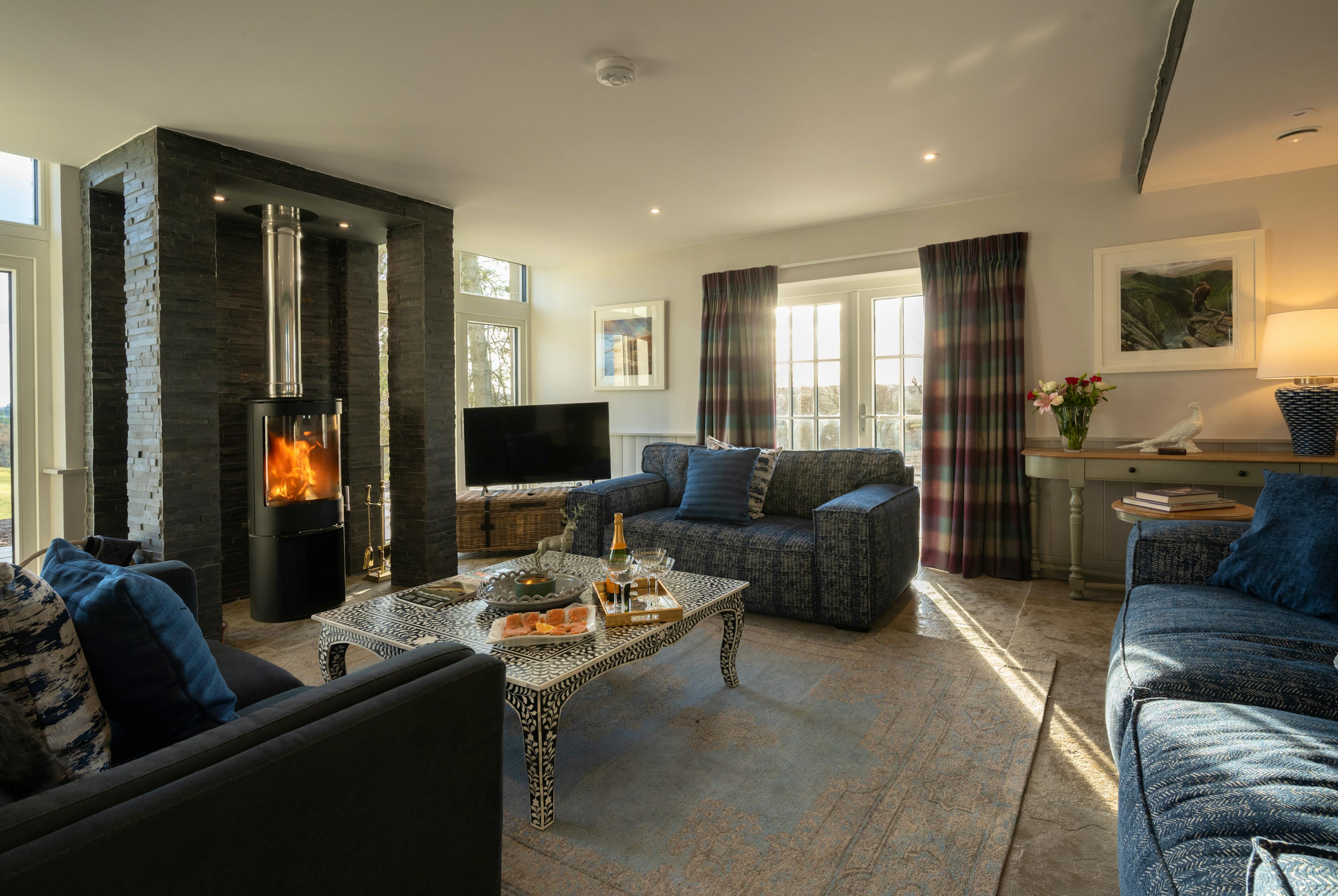 The spacious, light-filled living room is the heart of the home, with three deep sofas, stunning estate views and a woodburner framed by a slate fireplace.