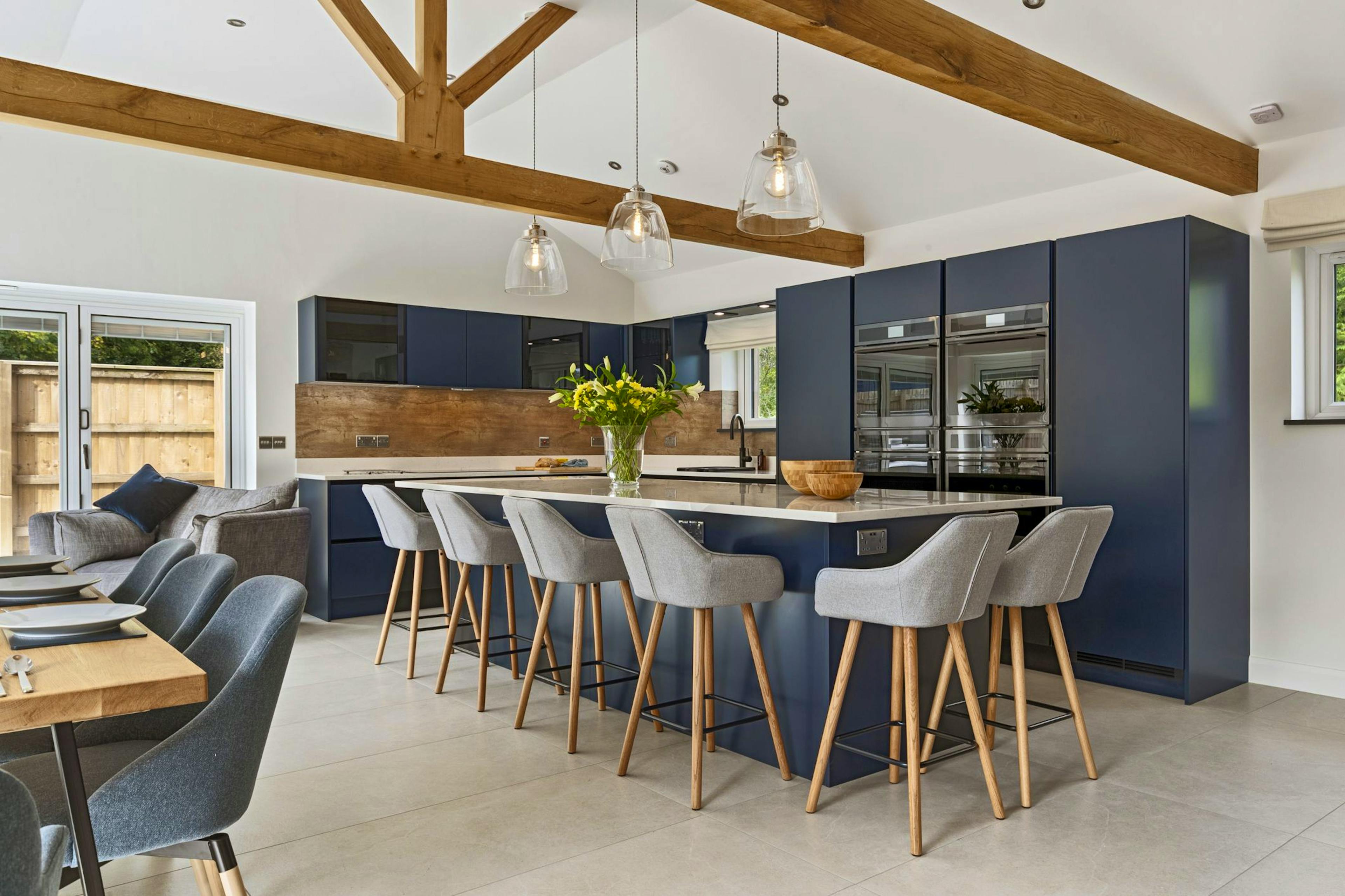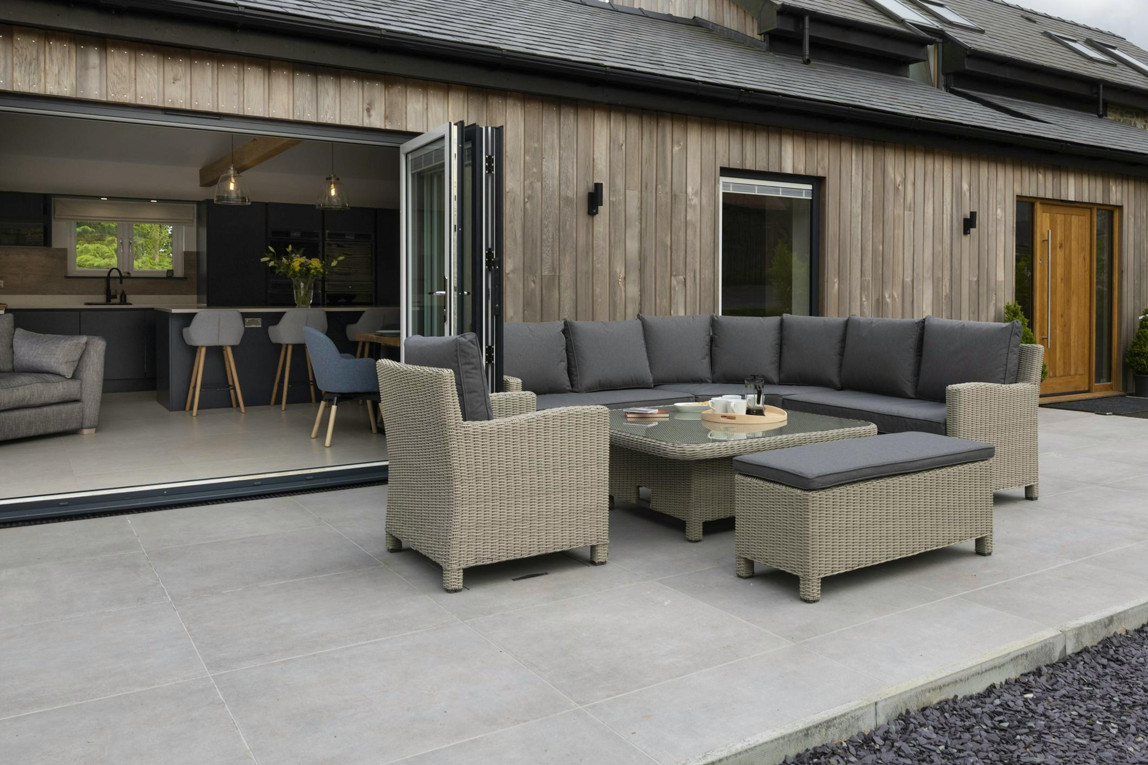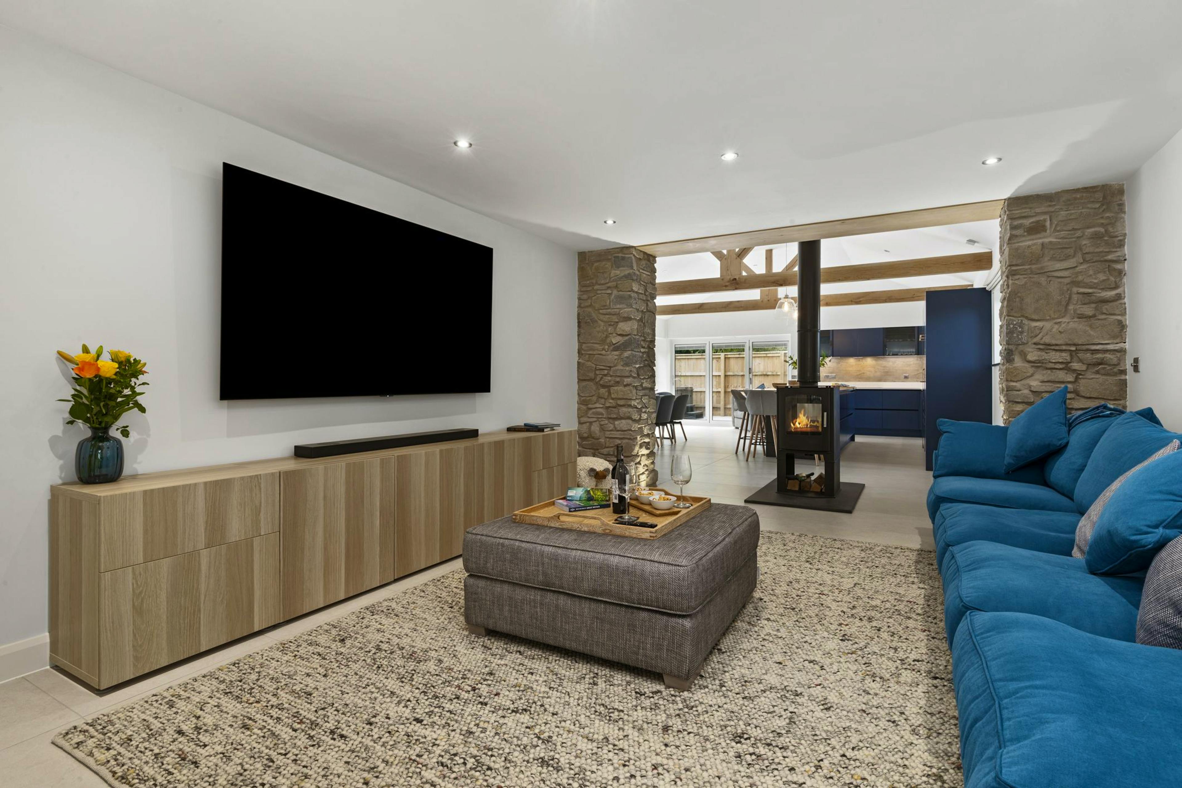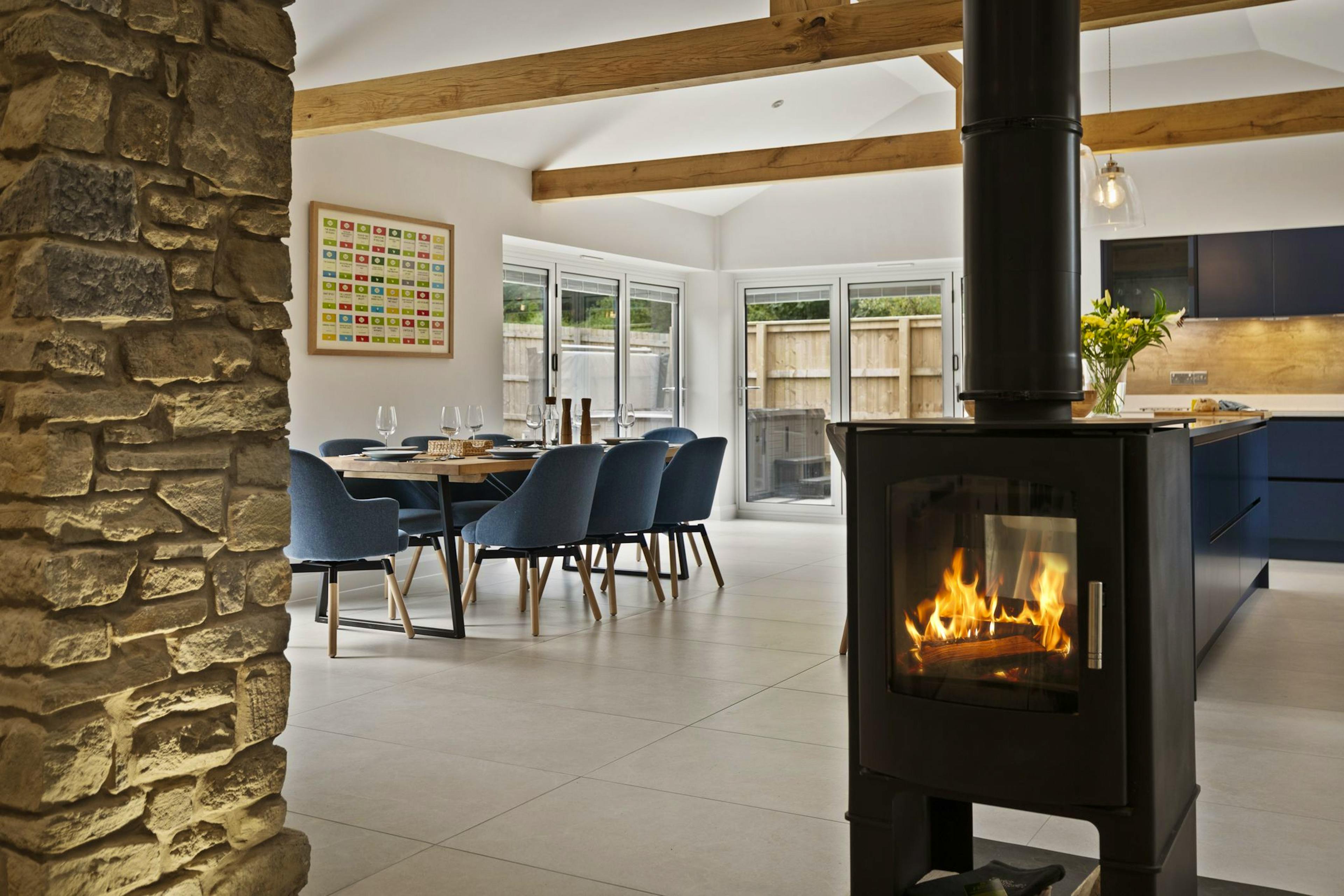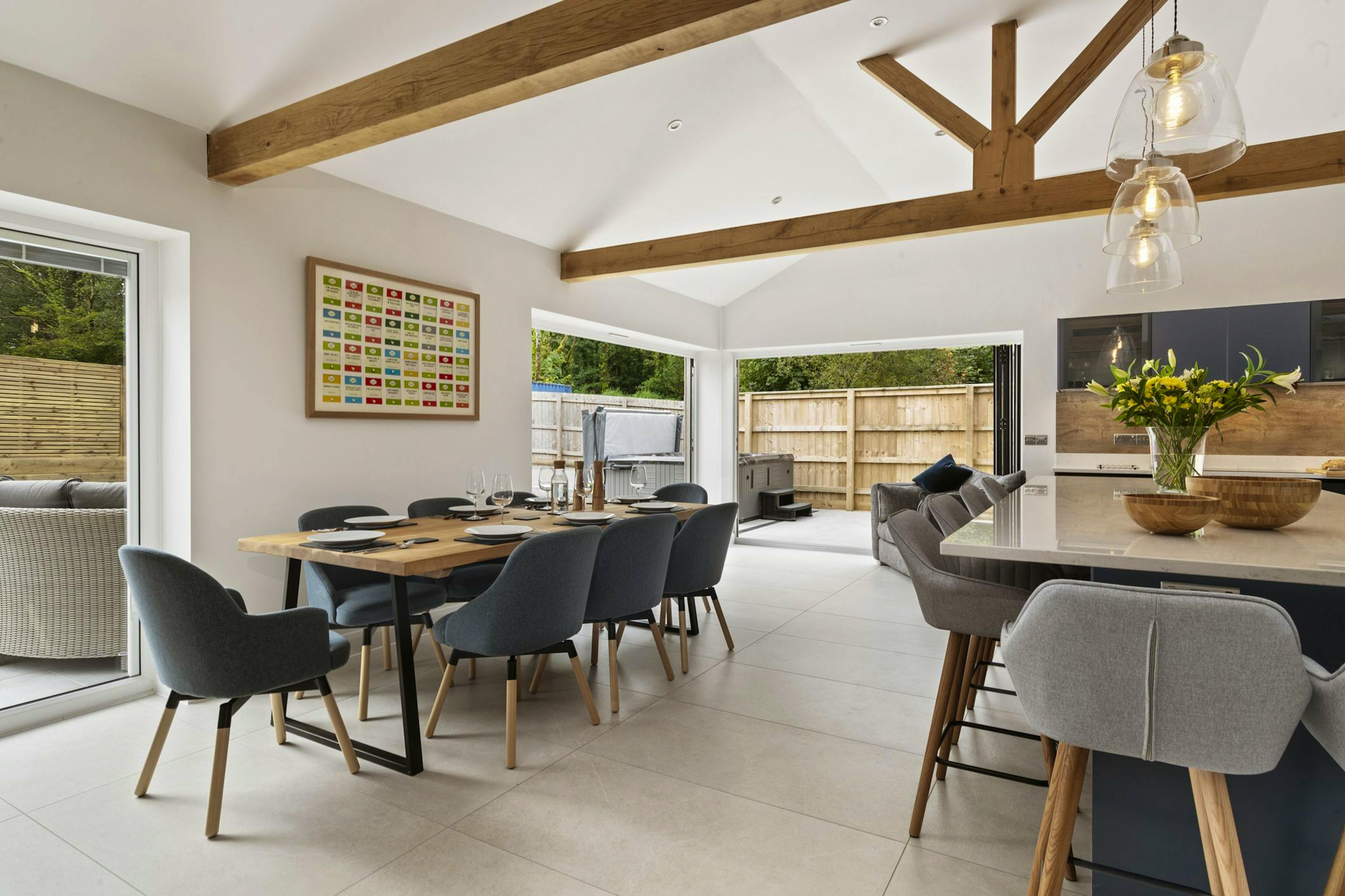 Enjoy grand social dinners at the large dining table, which opens to a private patio through bi-folding doors, leading to a relaxing hot tub for memorable evenings.