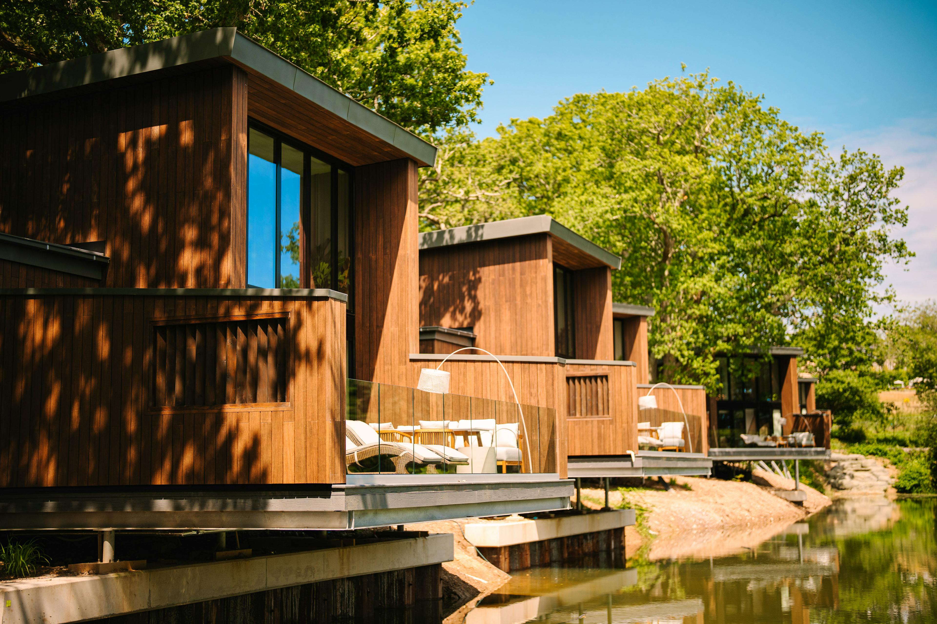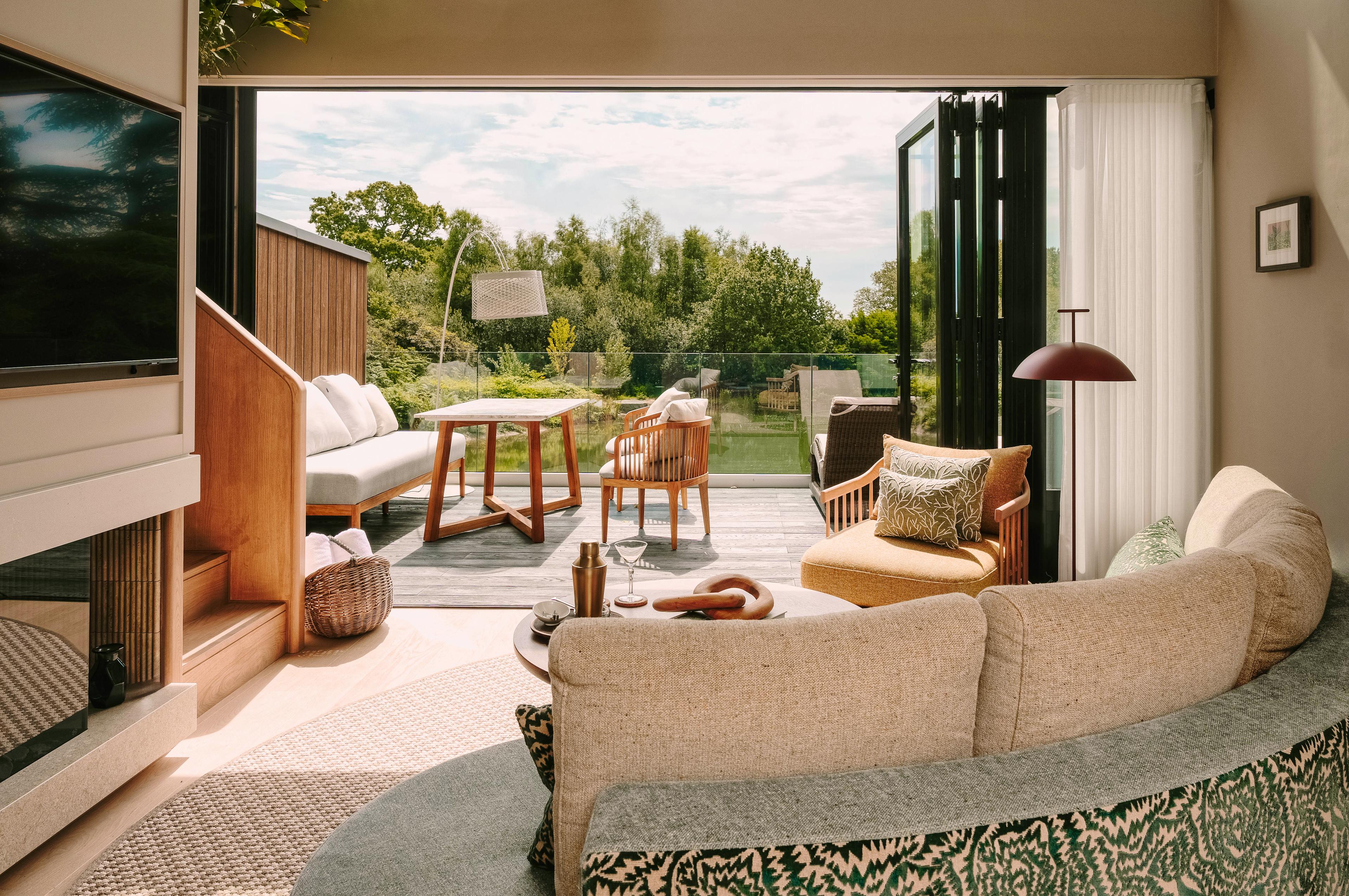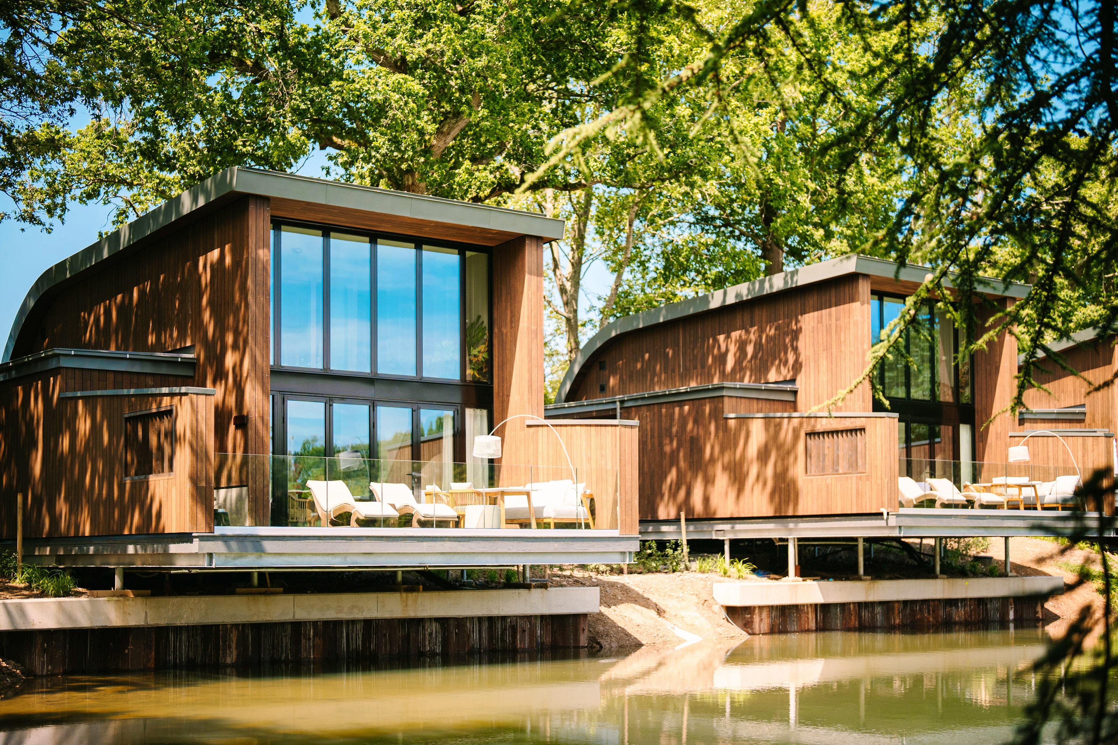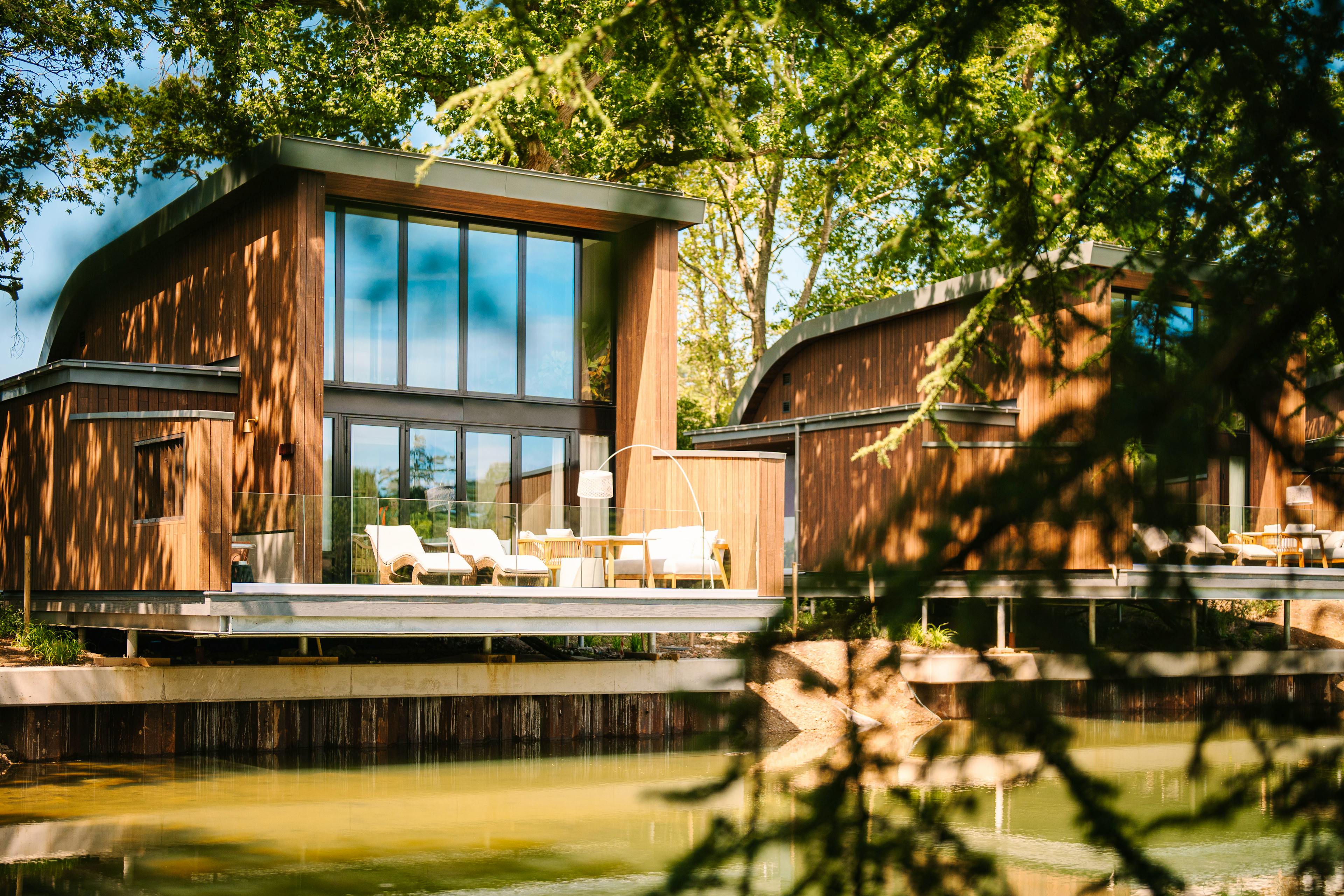 A collection of luxurious, modern lodges on the edge of a lake in West Sussex with outdoor bath tubs, infra red saunas, modern amenities and amazing views.