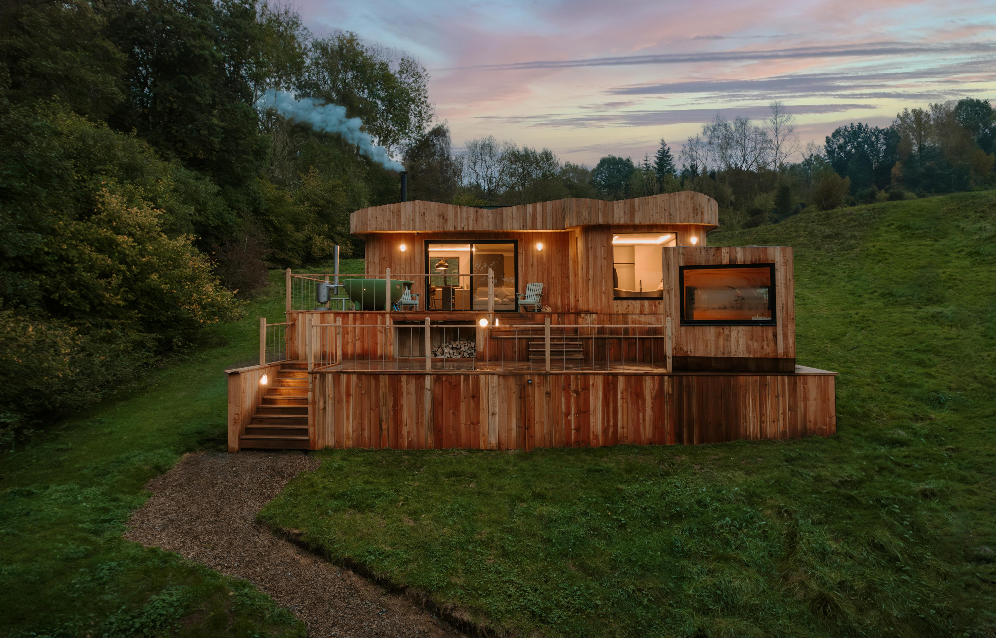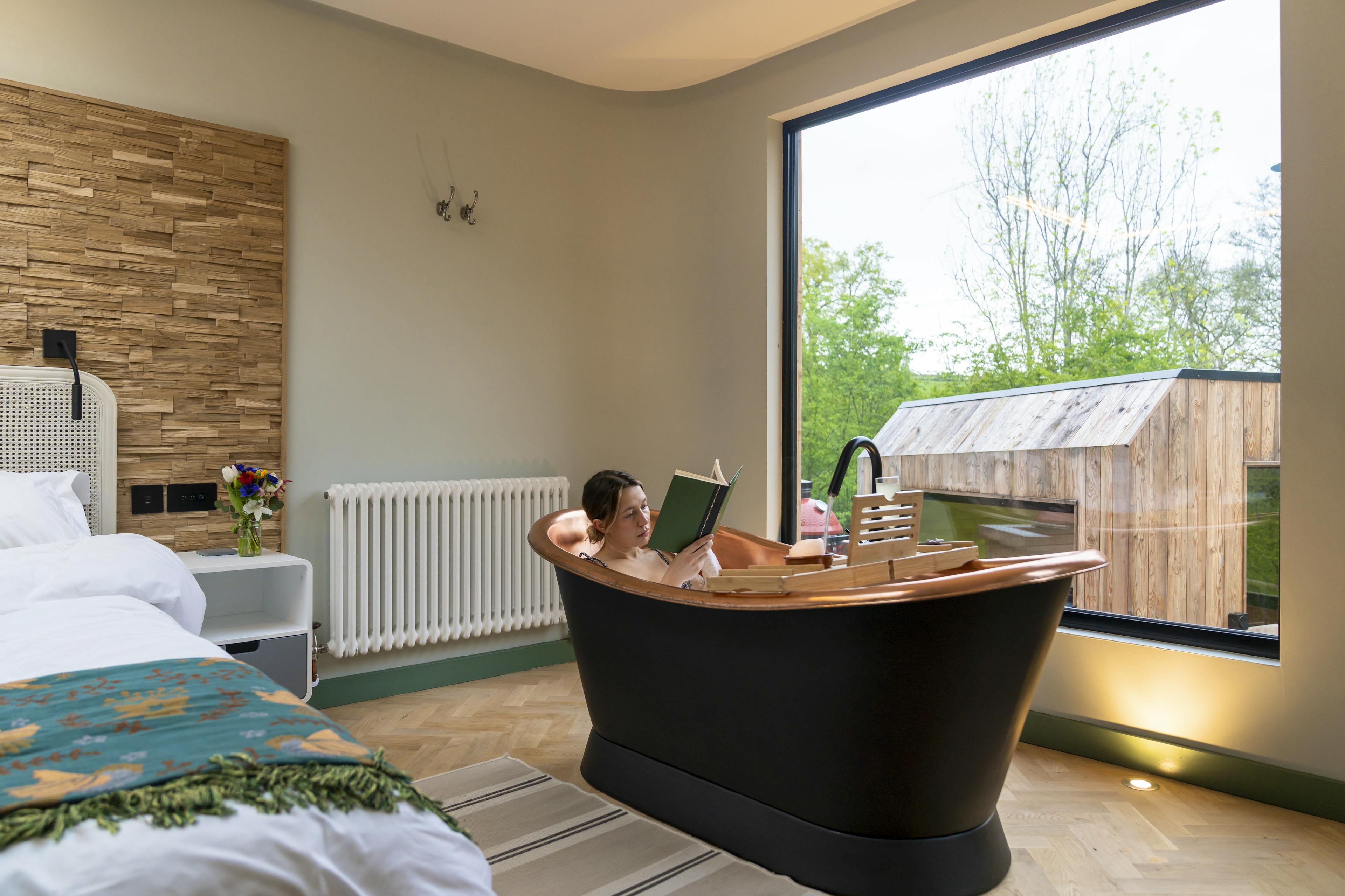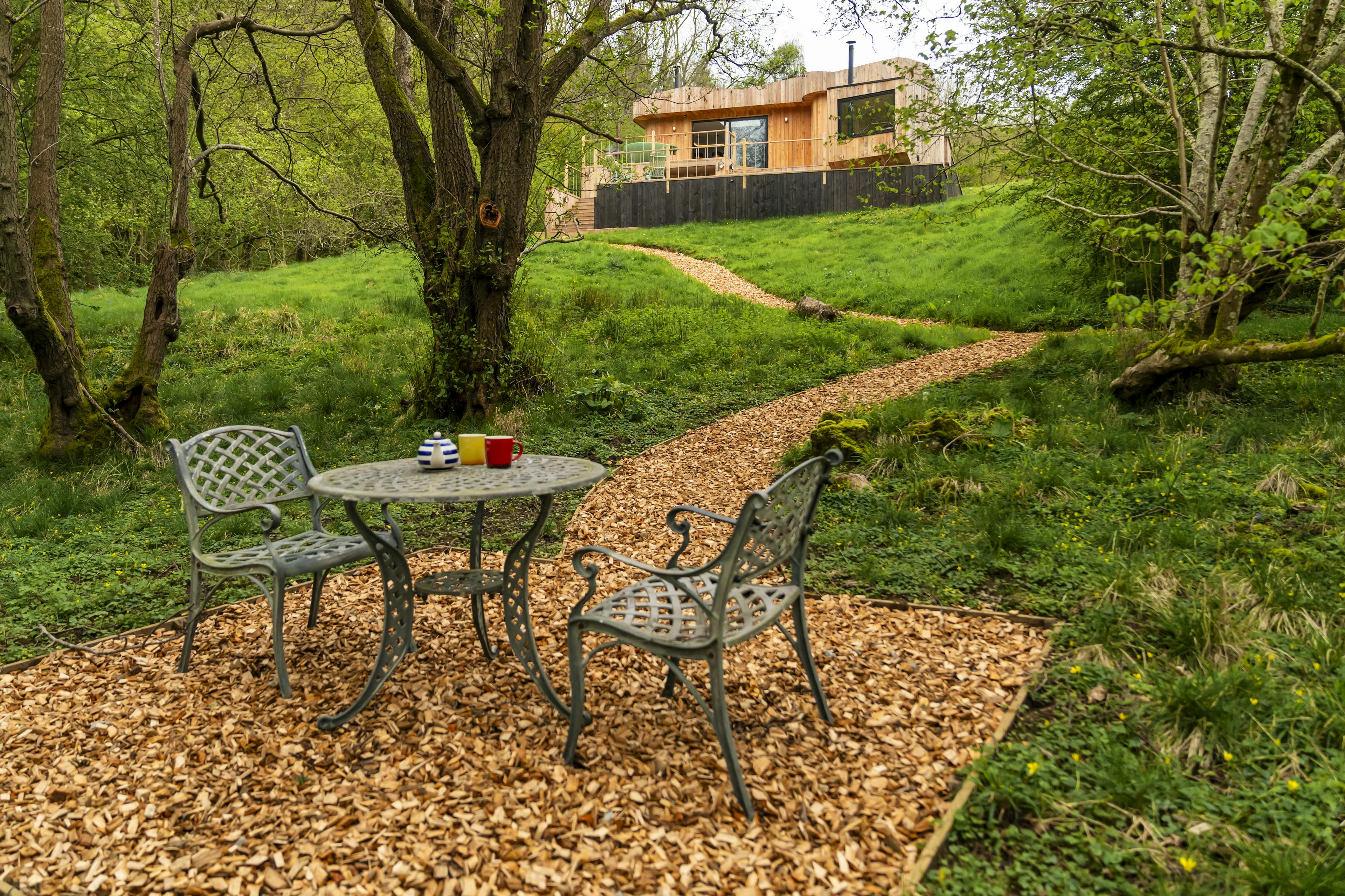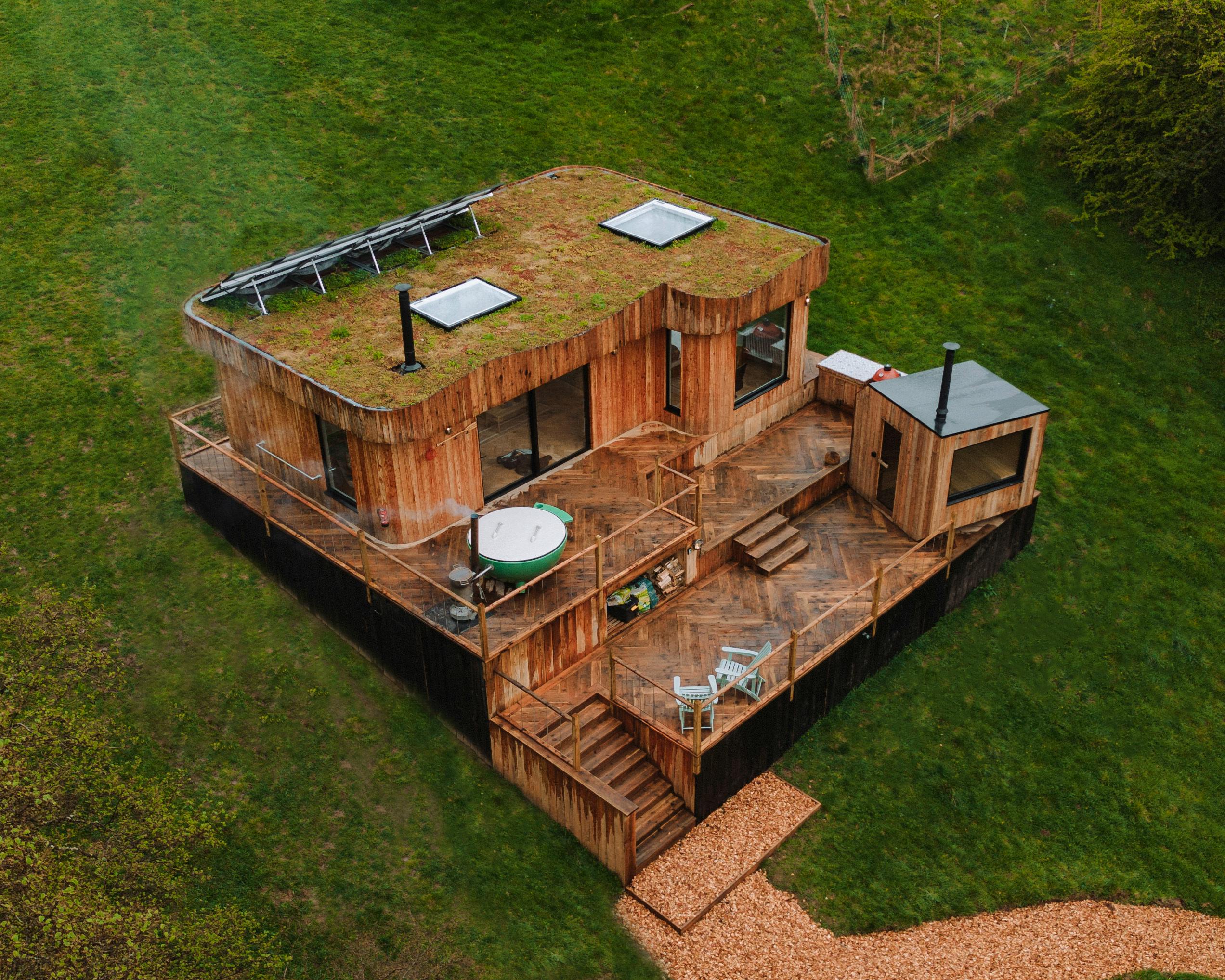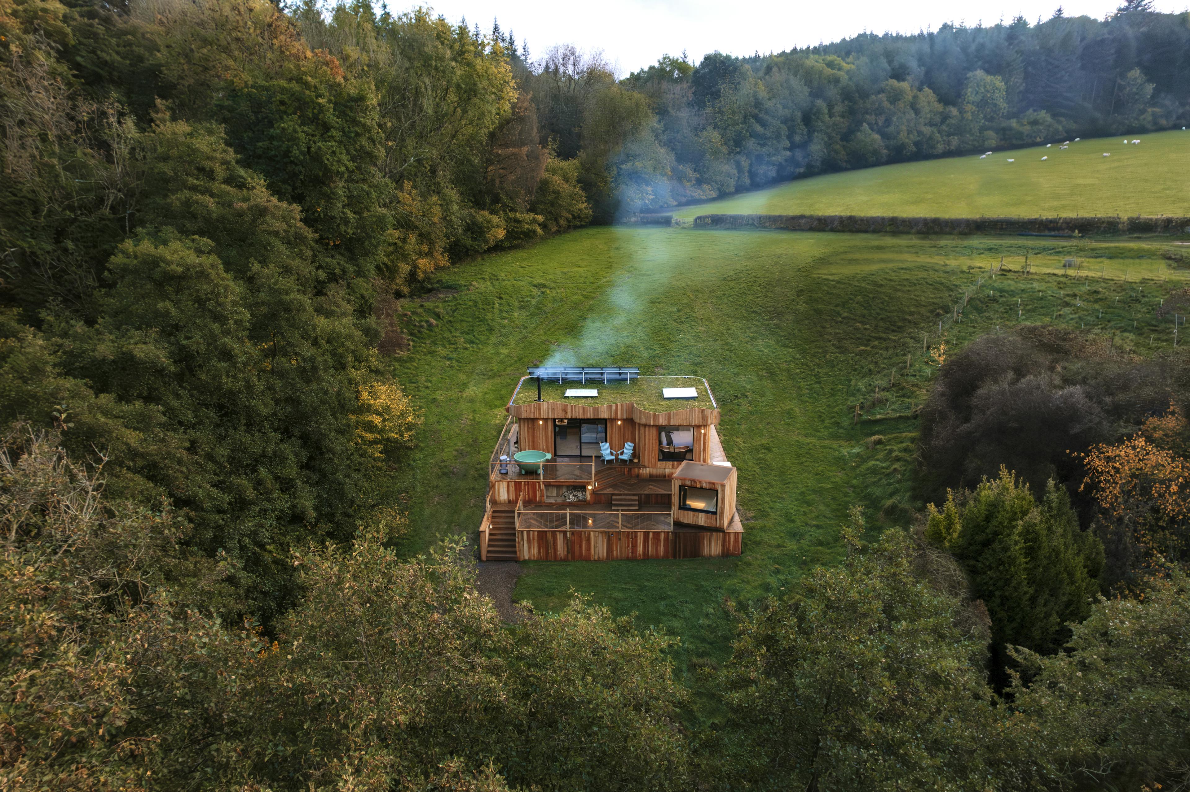 Wonderful, modern, off-grid cabin in the peaceful Herefordshire countryside with hot tub, free-standing bath tub, sauna and incredible views.