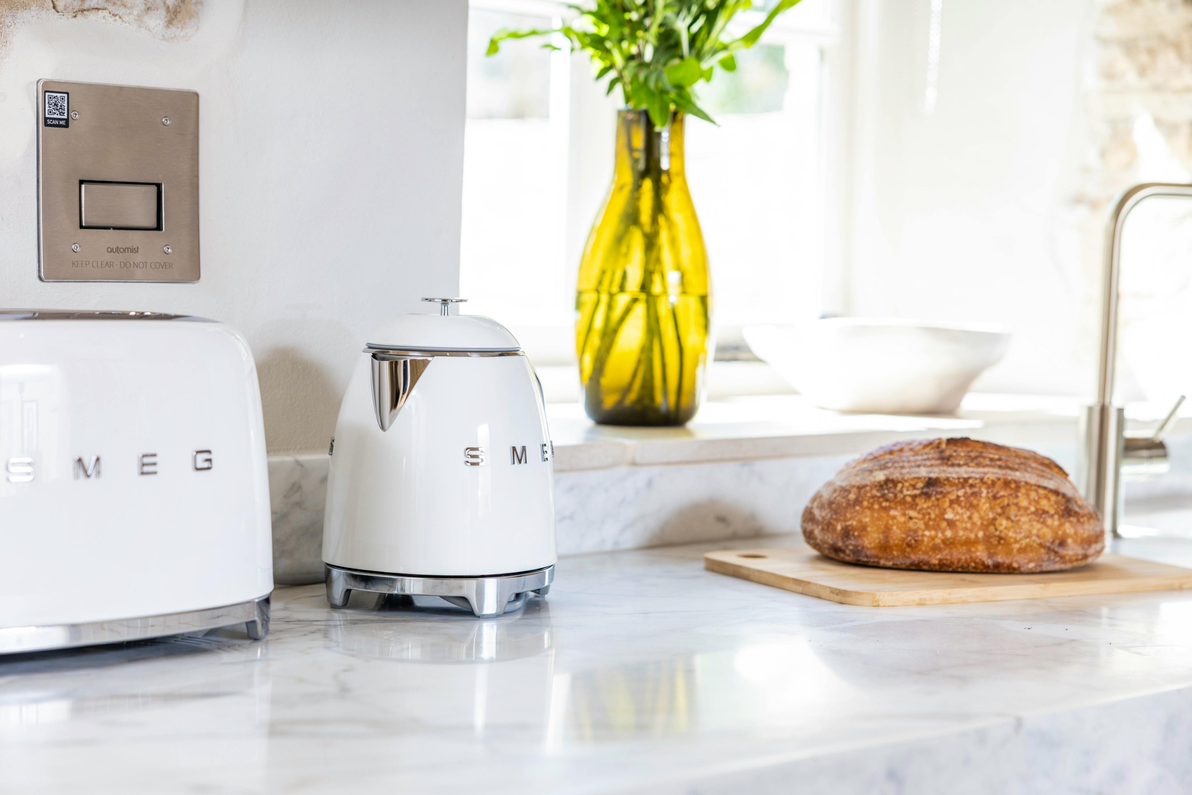 Stylish, practical kitchen with modern appliances and coffee machine, ideal for preparing meals and morning coffee.