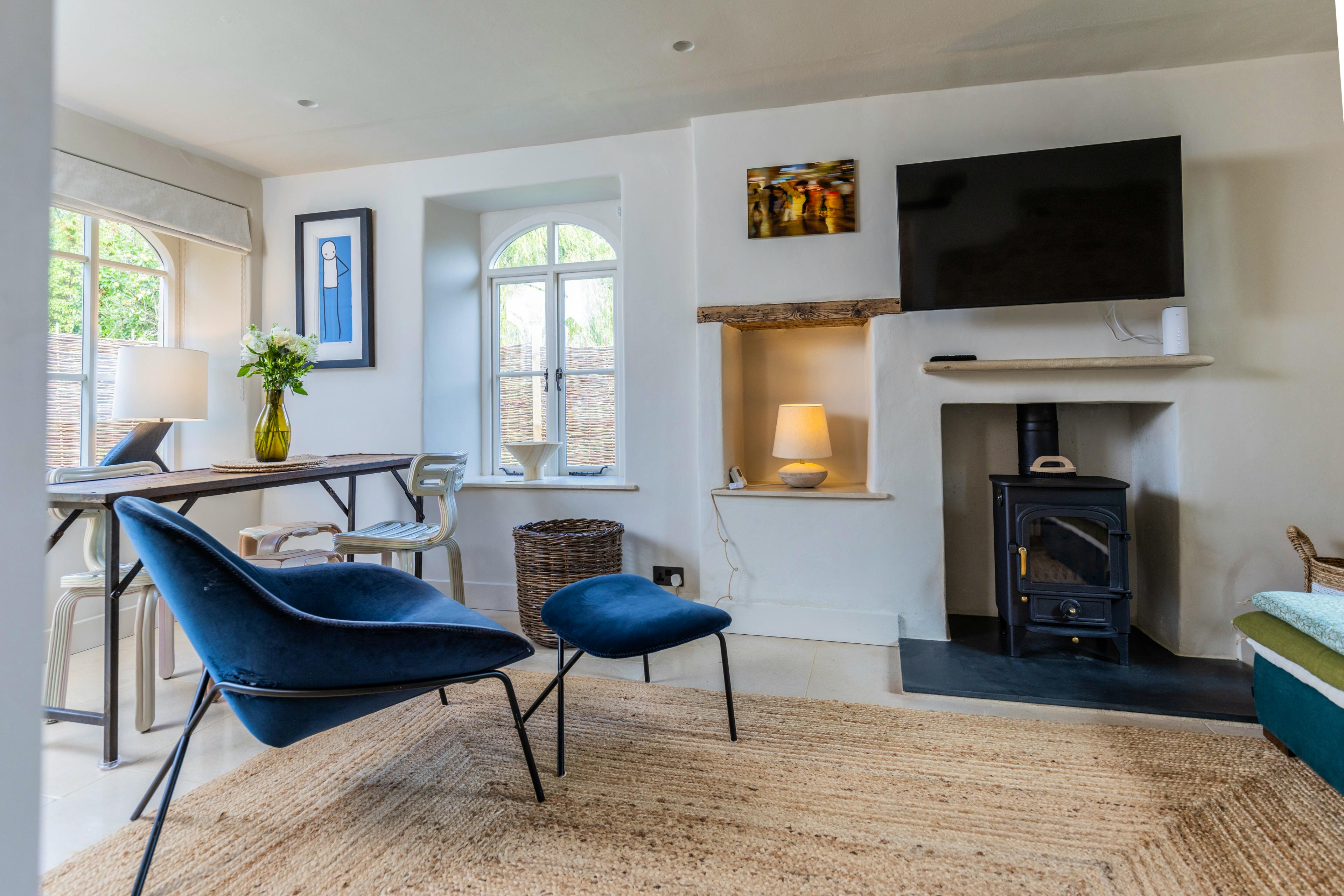 Bright living room with wood-burning fireplace and wall-mounted TV, alongside a dining table perfect for intimate meals.