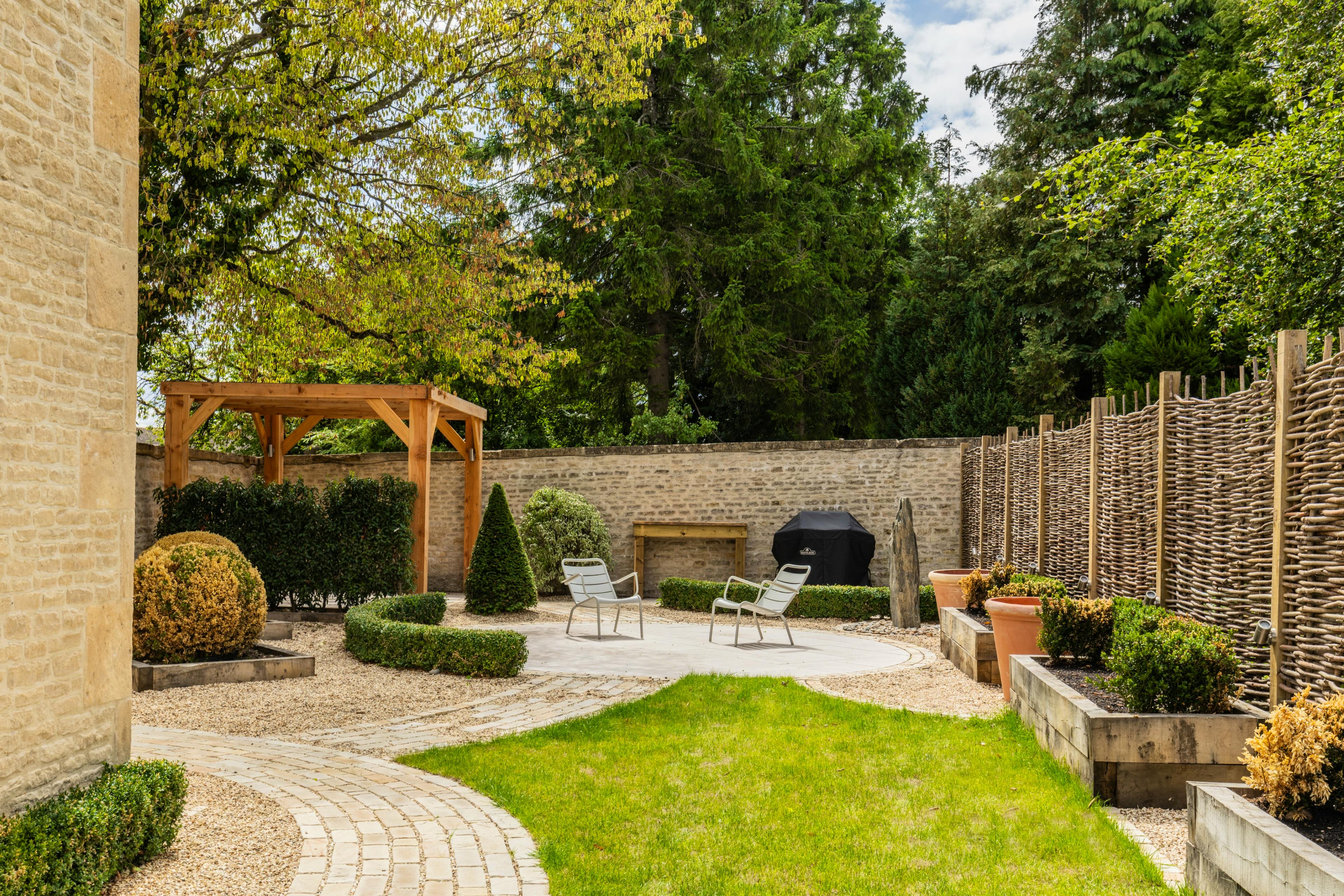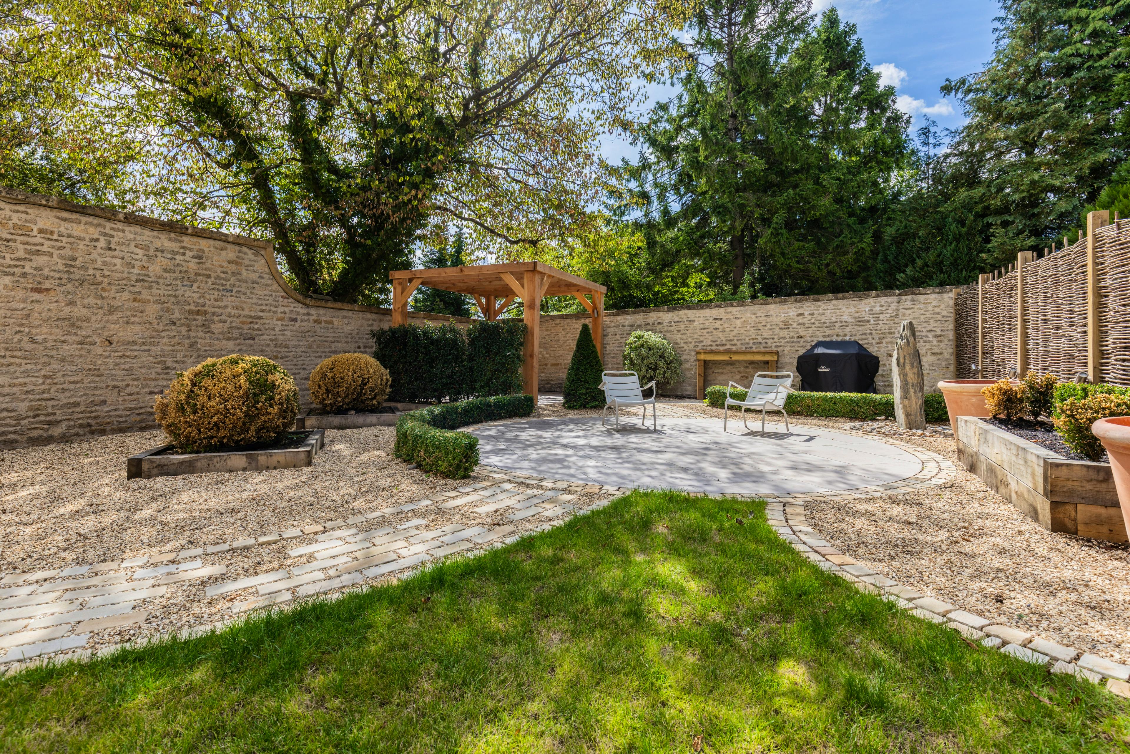 Private courtyard garden with sun-soaked seating and BBQ, centrally located for exploring Stow-on-the-Wold and nearby Cotswold villages.