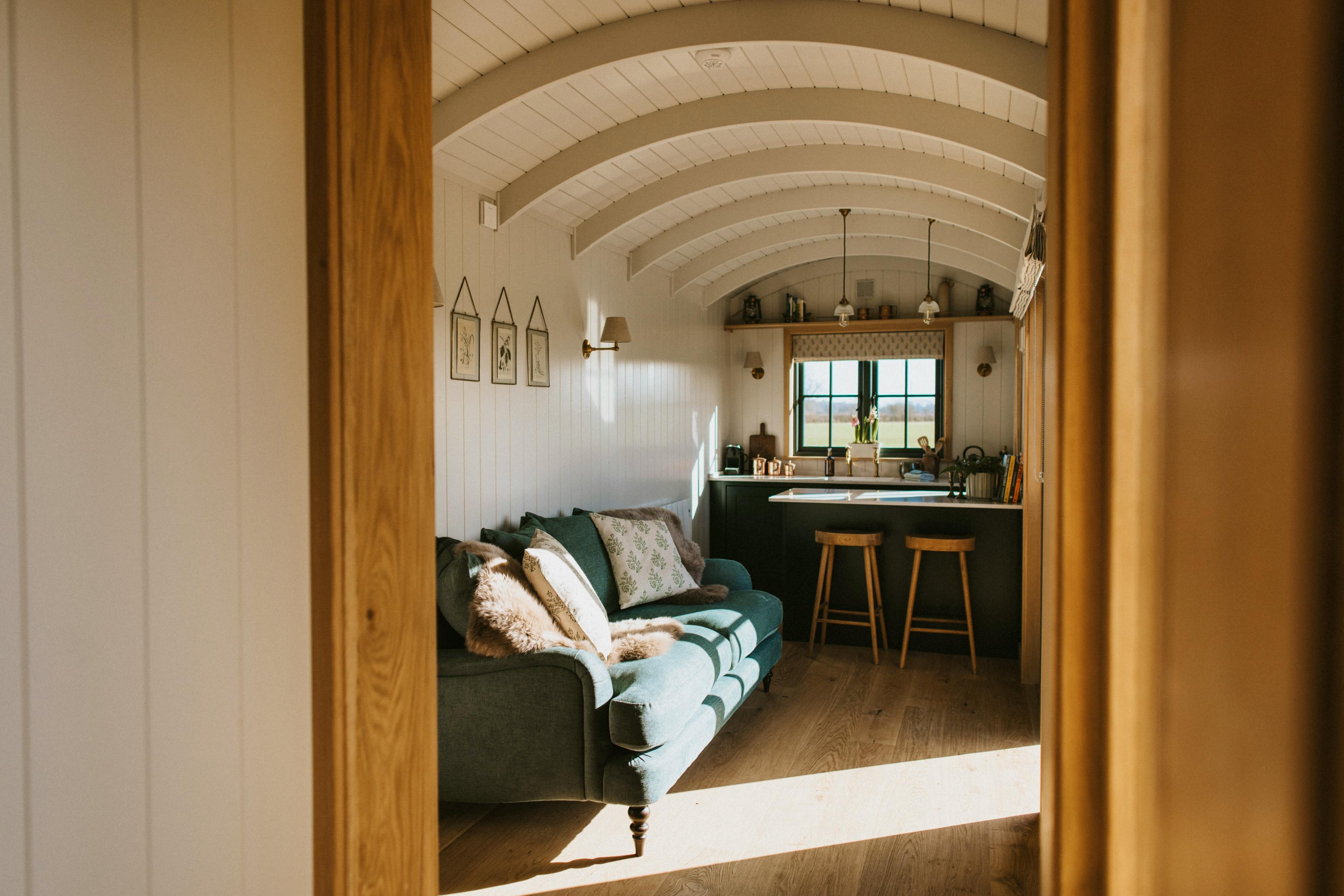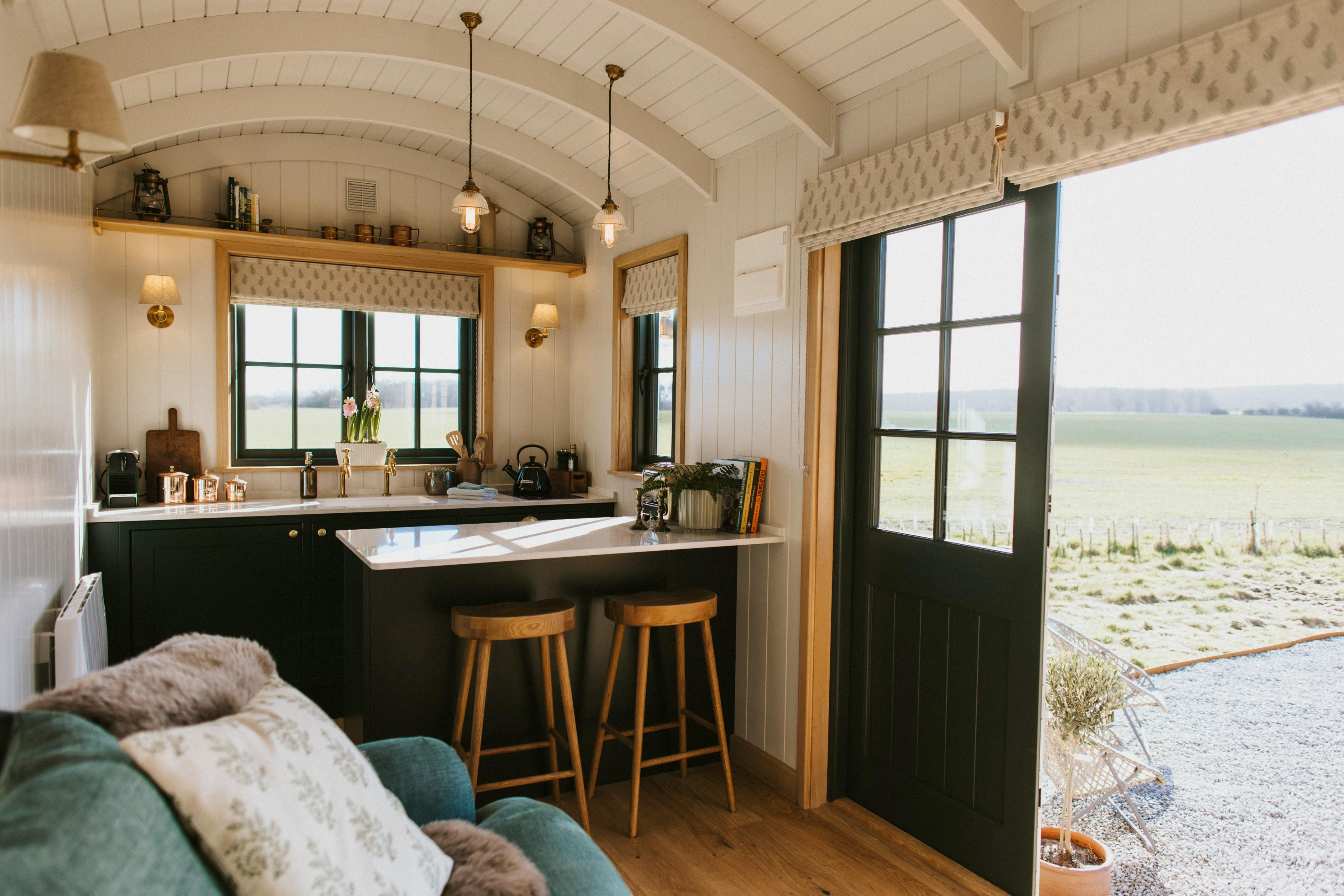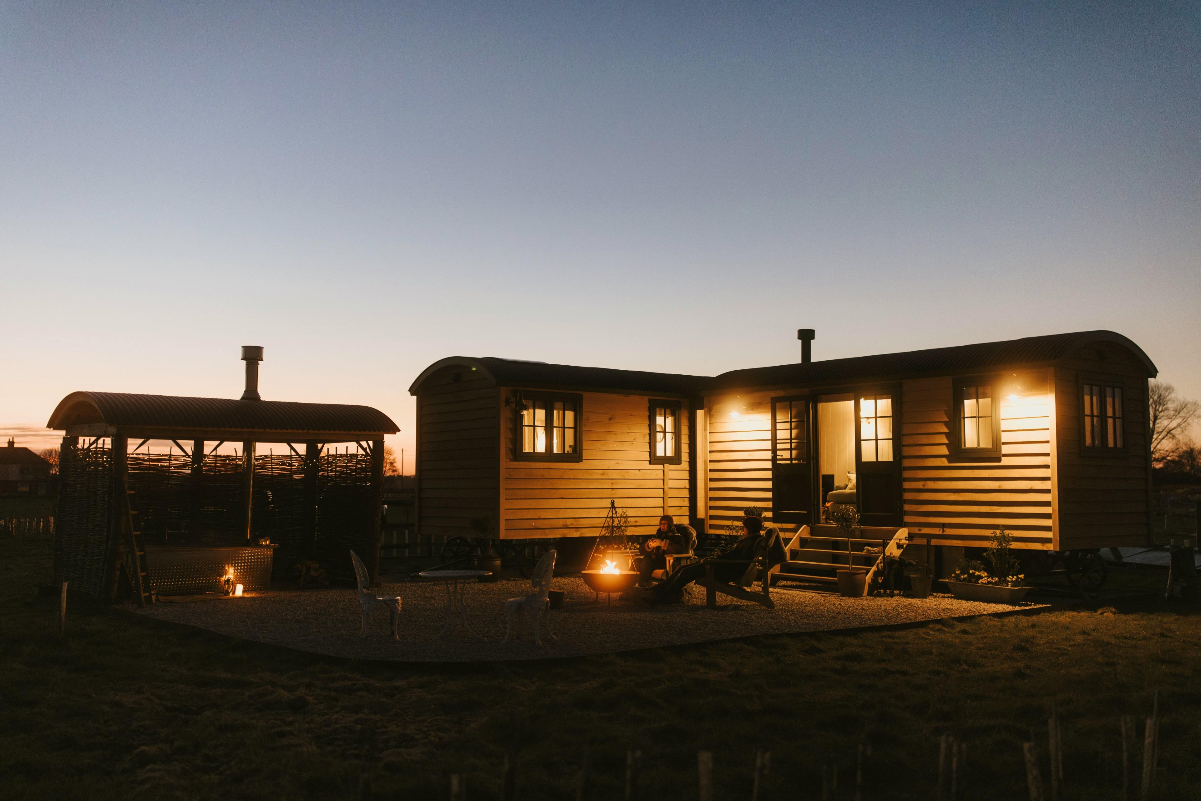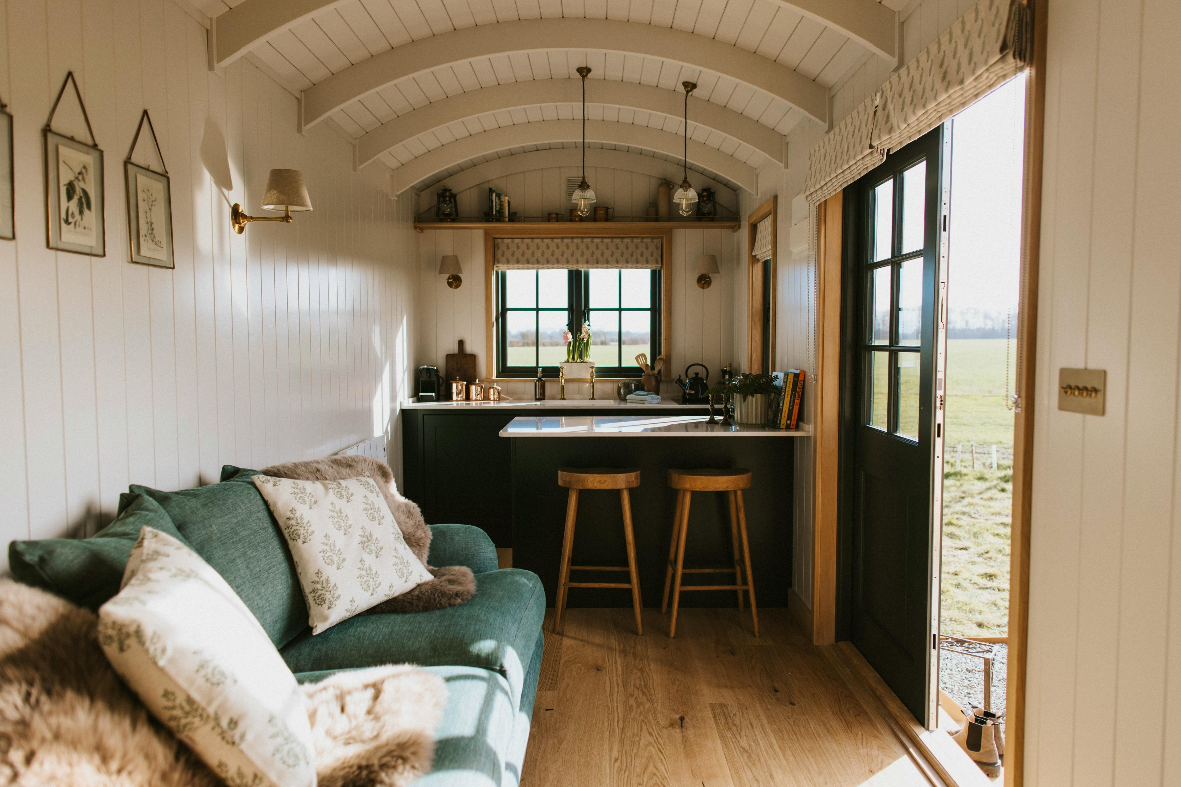 Starlit shepherd’s hut hideaway in a wildflower meadow on the edge of rural Lincolnshire with deluxe copper bathtub and wood-fired hot tub.