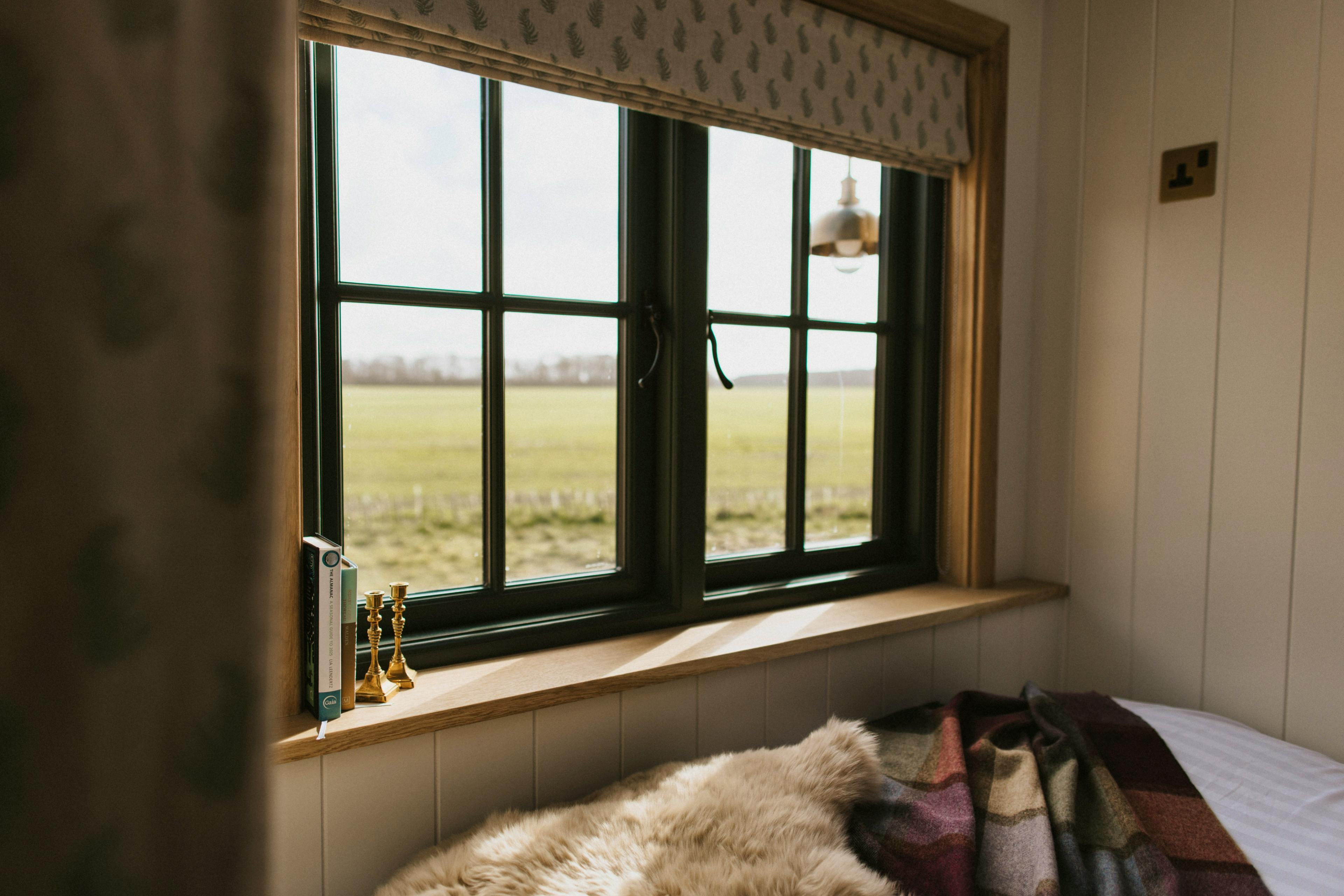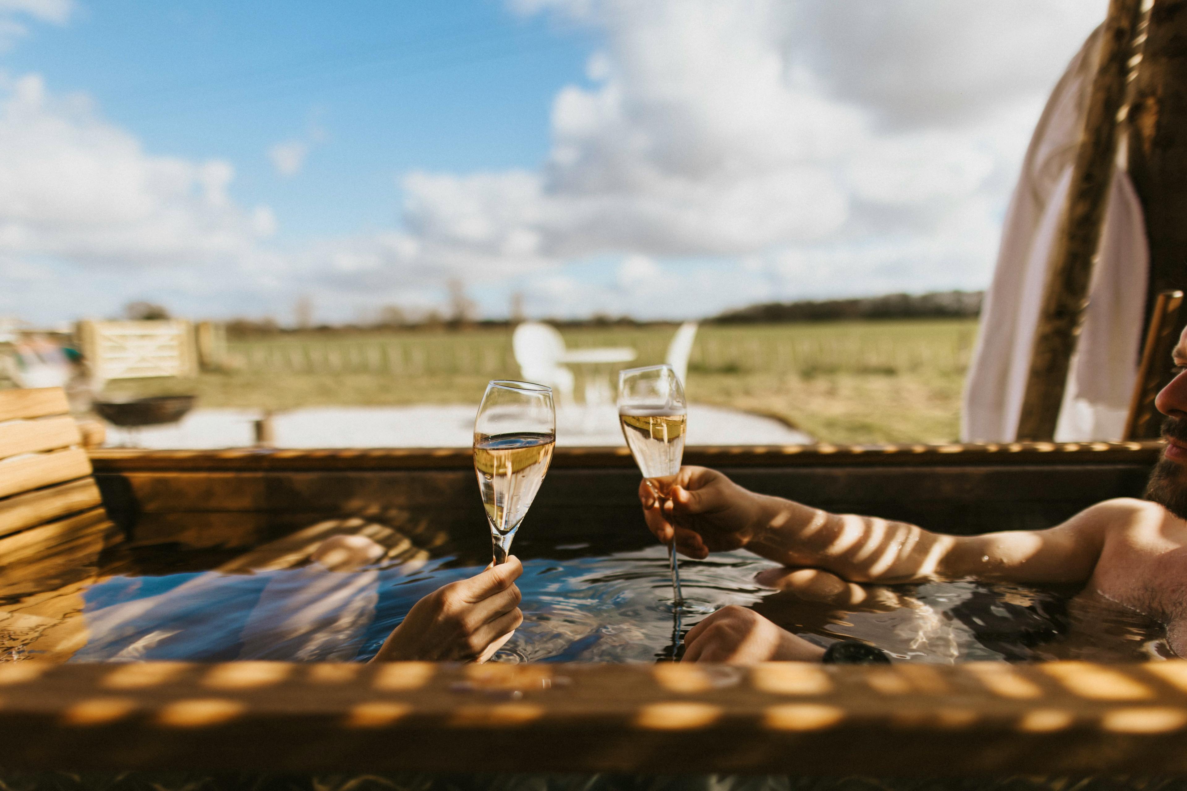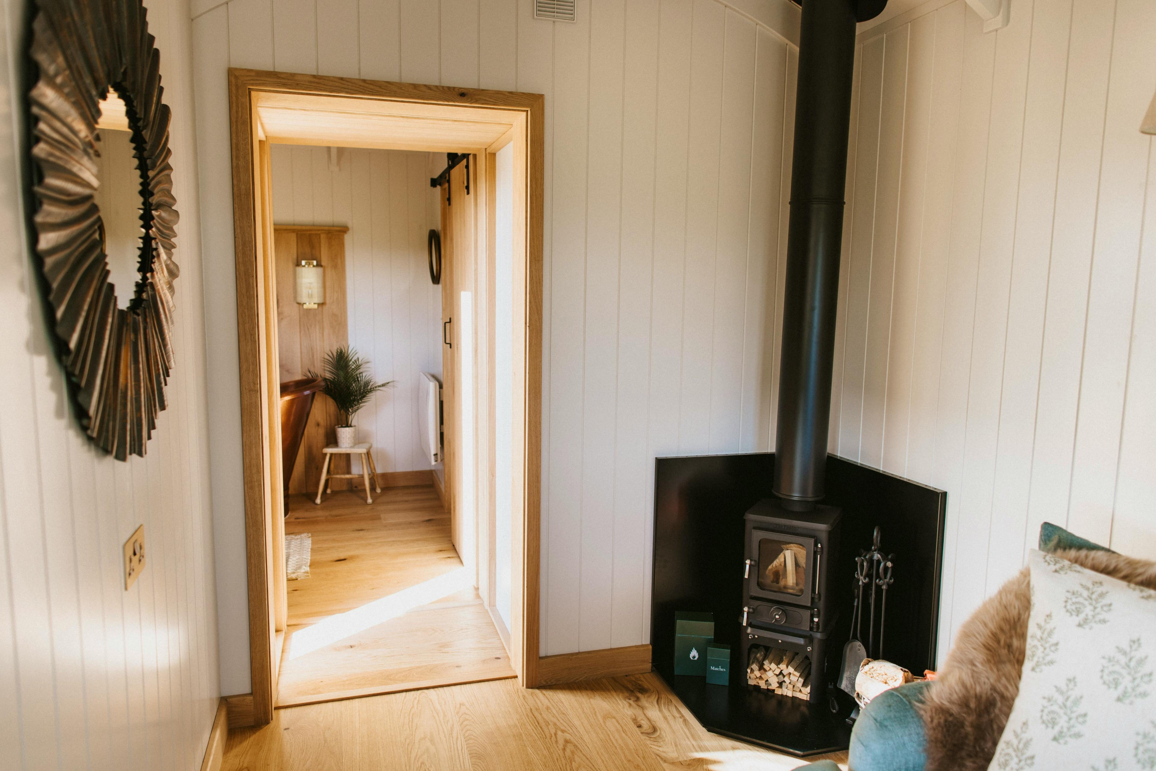 Starlit shepherd’s hut hideaway in a wildflower meadow on the edge of rural Lincolnshire with deluxe copper bathtub and wood-fired hot tub.