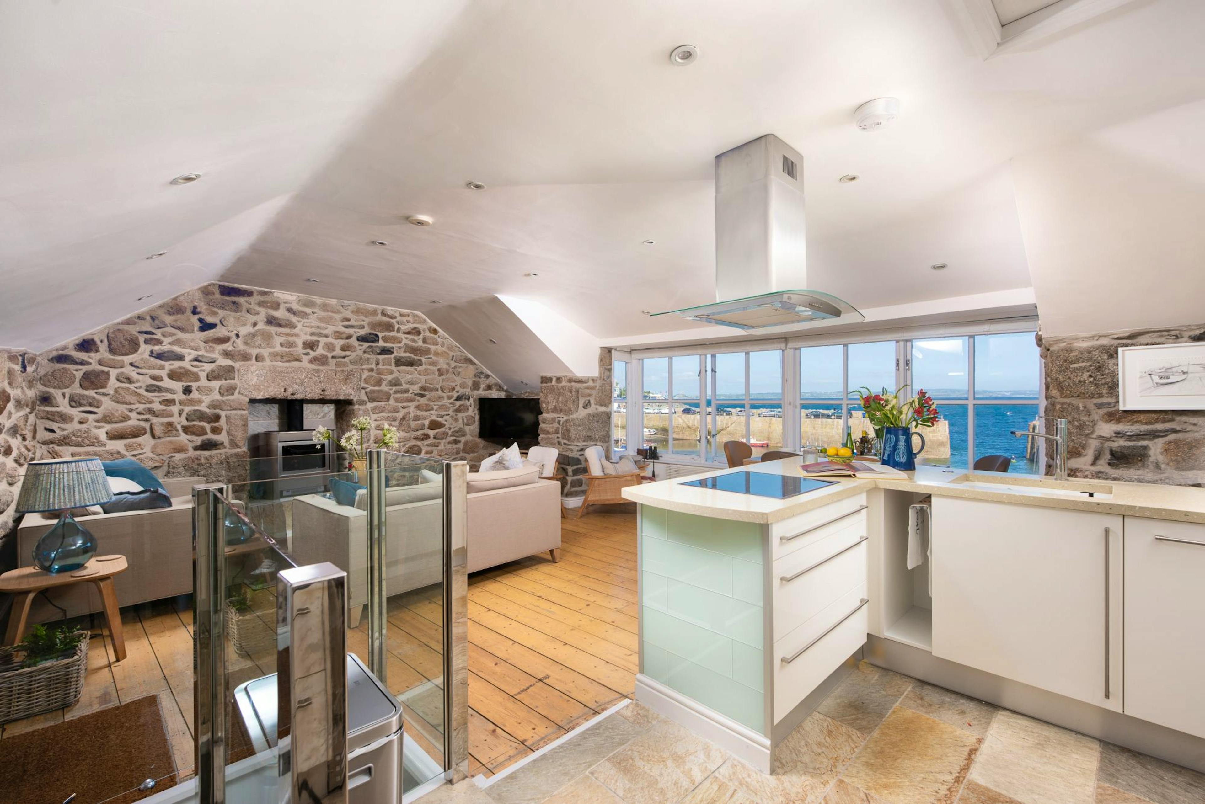 The open plan kitchen/dining area boasts spectacular views across the harbour and sea.