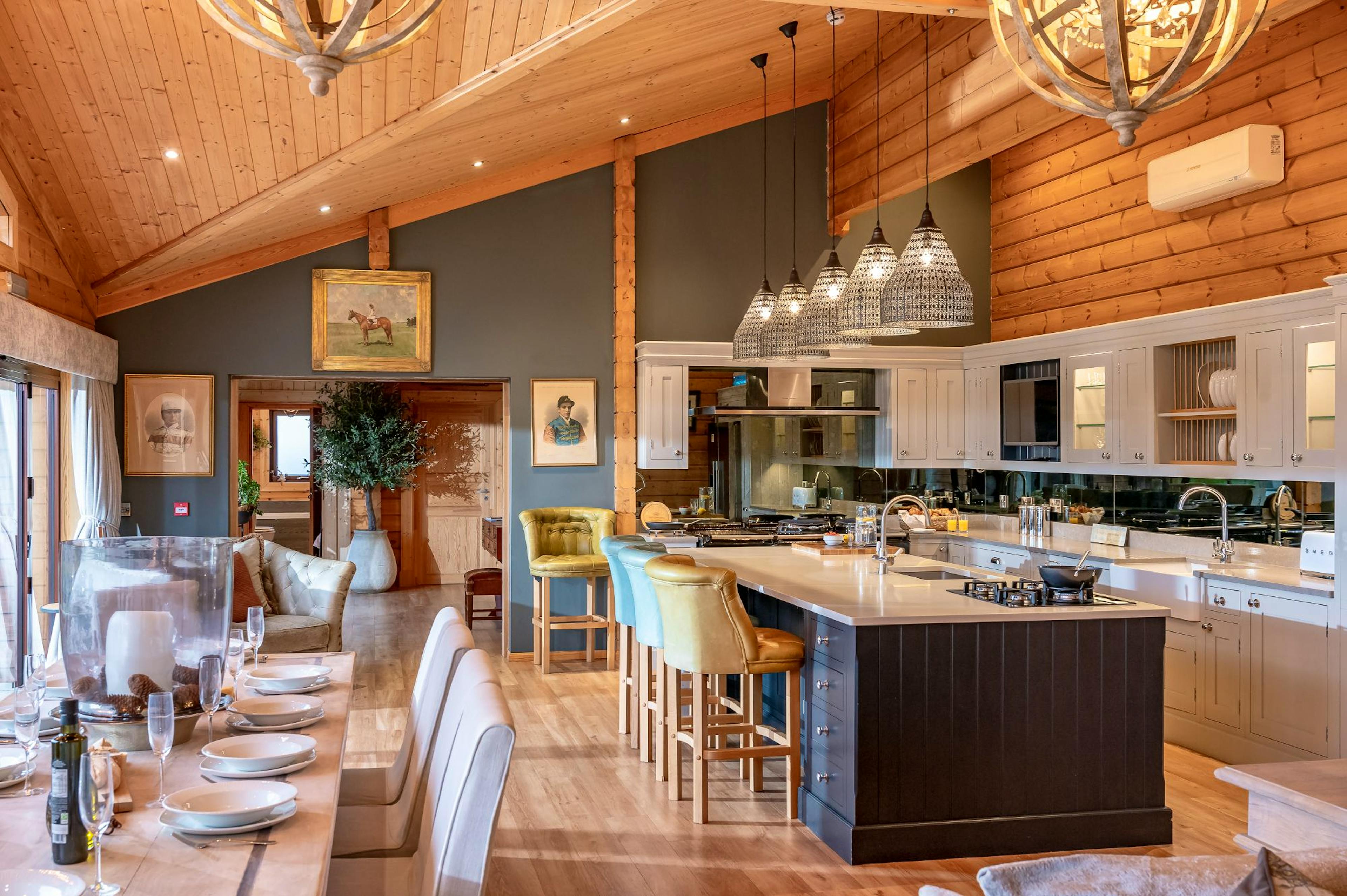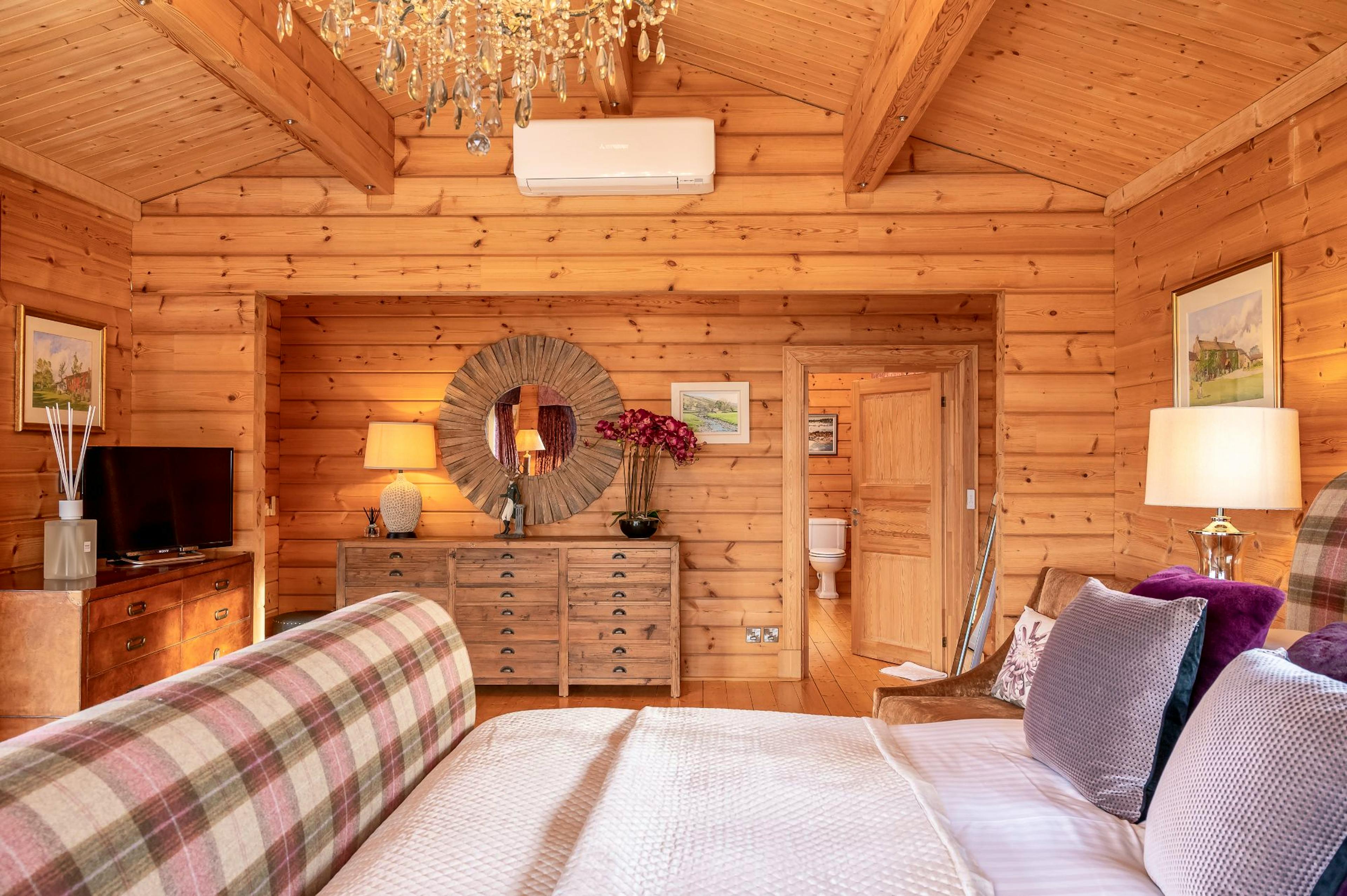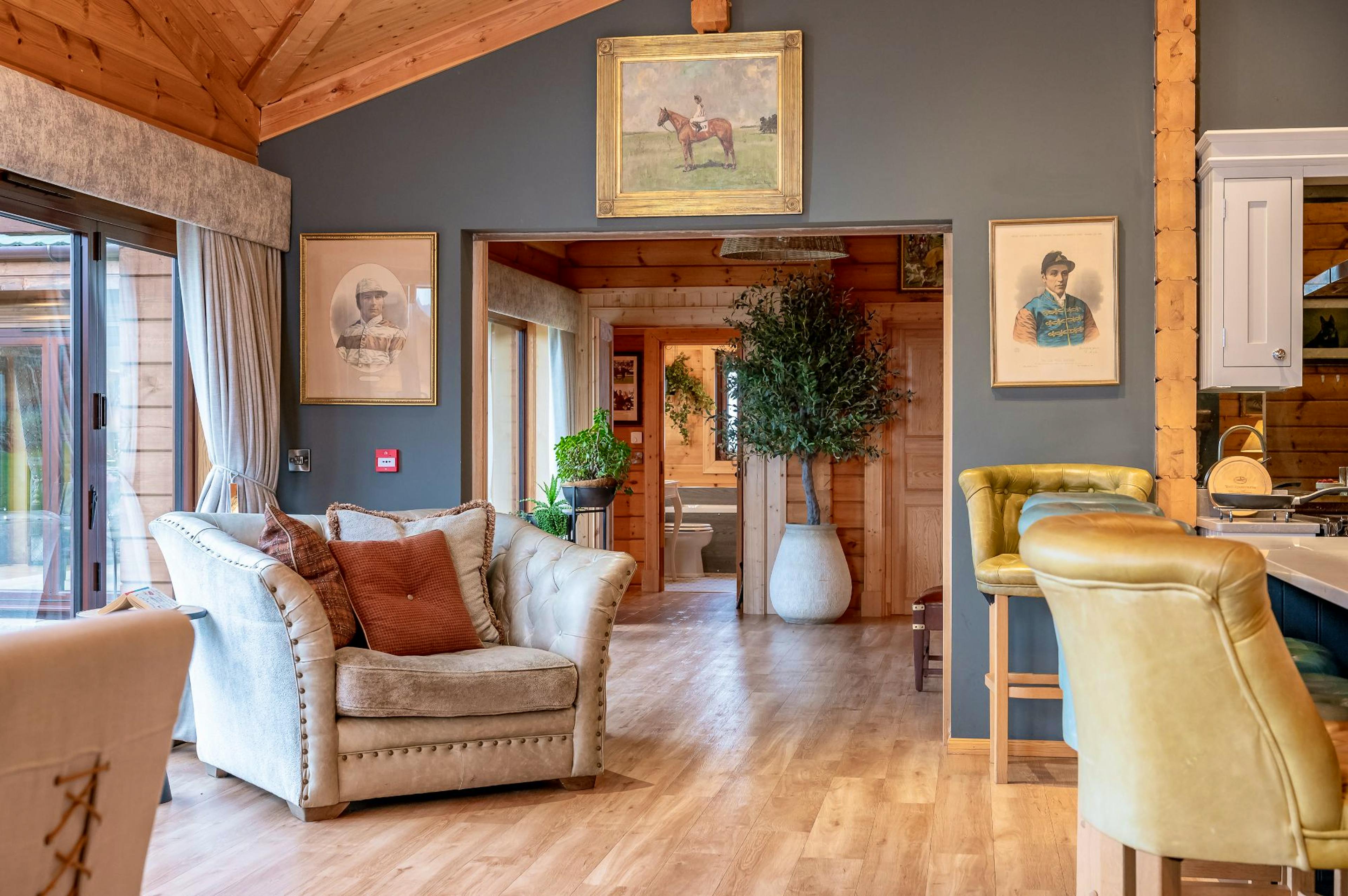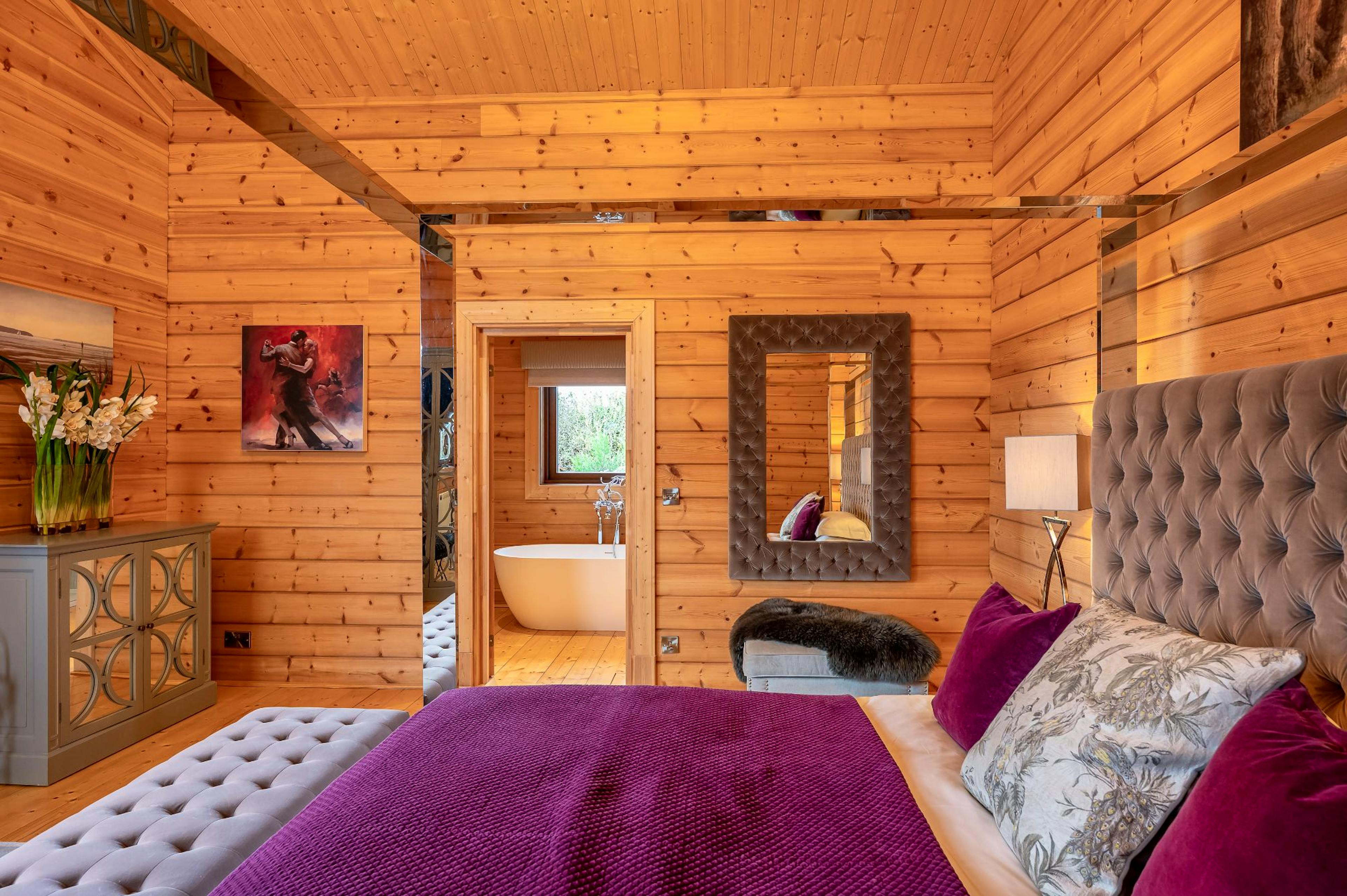 Valley View is a grand four-bedroom luxury log cabin, offering an exclusive winter retreat for up to eight guests. Available only between November and February, this lodge combines contemporary style, cosy interiors and spectacular outdoor features for a magical festive escape in the Yorkshire Dales. With its hydrotherapy hot tub, fire pit, panoramic views and elegant living spaces, Valley View provides the perfect setting for a luxurious seasonal getaway with friends or family. Inside, the lodge is designed for both comfort and indulgence. The large open-plan living and dining area features high ceilings, floor-to-ceiling sliding doors, underfloor heating and a roaring log burner, all framed by sweeping views of the Yorkshire hills. Two sitting areas ensure space for everyone to relax, while the state-of-the-art kitchen – complete with a four-oven Aga, American-style fridge freezer, ice-cold water dispenser and bean-to-cup coffee machine – makes self-catering effortless. For special occasions, a private chef can be arranged to provide fine dining, complete with dishwasher service. Valley View’s four sumptuous bedrooms each feature a king-size bed, stylish décor and ensuite bathrooms with freestanding baths and walk-in showers. The master bedroom offers copper bath luxury and bi-fold doors opening to panoramic hillside views, while the second bedroom boasts a ceiling window perfect for stargazing. The third features a four-poster bed and the fourth mirrors the master with views over the paddocks. Natural hues, fur throws and plush headboards ensure every night is restful and indulgent. Outdoor living is equally spectacular. The private enclosed garden includes a hydrotherapy hot tub, fire pit, rattan seating and a four-burner gas BBQ, all framed by the rolling Yorkshire hills. Water features, including a small pond, add to the serene ambiance, while guests are welcome to explore the paddocks and grounds, home to Sun Hill’s trained racehorses. Just four miles from Leyburn, Valley View combines seclusion with access to local attractions. Enjoy shopping at boutiques or Campbell’s of Leyburn, sample artisan chocolates from Inspired Chocolate, visit Tennant’s auction house and café, or explore the weekly Friday market. With its combination of style, comfort and seasonal exclusivity, Valley View is the ultimate luxury winter lodge for creating unforgettable memories in the Yorkshire Dales.
