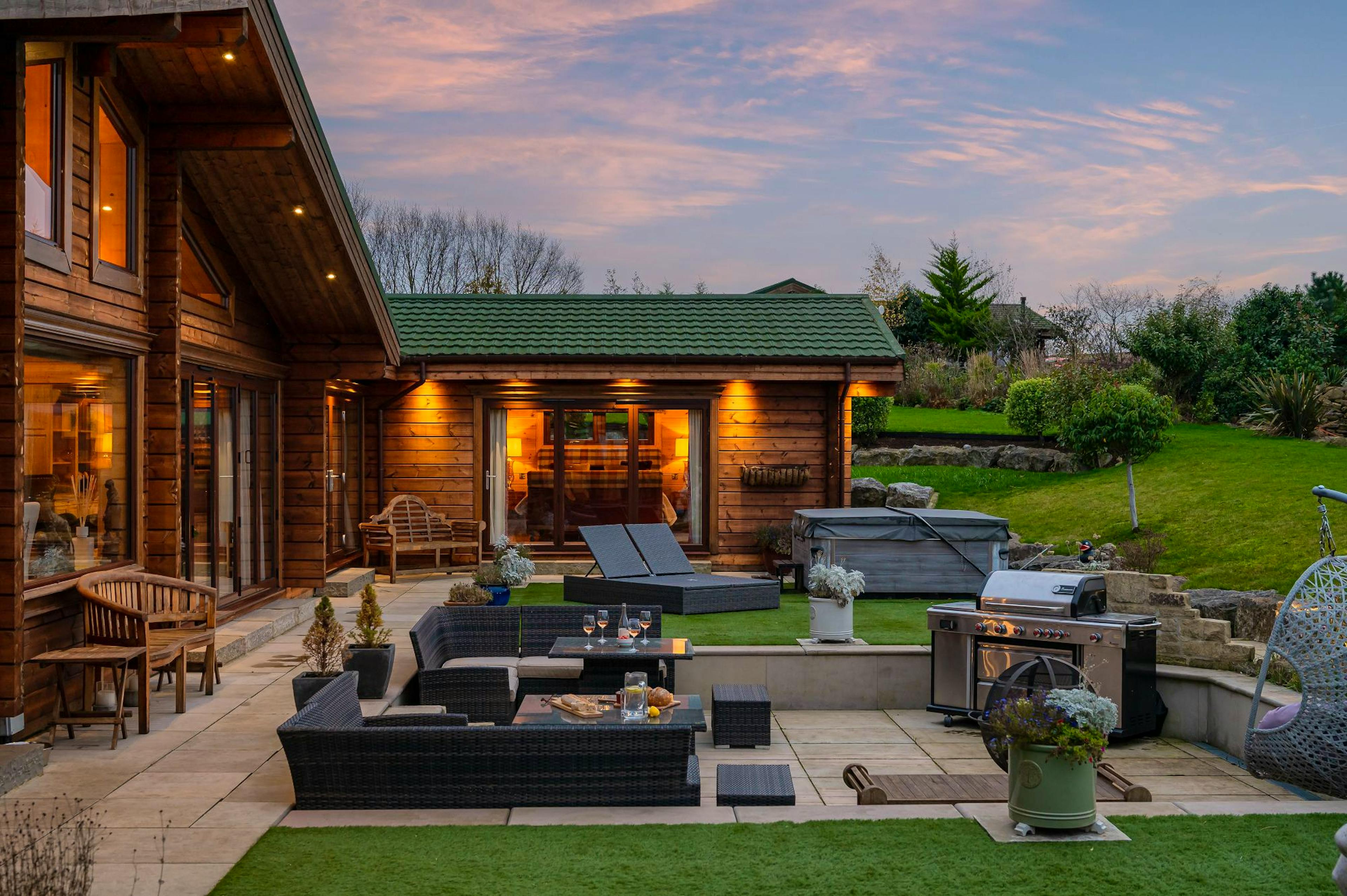 Four-bedroom luxury lodge for up to eight guests, available exclusively from November to February, with panoramic Yorkshire Dales views.