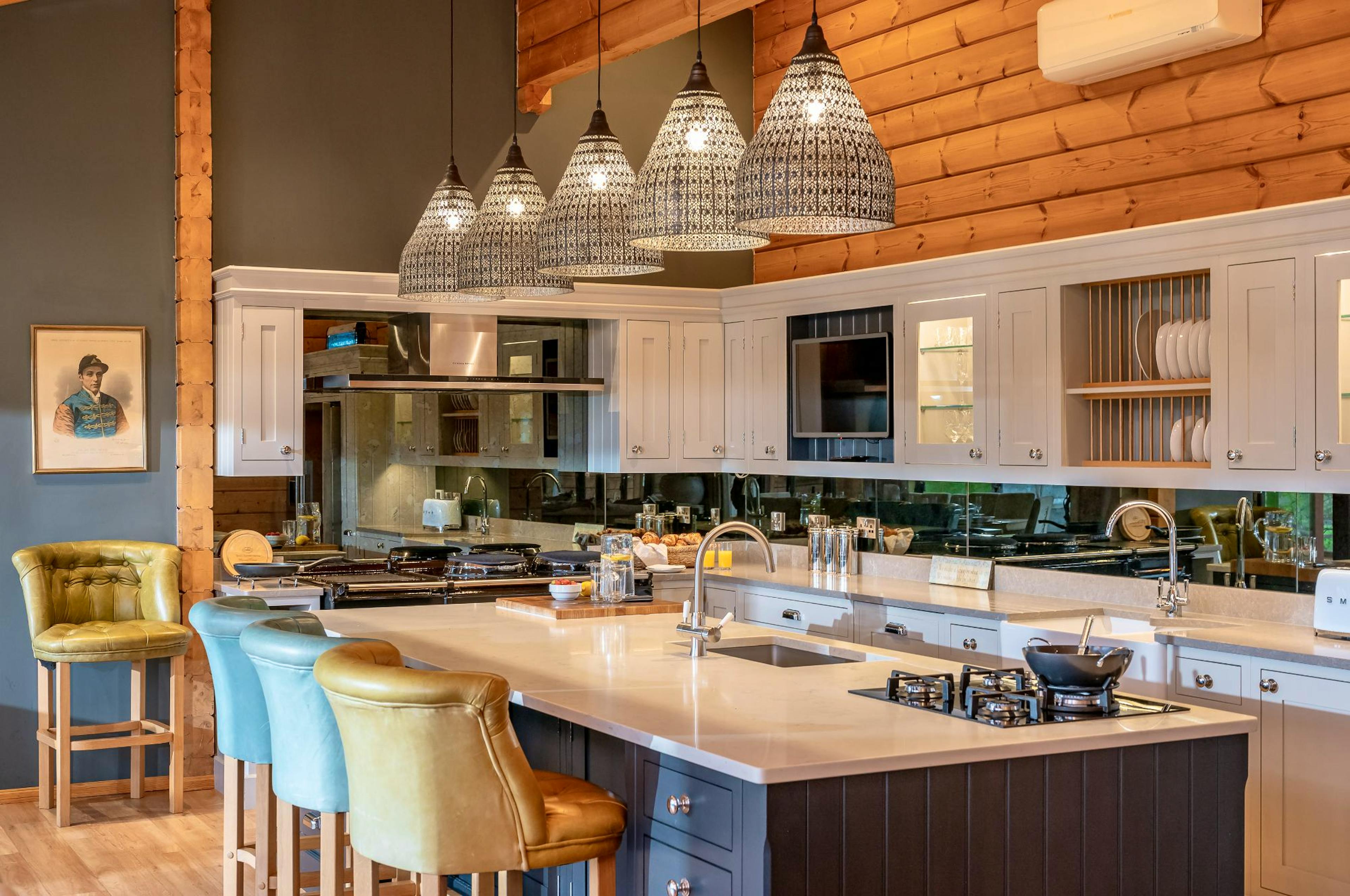 State-of-the-art kitchen with four-oven Aga, American-style fridge freezer, bean-to-cup coffee machine and breakfast bar, ideal for self-catering or hosting a private chef.