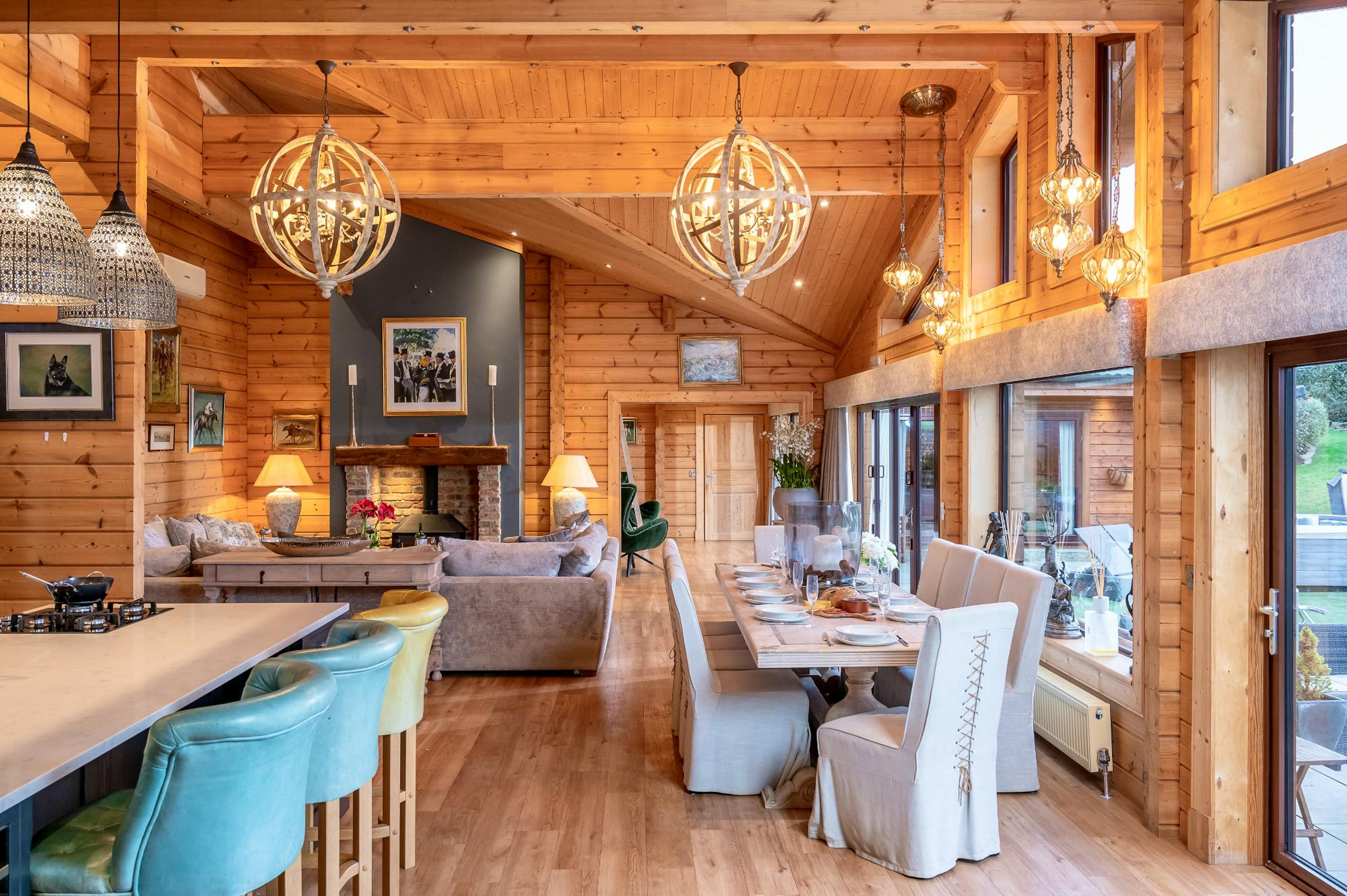 Open-plan living and dining space with underfloor heating, log burner, floor-to-ceiling sliding doors and multiple sitting areas for cosy winter nights.