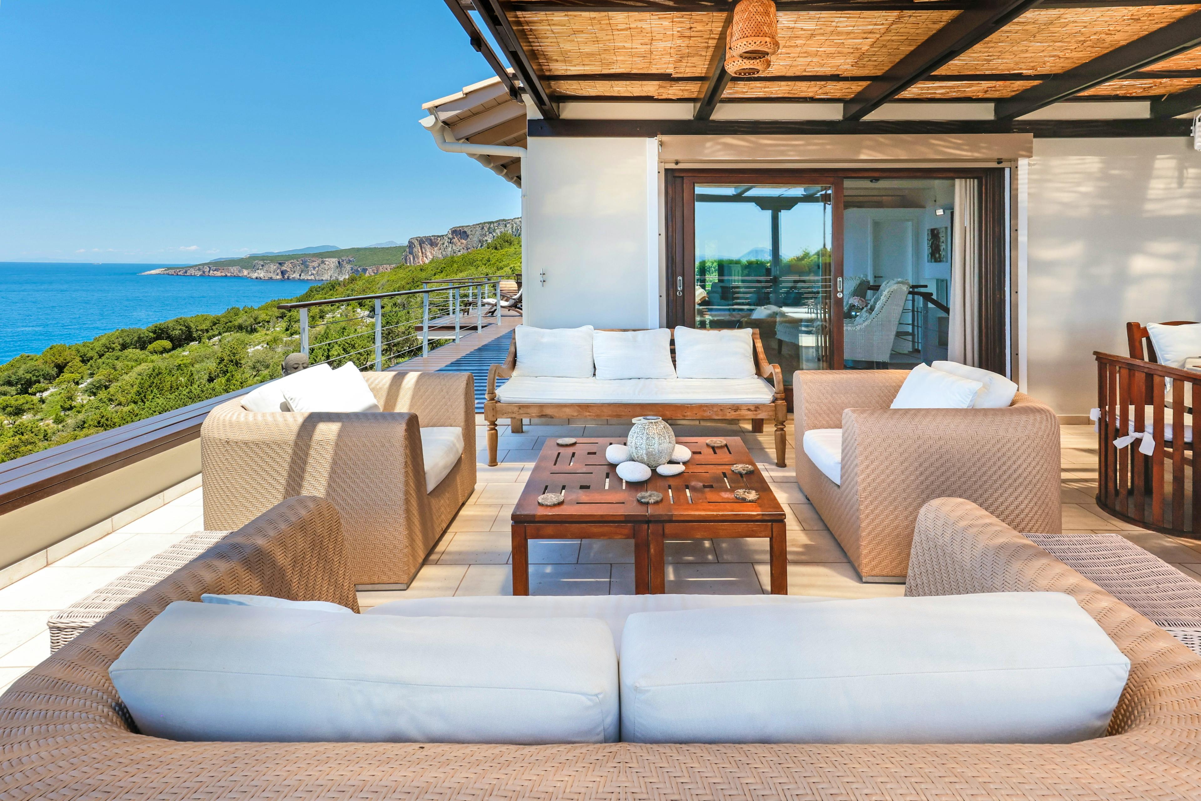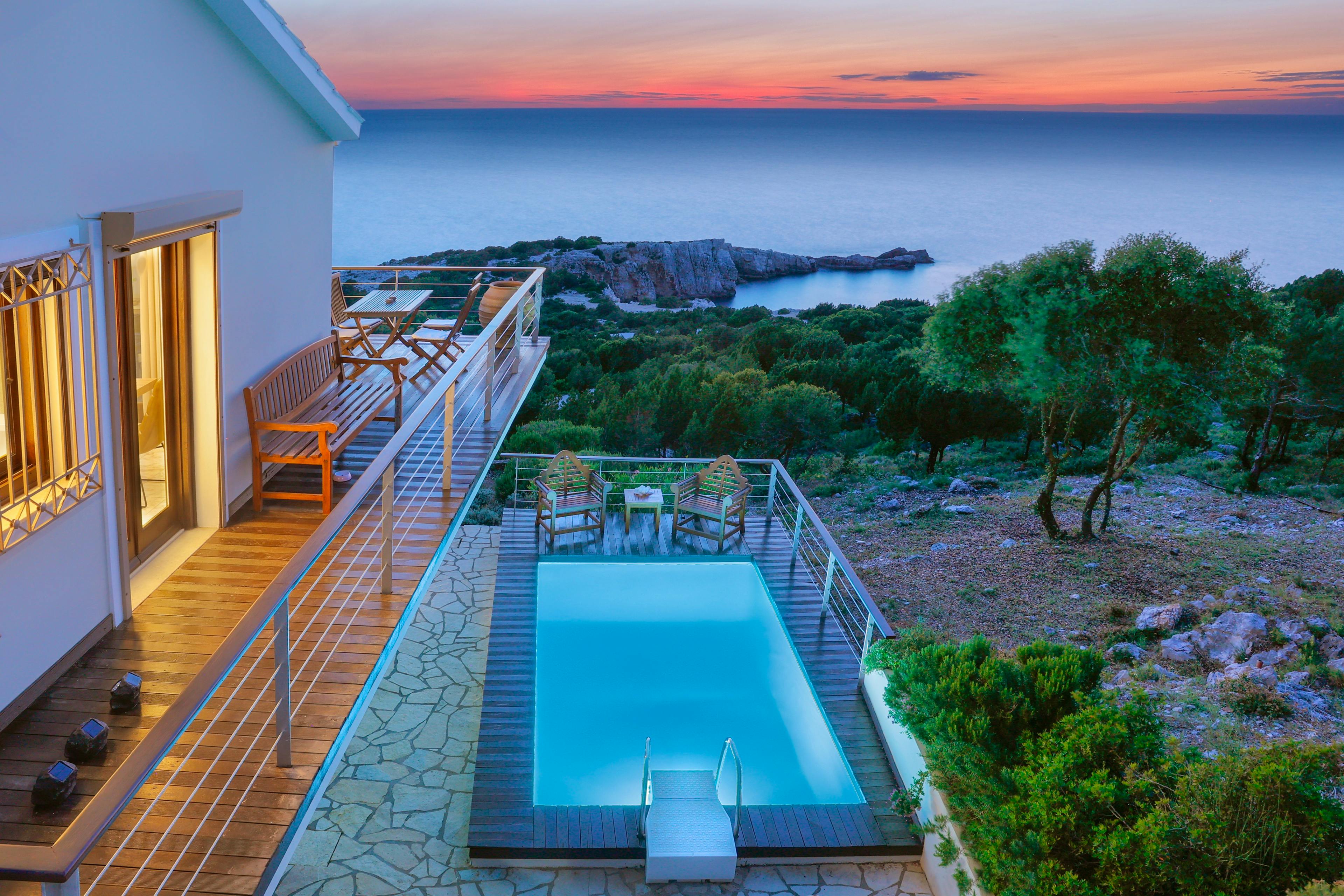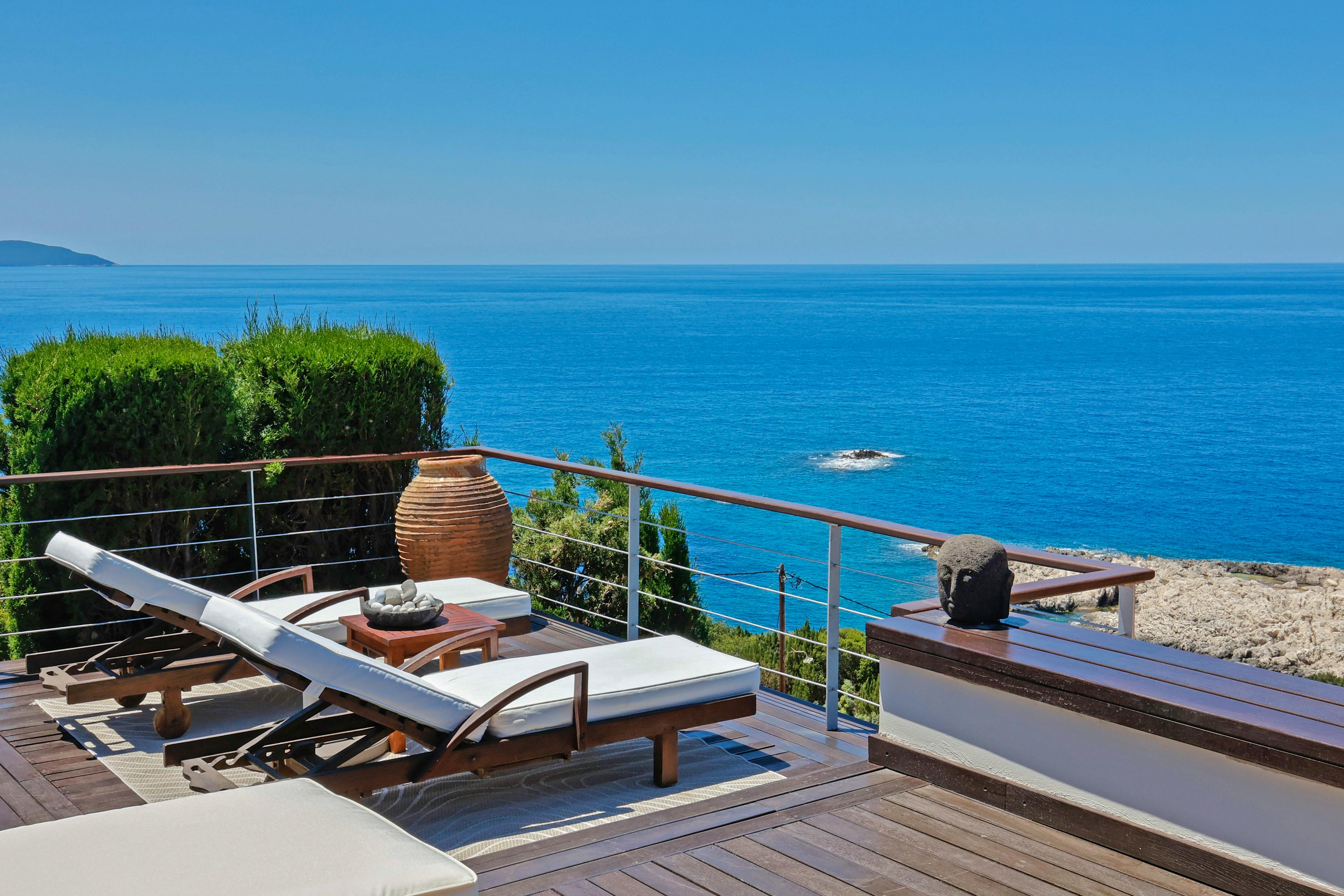 This remarkable Kefalonian villa sits high up on a hillside offering spectacular sea views, abundant outdoor social space and two swimming pools.
