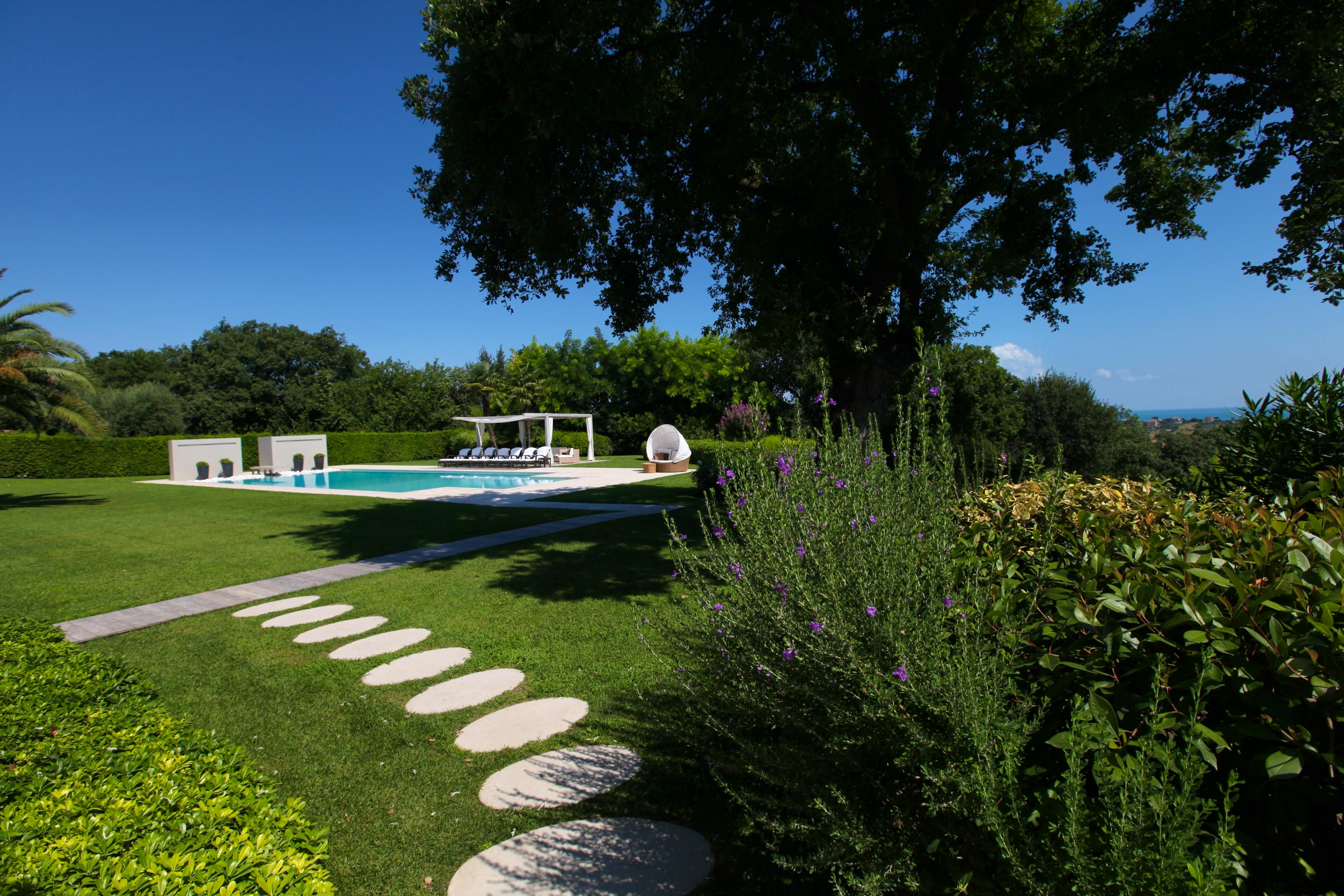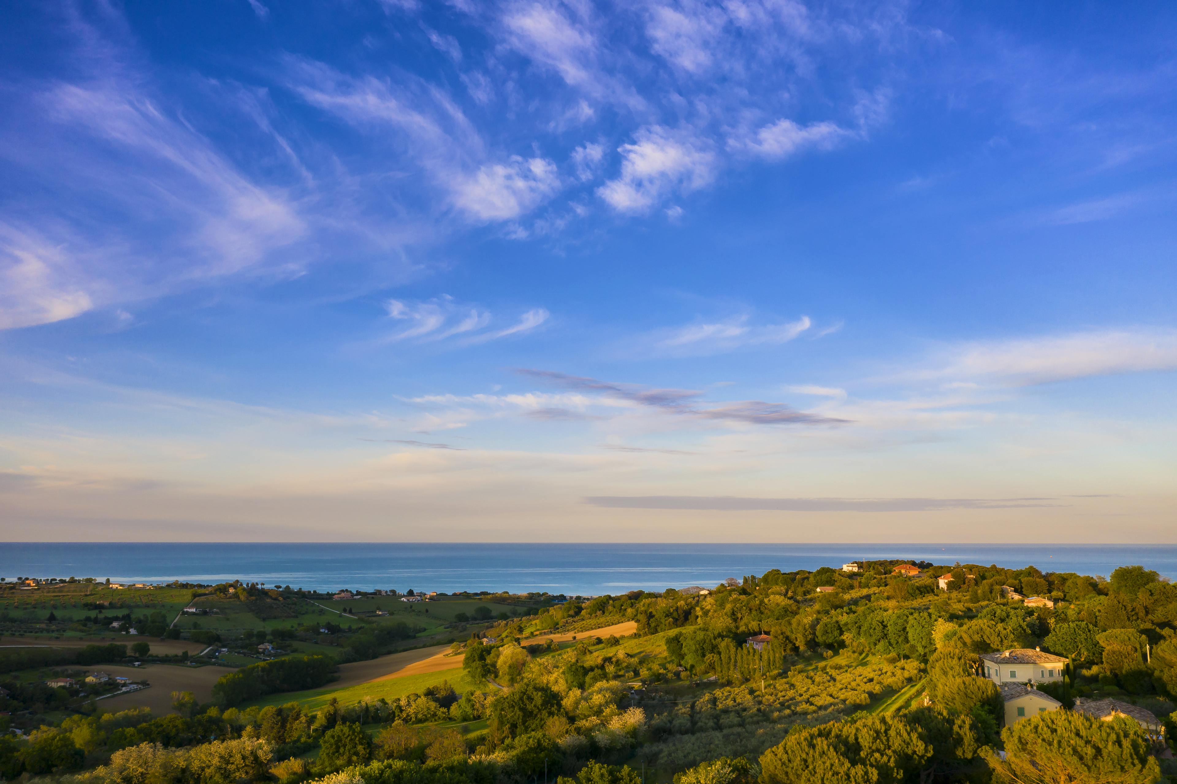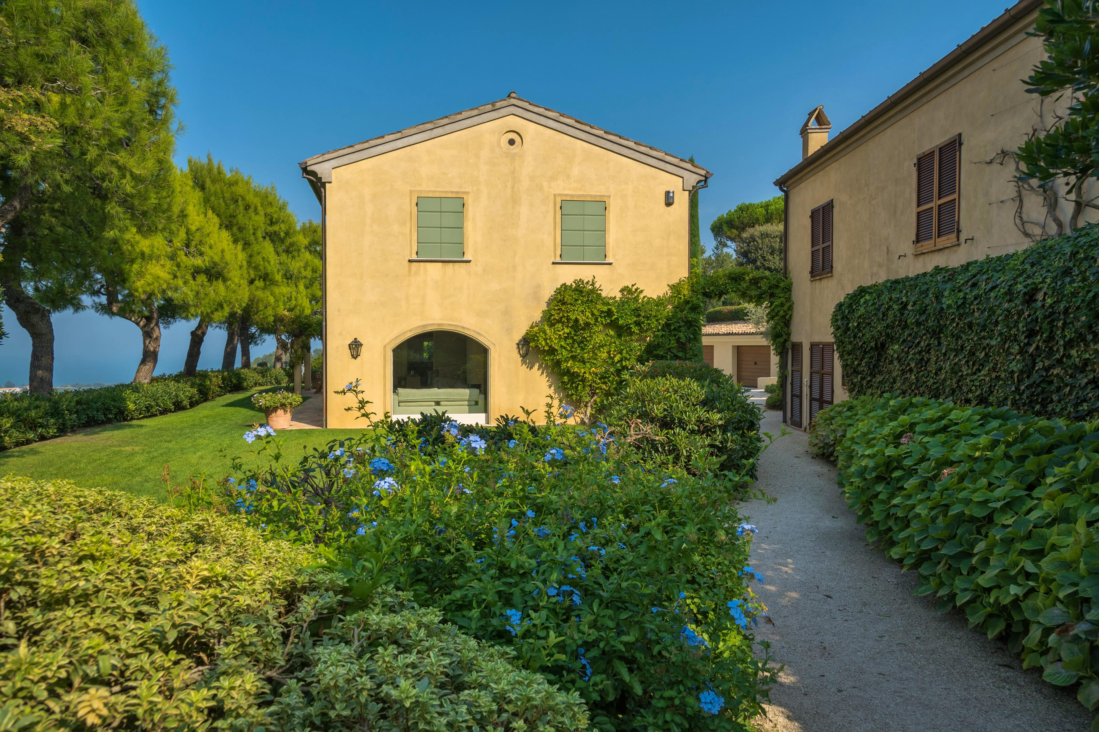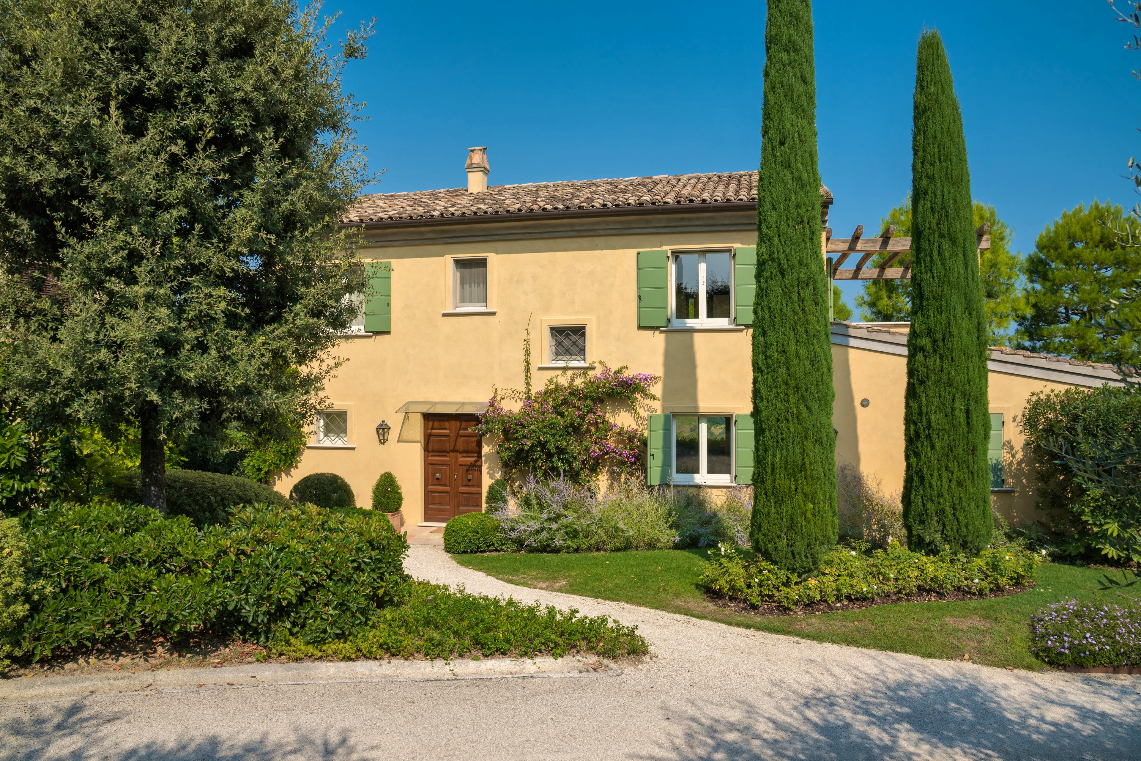 Gorgeous Italian villa nestled amidst vineyards and olive groves in Le Marche with a beautiful pool, tennis court and exquisite interiors.